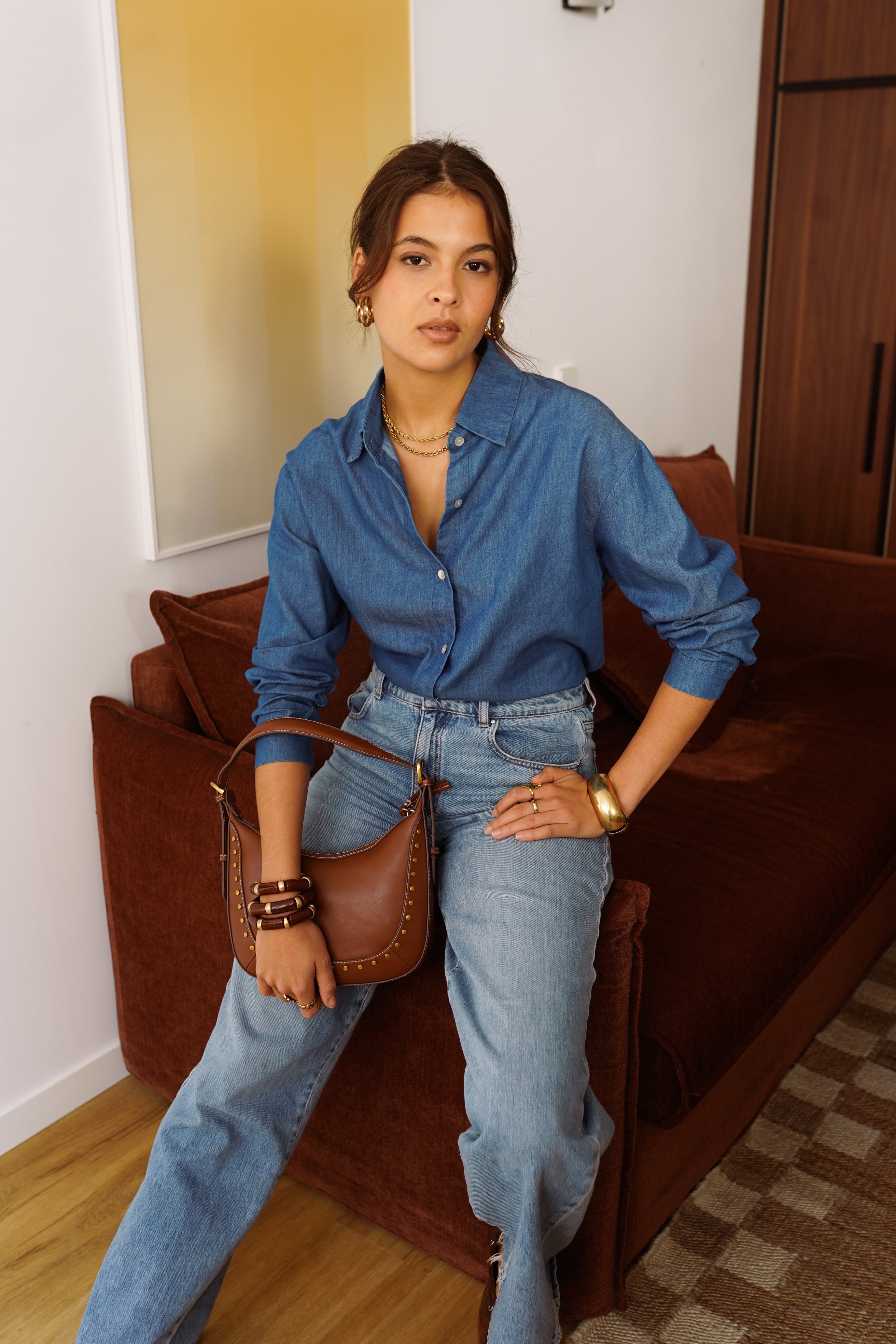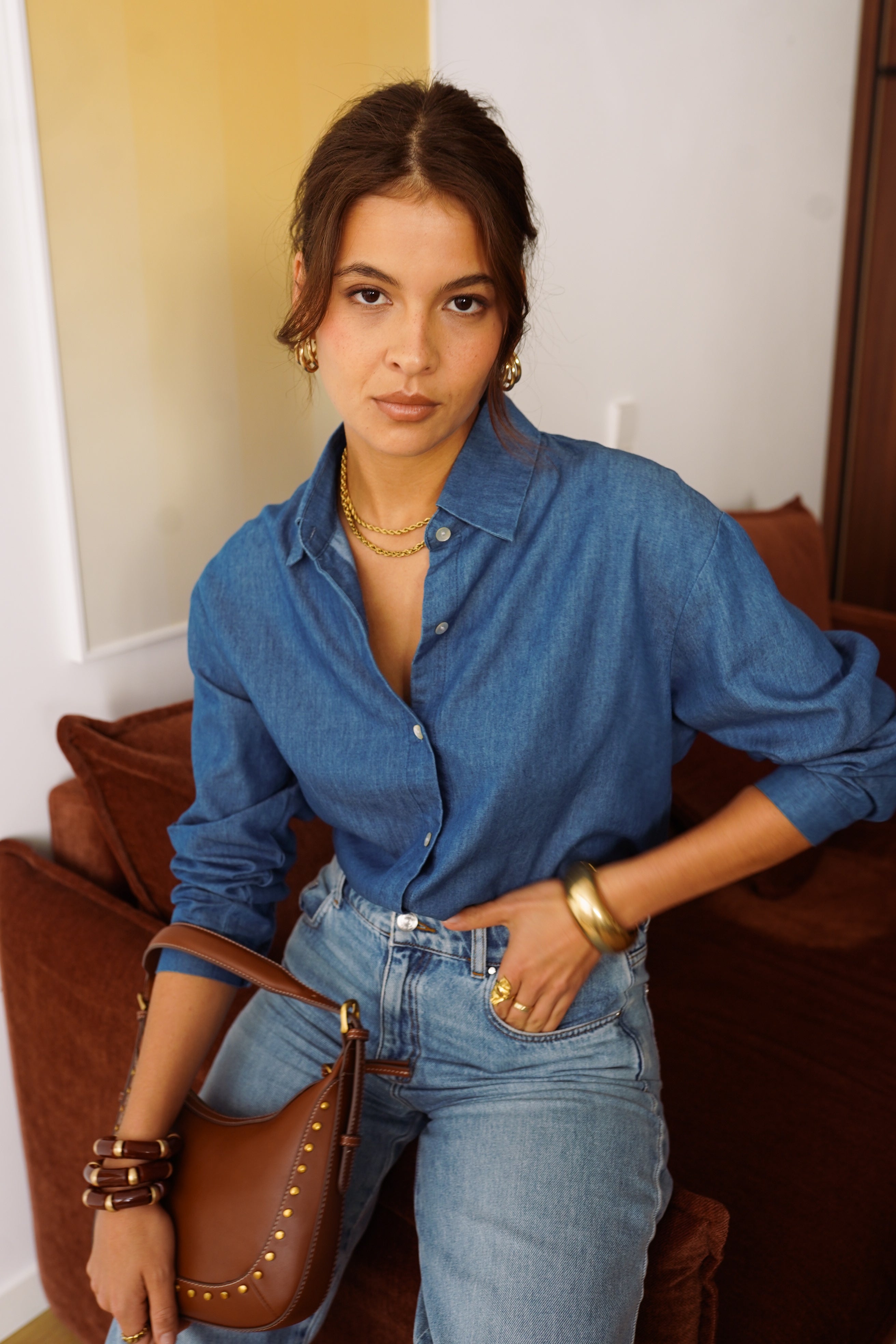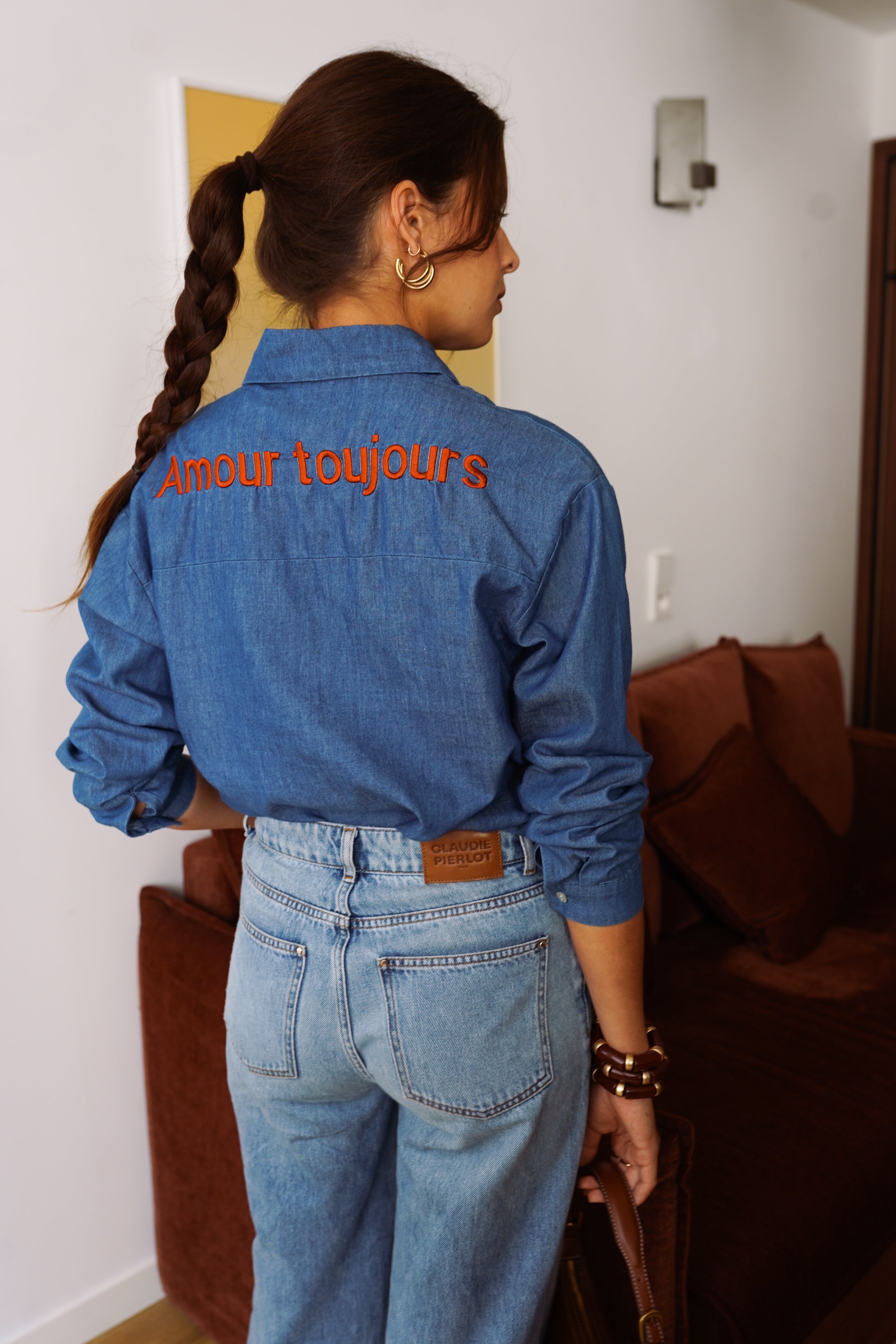 La chemise Aïna revisite le denim dans une version fluide et féminine. Sa matière douce et son tombé naturel en font un essentiel du vestiaire casual chic, twisté par l’inscription “Amour toujours” brodée dans le dos.