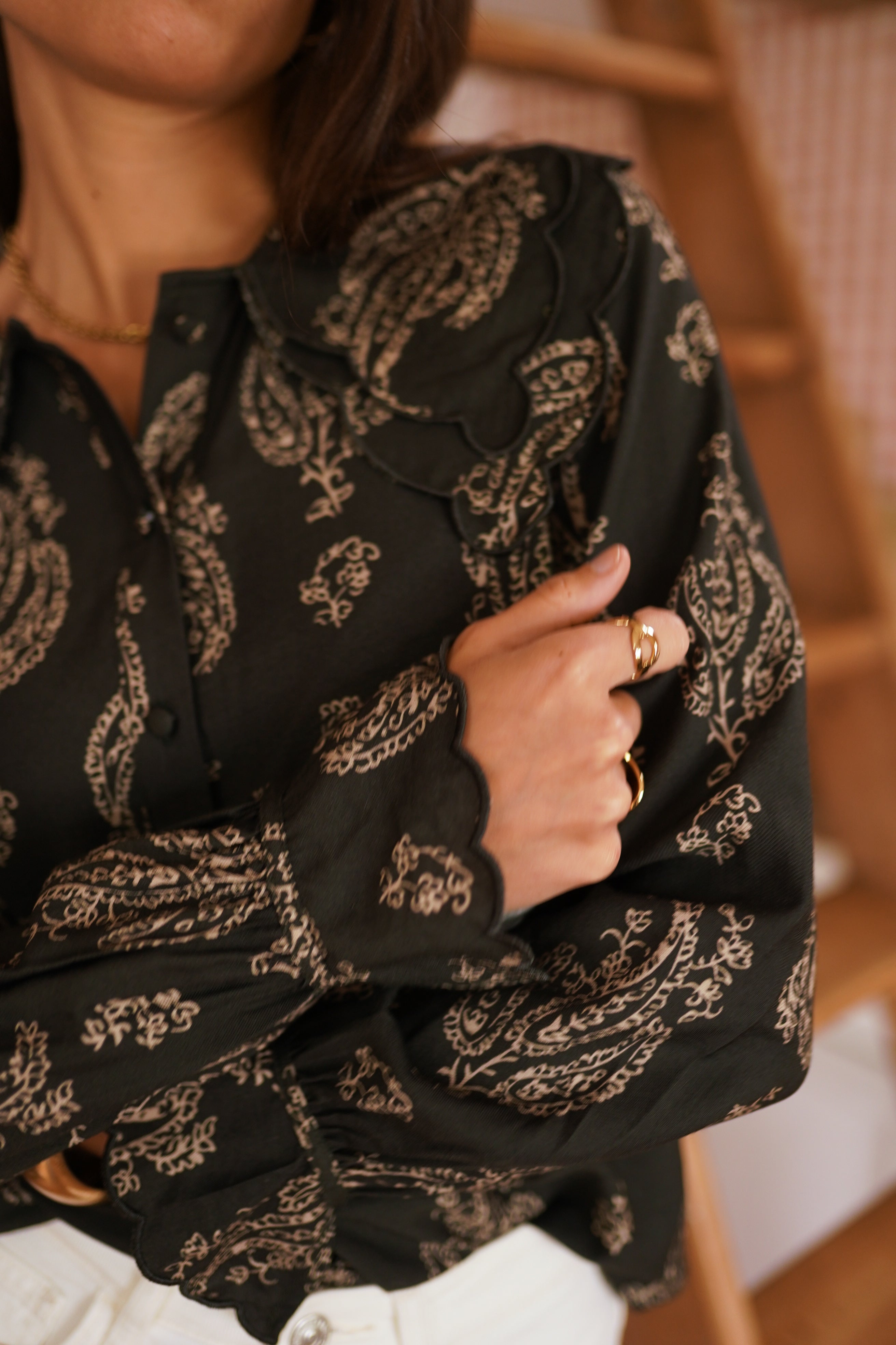 La chemise Aurélie joue la carte du chic bohème avec son imprimé paisley délicat et son col à volant signature.