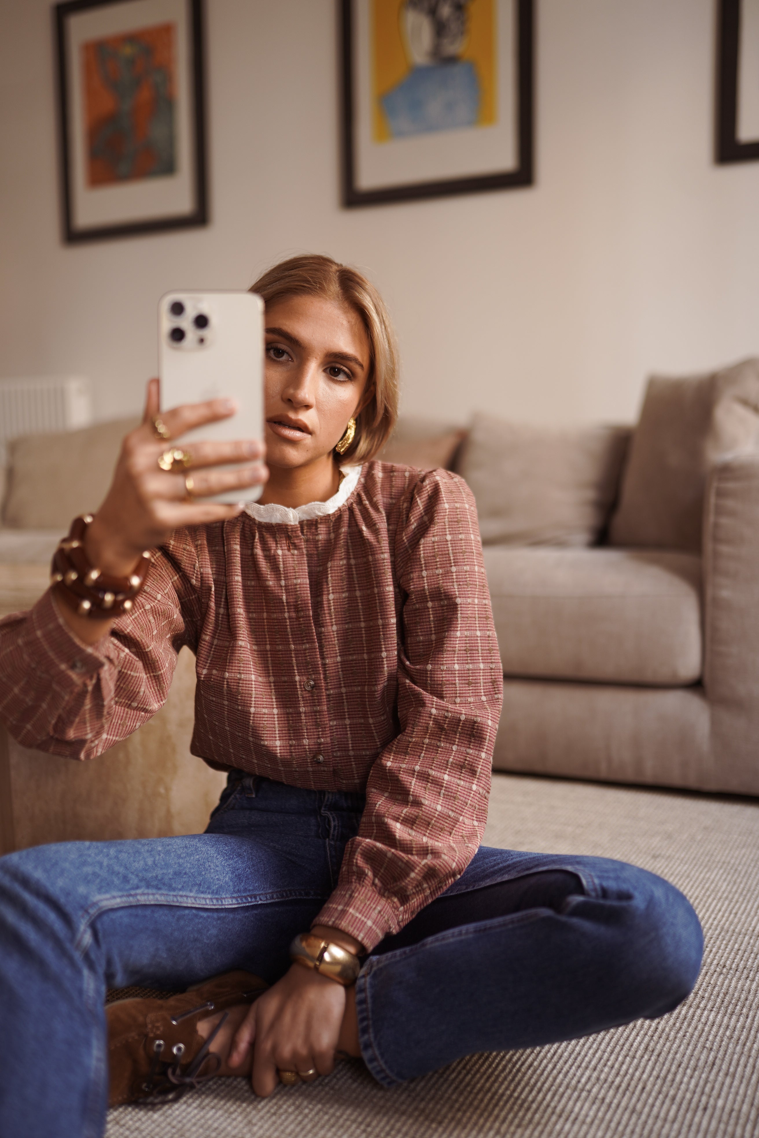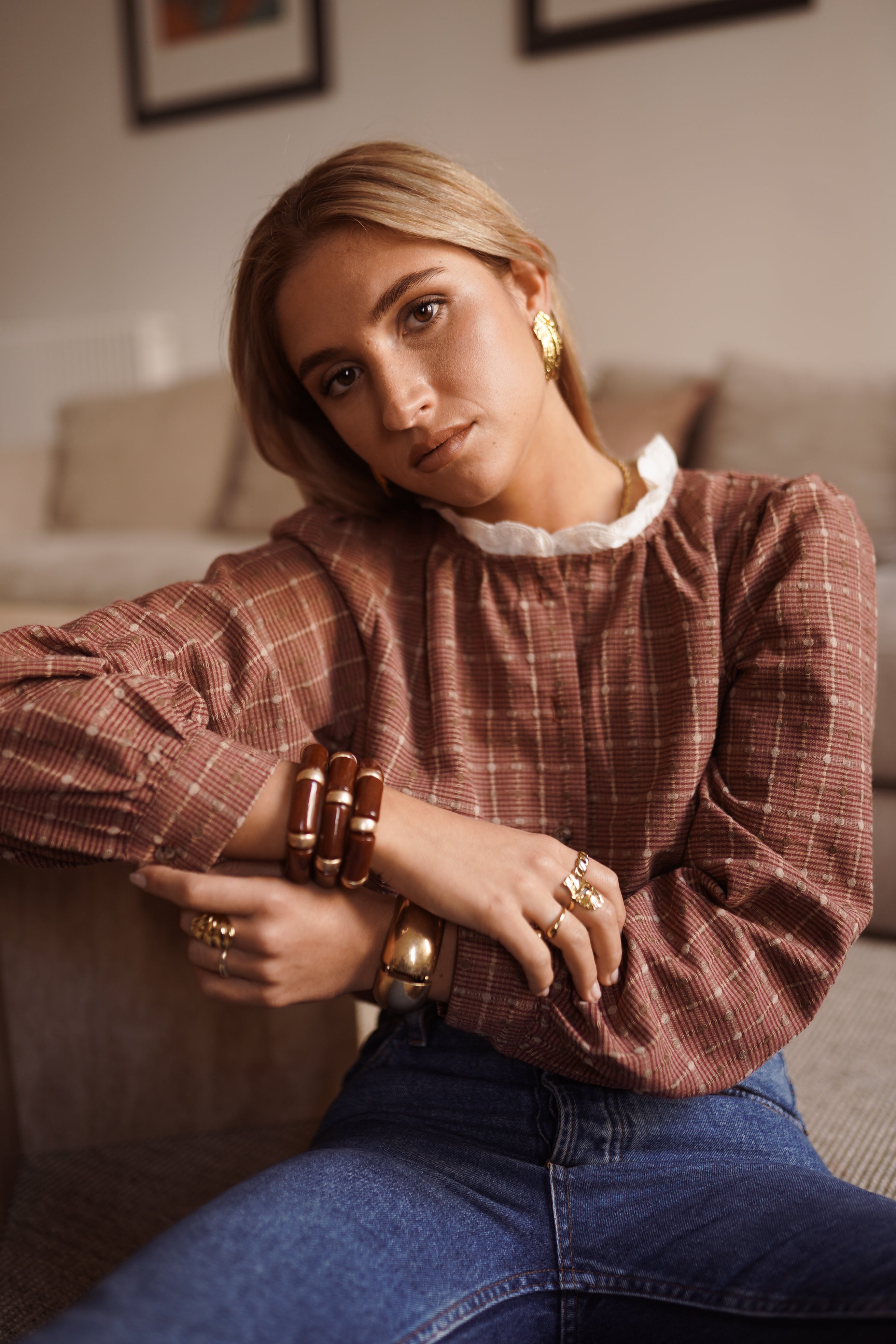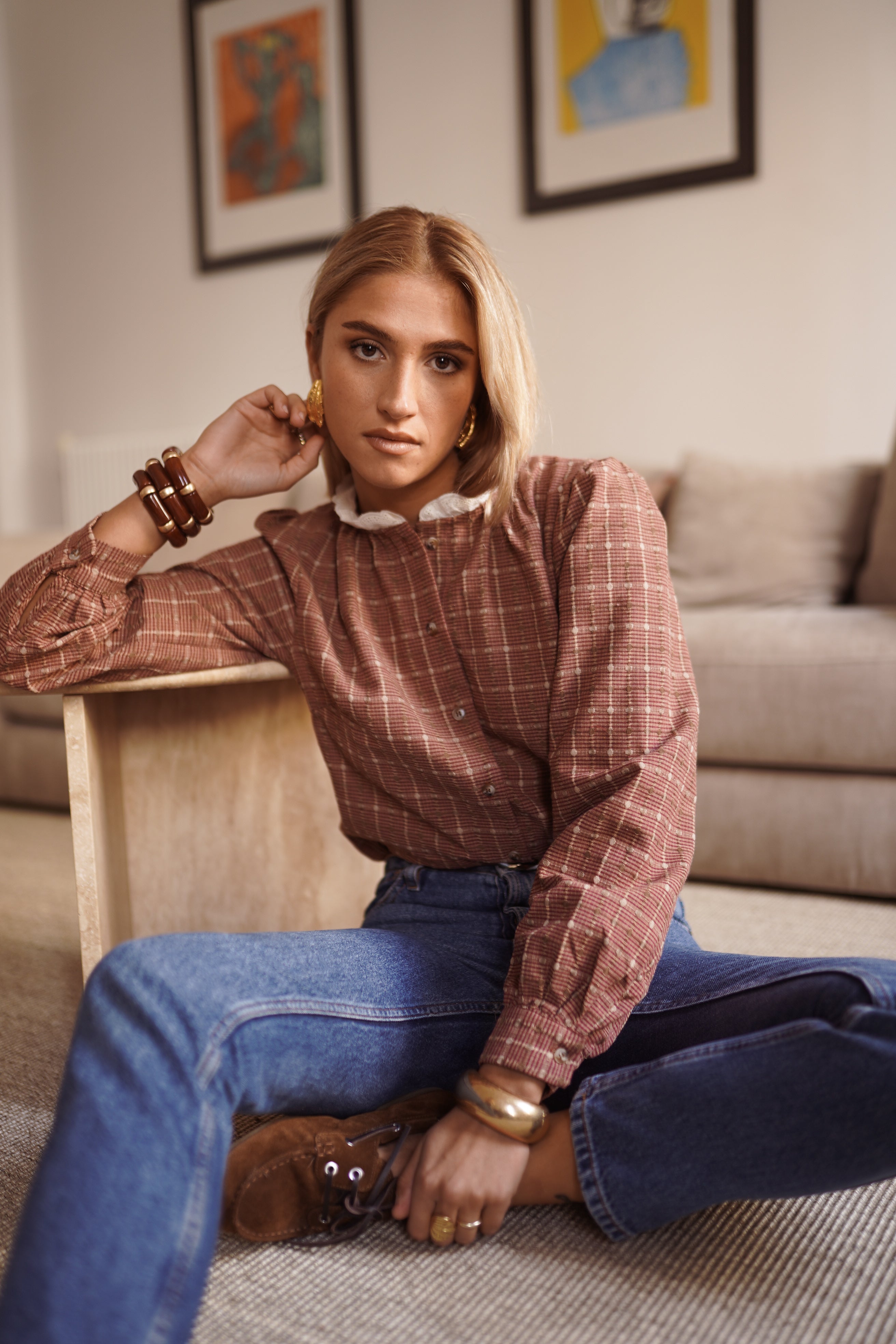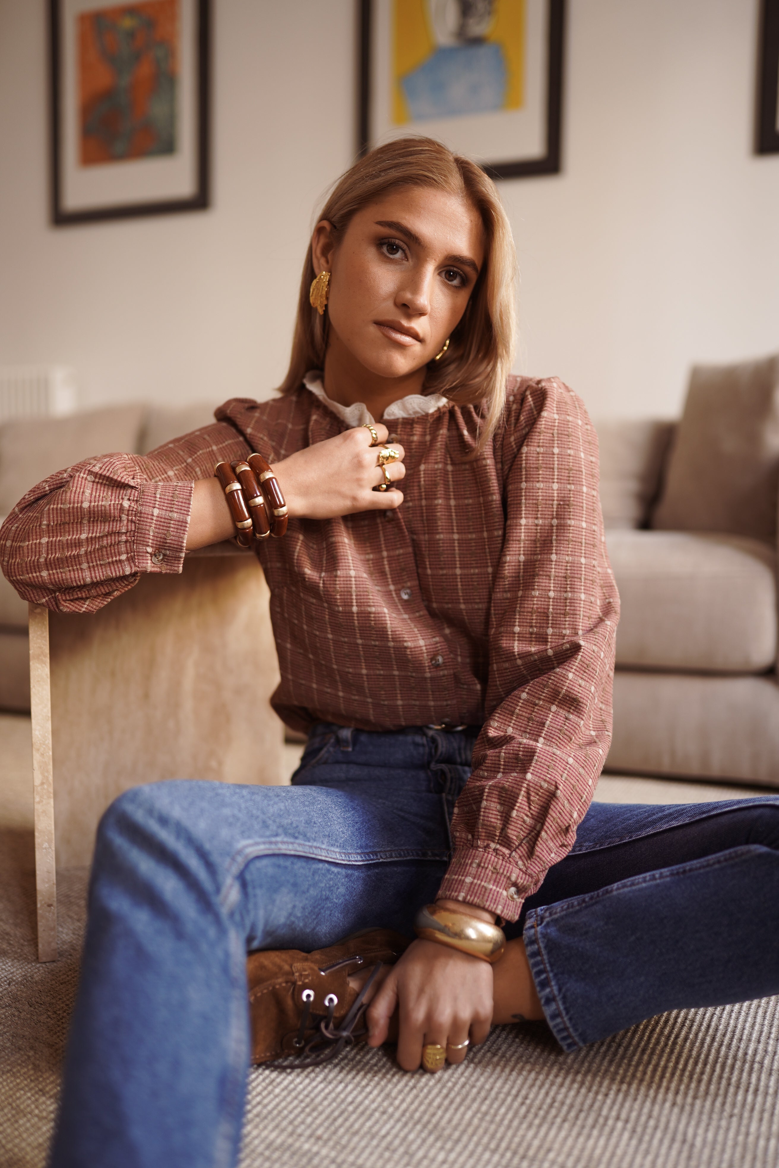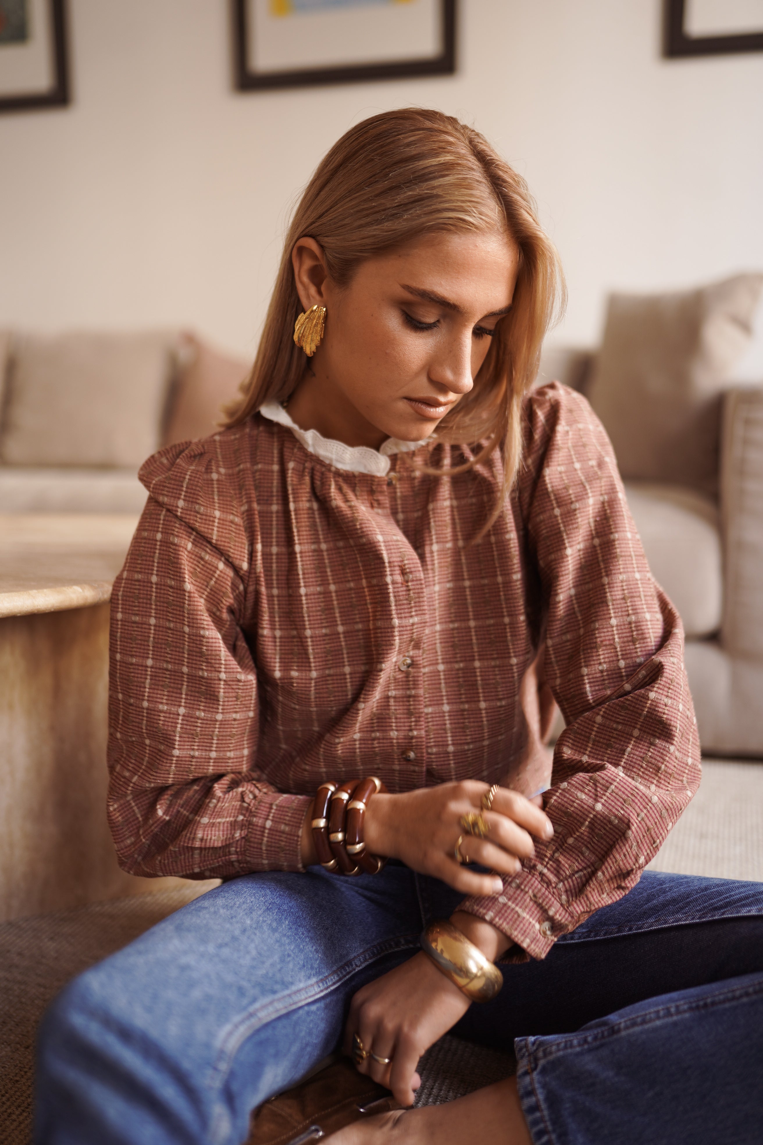 La chemise Sekai joue sur un carreau discret et une teinte bordeaux douce qui change des basiques. Son col volanté apporte une touche travaillée sans en faire trop, et son volume droit permet un porté cool au quotidien.