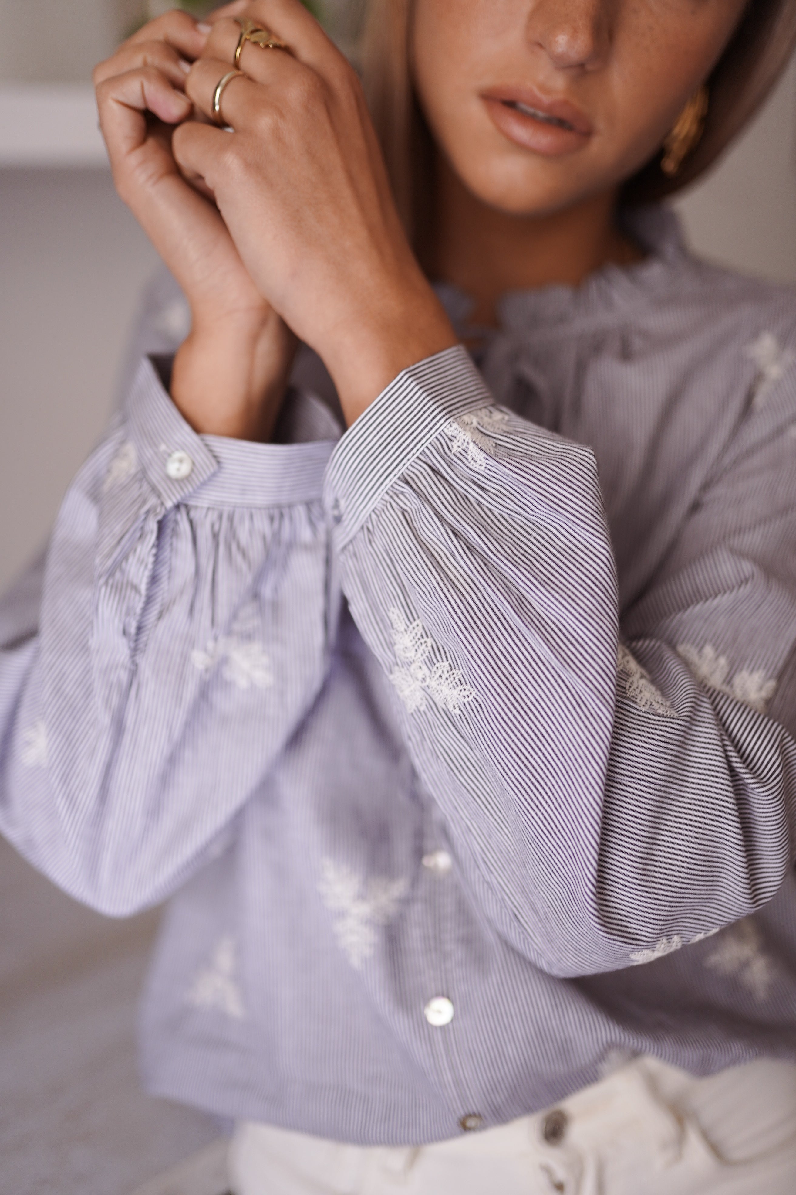 La blouse Sixtine incarne le style preppy chic avec ses fines rayures verticales et ses délicates broderies florales écrues. Son col à volants rehaussé d'un lien à nouer et ses manches bouffantes aux poignets élastiqués lui confèrent une allure romantique et maîtrisée. Une pièce légère au tombé souple, parfaite pour un look décontracté-sophistiqué.