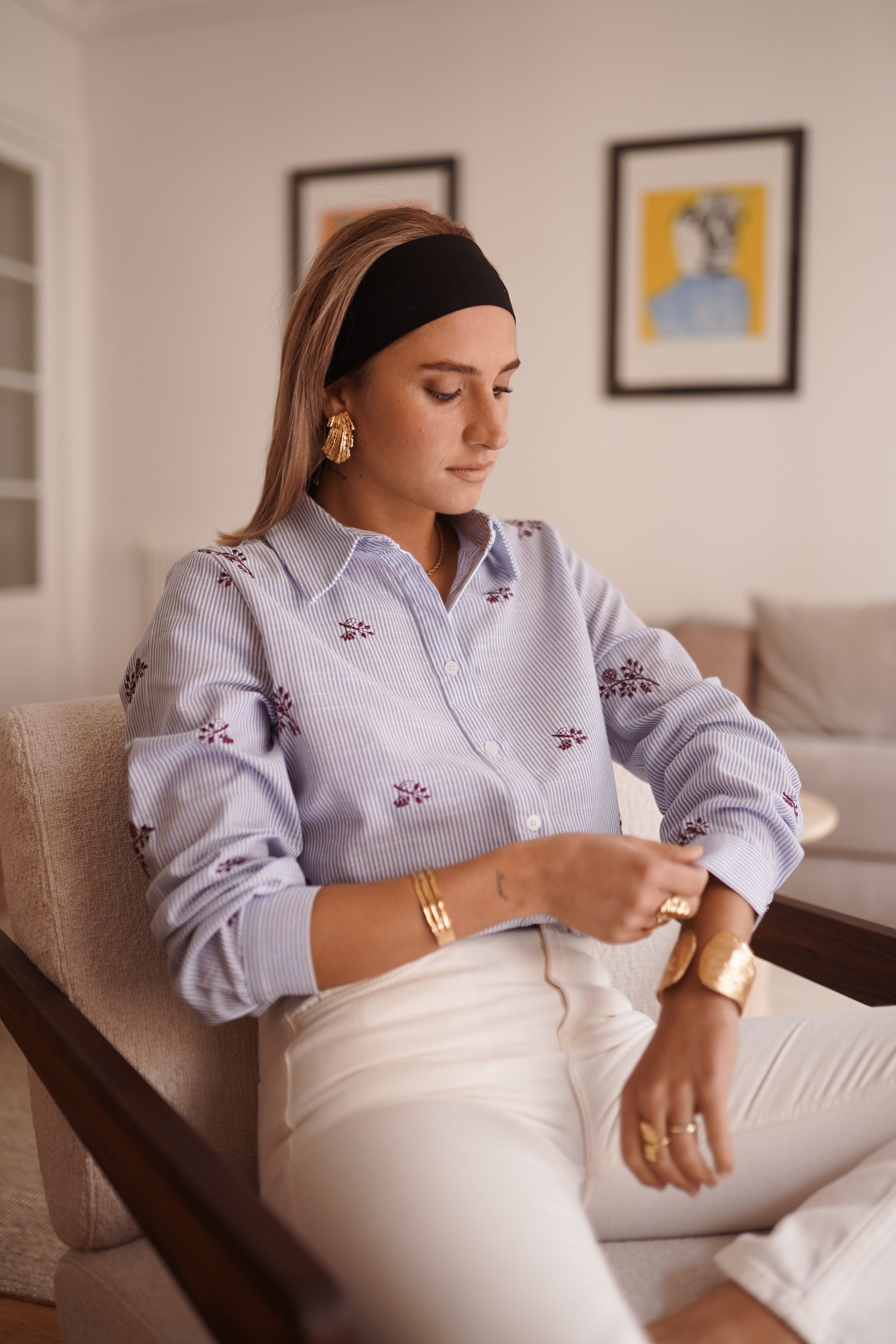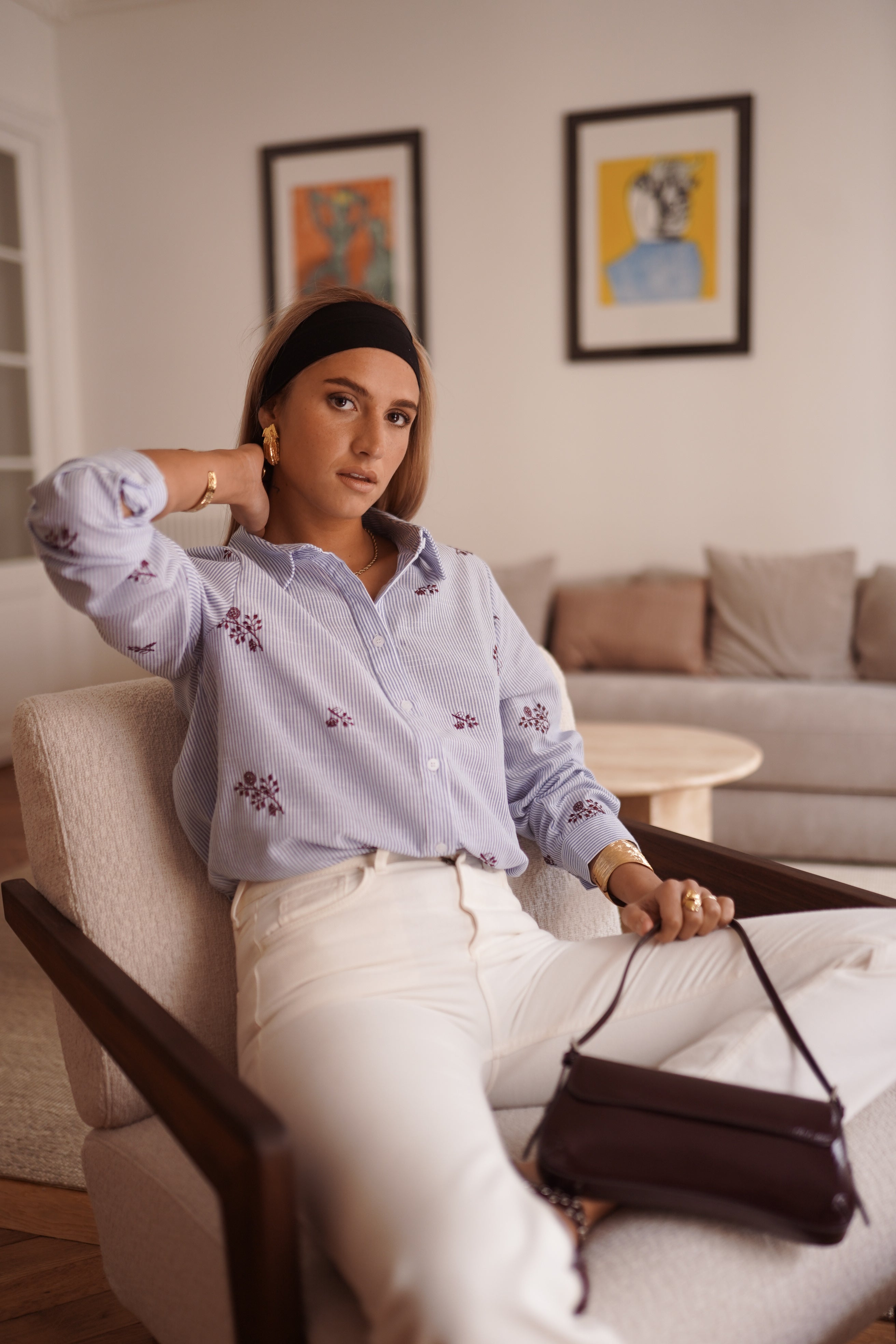 La chemise Rachel revisite le classique intemporel avec une touche de délicatesse. Son tissu en léger se pare de fines rayures bicolores (blanc et bleu ciel) qui structurent la silhouette. Elle est sublimée par des motifs floraux brodés de couleur bordeaux, apportant un contraste subtil et chic. Sa coupe ajustée mais confortable et son col chemise traditionnel en font une pièce idéale pour le bureau ou pour un look décontracté-élégant.