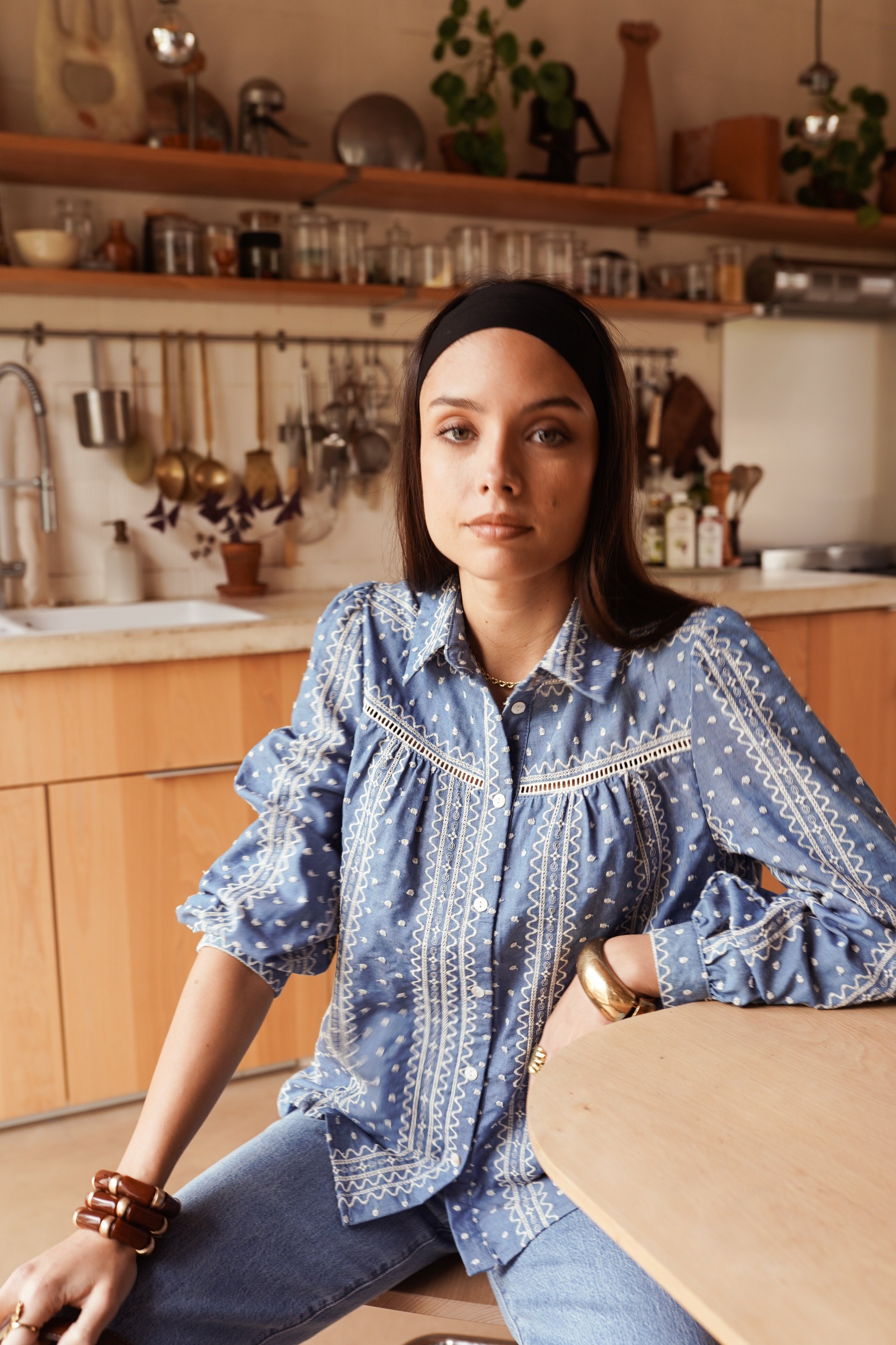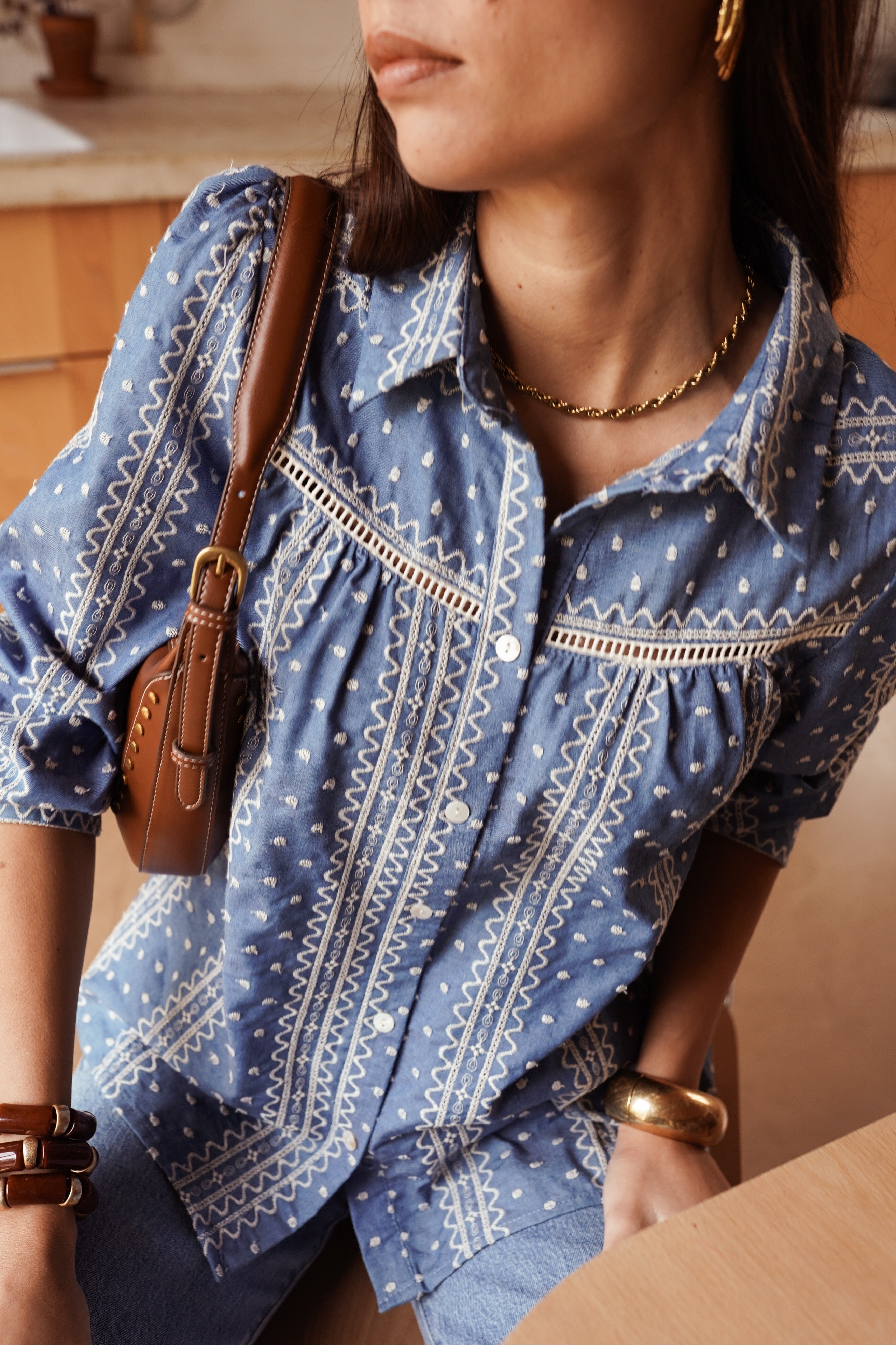 La chemise Georgina revisite le denim avec une allure artisanale. En chambray bleu clair rehaussé de broderies ivoire, elle joue sur les détails avec ses empiècements ajourés et ses finitions délicates.