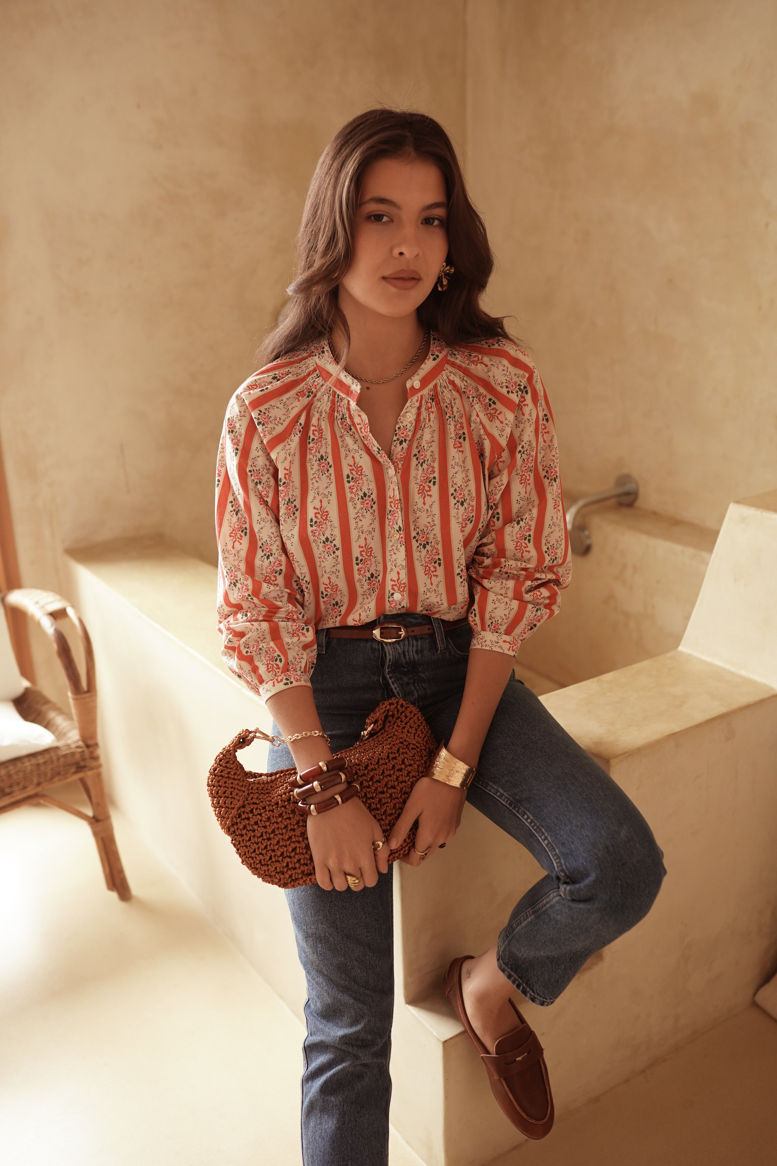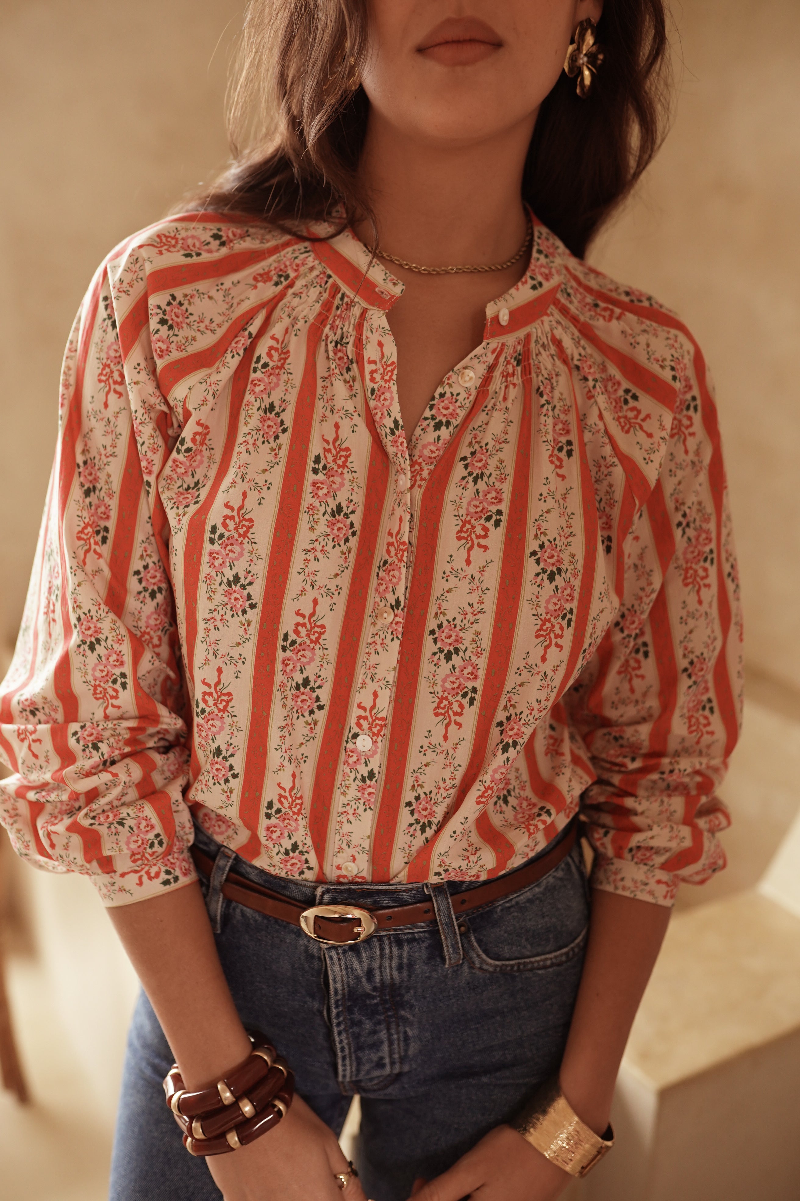 Kira affirme un imprimé rayé floral au caractère doux et graphique. Une coupe fluide, un col ouvert et un jeu de volumes subtils qui donnent du mouvement à la silhouette.