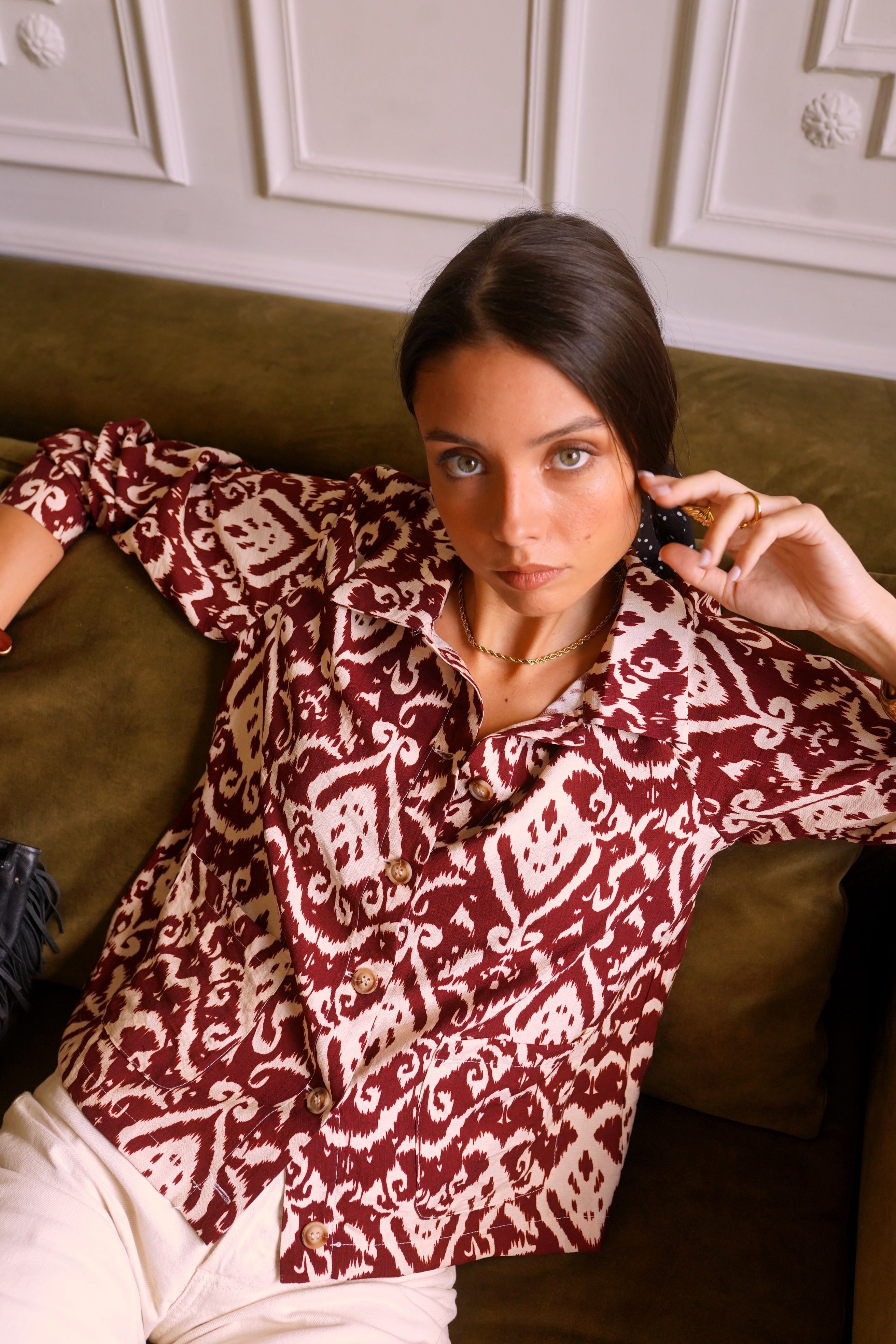a chemise Kiran se distingue par son imprimé graphique inspiré de l’ikat, jouant sur un contraste profond entre le bordeaux intense et l’écru lumineux. Sa coupe fluide et droite lui confère une élégance décontractée, tandis que son col classique et sa patte de boutonnage discrète renforcent son allure intemporelle. Les manches longues se terminent par des poignets boutonnés, ajoutant une note soignée.