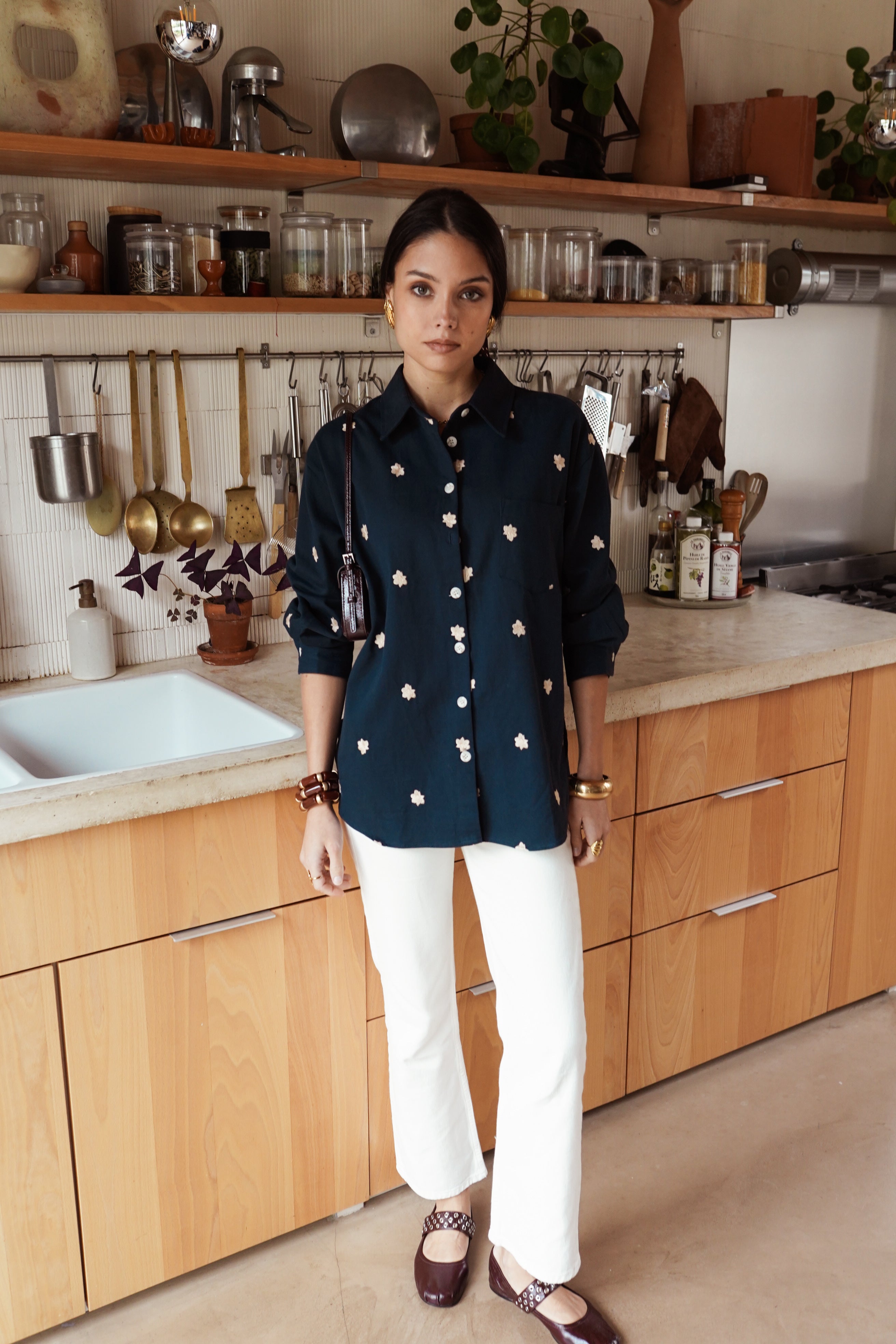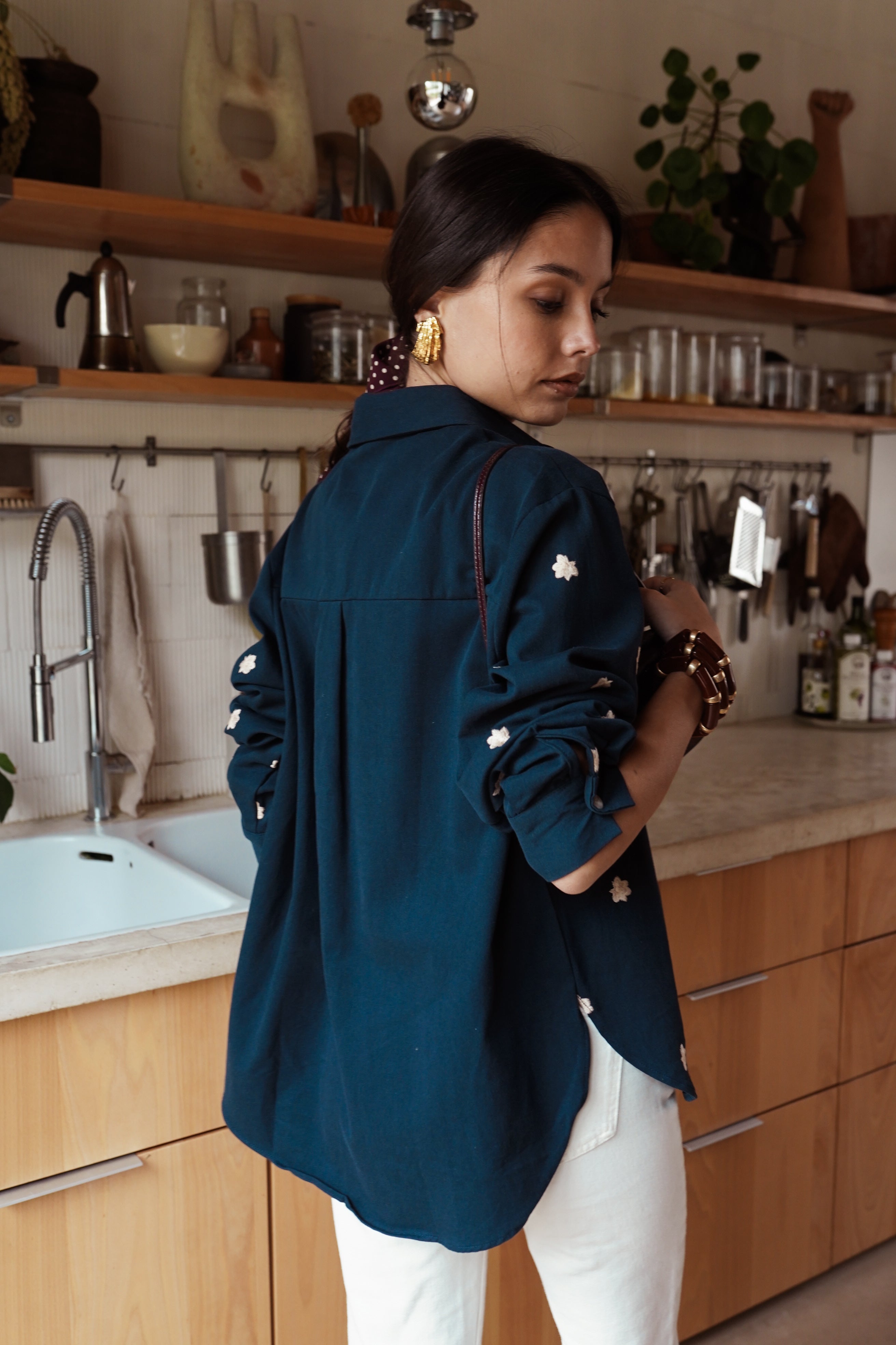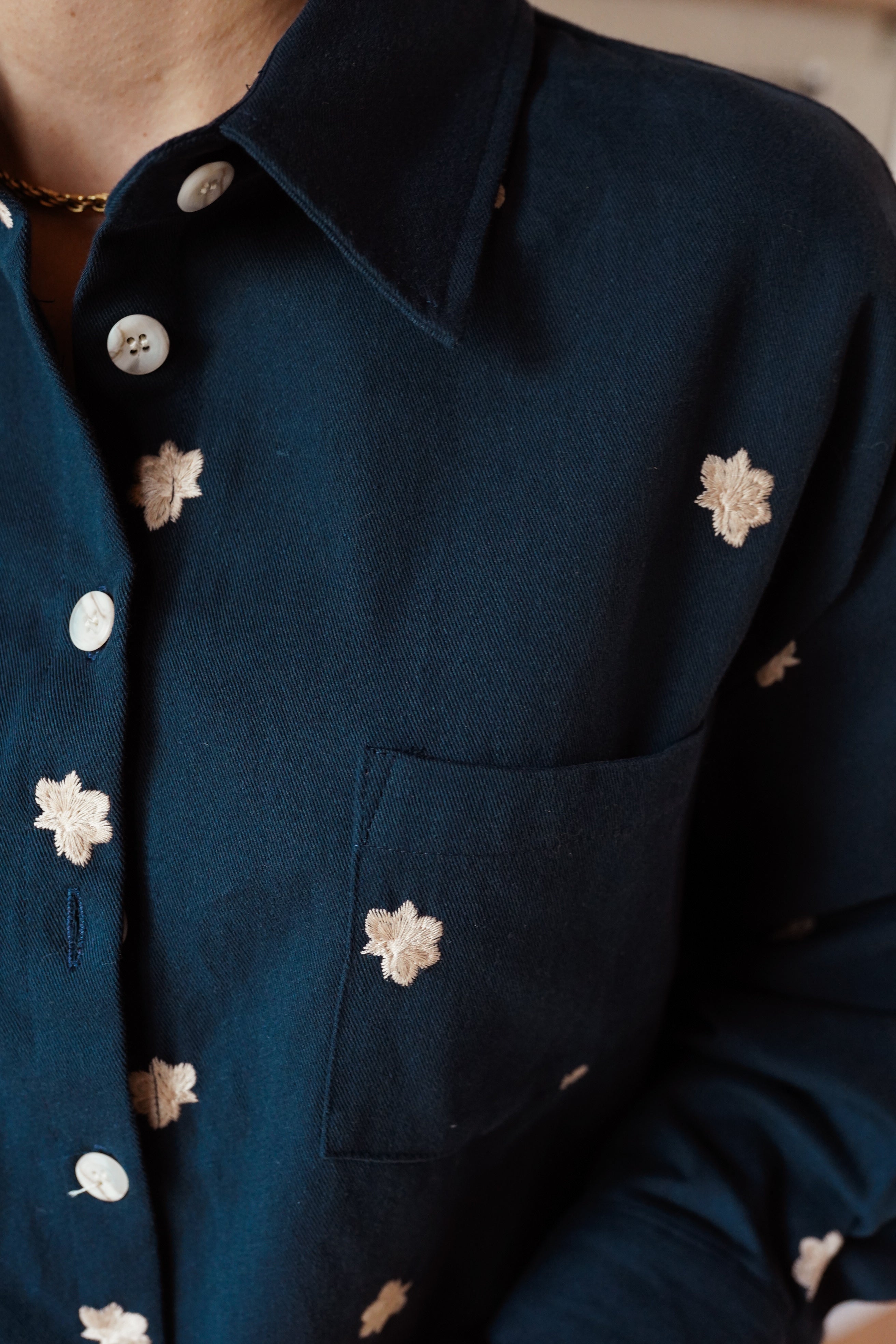 La chemise Kylie séduit par son bleu profond parsemé de petites fleurs brodées ton sur ton. Sa coupe fluide et son col ouvert lui donnent une allure décontractée et contemporaine, parfaite pour une touche de fraîcheur au quotidien.