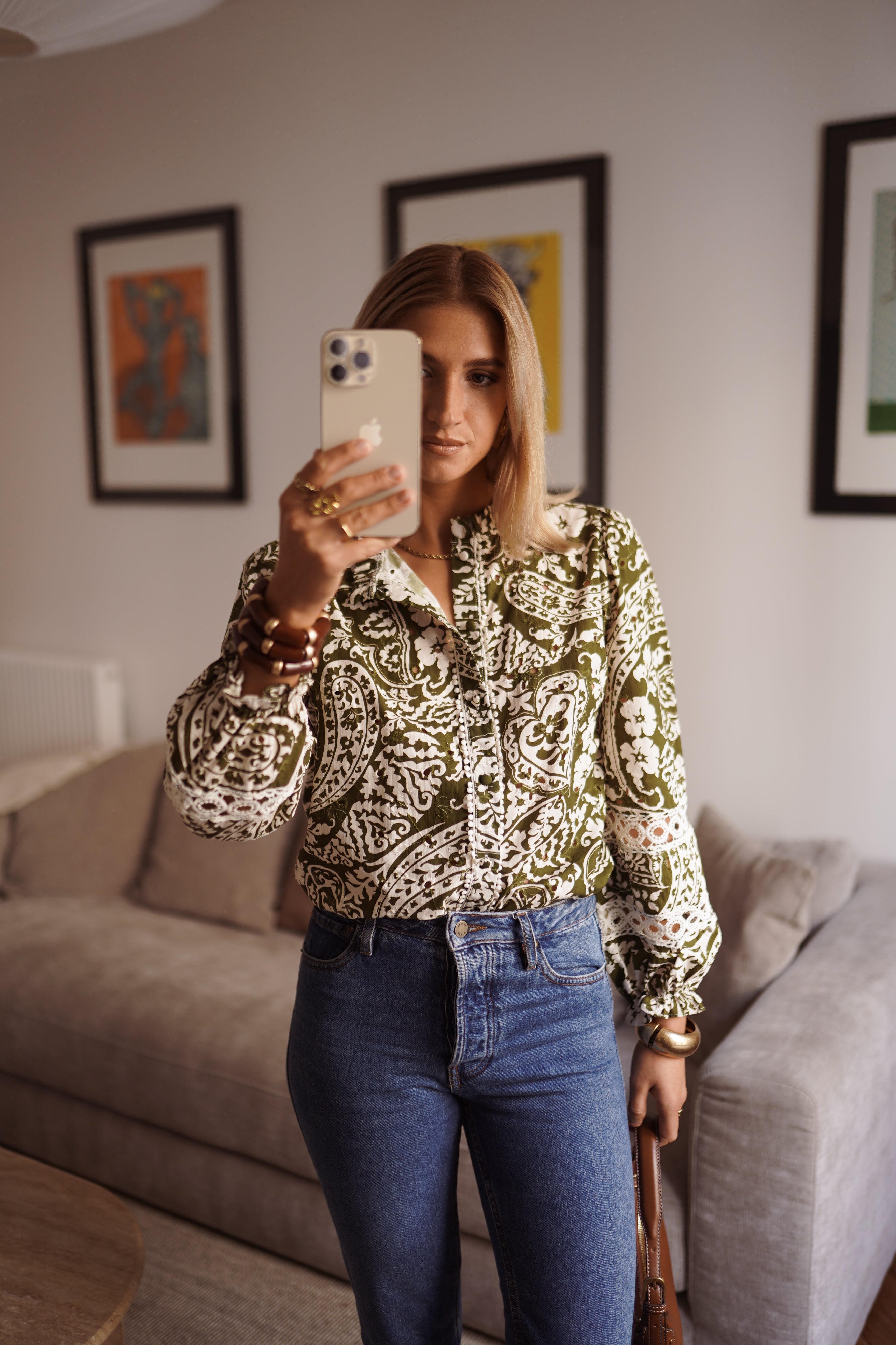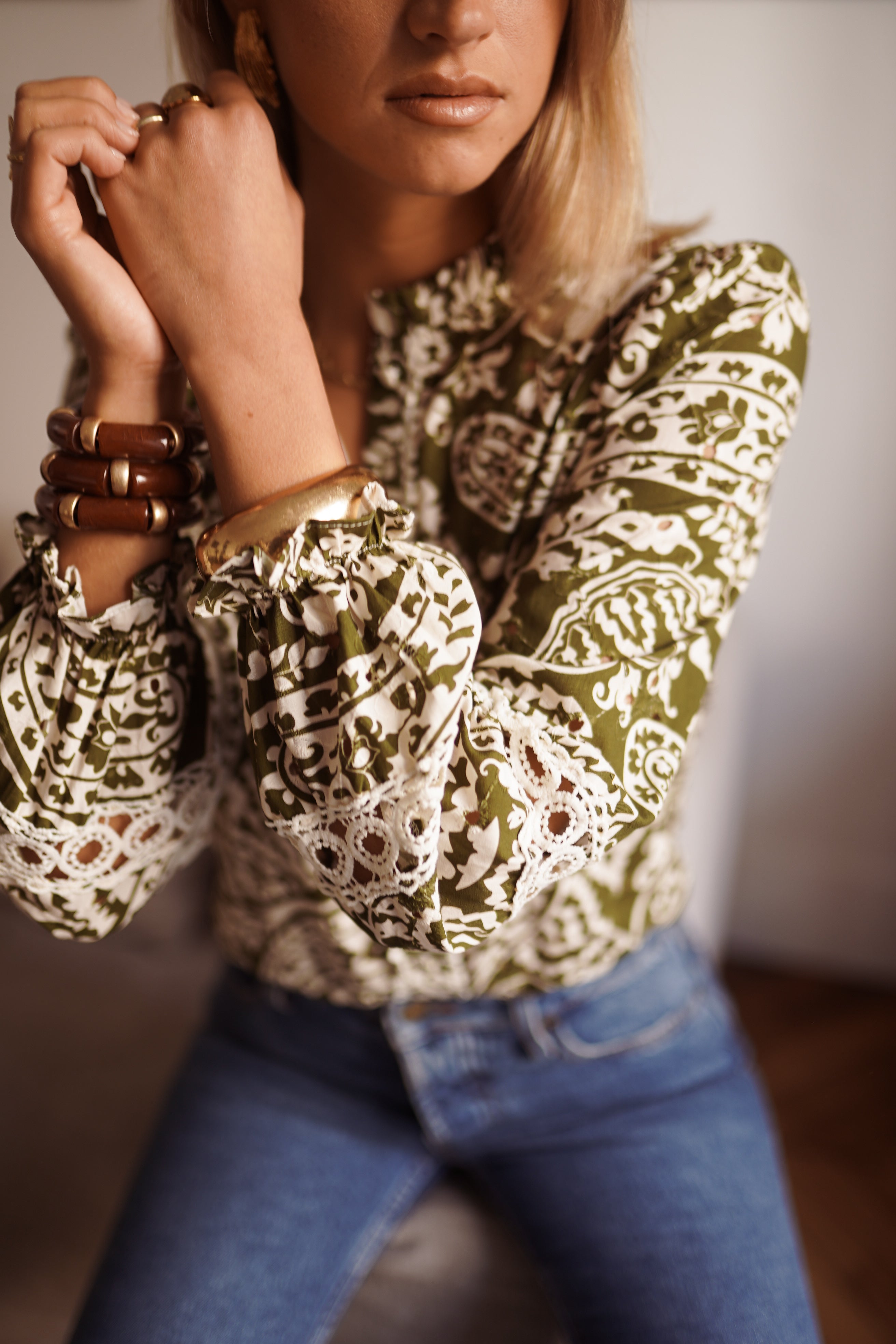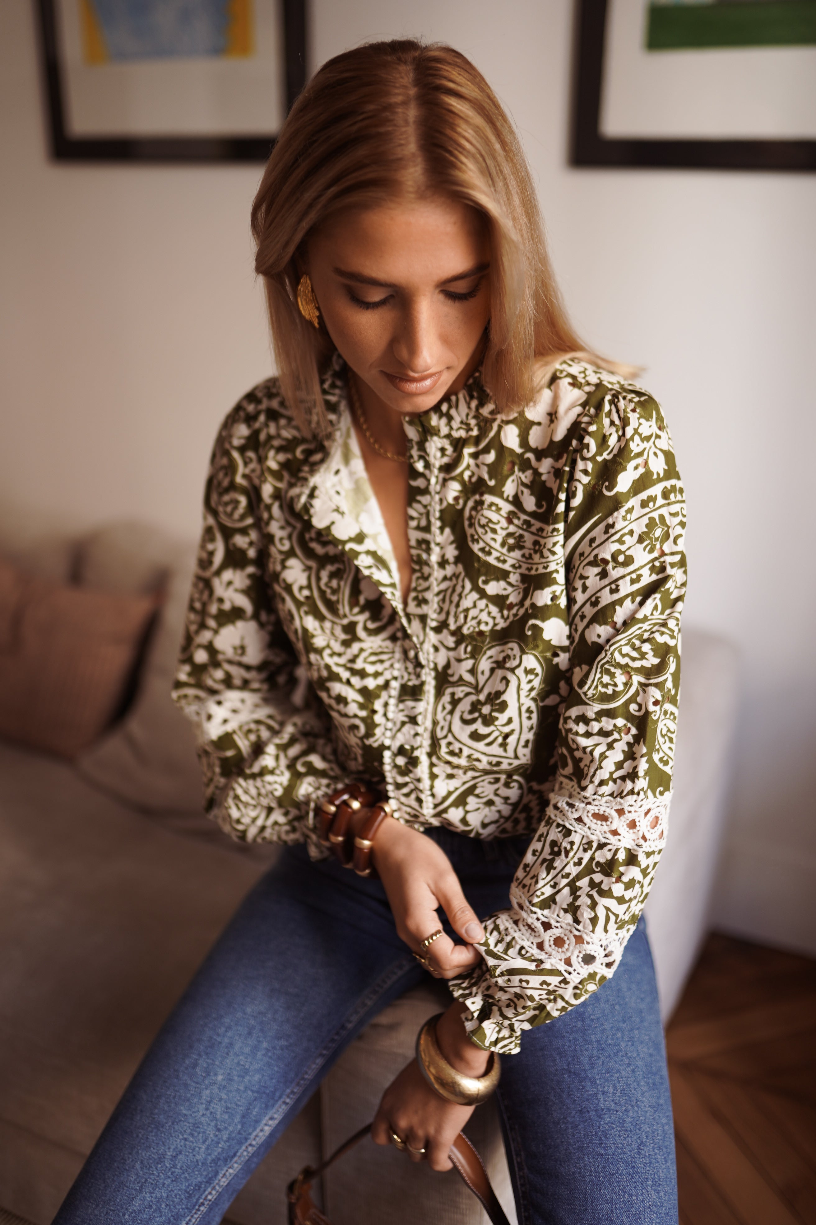 La chemise Jazz se distingue par son imprimé kaki mêlé à des motifs écrus travaillés. Une pièce forte et graphique, portée par des détails brodés et des jeux de matières qui rythment toute la silhouette. Son col froncé et ses incrustations ajourées lui donnent une vraie singularité.