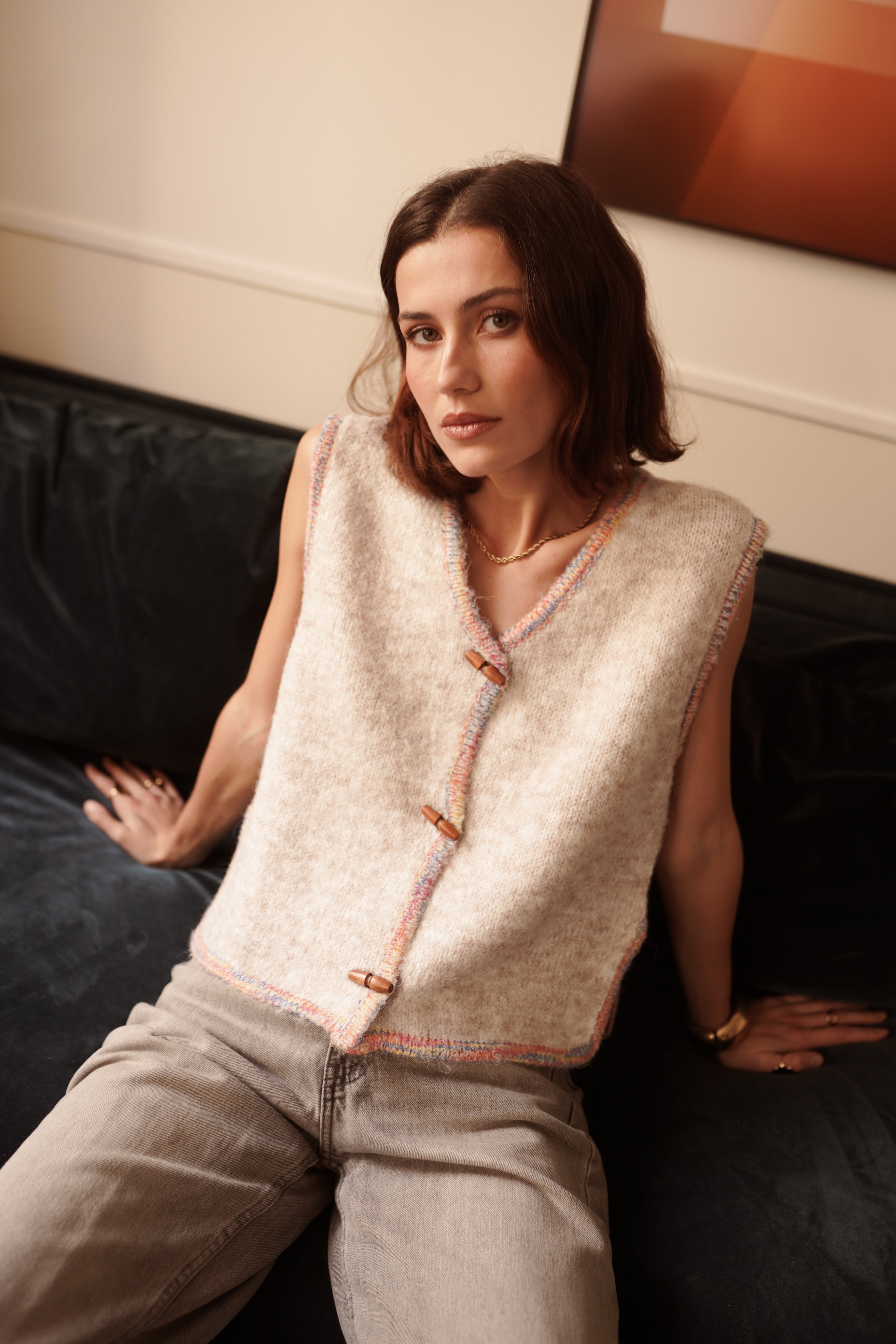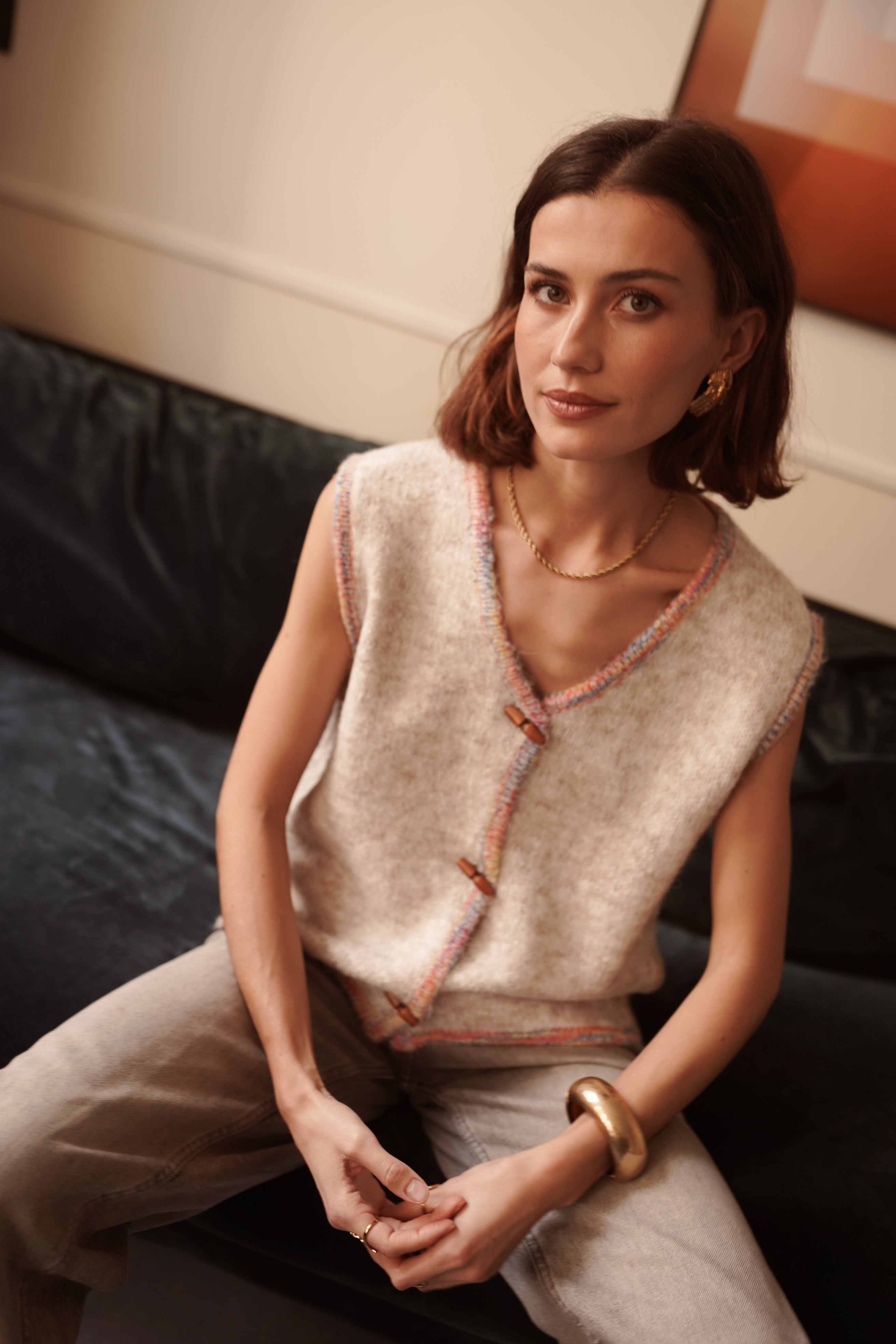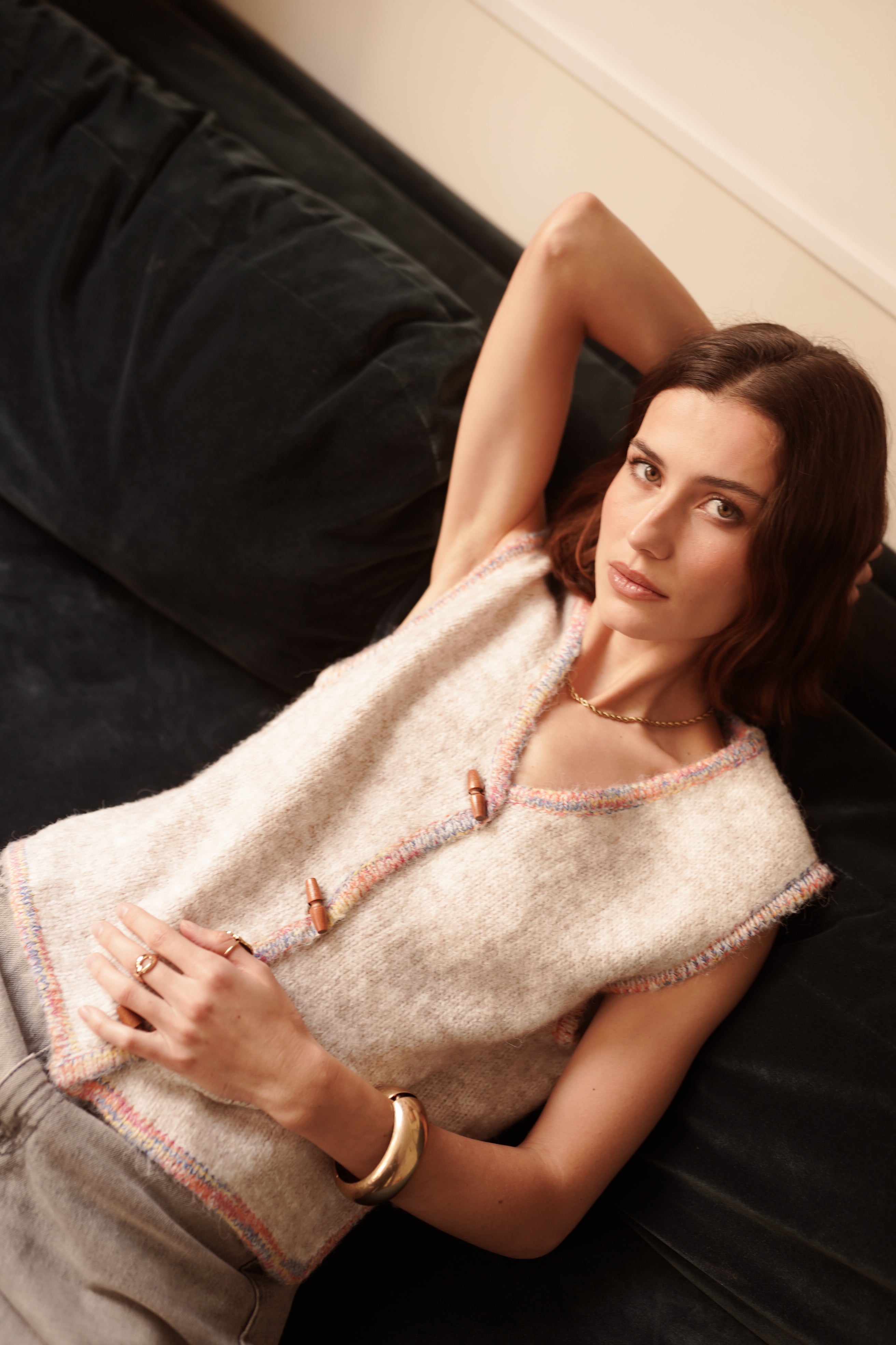 Candice revisite le gilet sans manches avec une douceur enveloppante et des finitions colorées qui apportent juste ce qu’il faut de personnalité. Une pièce simple en apparence, mais riche en détails.