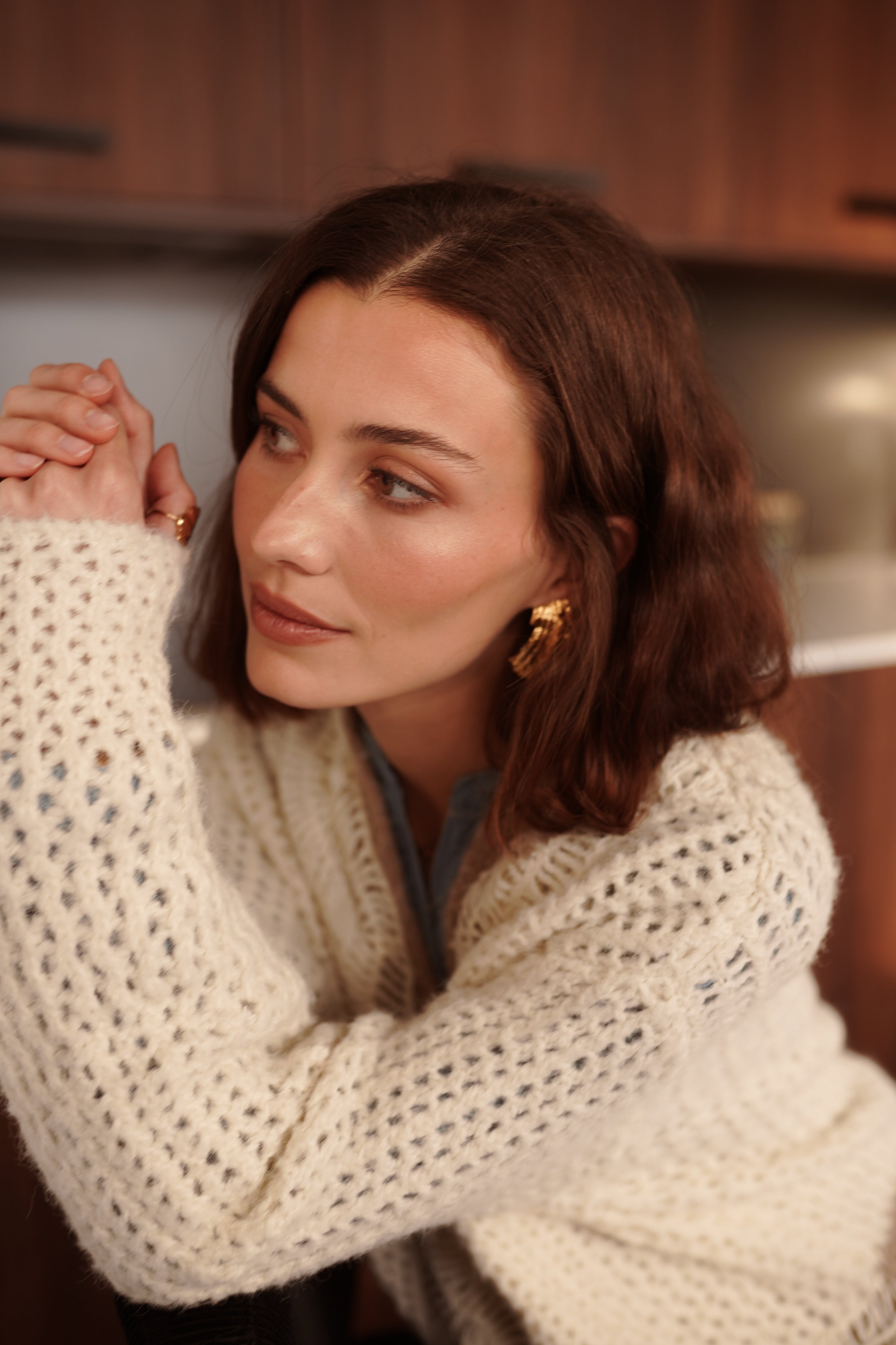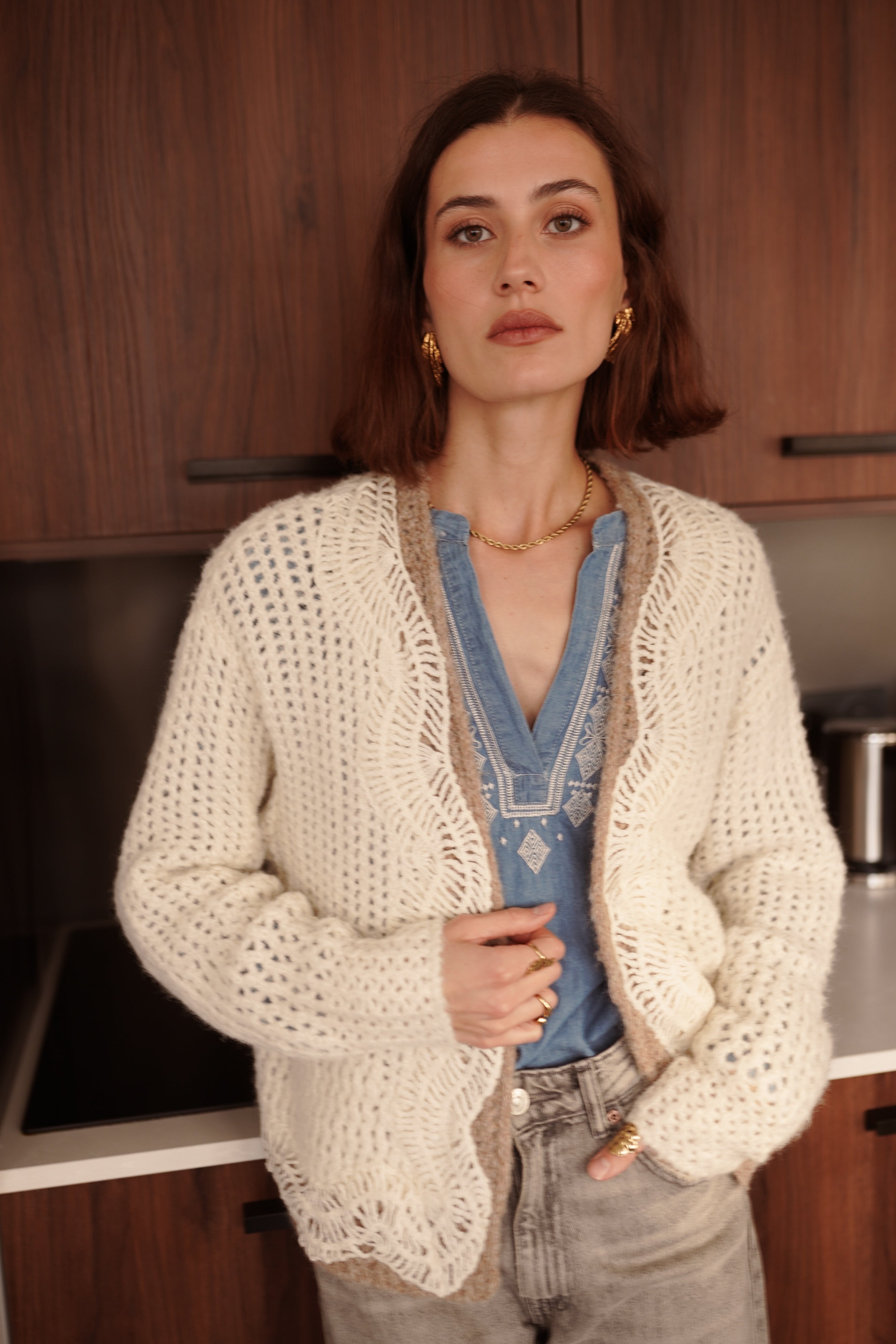 Le gilet Cassy mêle relief, transparence et douceur dans une maille ajourée qui joue la carte du volume délicat.