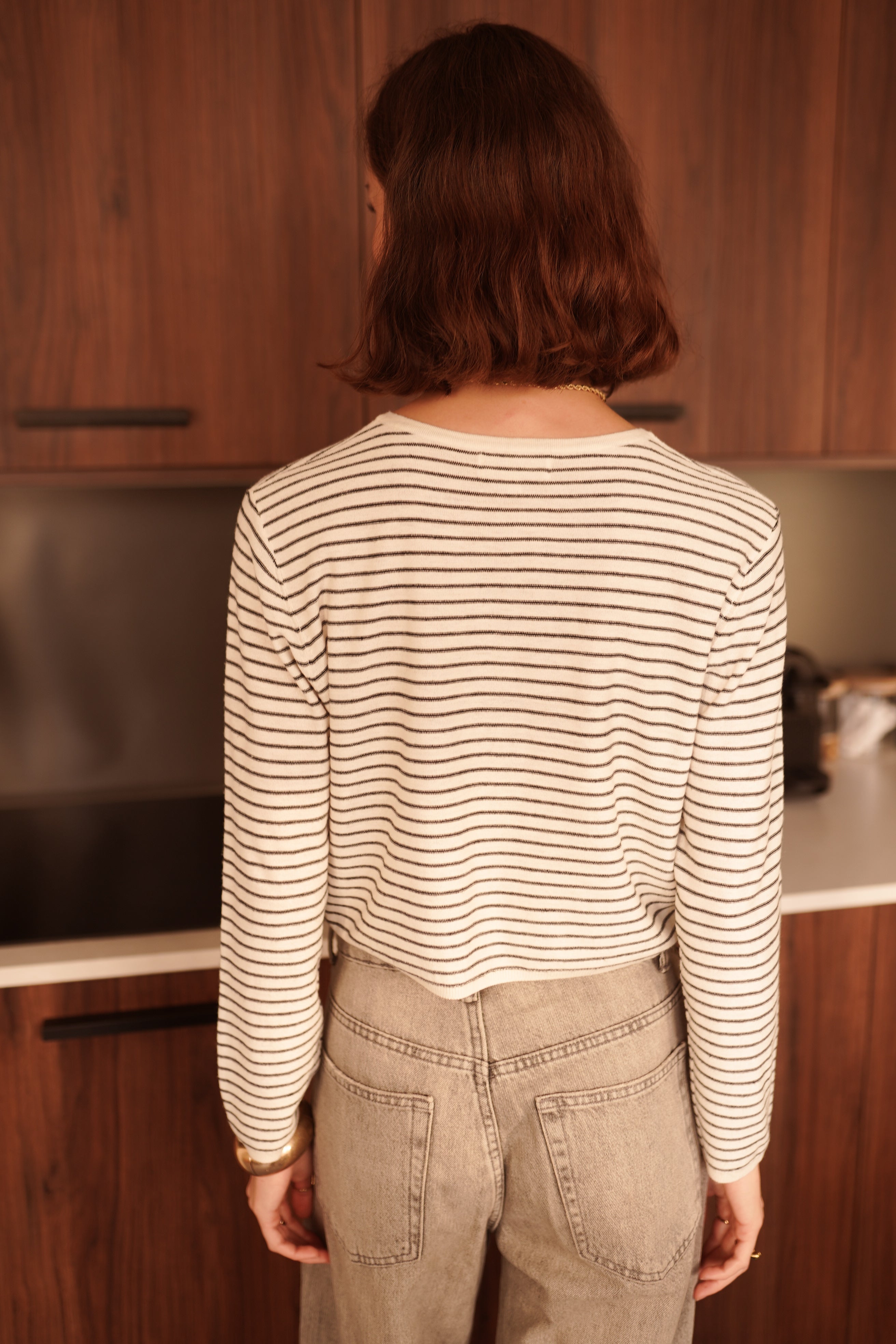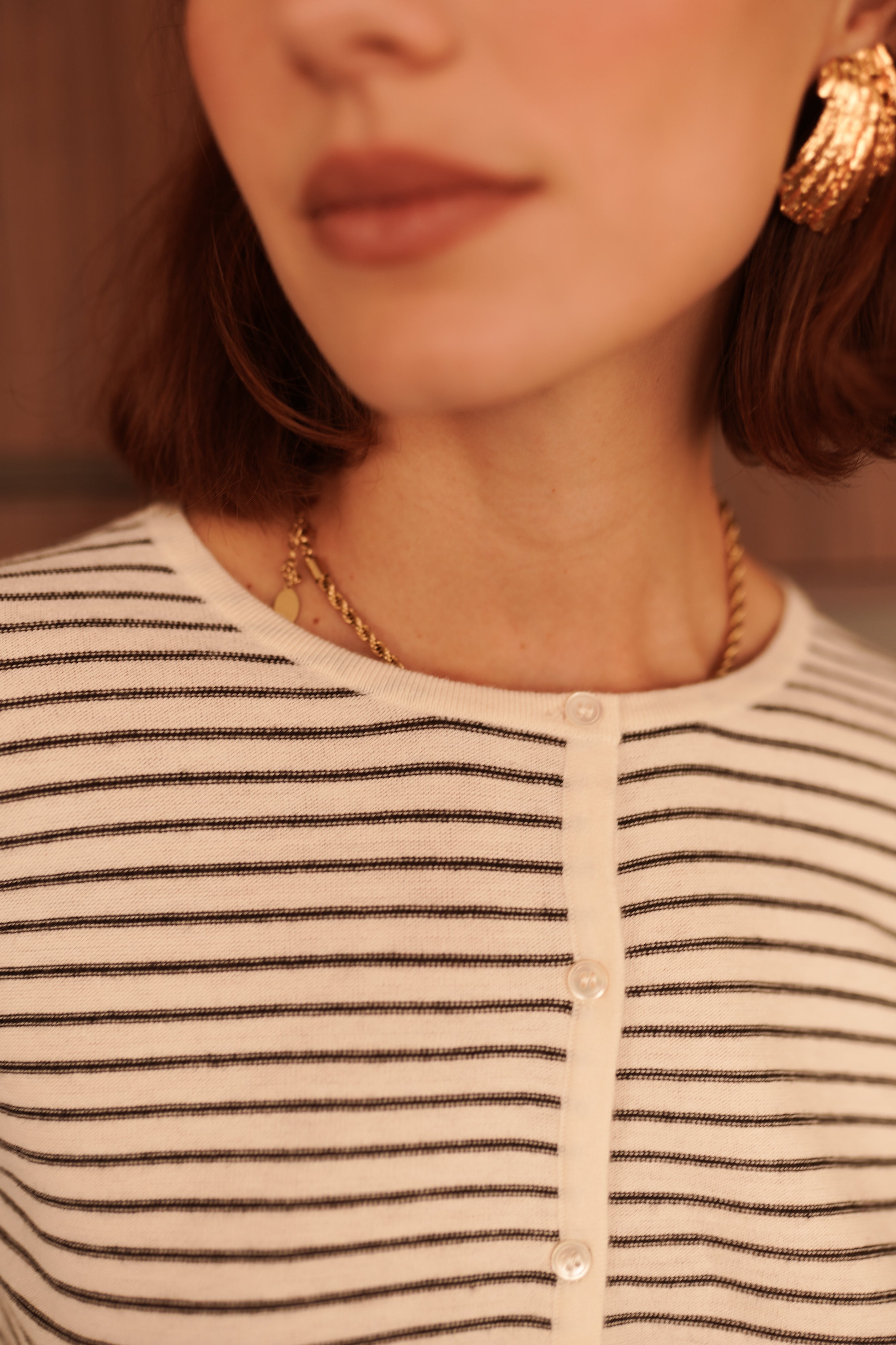 Avec ses rayures fines et sa ligne raccourcie, le top Célia apporte une modernité discrète et précise. Une maille légère, épurée, pensée pour celles qui aiment la simplicité juste bien faite.