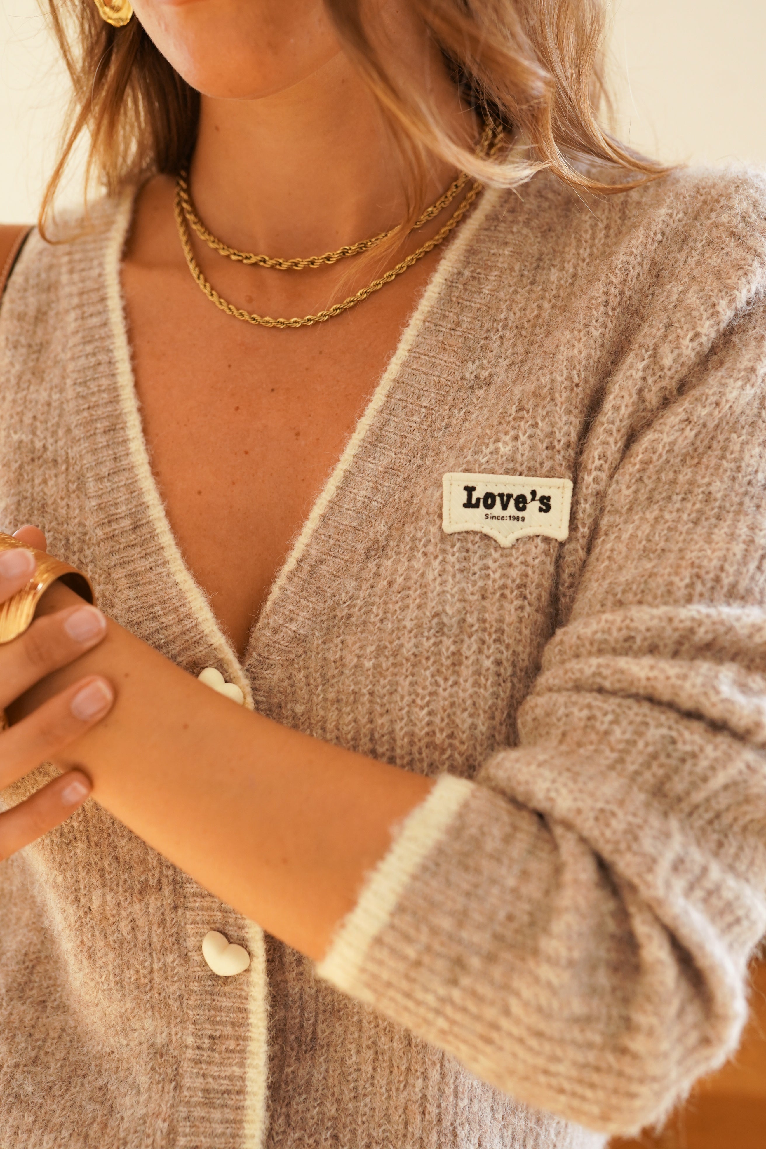 Le gilet Lia joue la carte de la douceur et de la féminité. Tricoté dans une maille fine et moelleuse, il séduit par son tombé léger et son toucher délicat. Ses boutons nacrés et son patch “love” brodé à la main apportent une note romantique et spontanée. Facile à associer, il s’enfile aussi bien sur une chemise imprimée que sur un simple t-shirt.