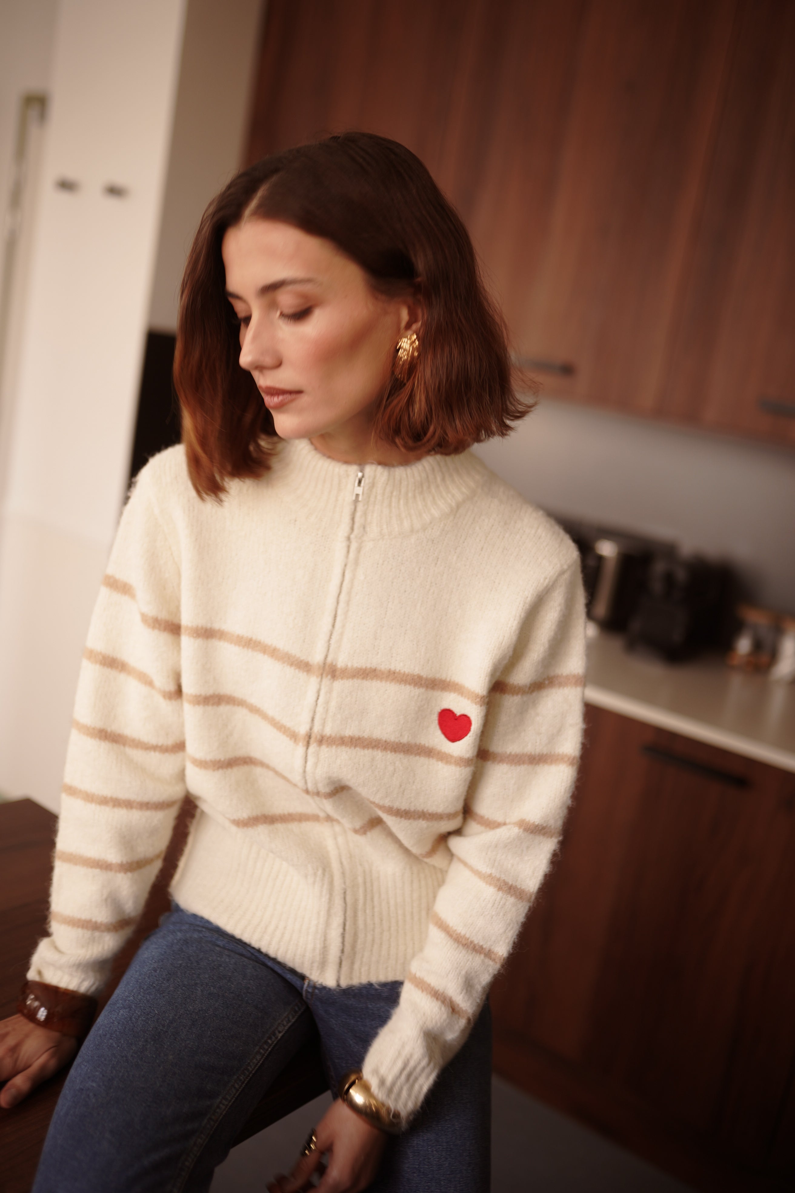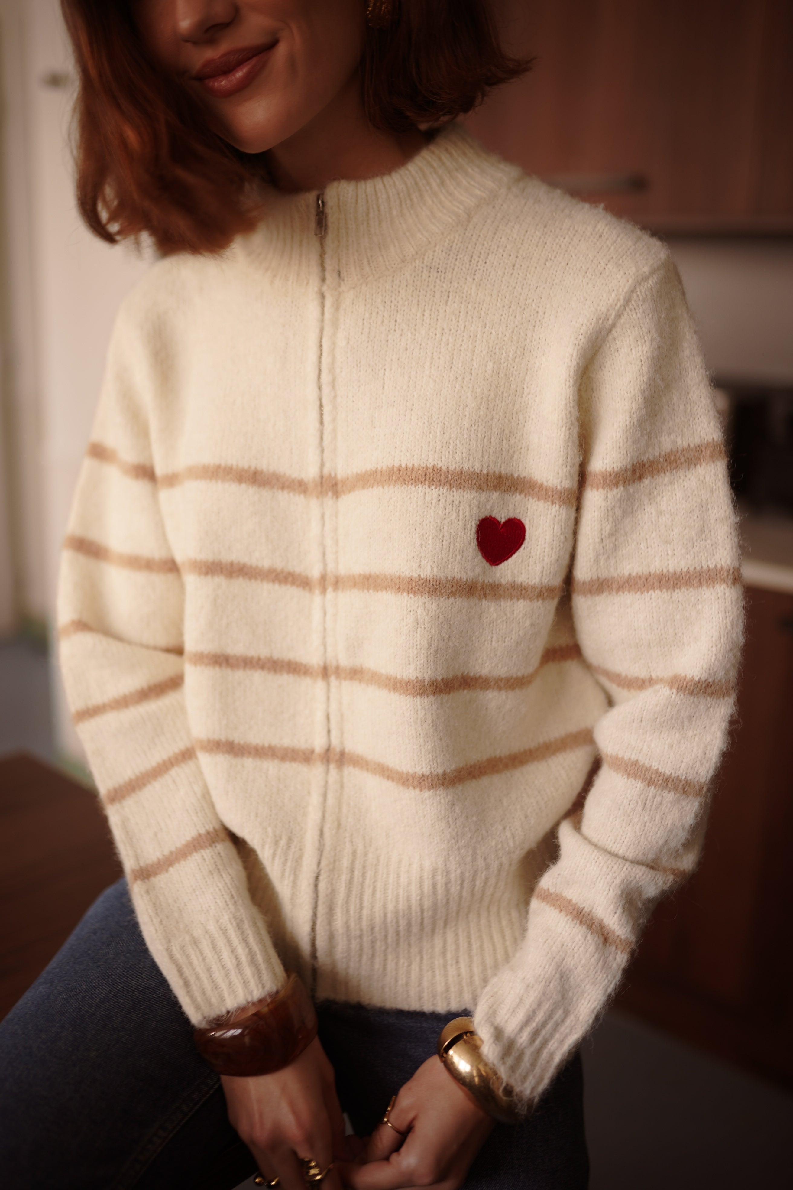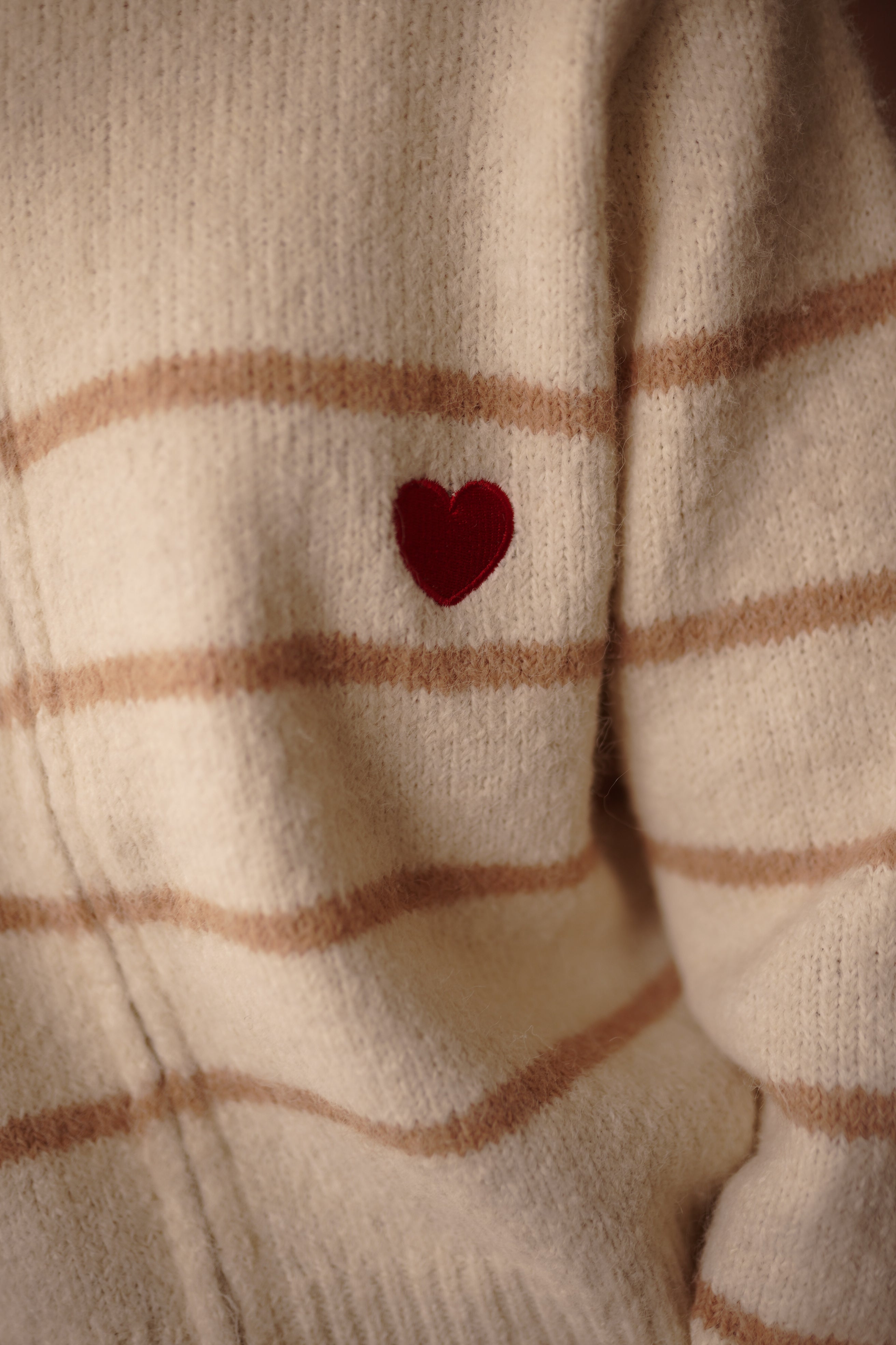 Le gilet Milo joue la carte de la douceur avec un esprit casual délicat : une maille rayée légère et un cœur rouge brodé qui apporte la note tendre et graphique.