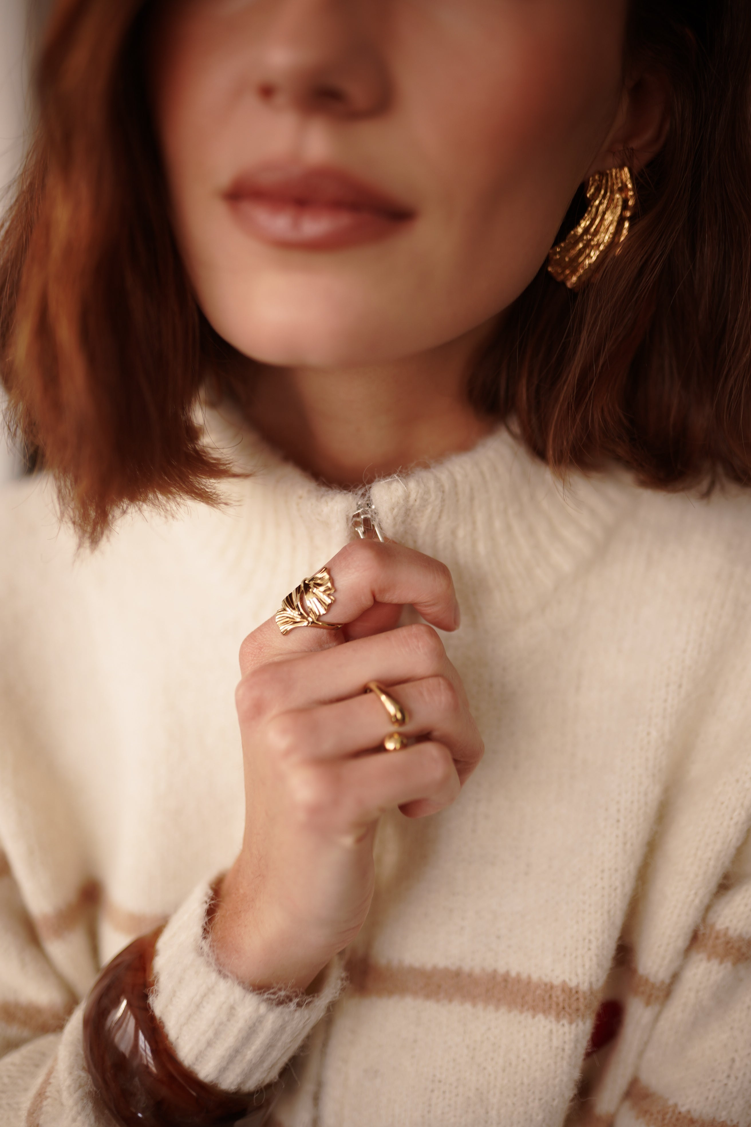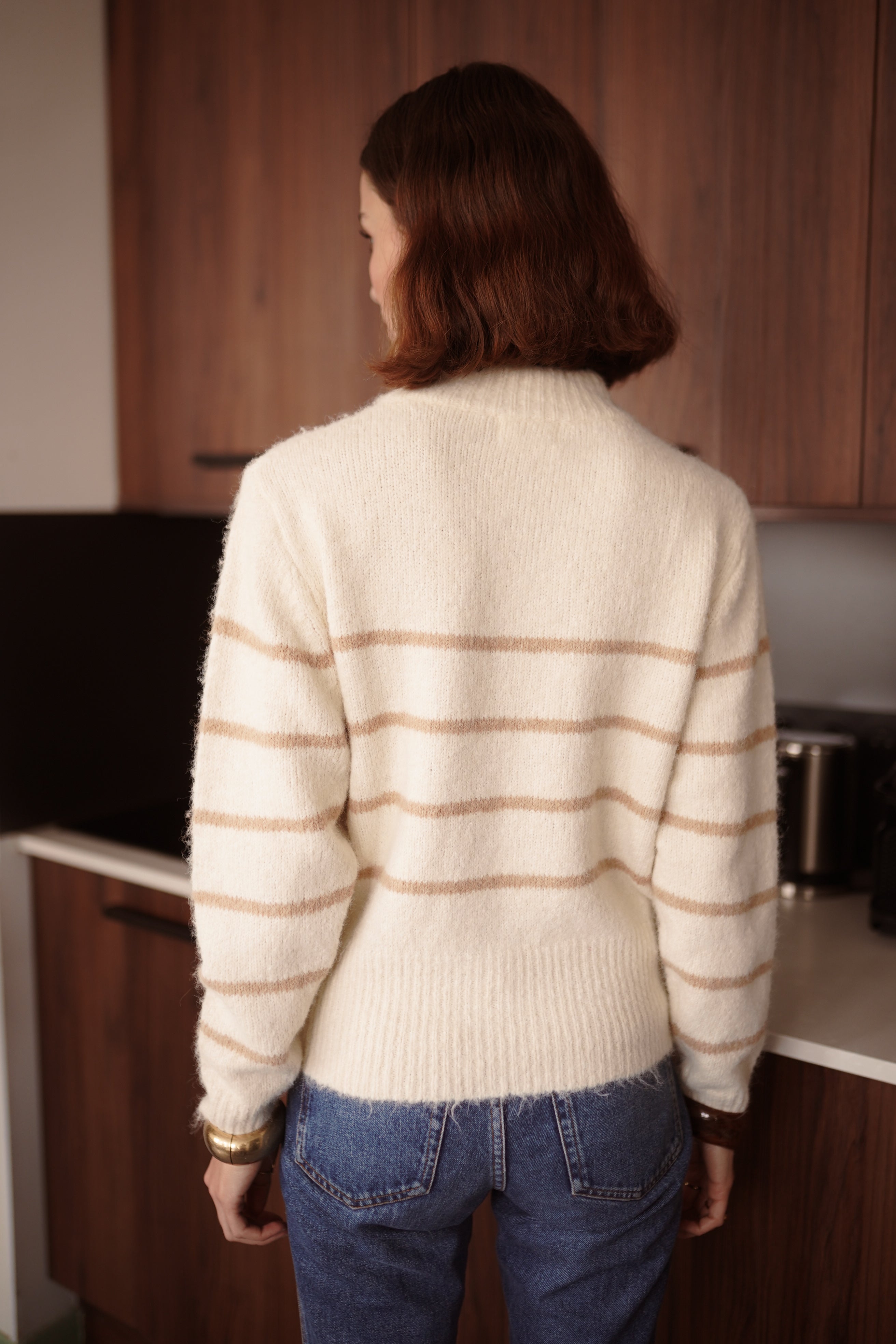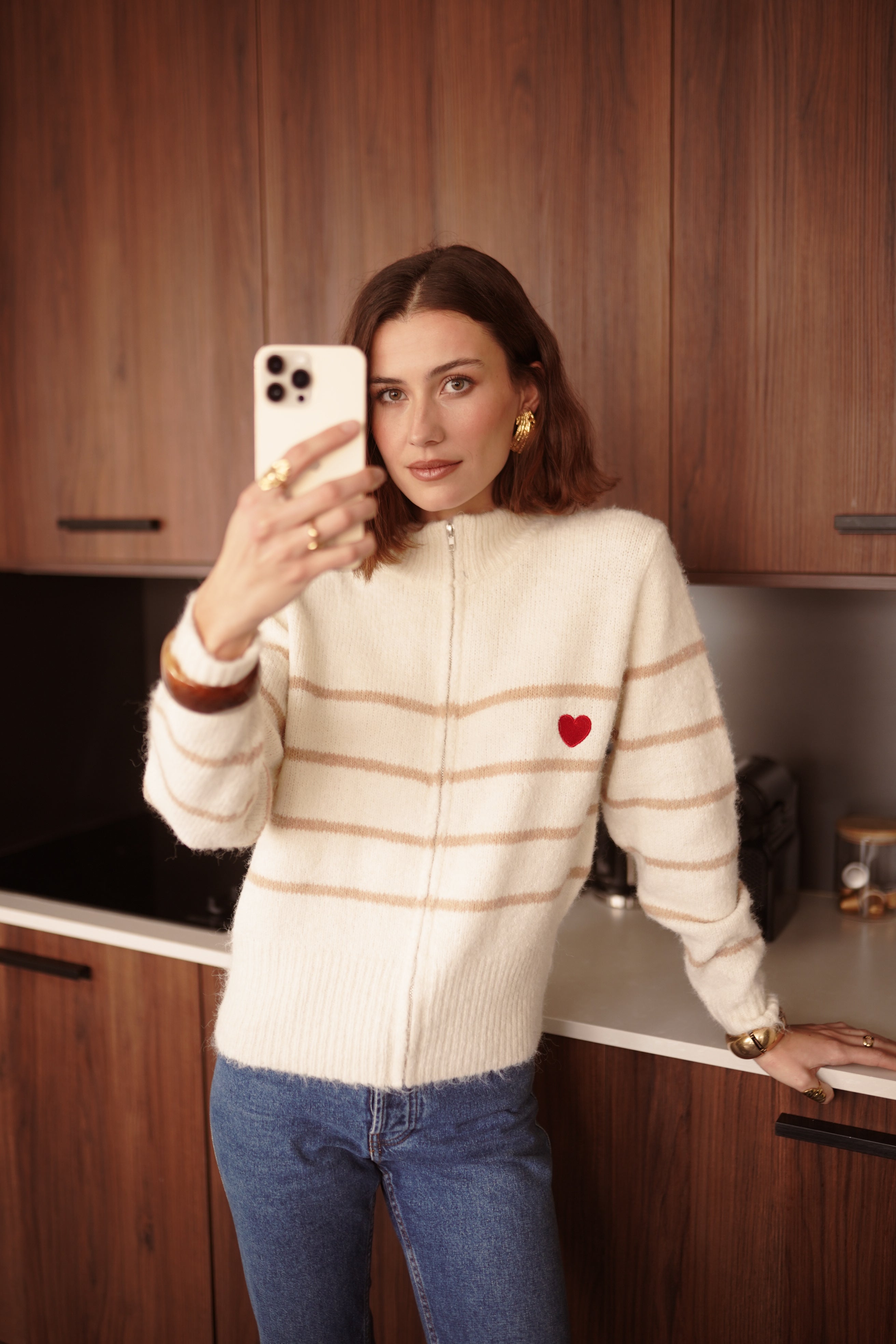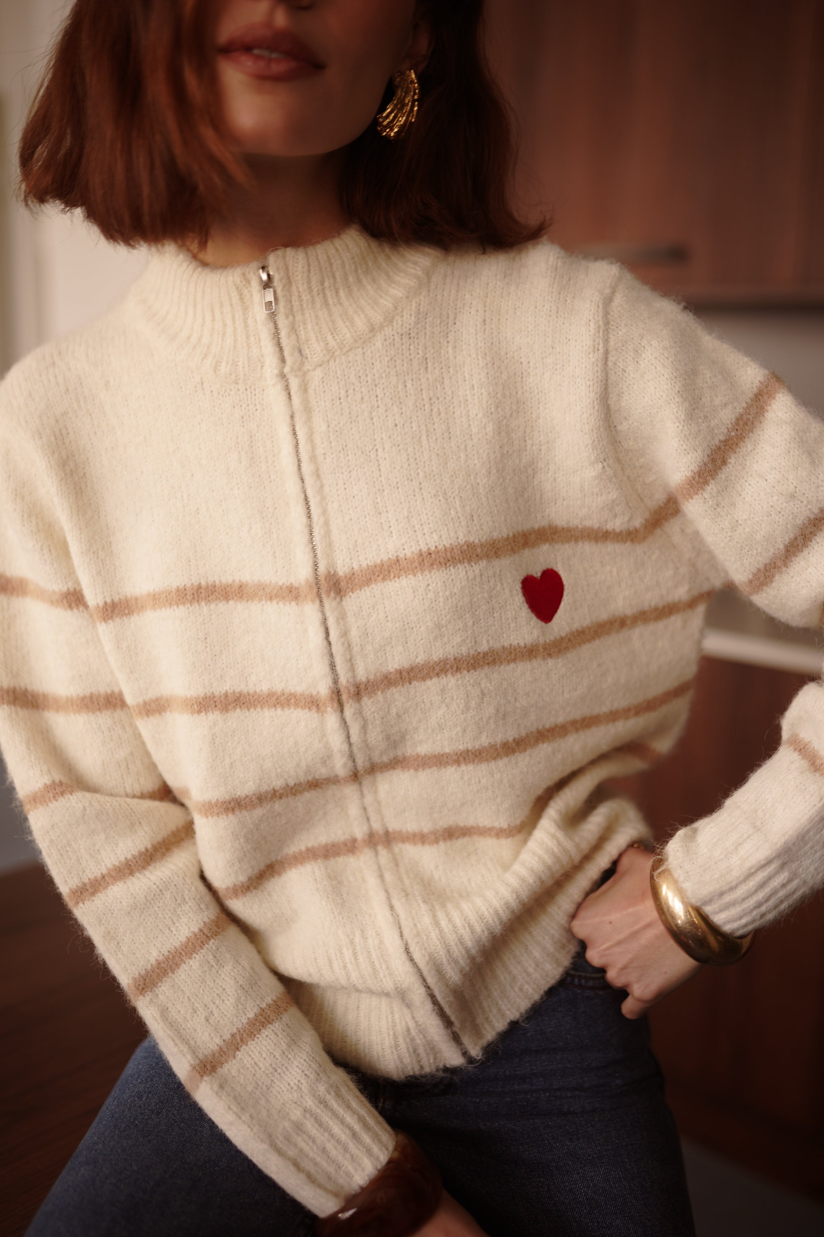 Le gilet Milo joue la carte de la douceur avec un esprit casual délicat : une maille rayée légère et un cœur rouge brodé qui apporte la note tendre et graphique.