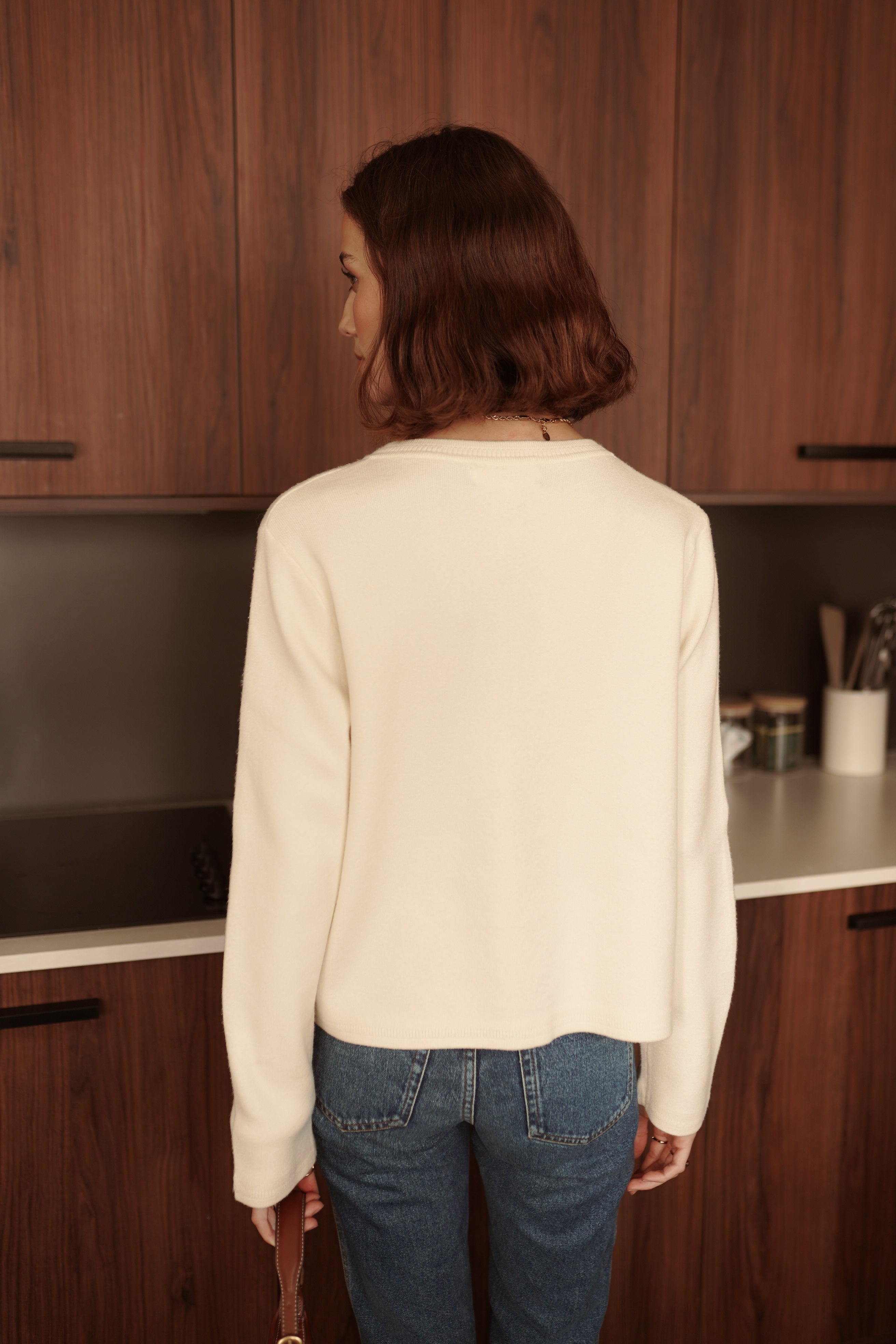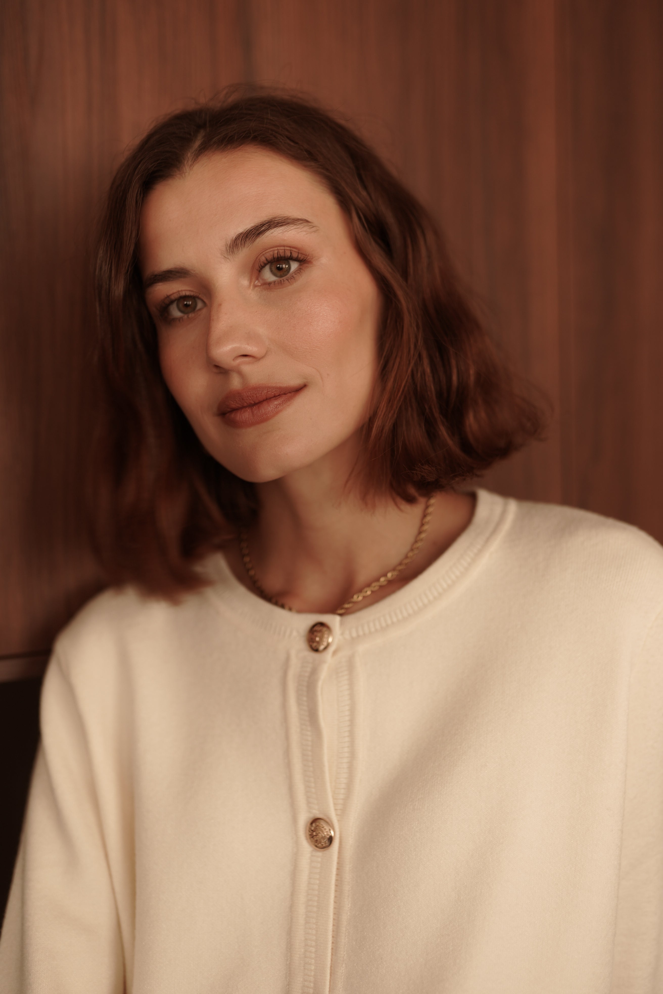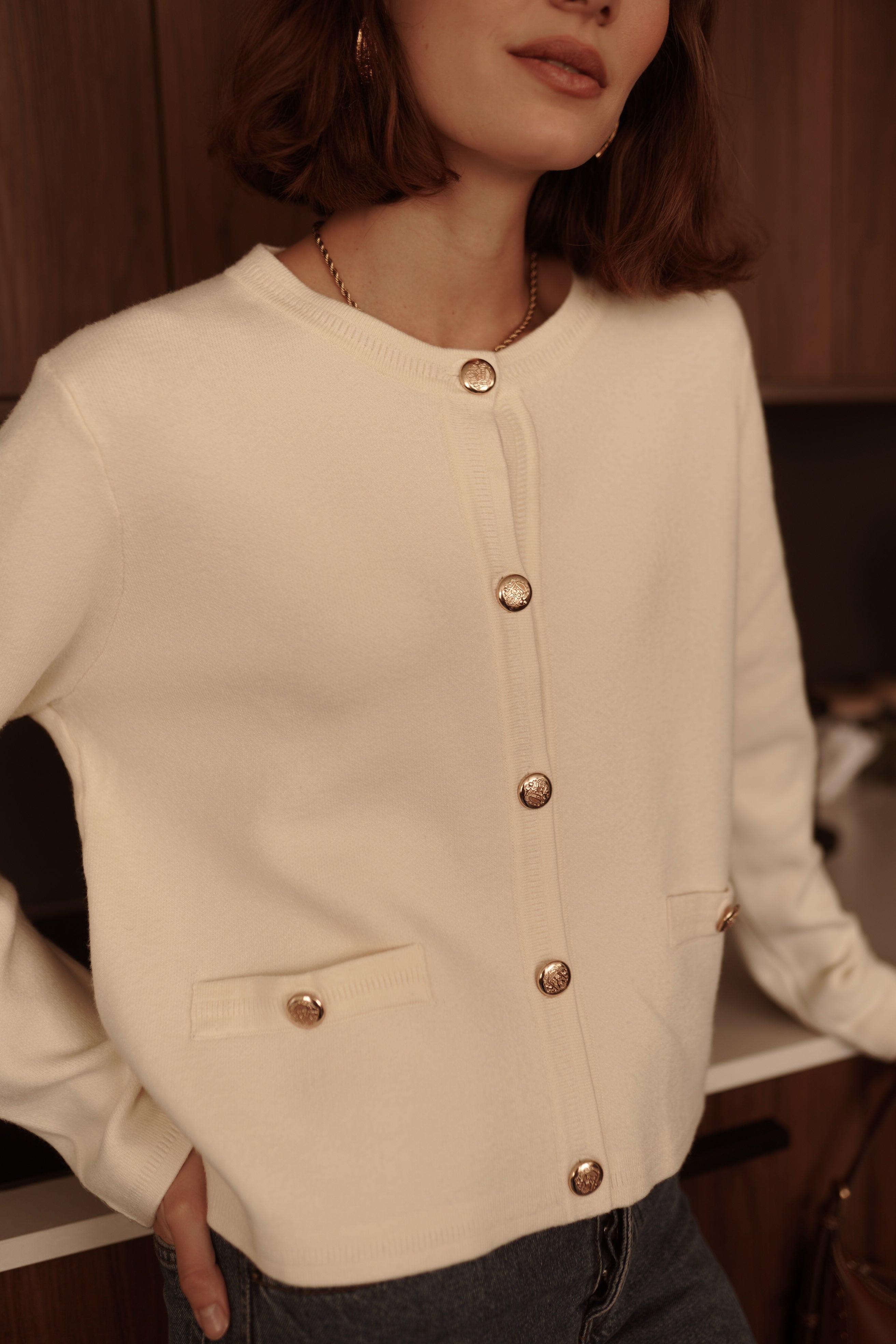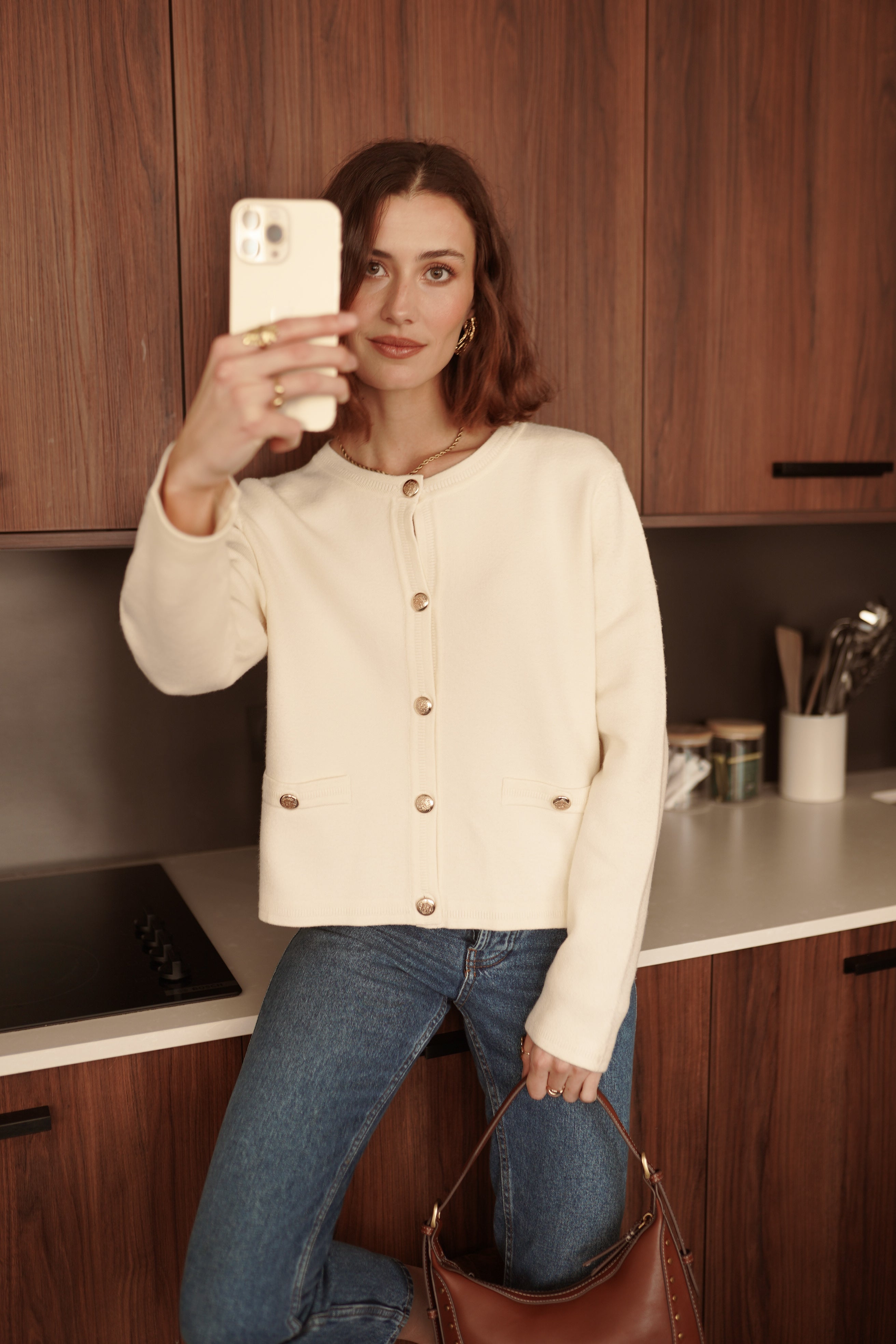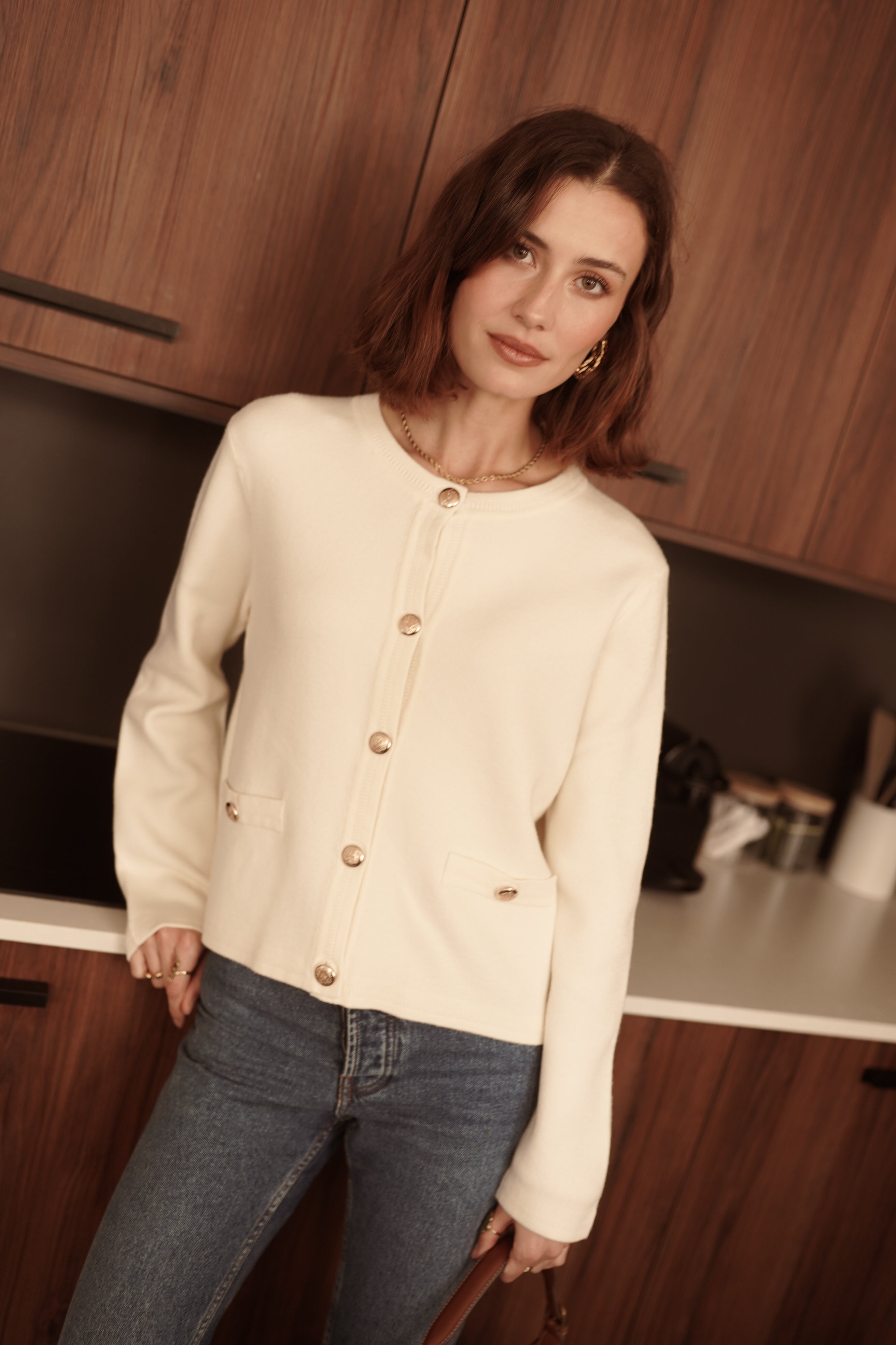 Perle joue la carte du chic minimaliste : une maille lisse, lumineuse, ponctuée de boutons dorés façon bijou.