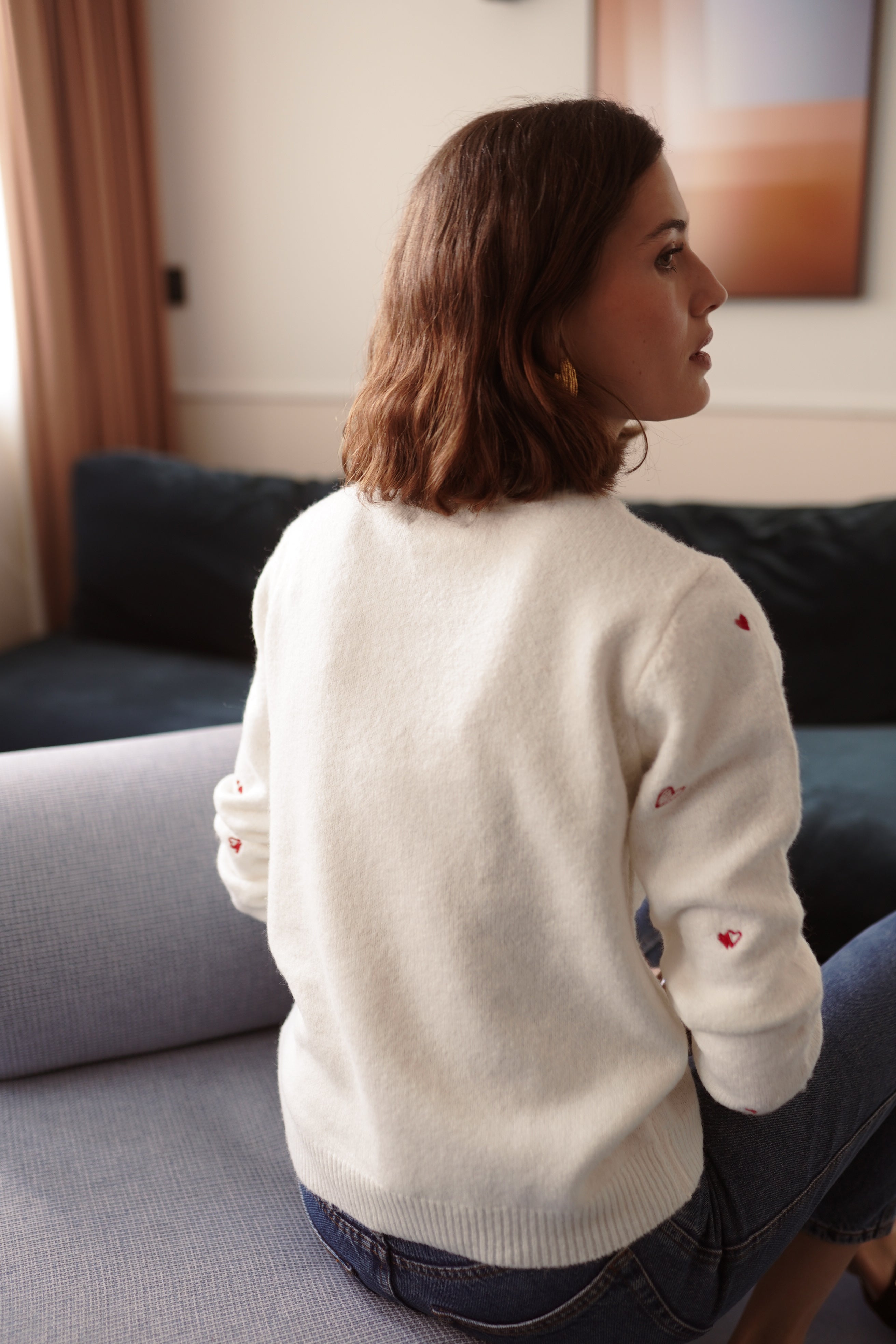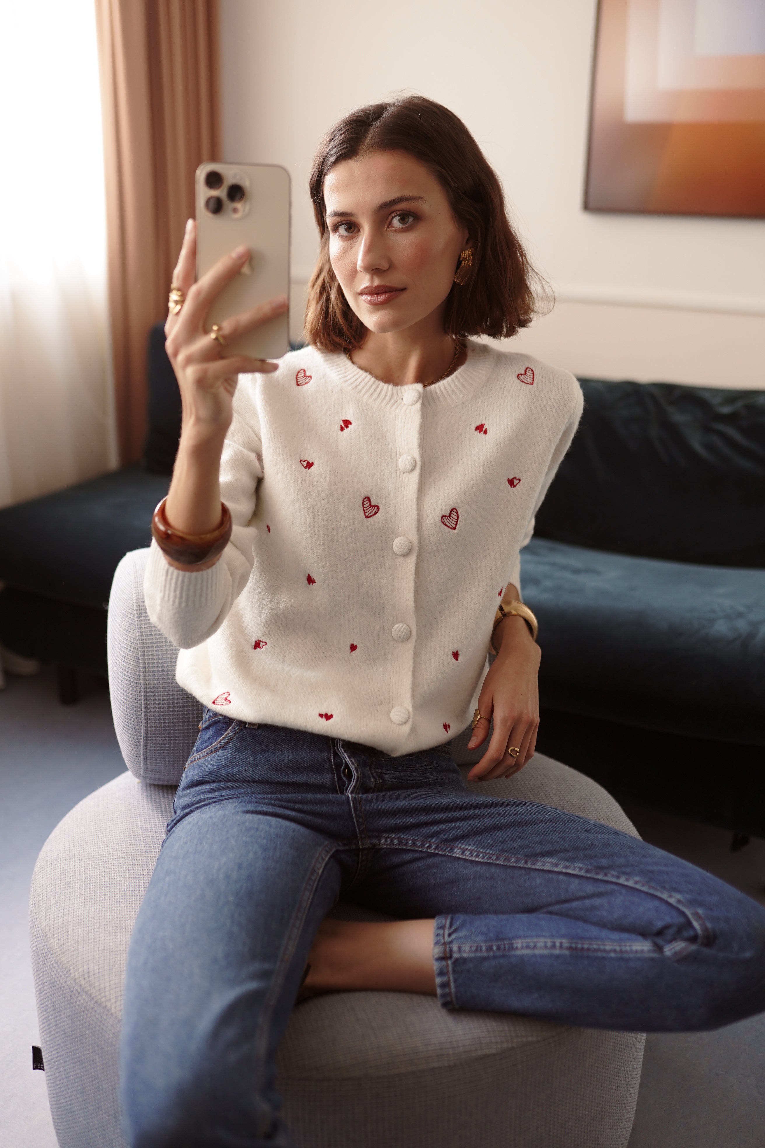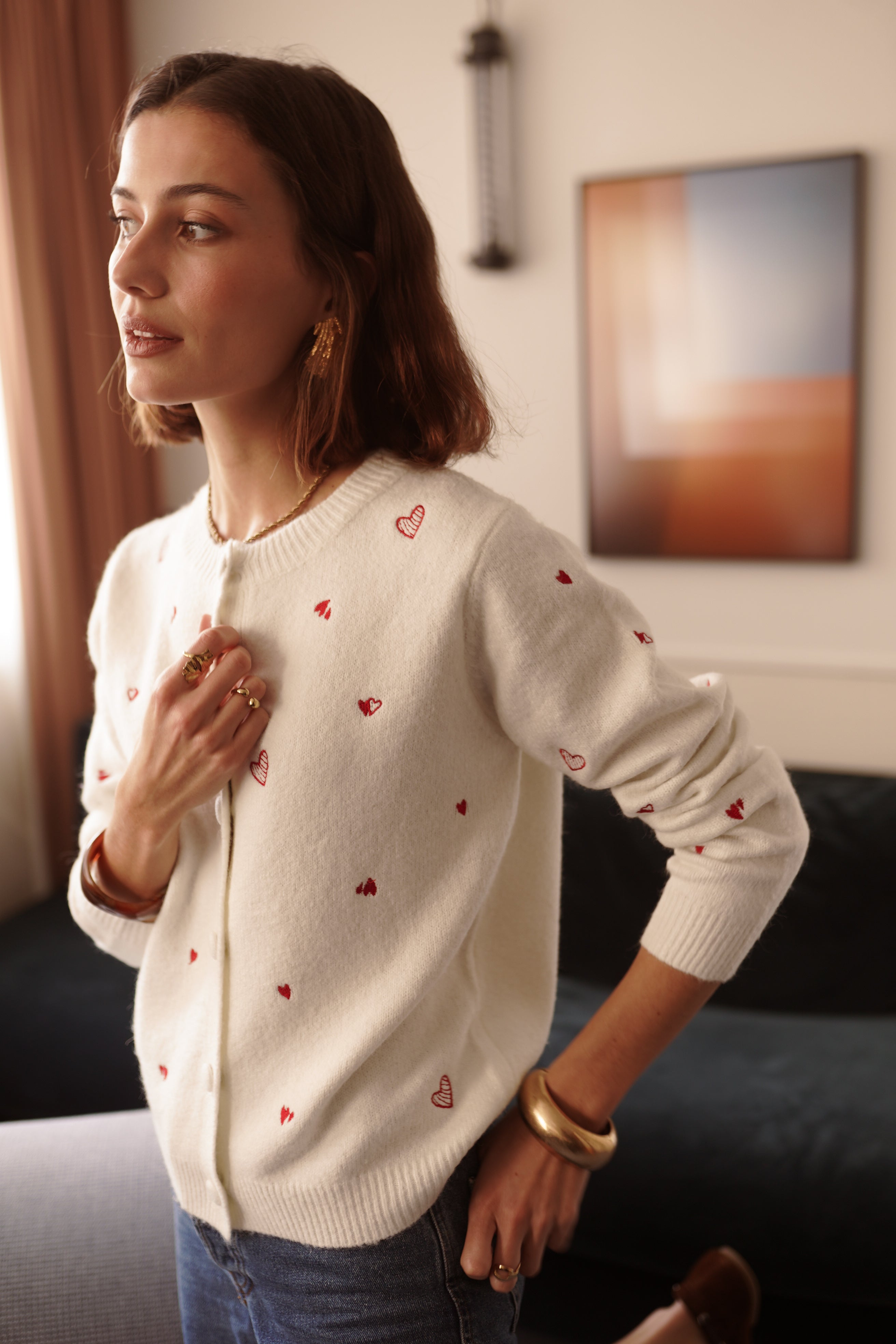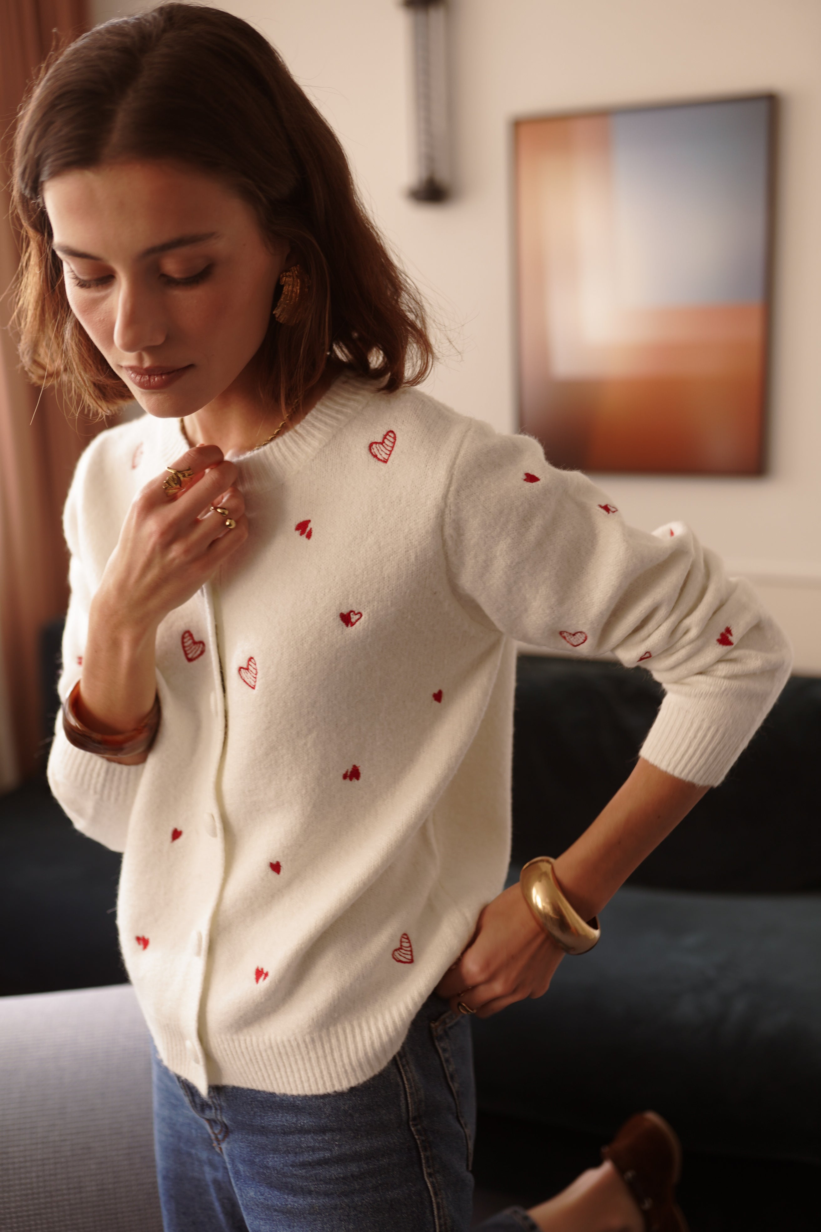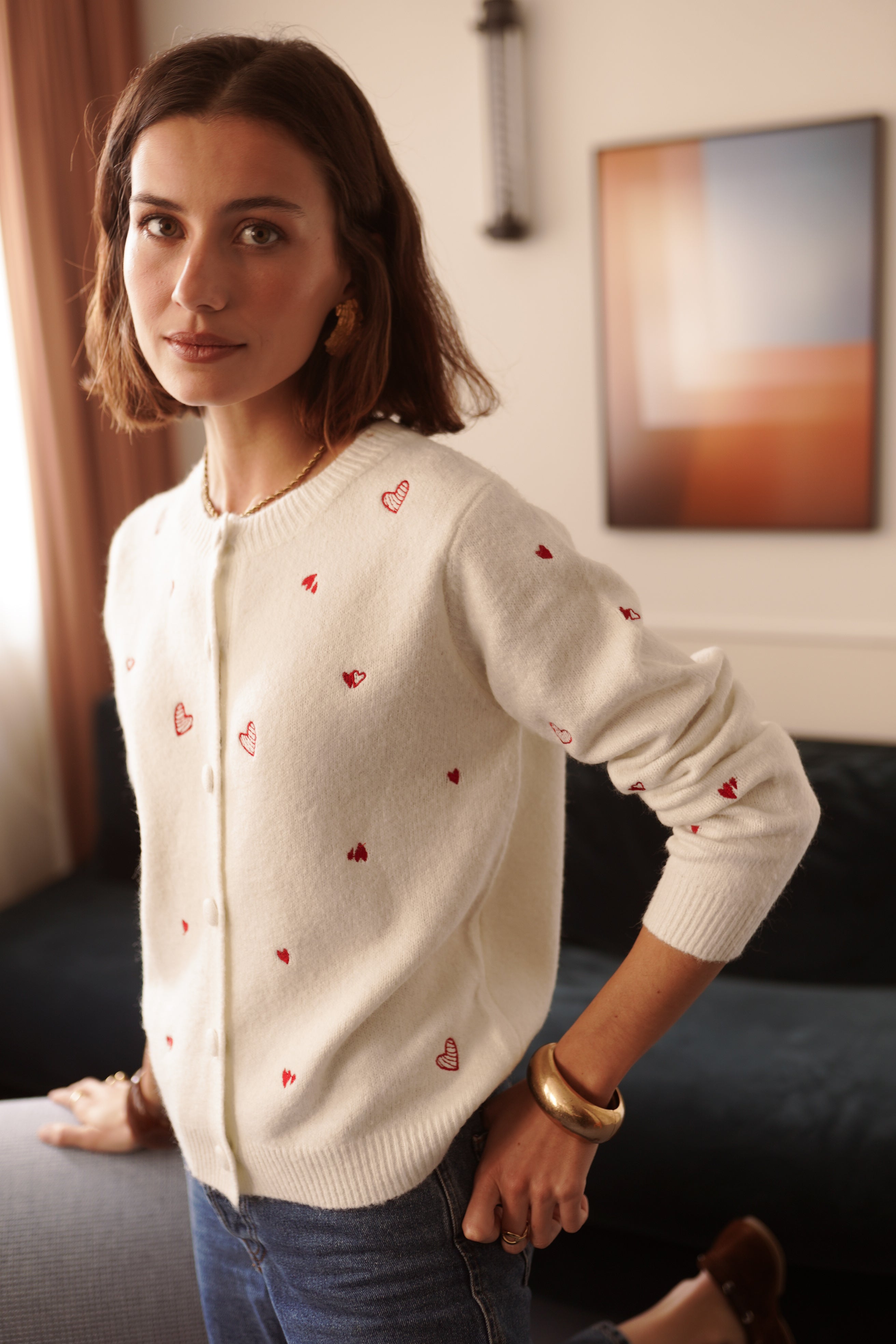 Tina est un gilet écru animé de petits cœurs rouges brodés, pensé dans un esprit frais et ludique. Les boutons recouverts ton sur ton apportent une finition nette et discrète.