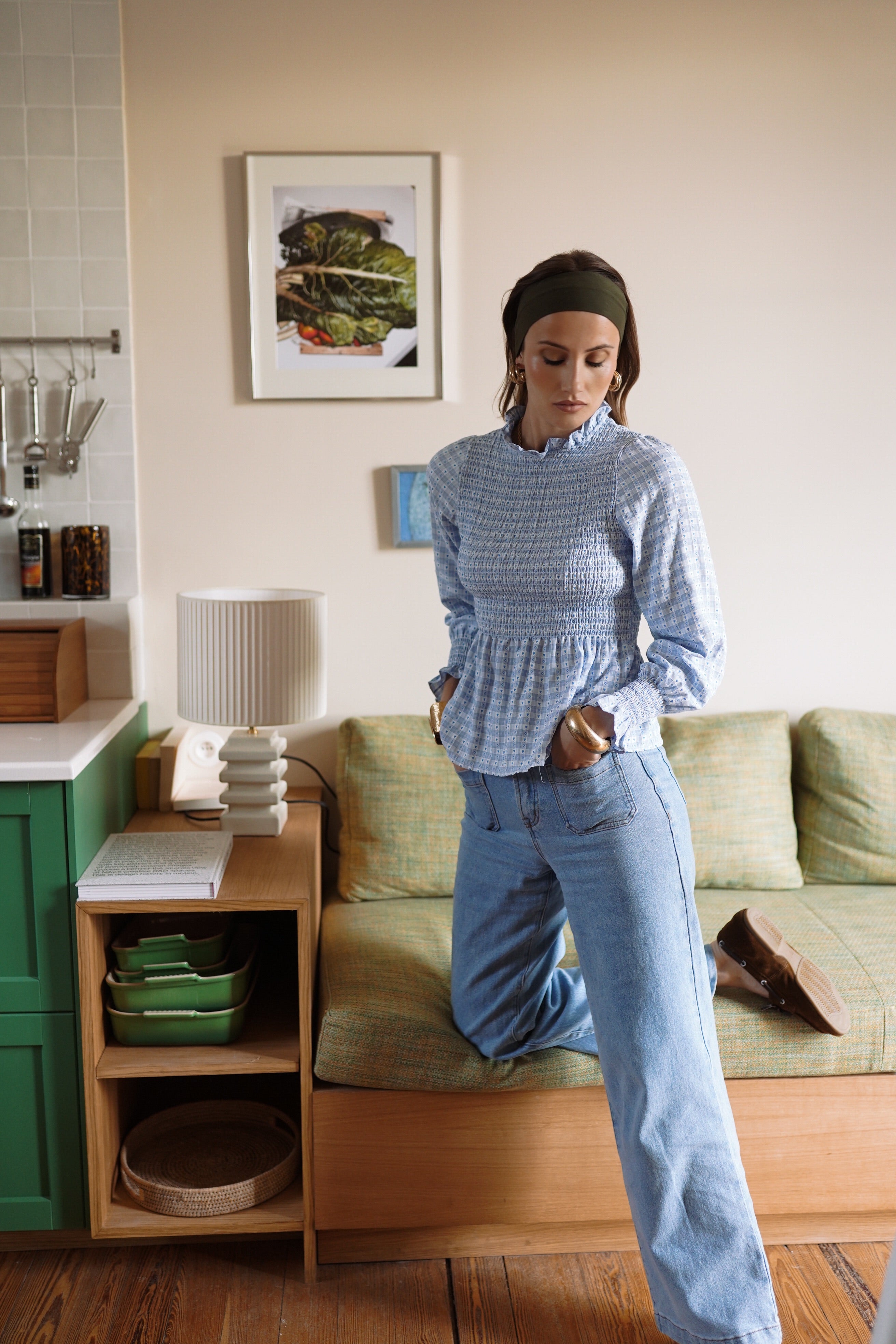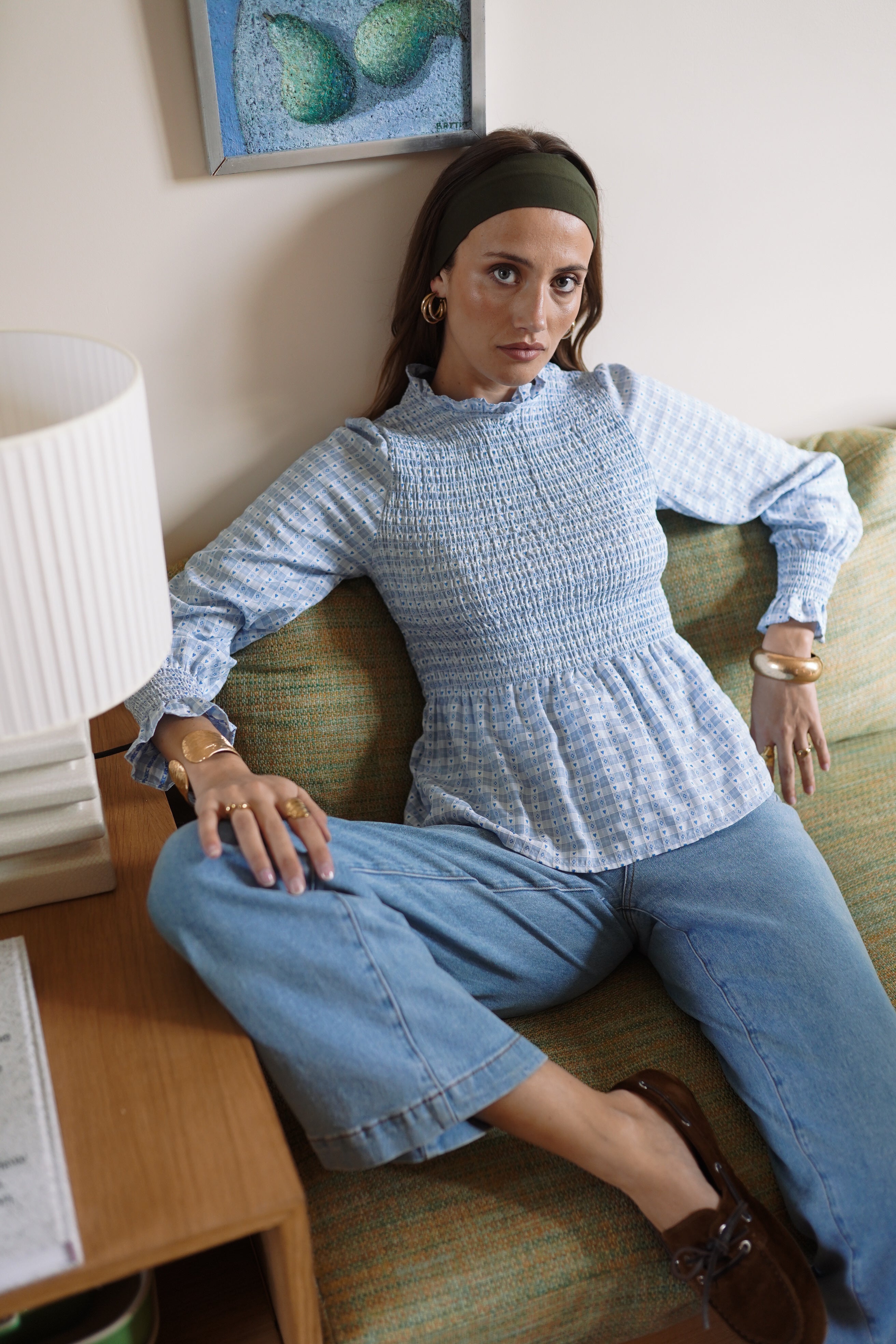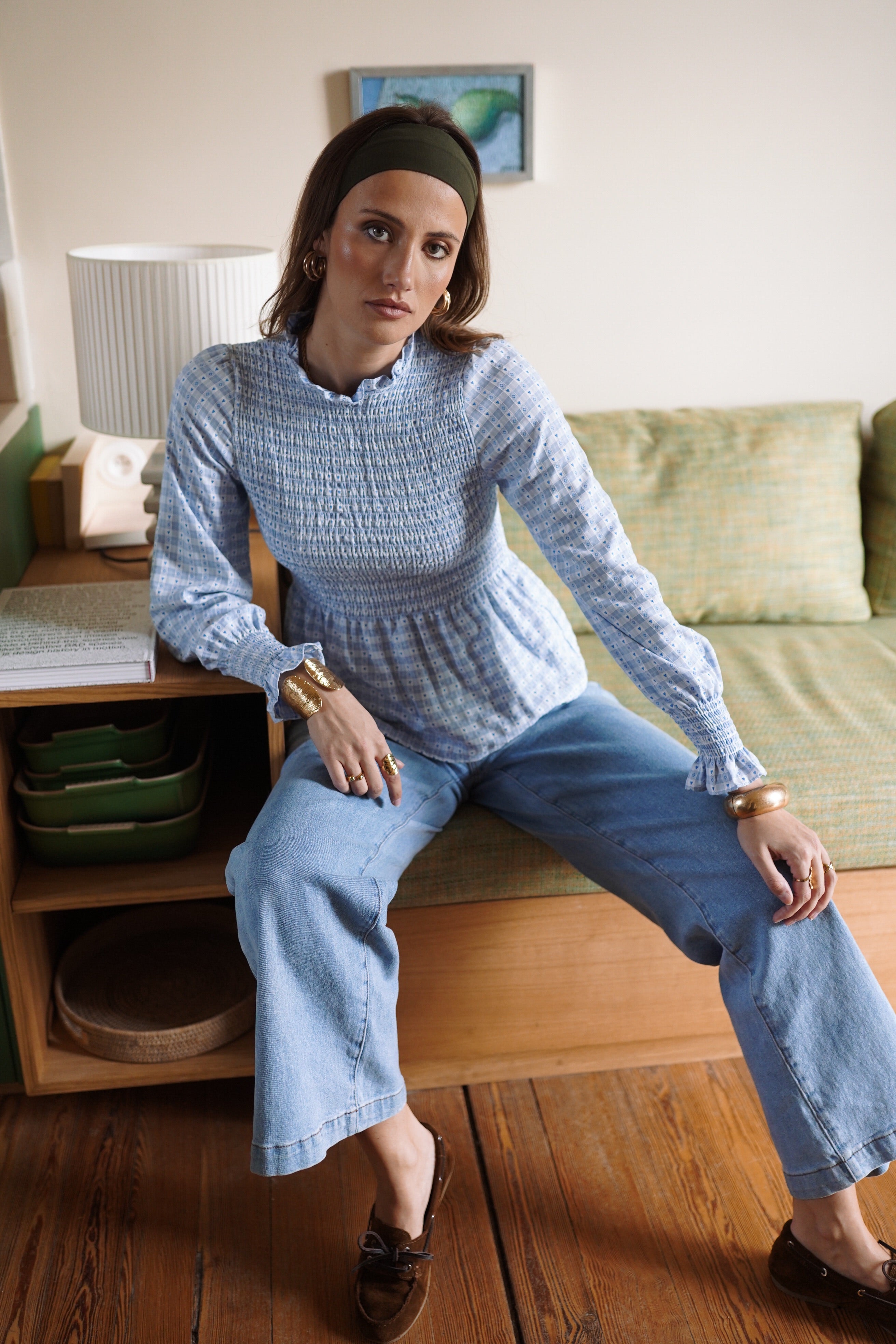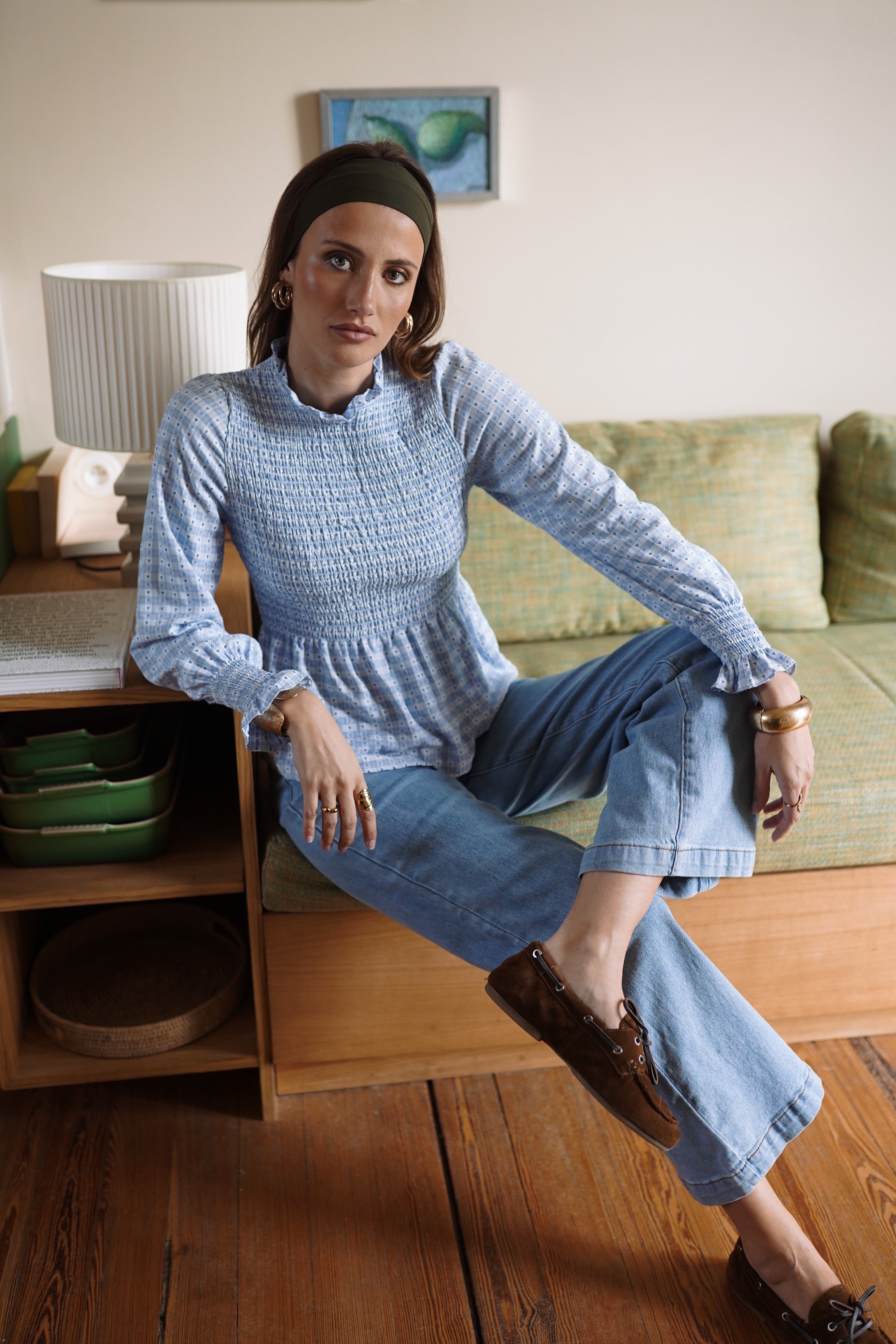 Colomba joue la carte du détail graphique avec son smock délicat et son imprimé bleu clair. Le volume se structure naturellement, la silhouette s’affirme sans effort. Un haut qui attire l’œil et signe le look.
