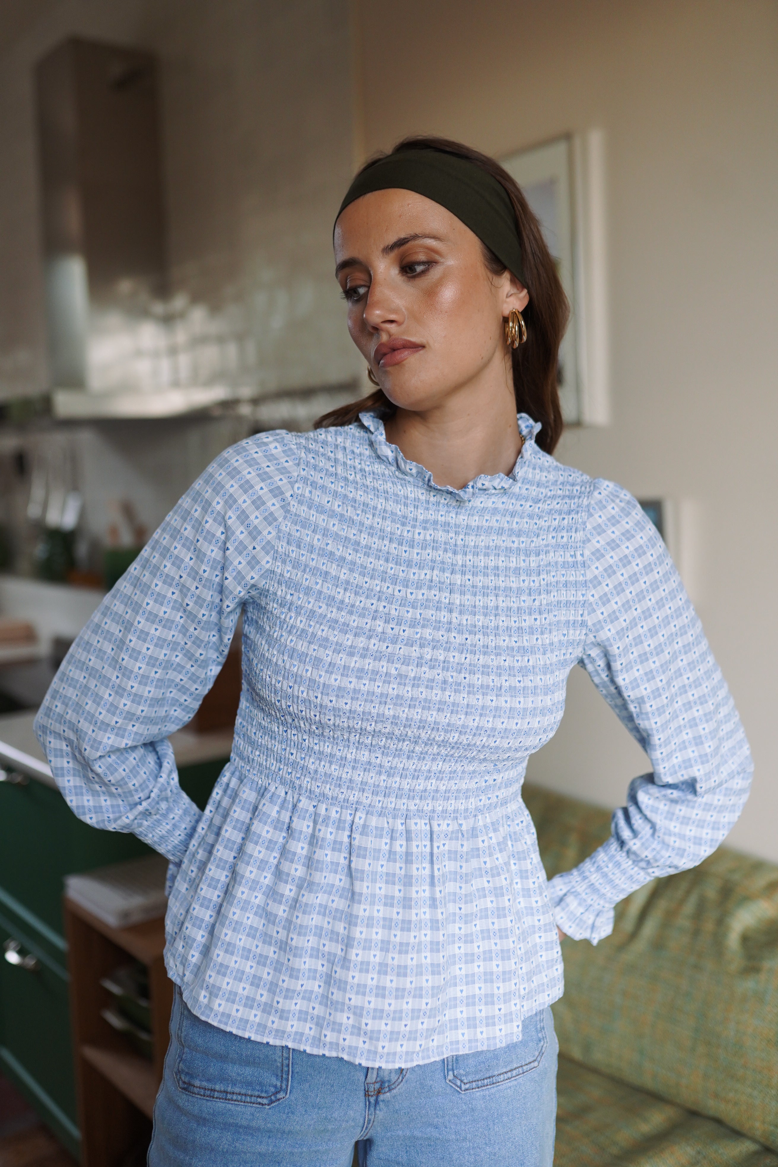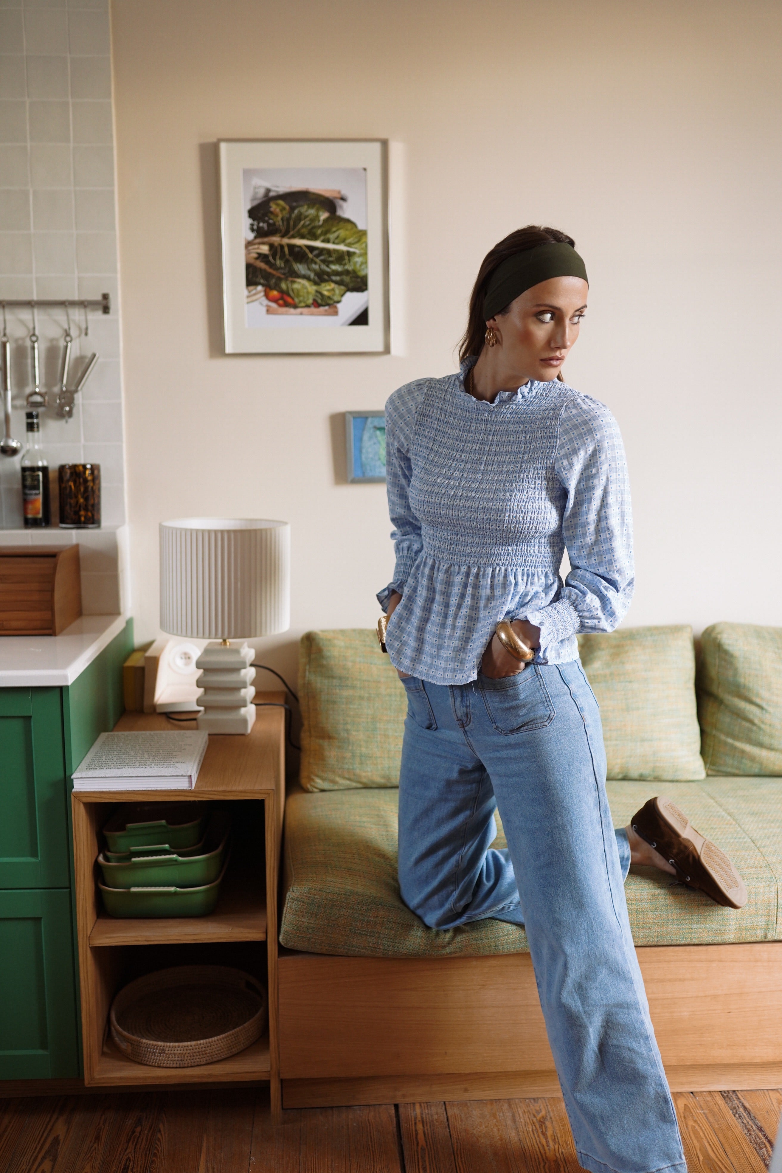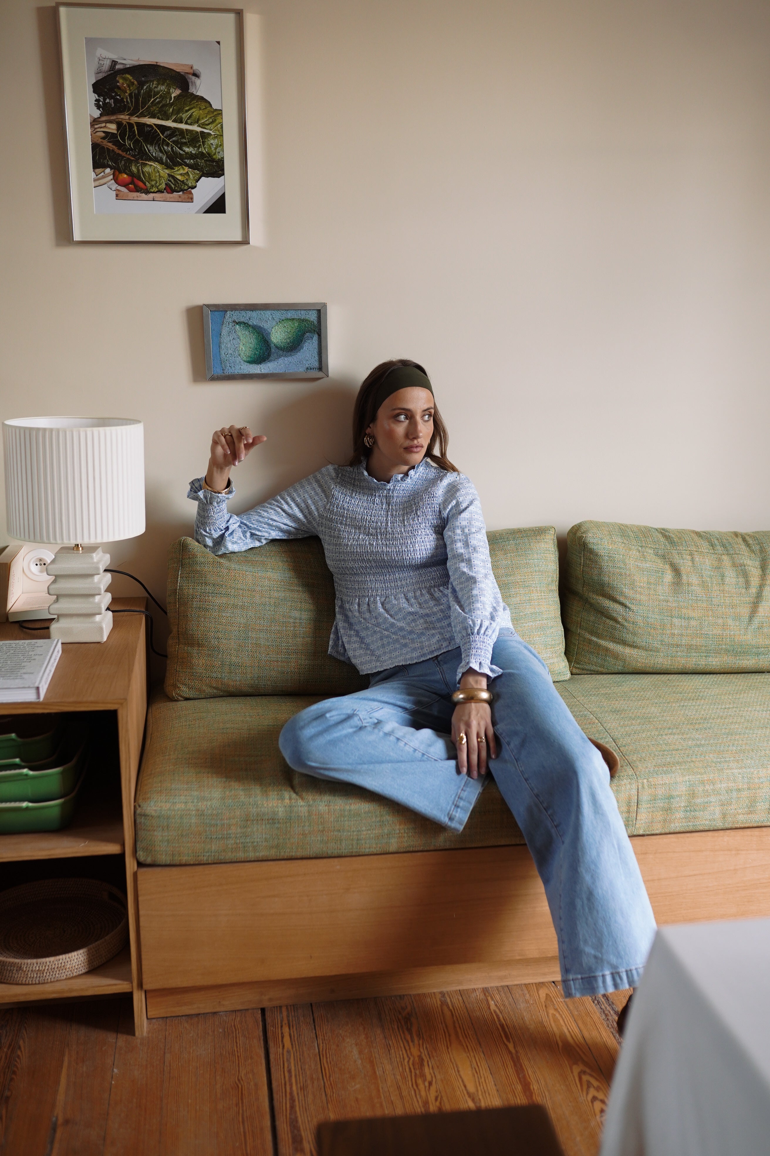 Colomba joue la carte du détail graphique avec son smock délicat et son imprimé bleu clair. Le volume se structure naturellement, la silhouette s’affirme sans effort. Un haut qui attire l’œil et signe le look.