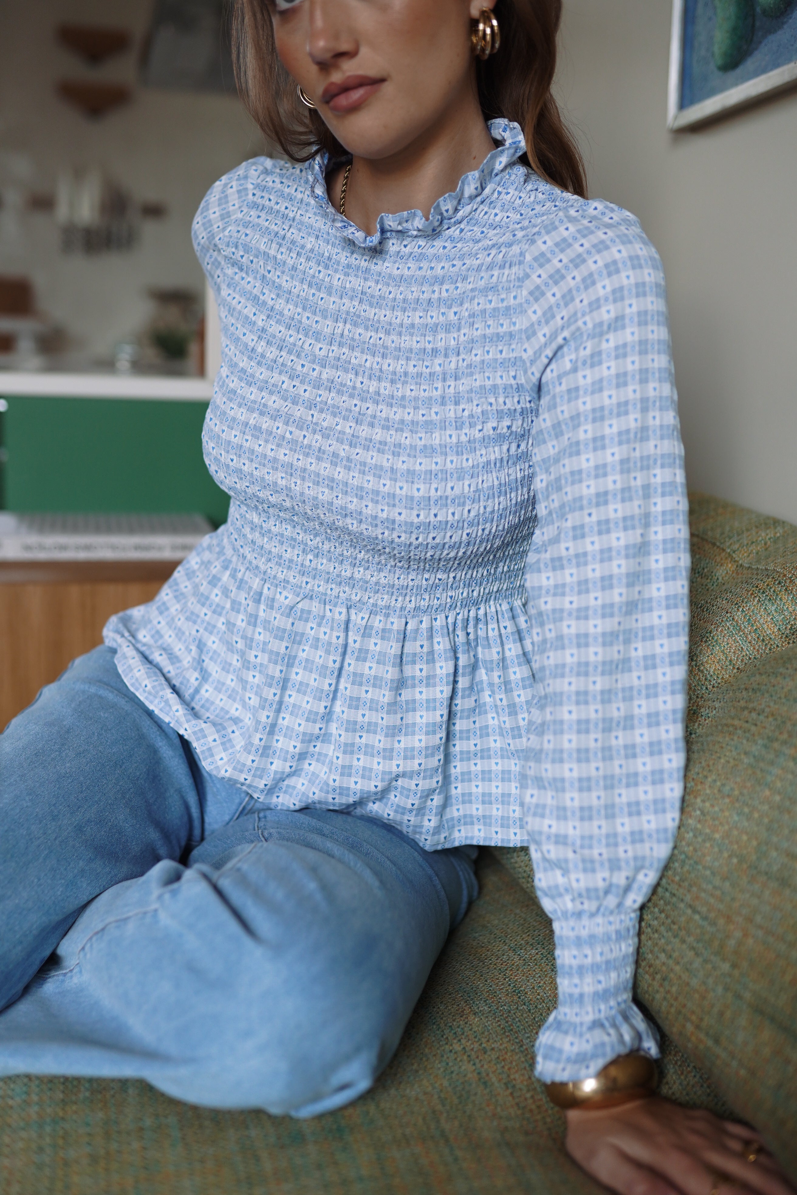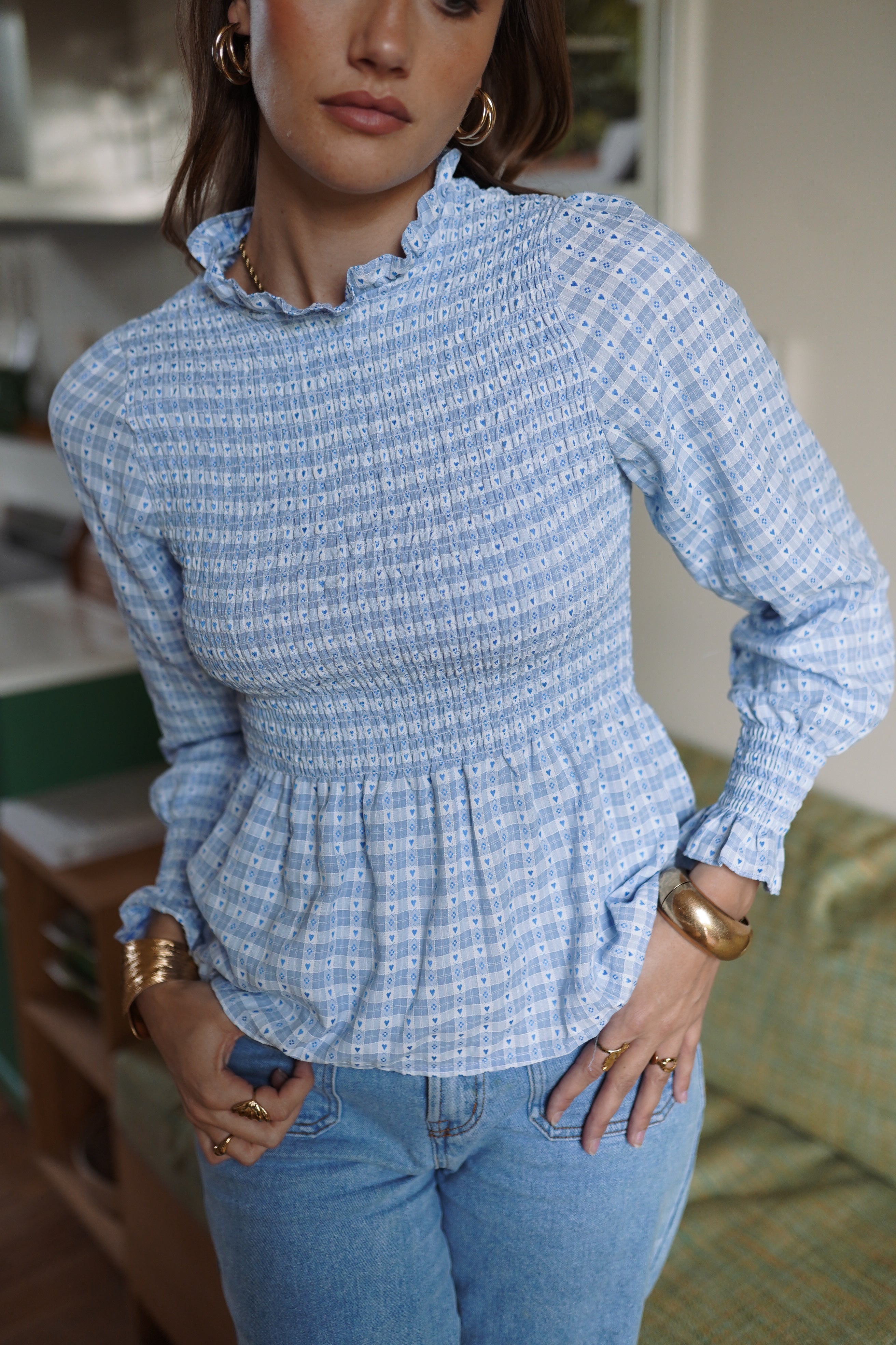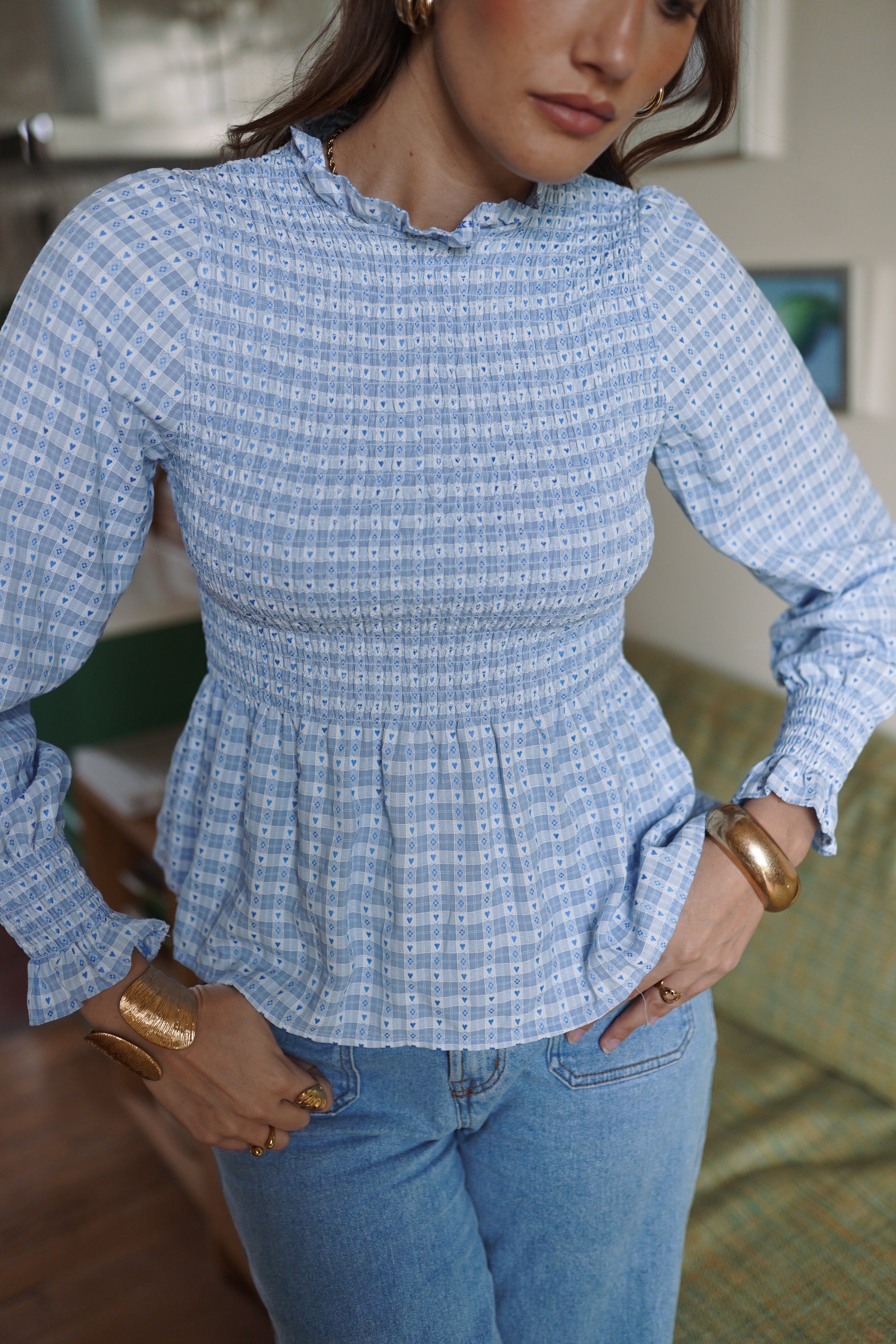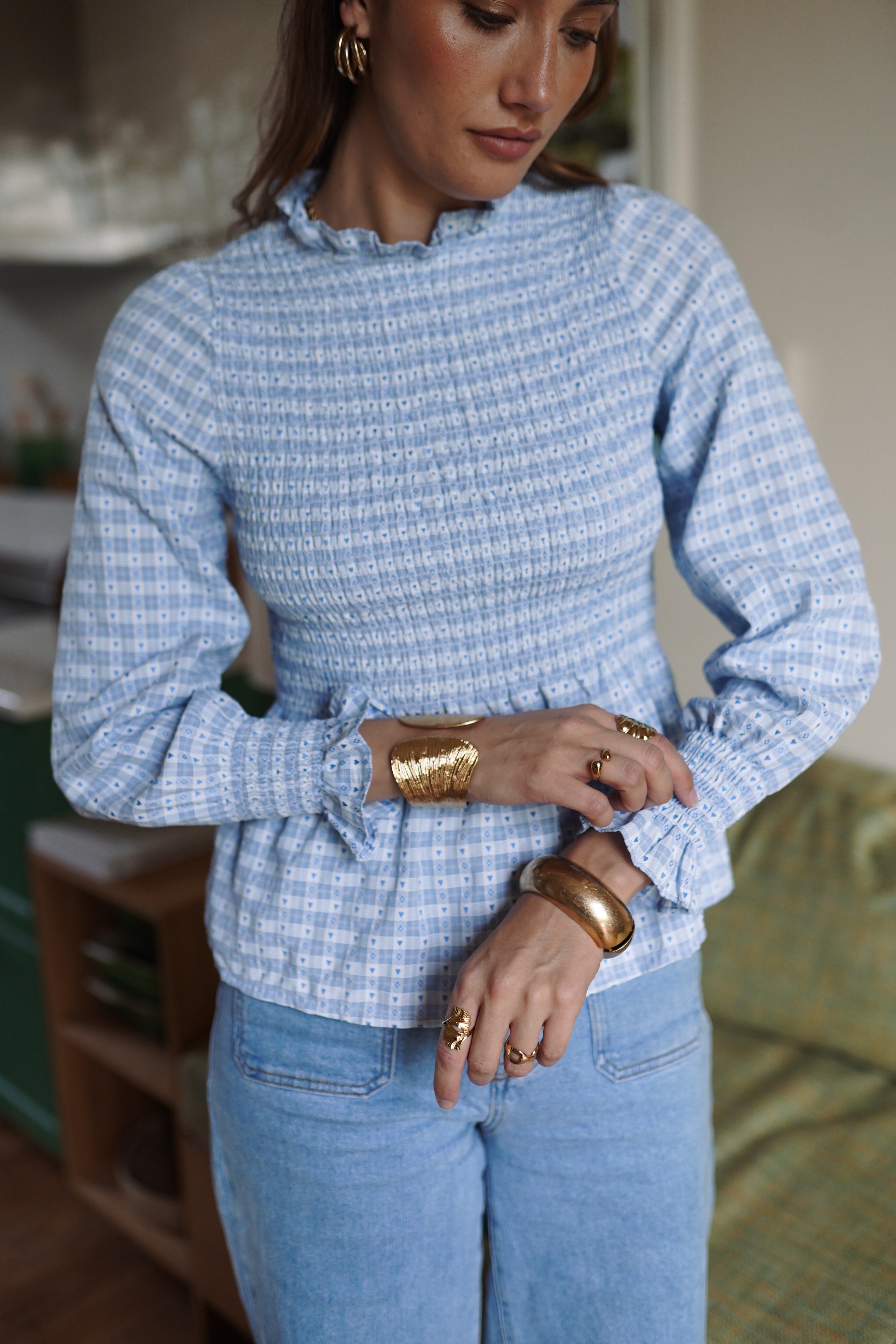 Colomba joue la carte du détail graphique avec son smock délicat et son imprimé bleu clair. Le volume se structure naturellement, la silhouette s’affirme sans effort. Un haut qui attire l’œil et signe le look.