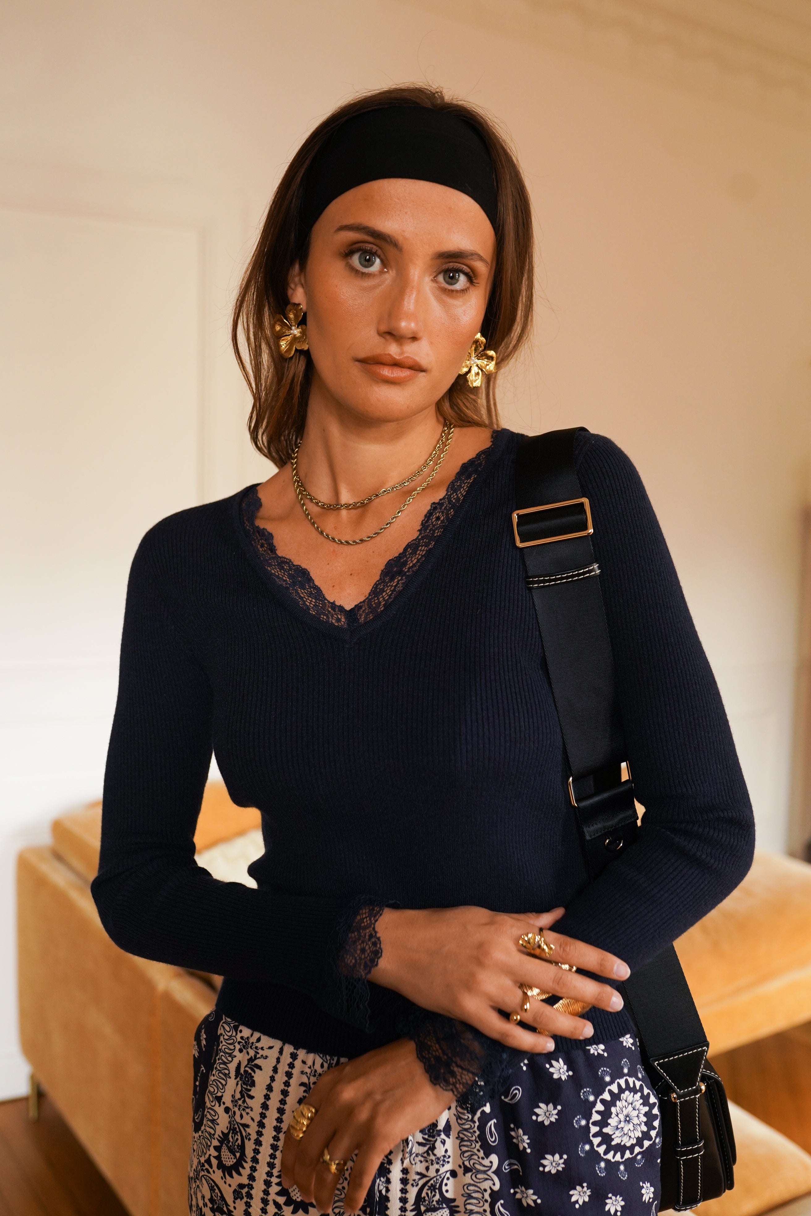Confectionné dans une maille fine et près du corps, il épouse les lignes de la silhouette tout en restant confortable. Son encolure en V soulignée de dentelle apporte une touche féminine et délicate, tandis que les finitions aux poignets reprennent ce même détail raffiné.