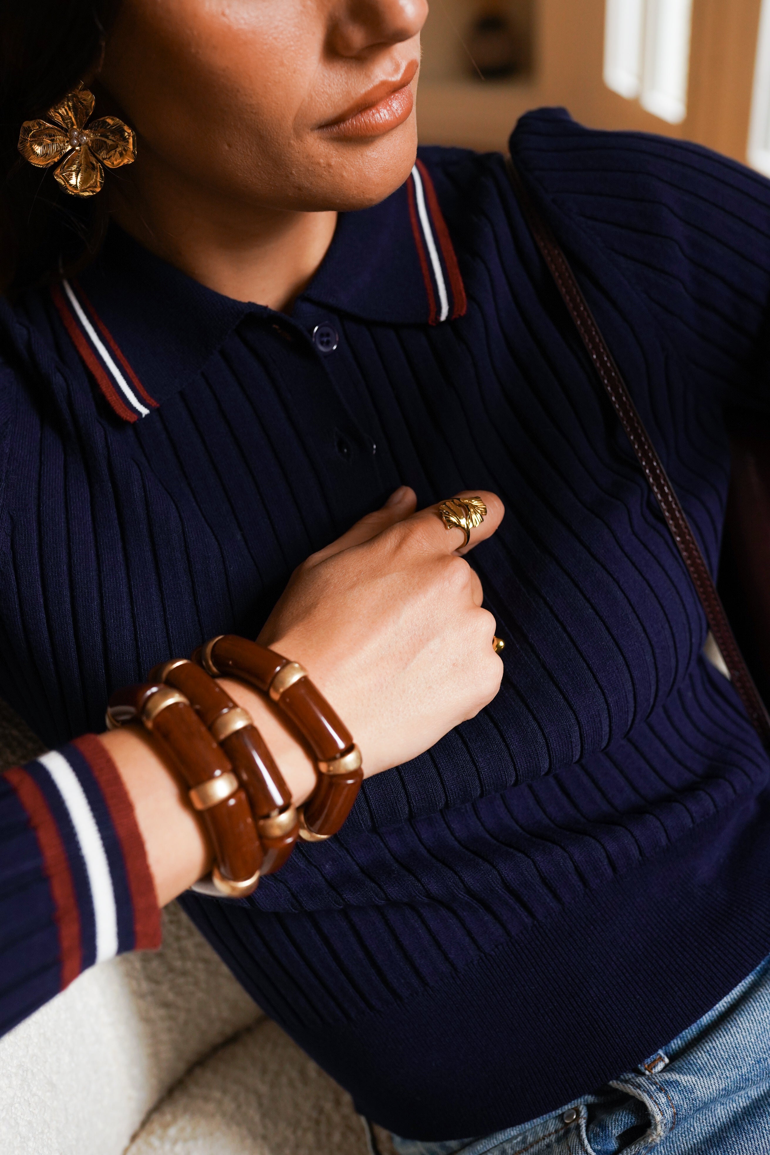 Le haut Orane revisite le polo classique avec une touche féminine et moderne. Sa maille côtelée met en valeur la silhouette tout en restant confortable. Les bordures contrastées au col et aux poignets apportent une note sport chic subtilement rétro.