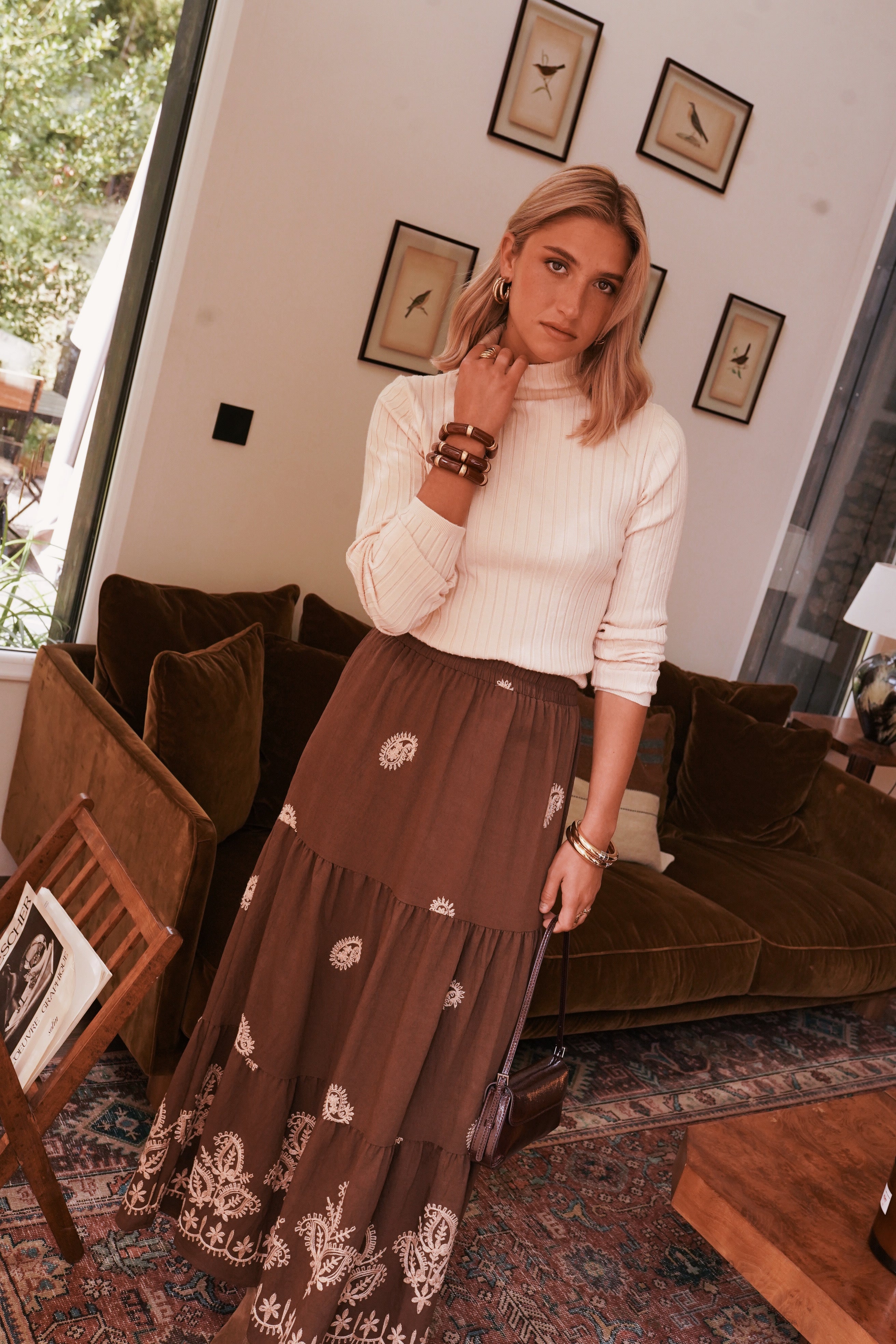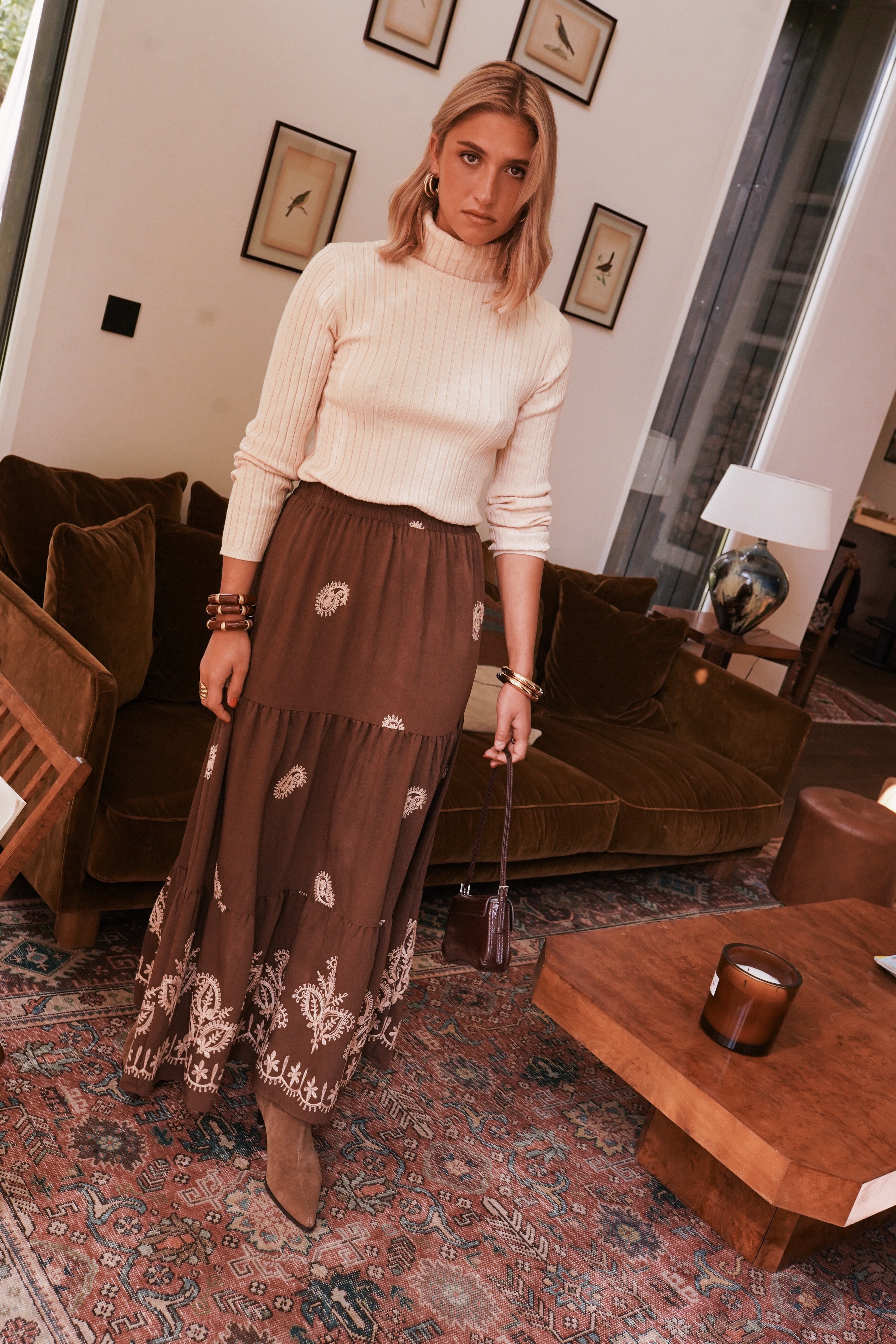 À associer au pull Sandi pour une allure douce et harmonieuse, ou à une chemise oversize pour un contraste plus casual. Avec des bottes en daim et des bijoux dorés, la jupe Jory devient la pièce forte d’un look bohème et lumineux.