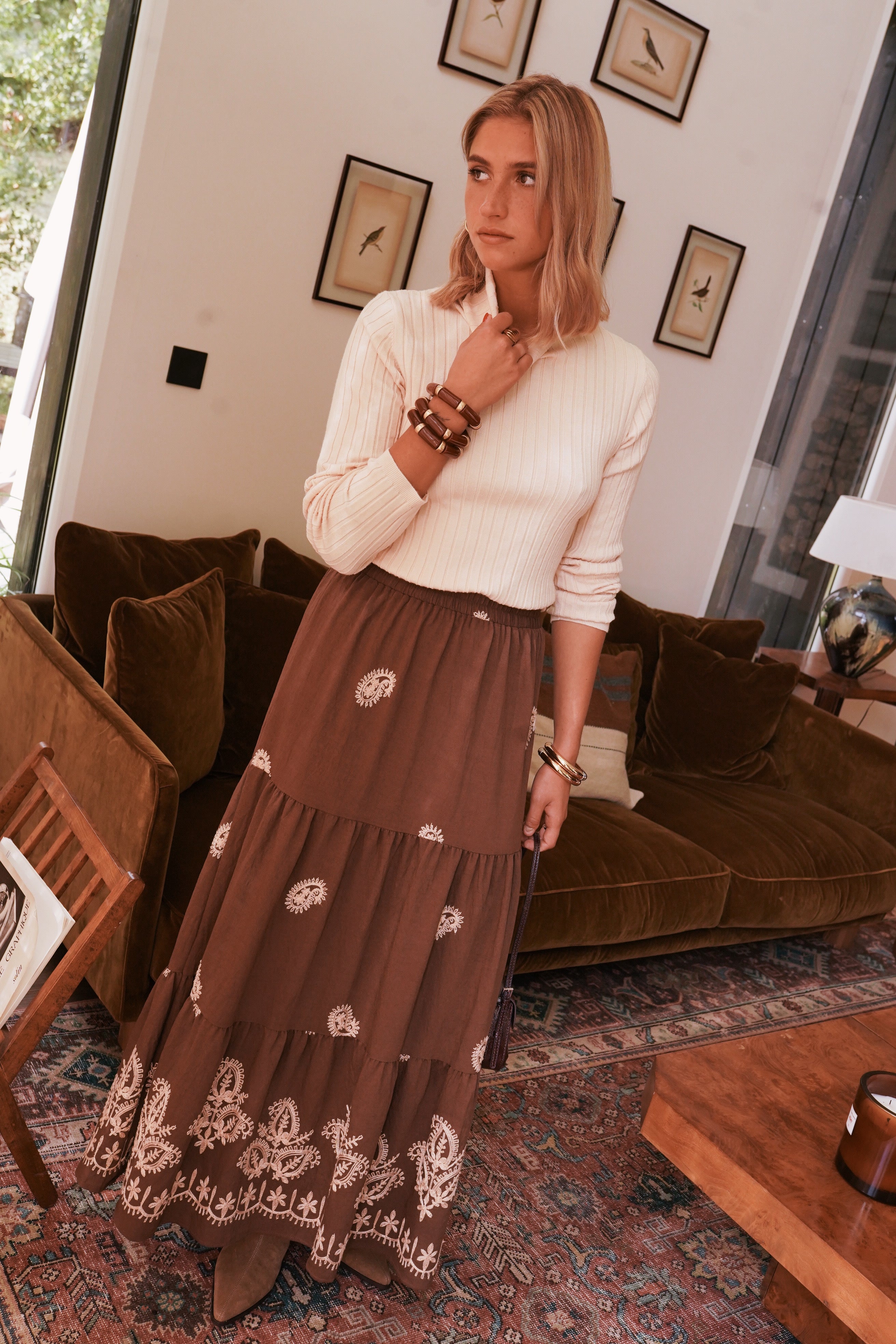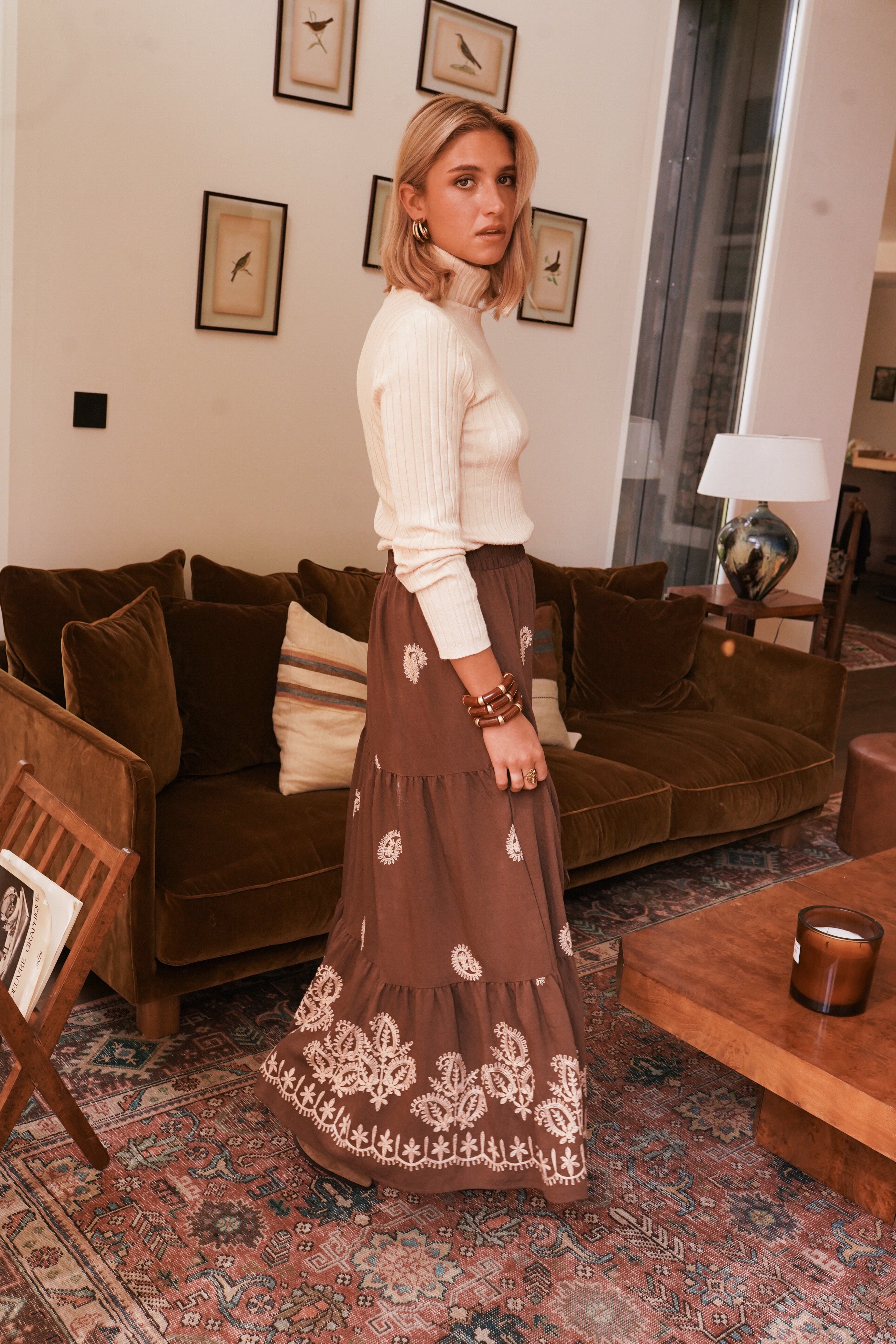 La jupe Jory capture l’esprit bohème chic dans une version automnale et élégante. En viscose fluide, elle se pare de motifs brodés couleur crème qui dessinent de délicats arabesques sur un fond brun profond. Sa coupe longue et évasée offre un mouvement naturel et une allure gracieuse.