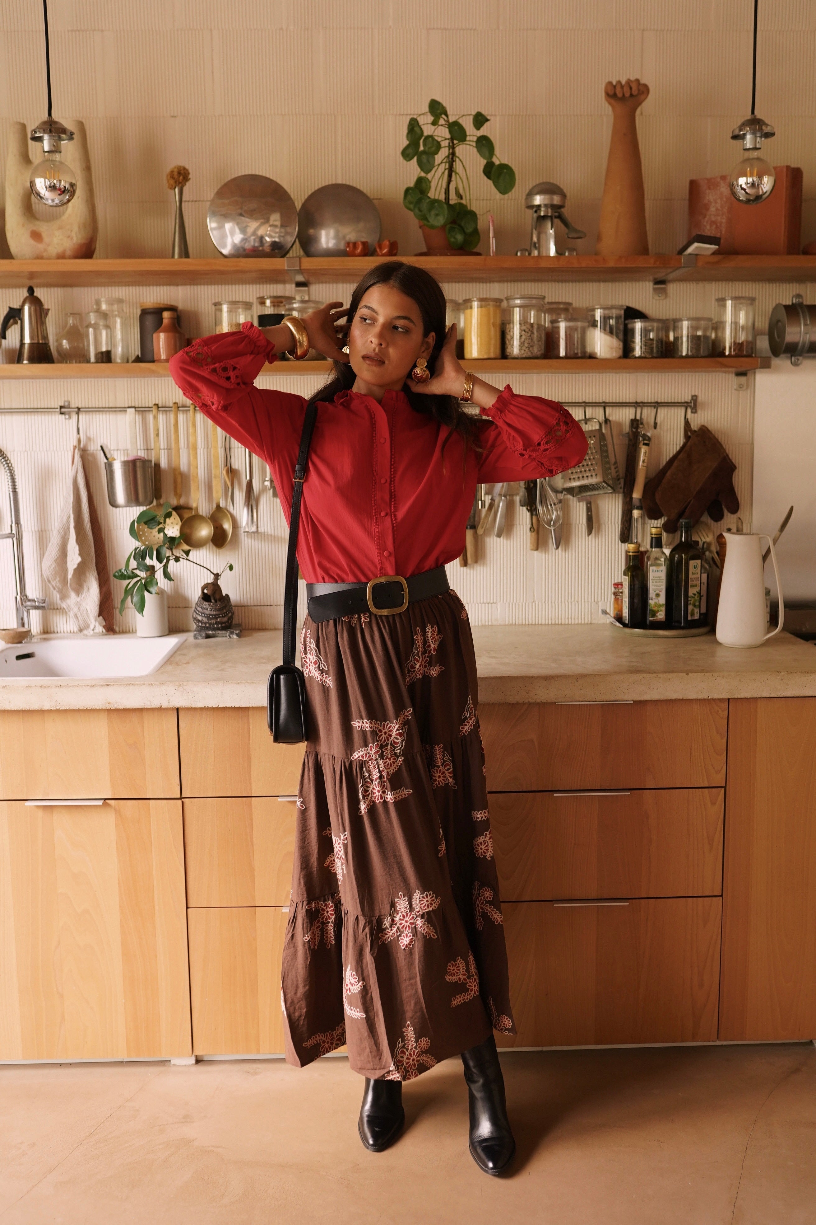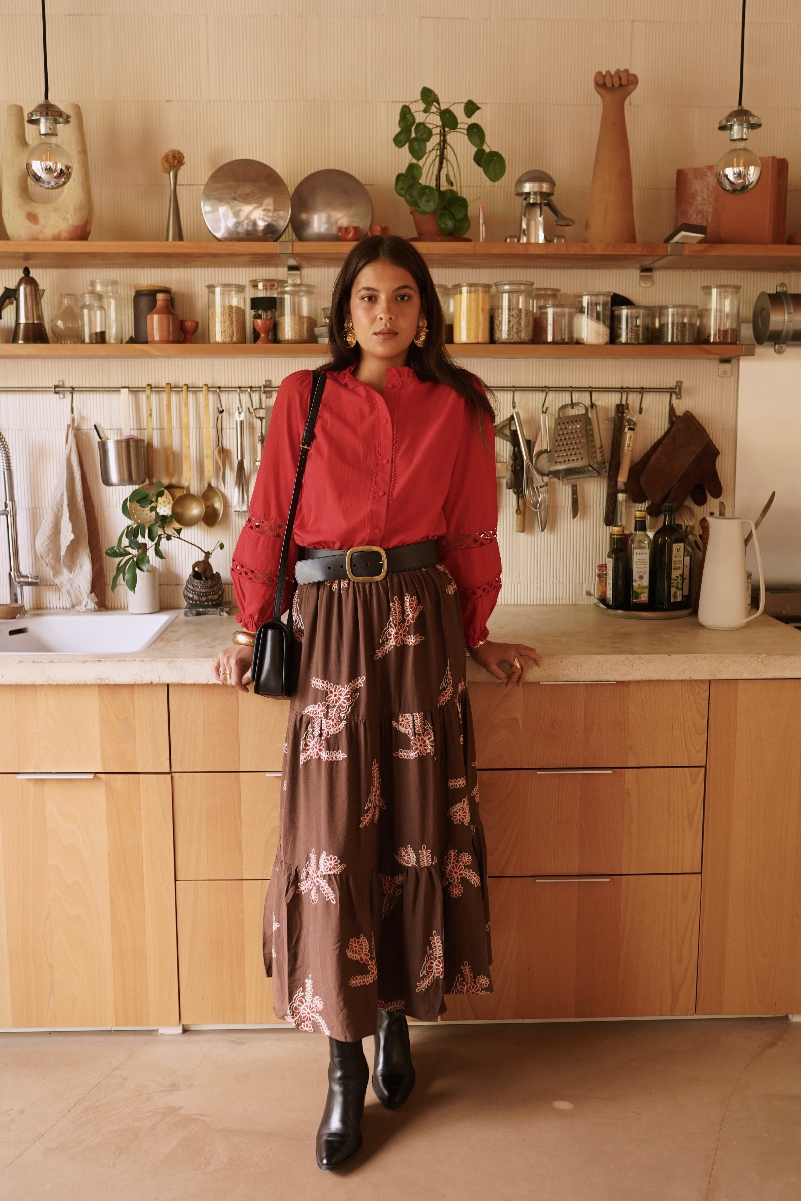 Sa coupe longue et ample souligne le mouvement, tandis que le coton fluide dévoile un imprimé délicat aux motifs brodés façon artisanale. La taille haute, marquée d’une ceinture ou d’un pull rentré, structure la silhouette sans la figer.