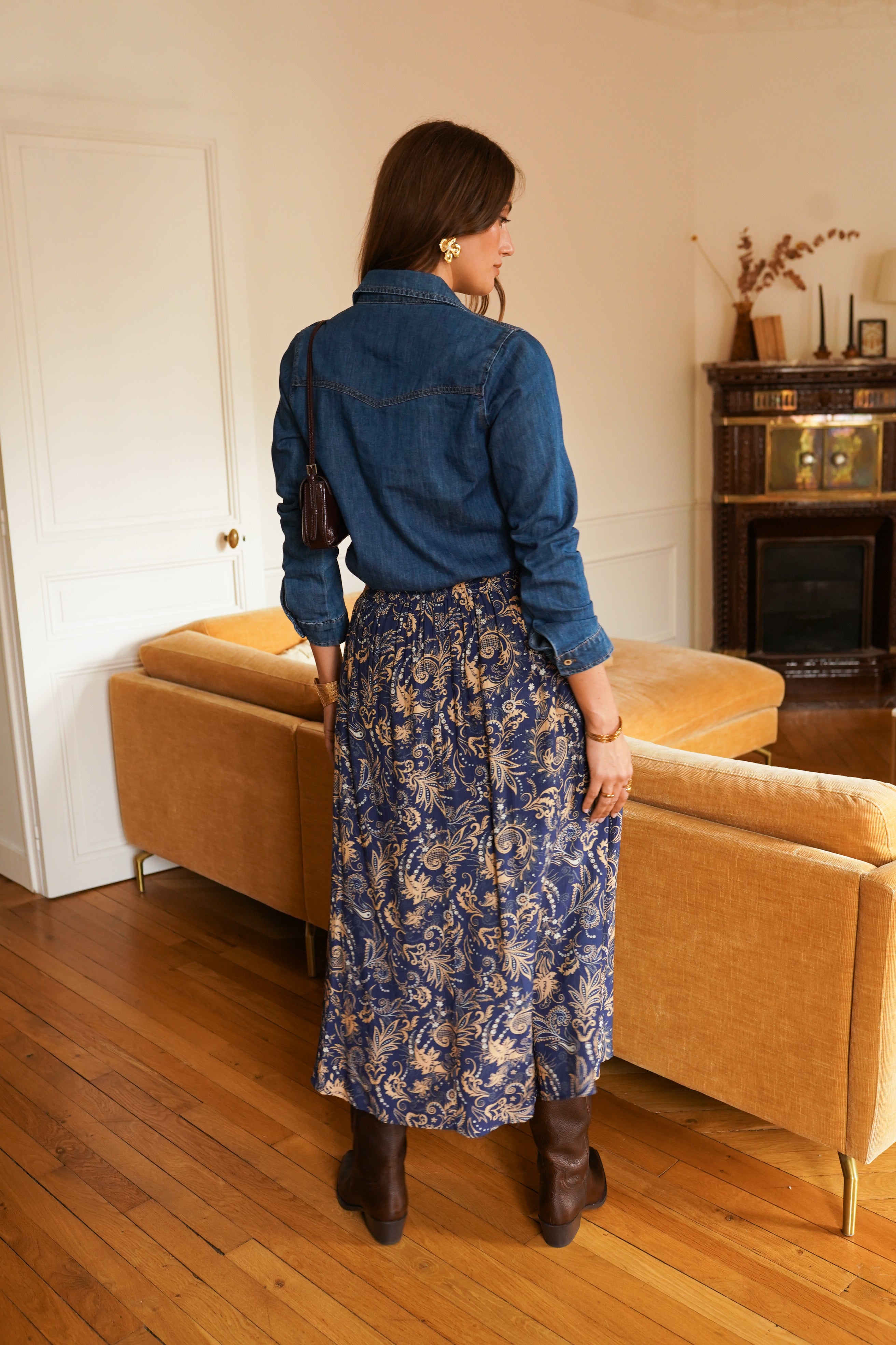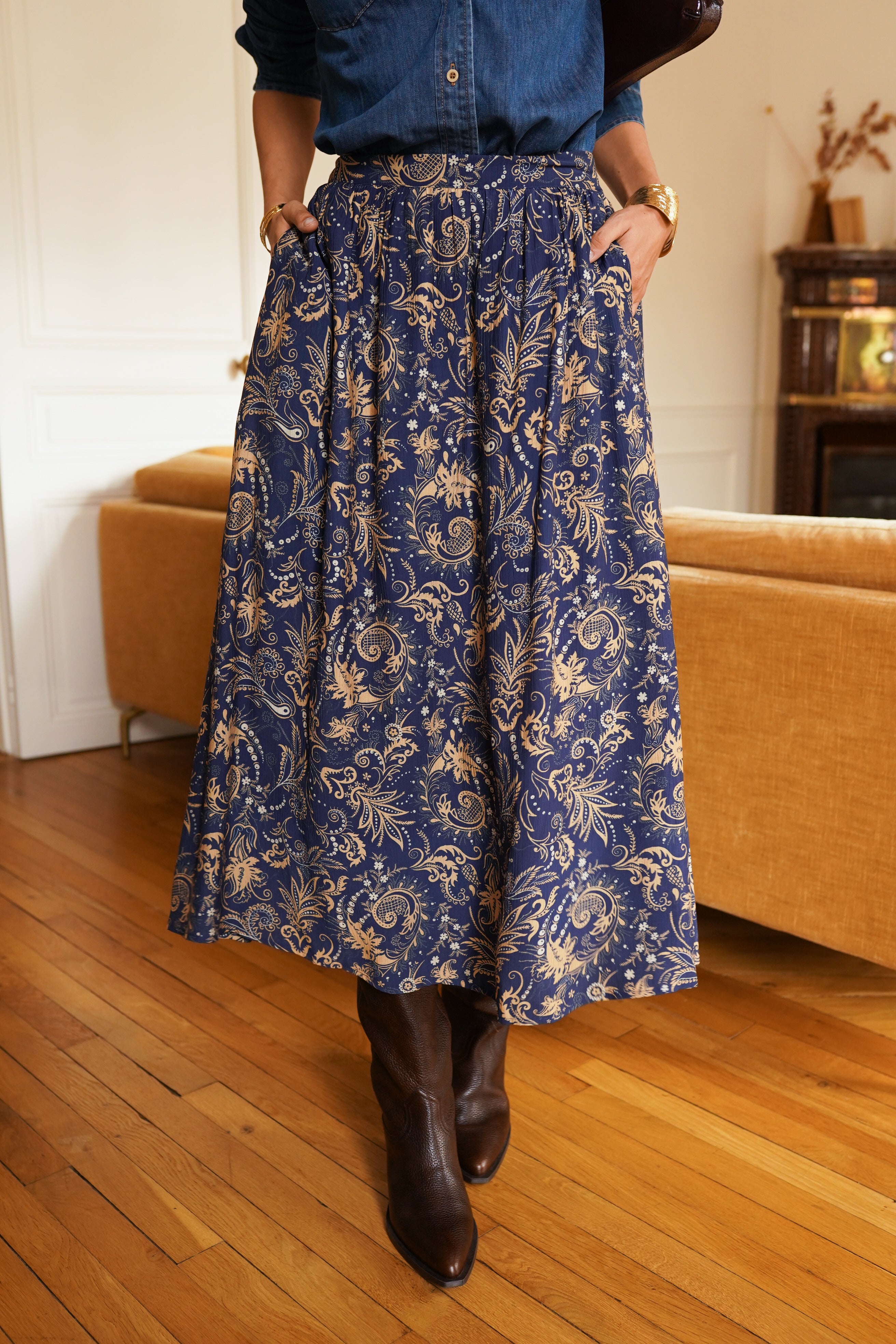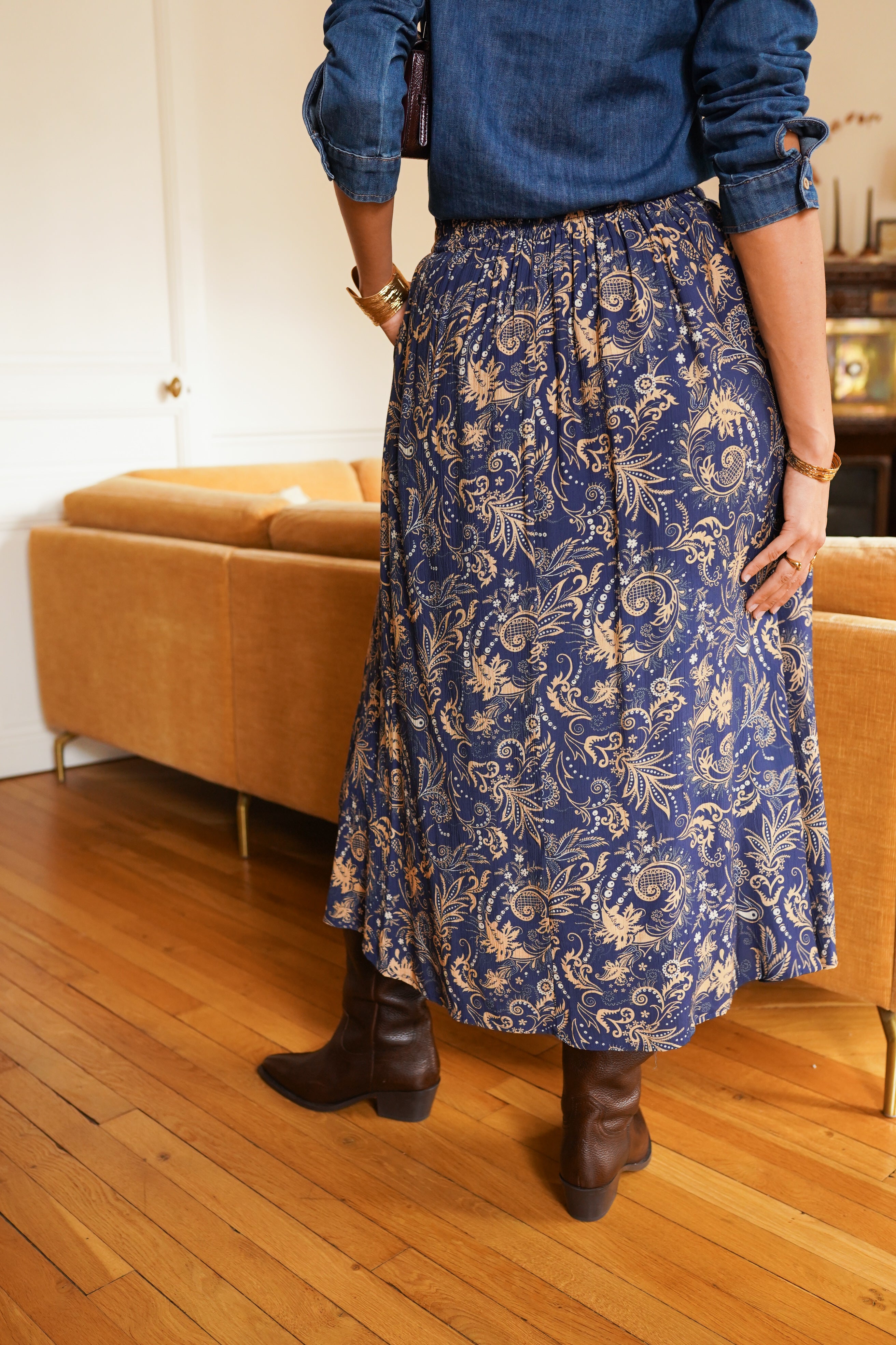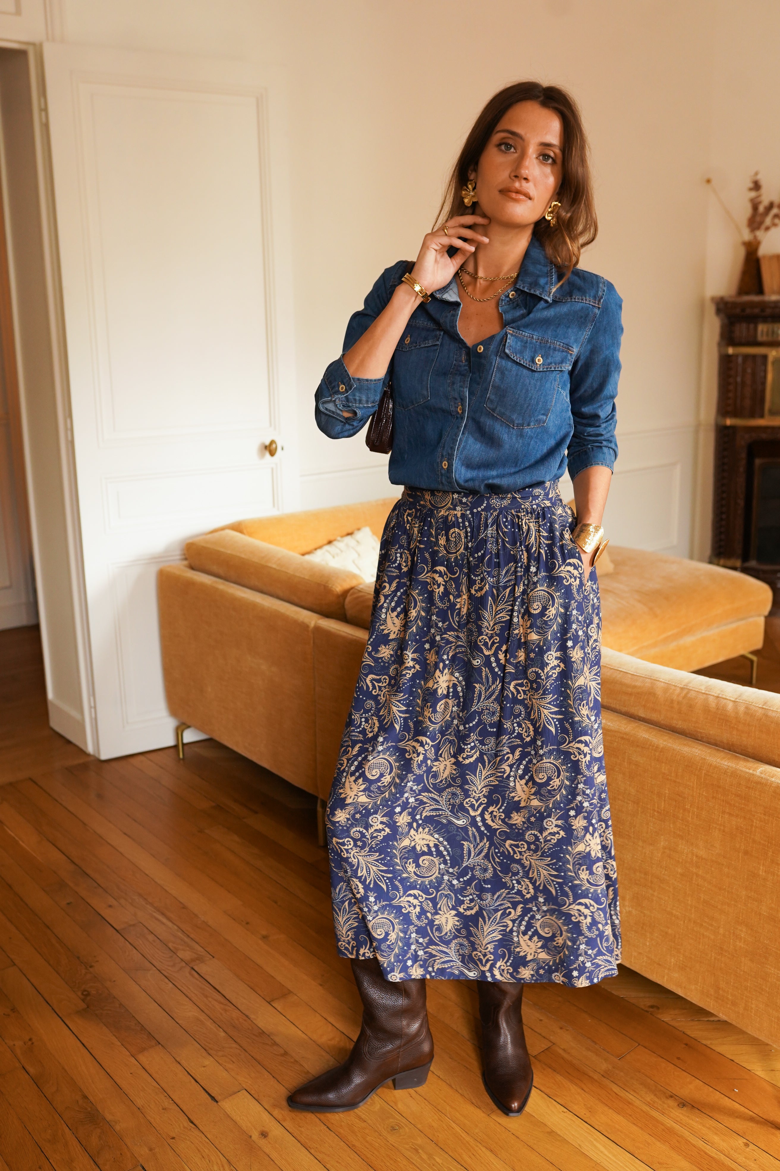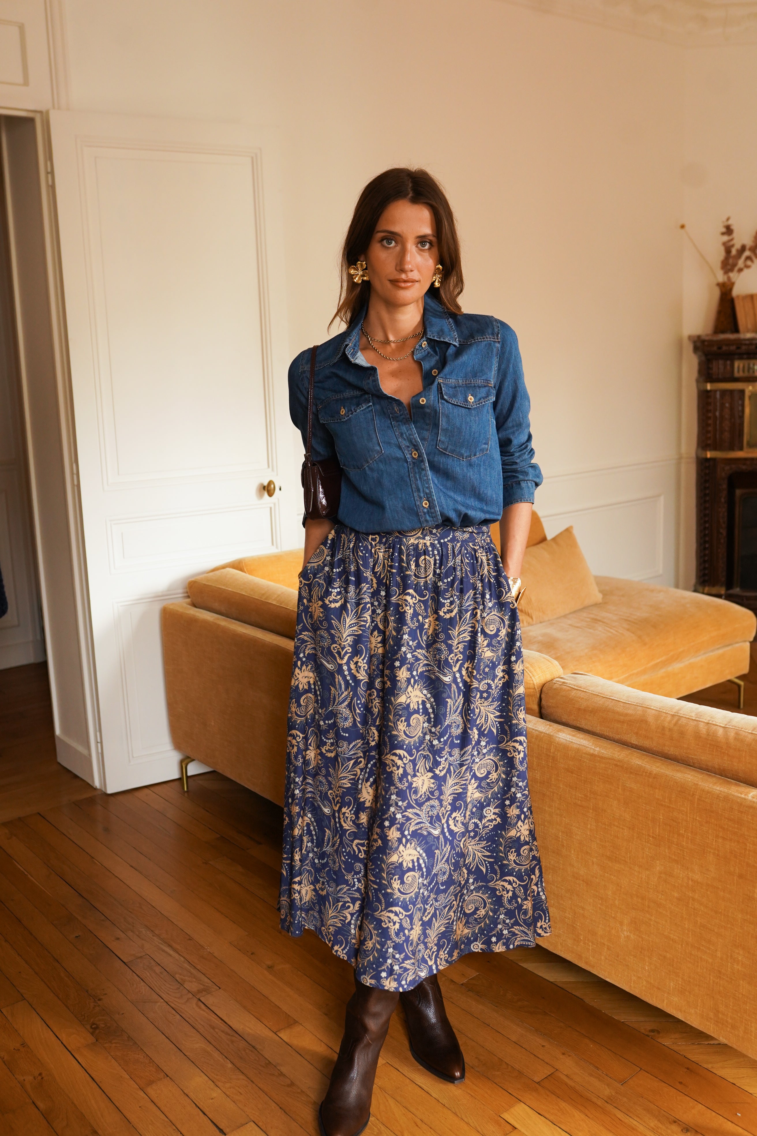 La jupe Myria dévoile un imprimé bleu et doré inspiré des motifs baroques, entre élégance et audace. Sa coupe fluide et sa taille élastiquée soulignent la silhouette avec légèreté. Confortable et pleine de charme, elle se prête aussi bien aux boots qu’aux baskets.