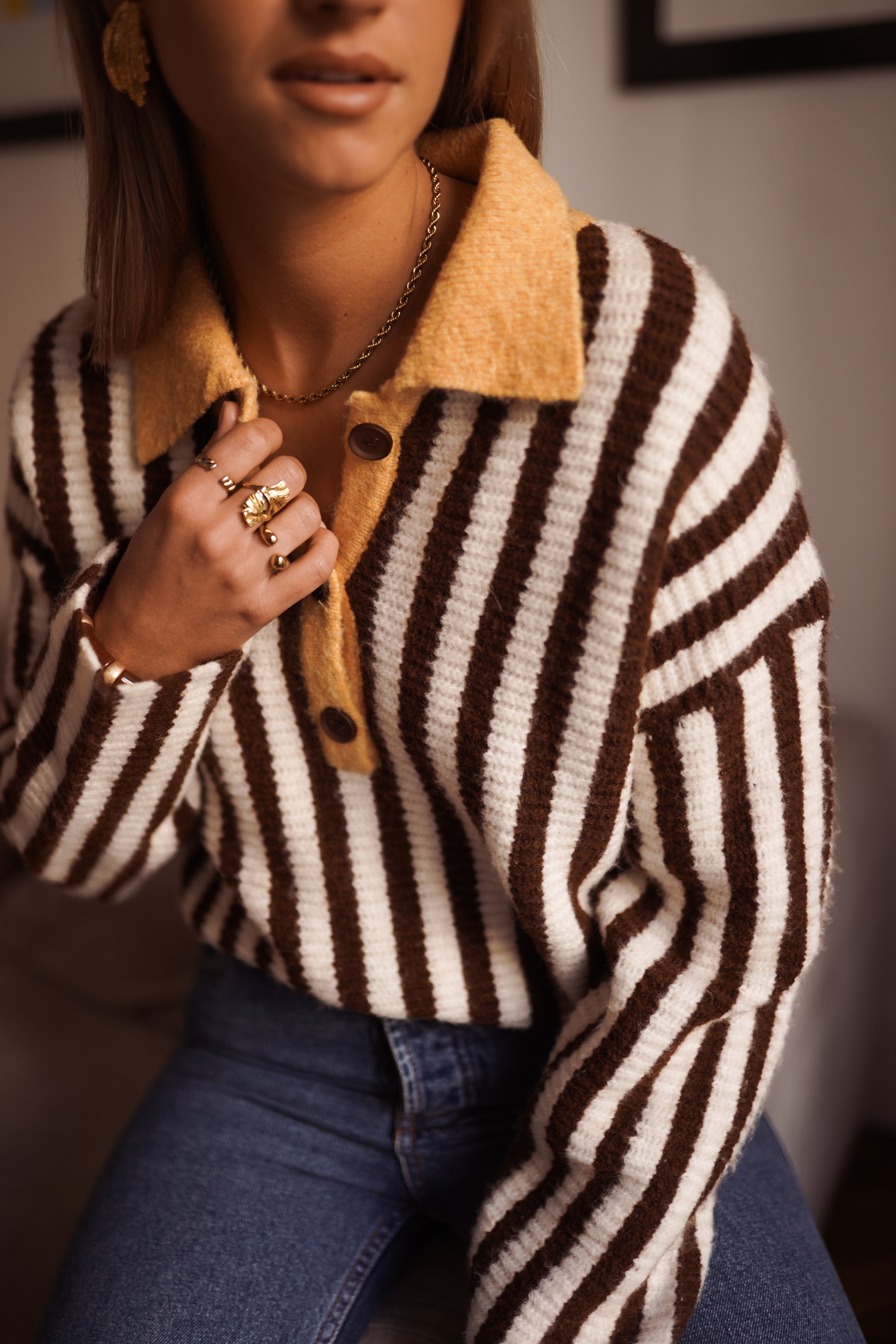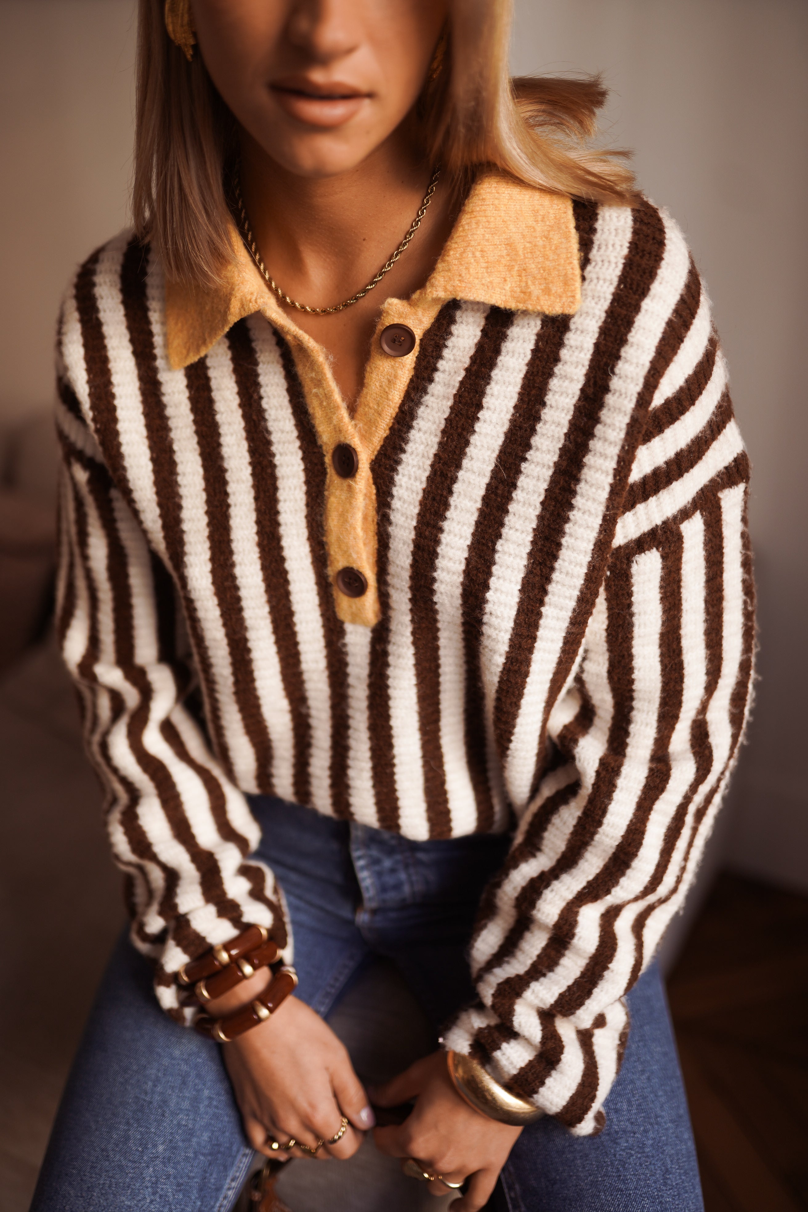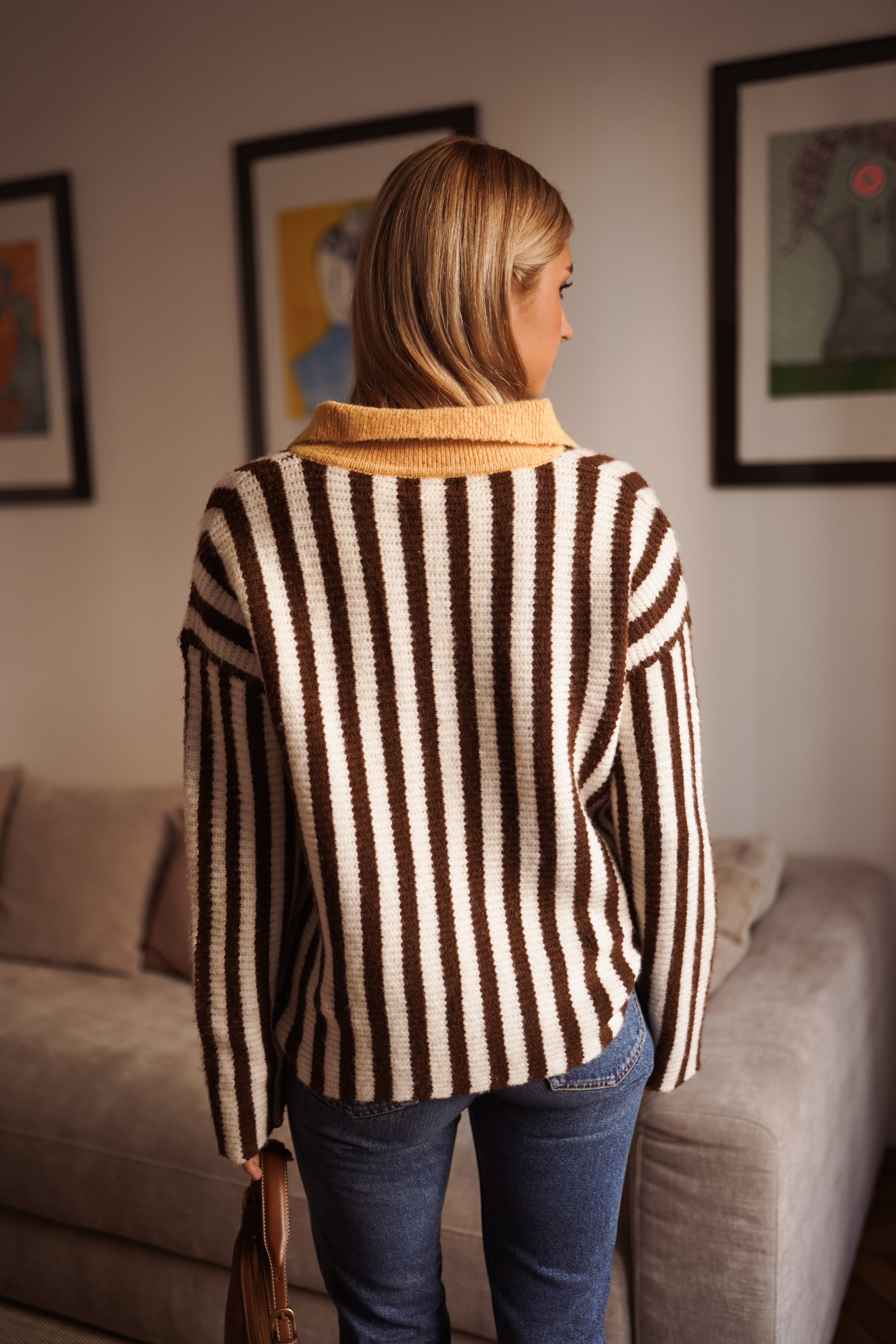 La maille Achille, c’est le pull graphique qui pose le ton. Ses rayures chocolat et écru créent un rythme net et actuel, relevé par un col contrasté jaune qui apporte juste ce qu’il faut de twist.