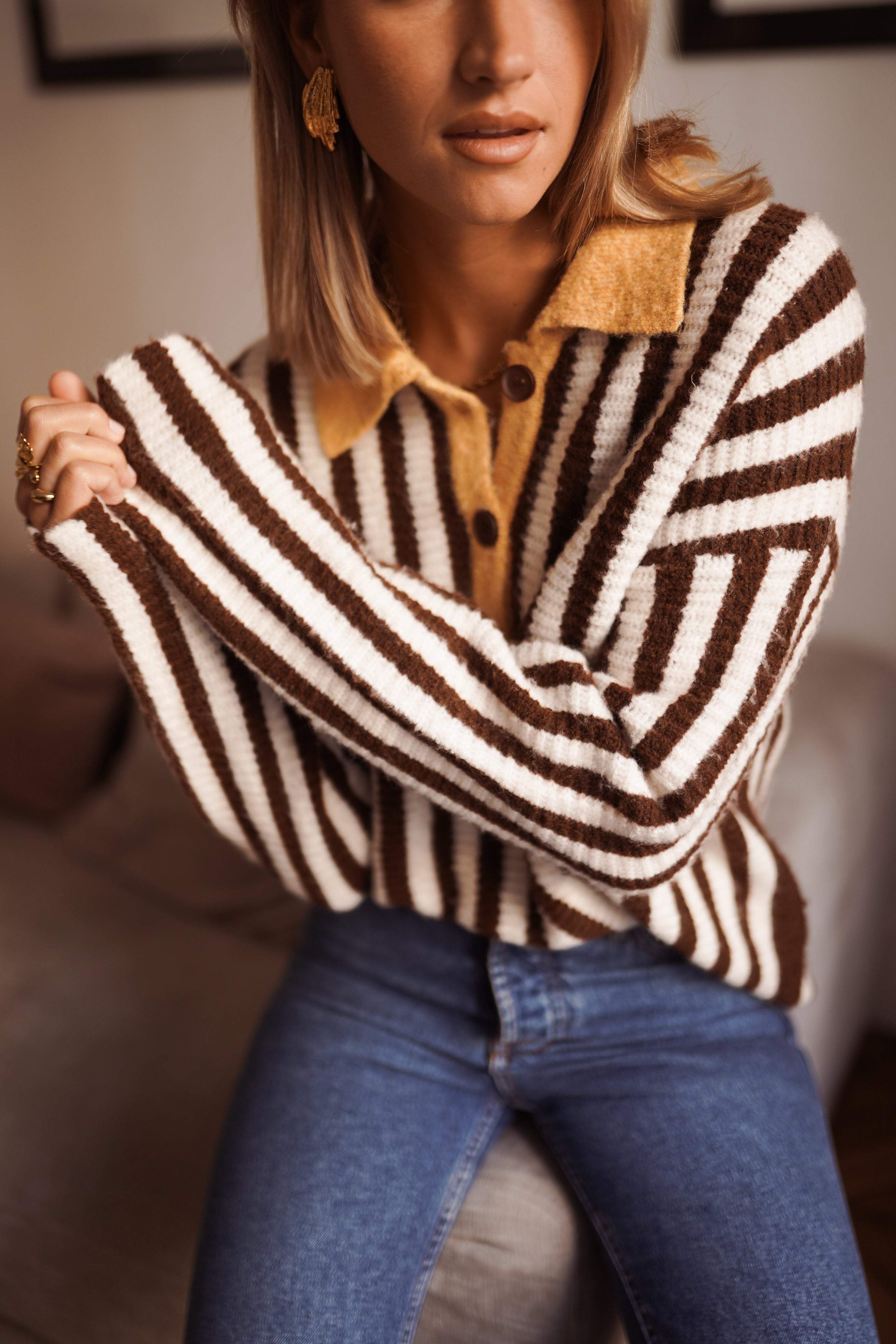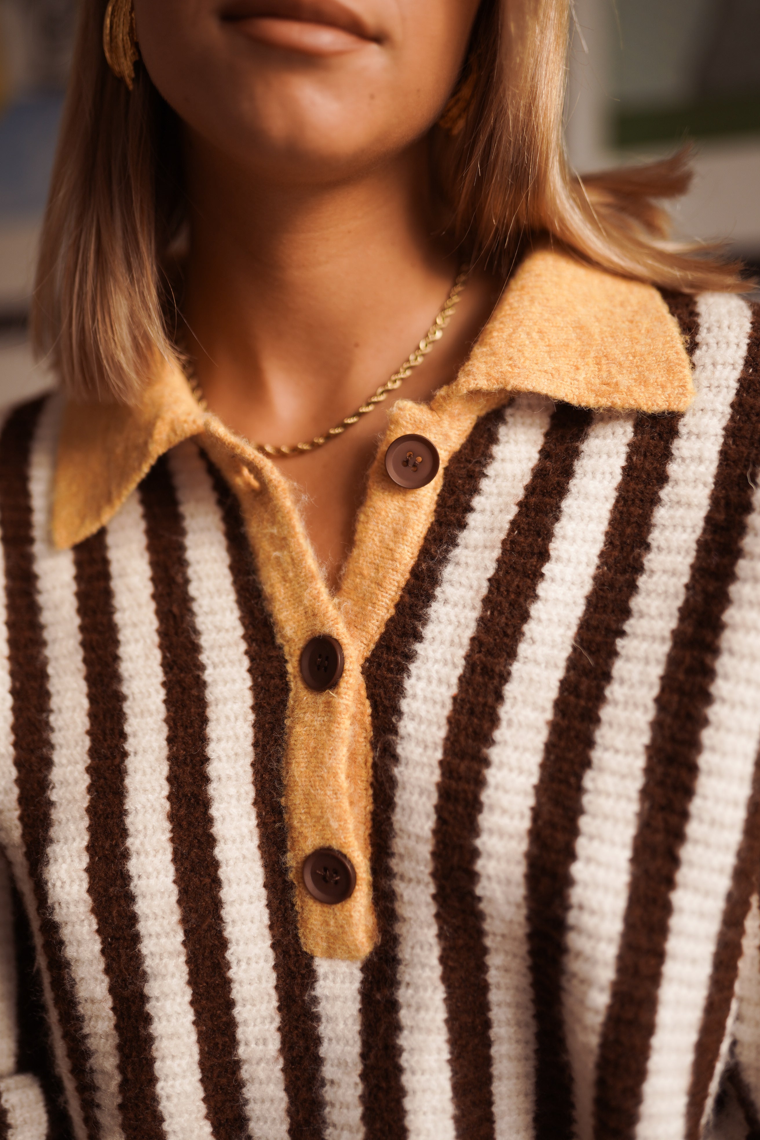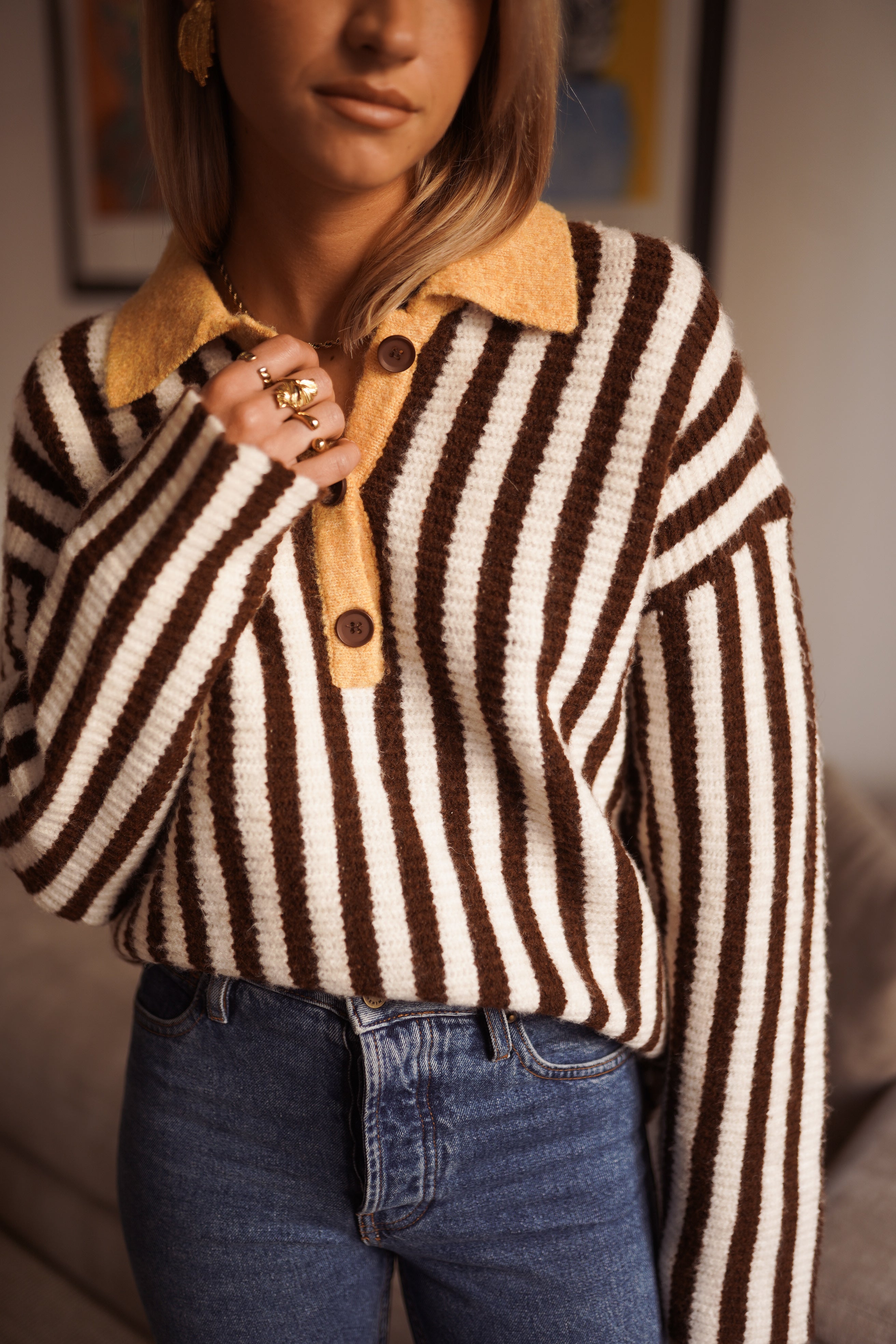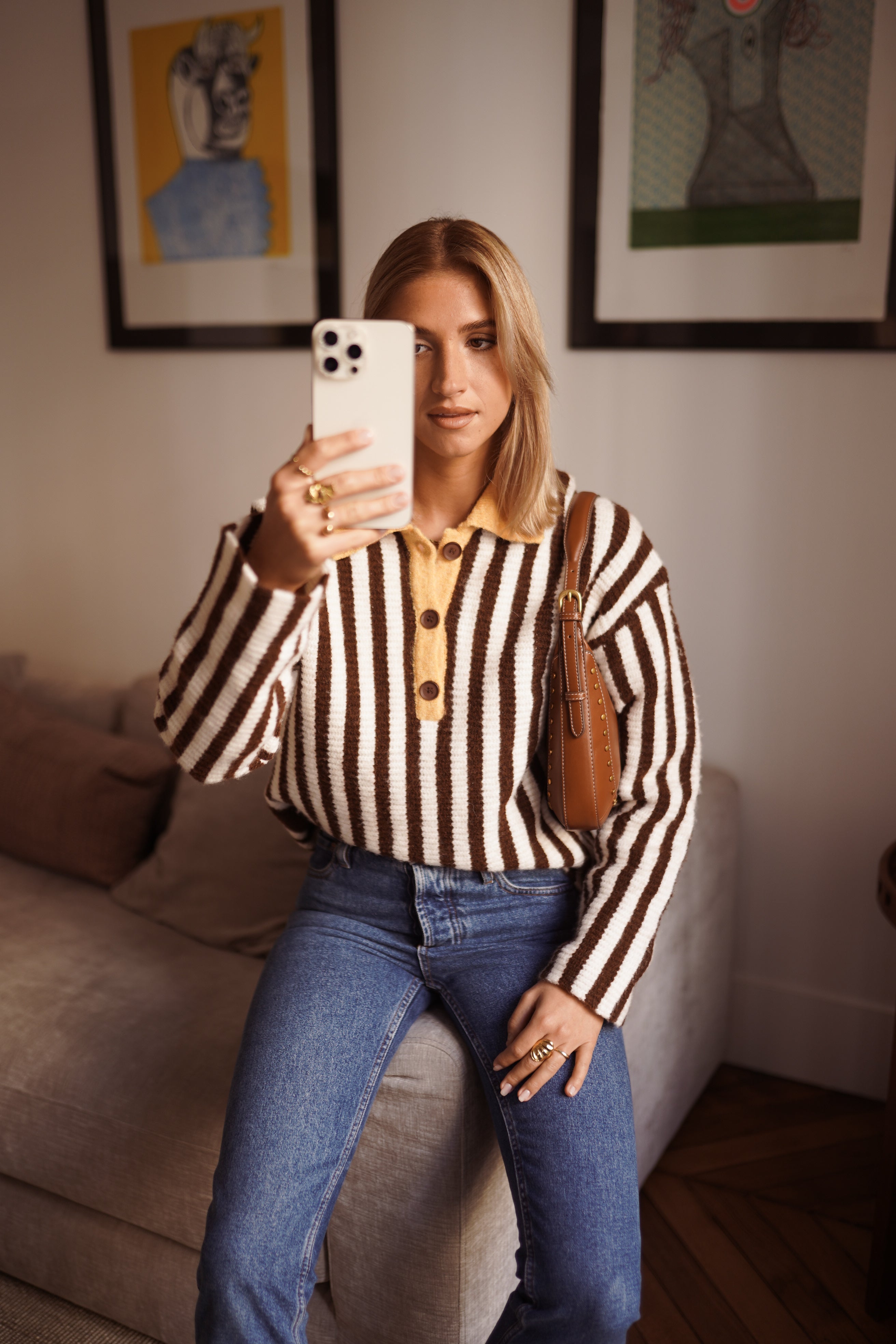La maille Achille, c’est le pull graphique qui pose le ton. Ses rayures chocolat et écru créent un rythme net et actuel, relevé par un col contrasté jaune qui apporte juste ce qu’il faut de twist.