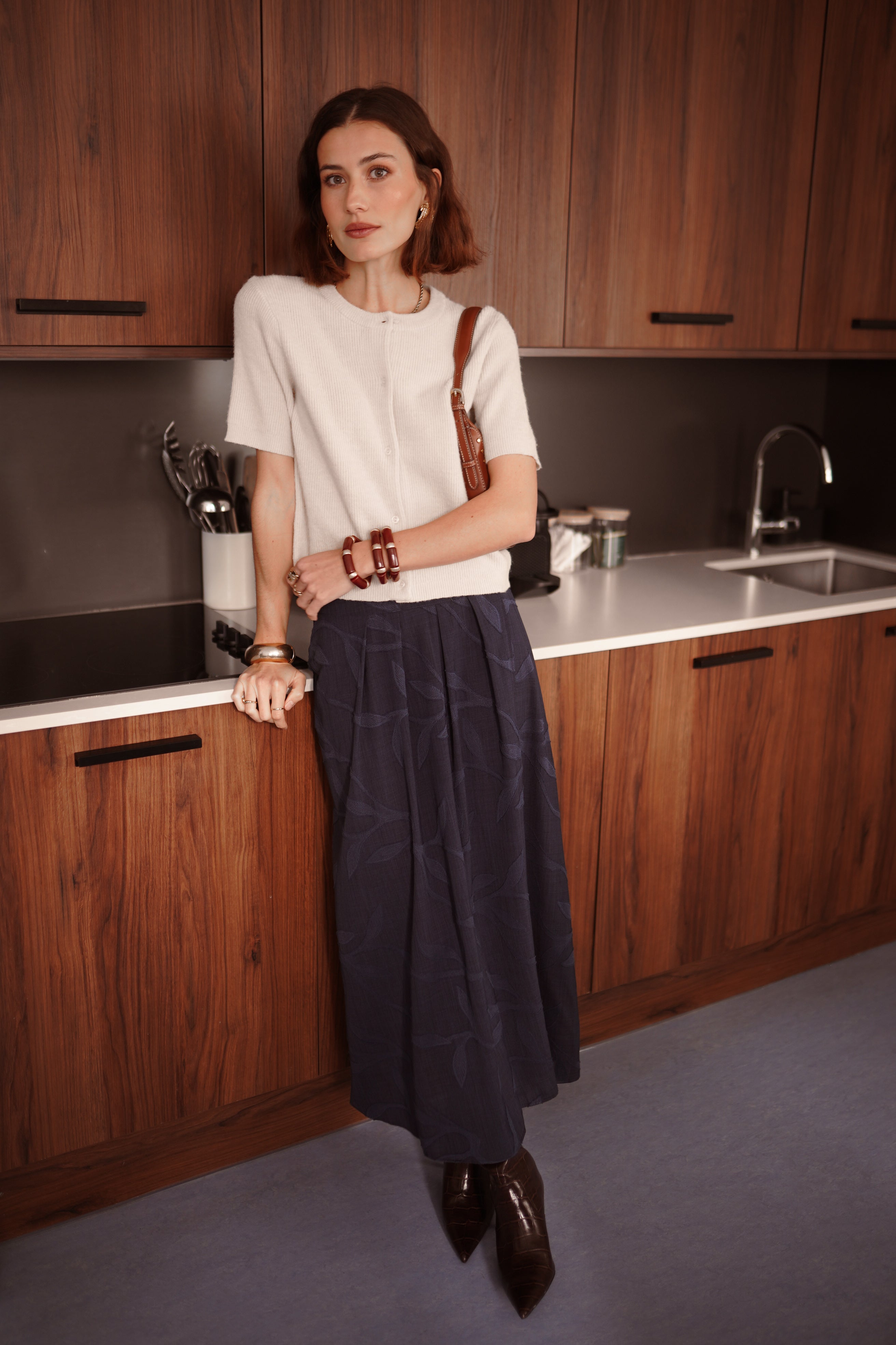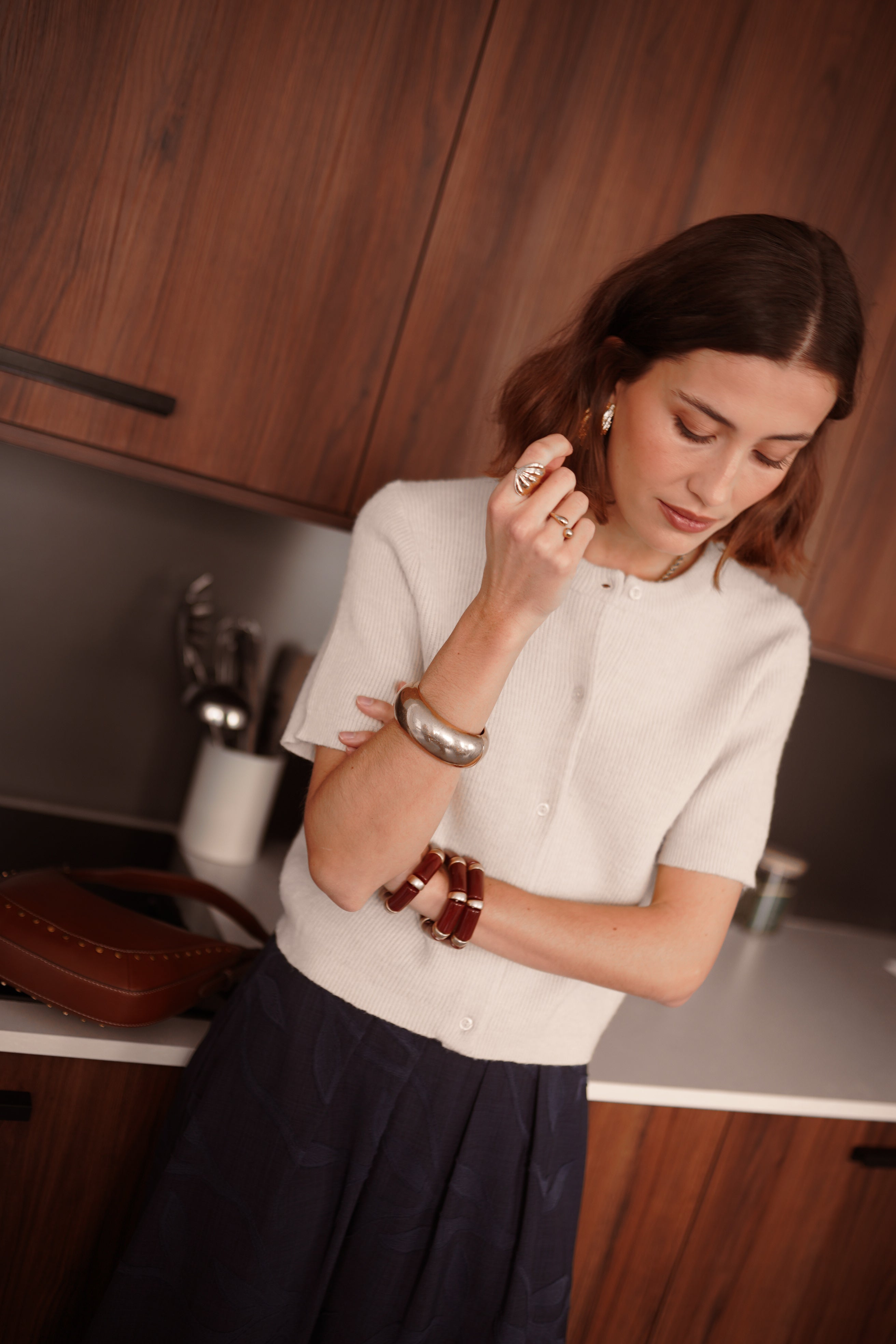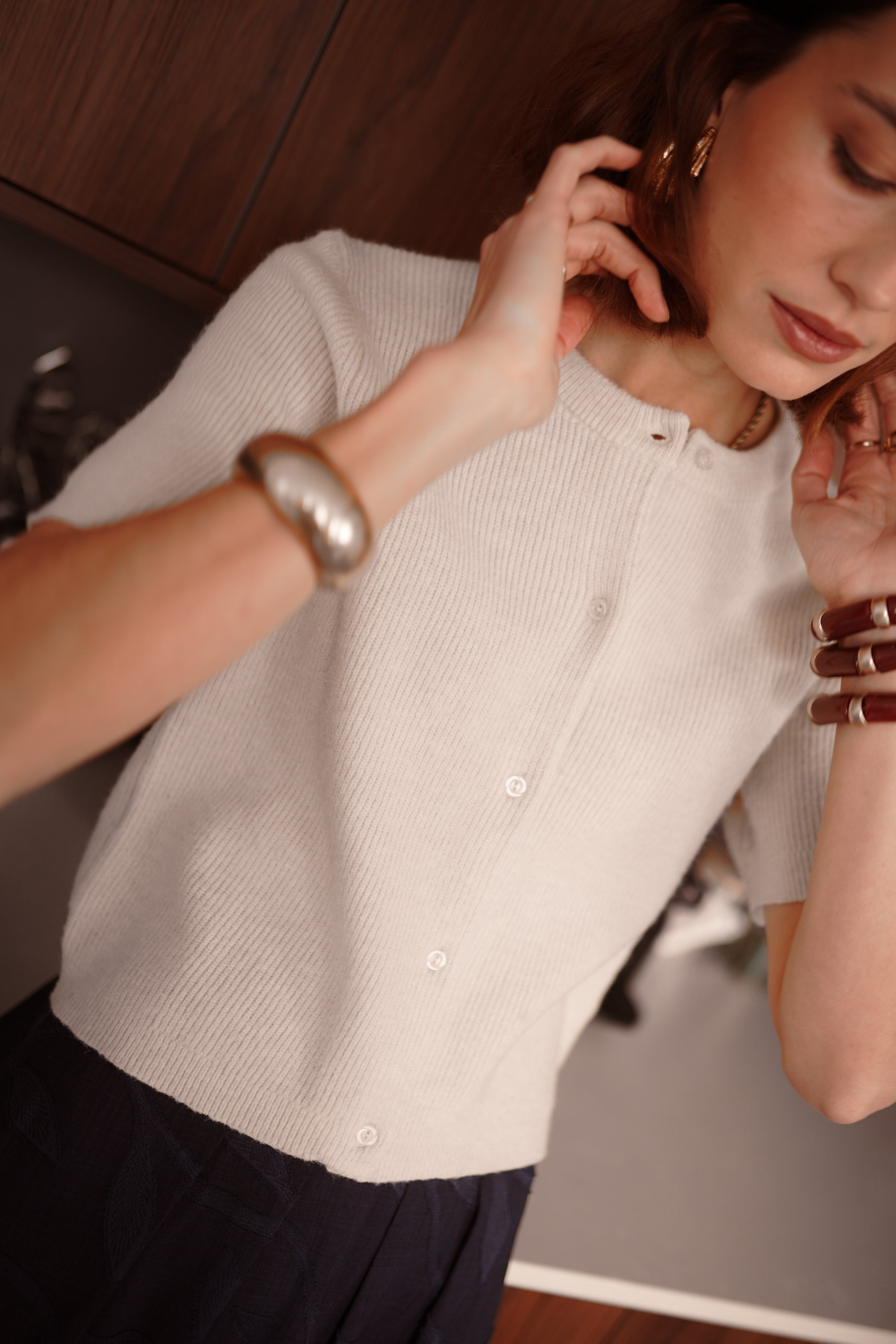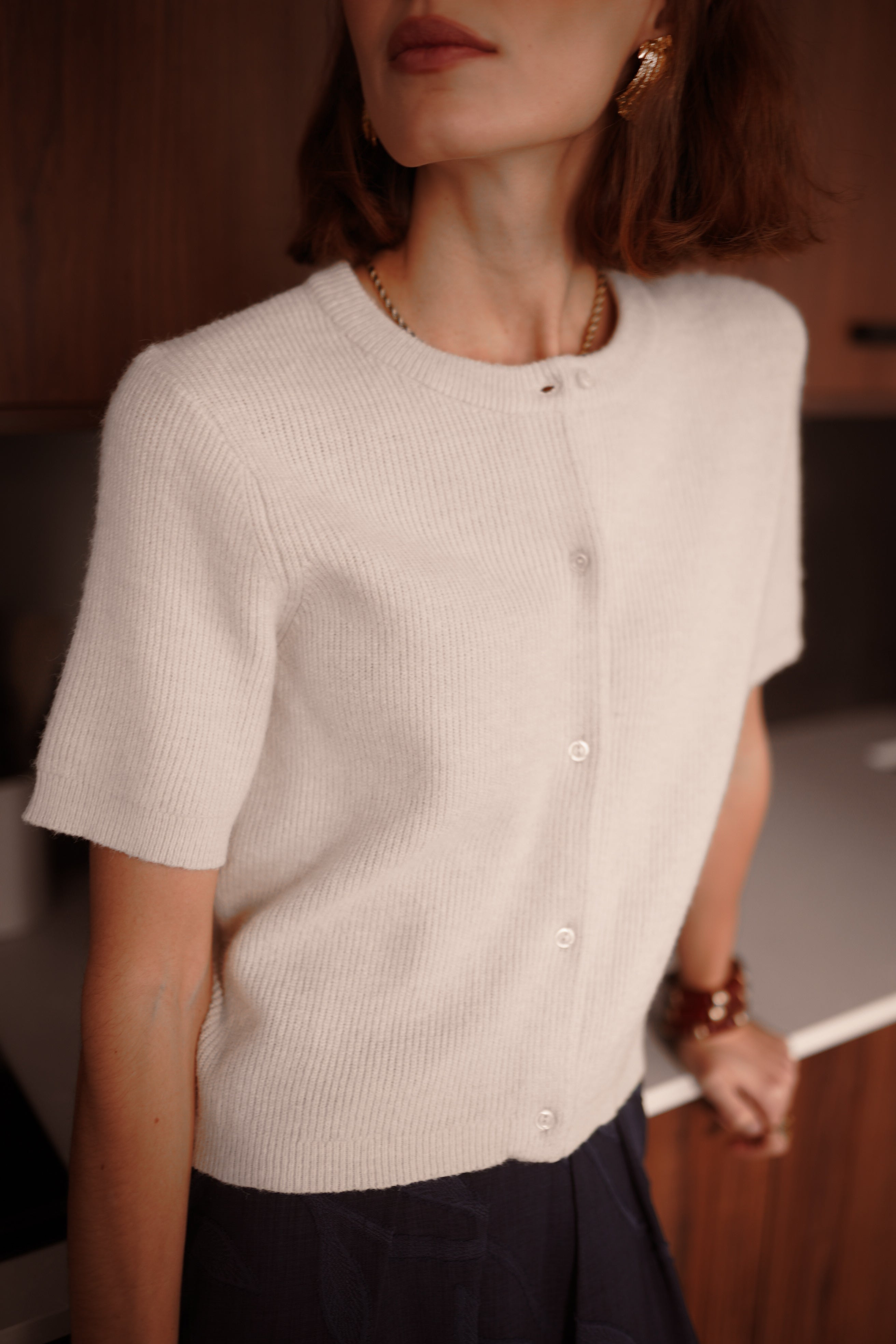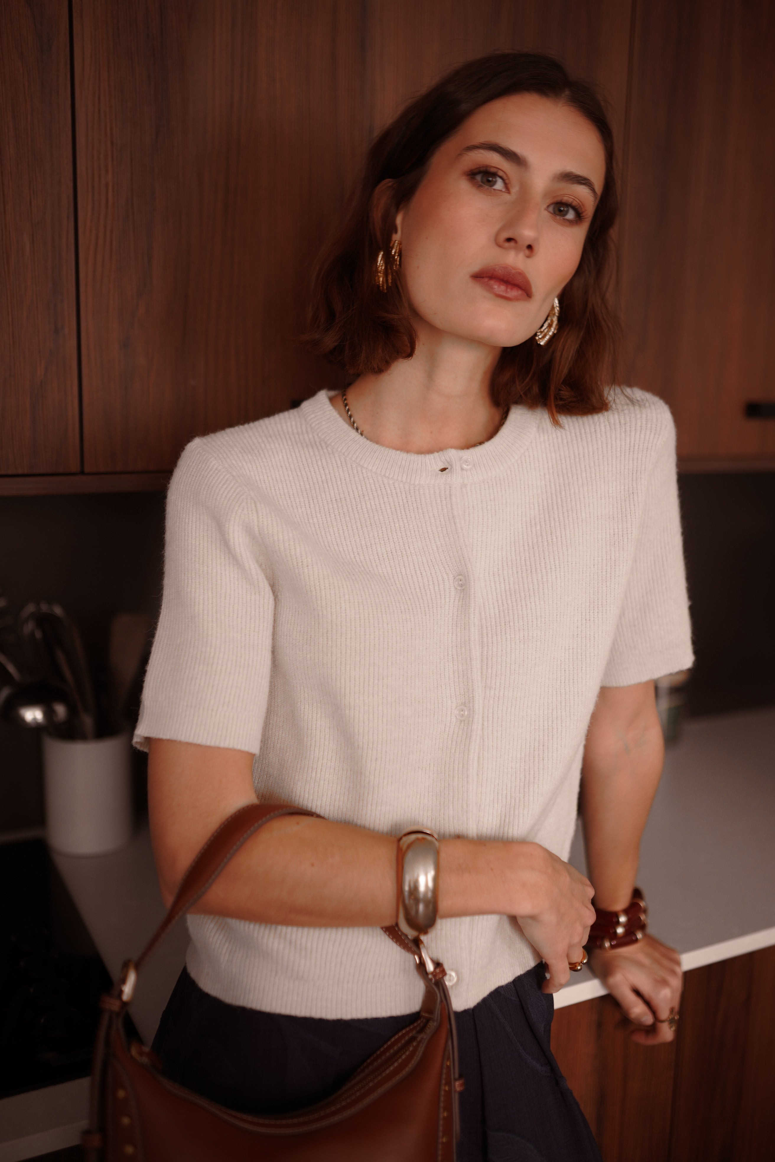 Ariana mise sur la simplicité raffinée : une maille fine, une coupe nette et ce détail essentiel des manches courtes qui apporte légèreté et modernité.