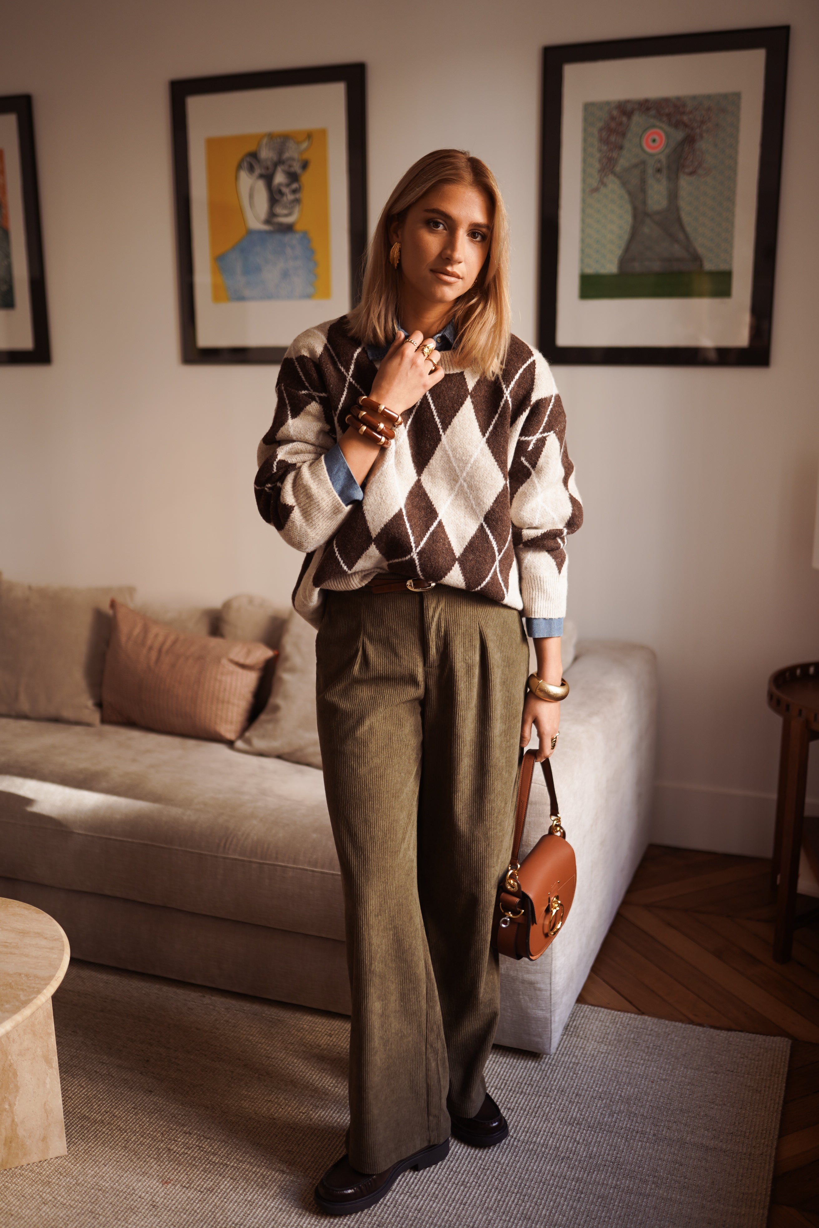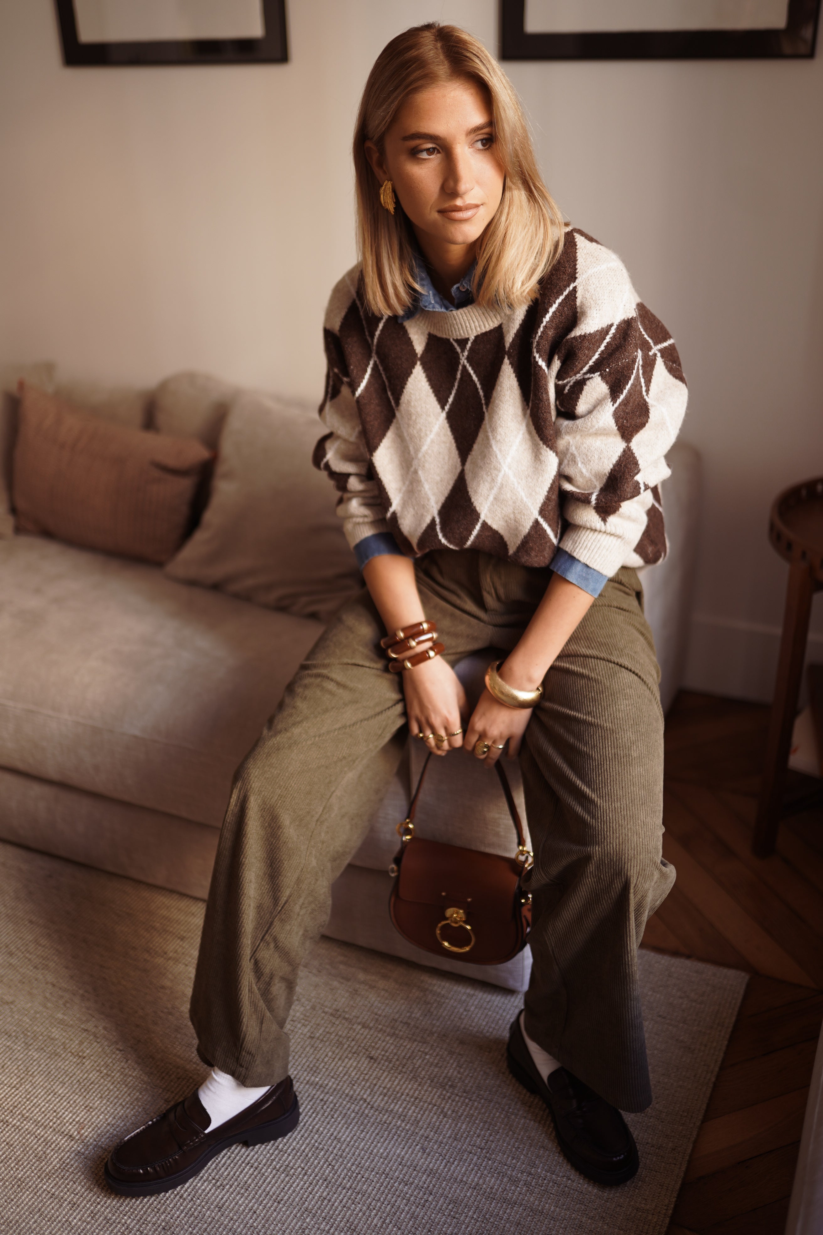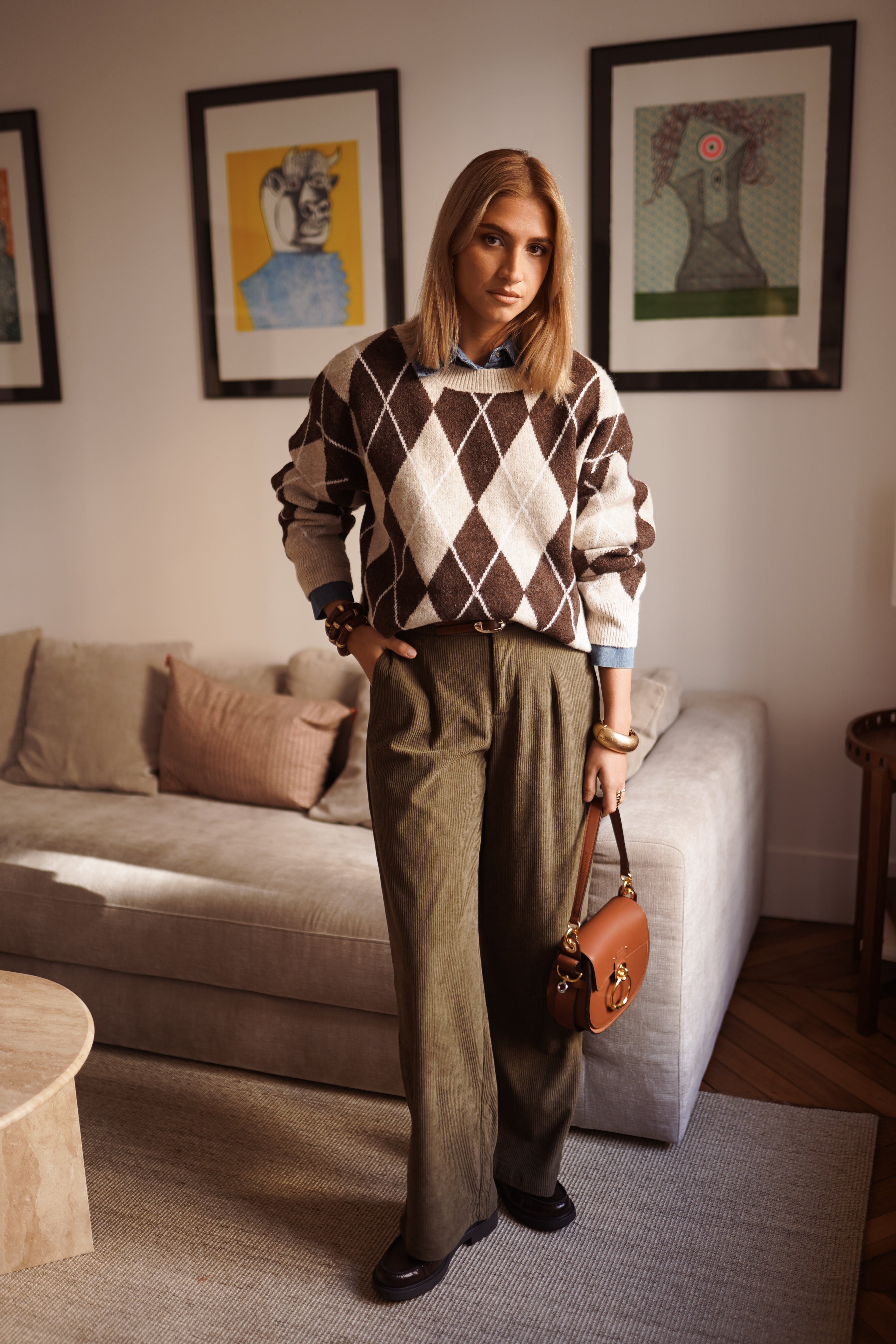 La maille Arthur réinvente le motif losange avec un jeu de tons brun et écru. Une coupe droite, un volume cosy et un esprit rétro assumé : c’est le pull graphique qui structure un look en un clin d’œil.
