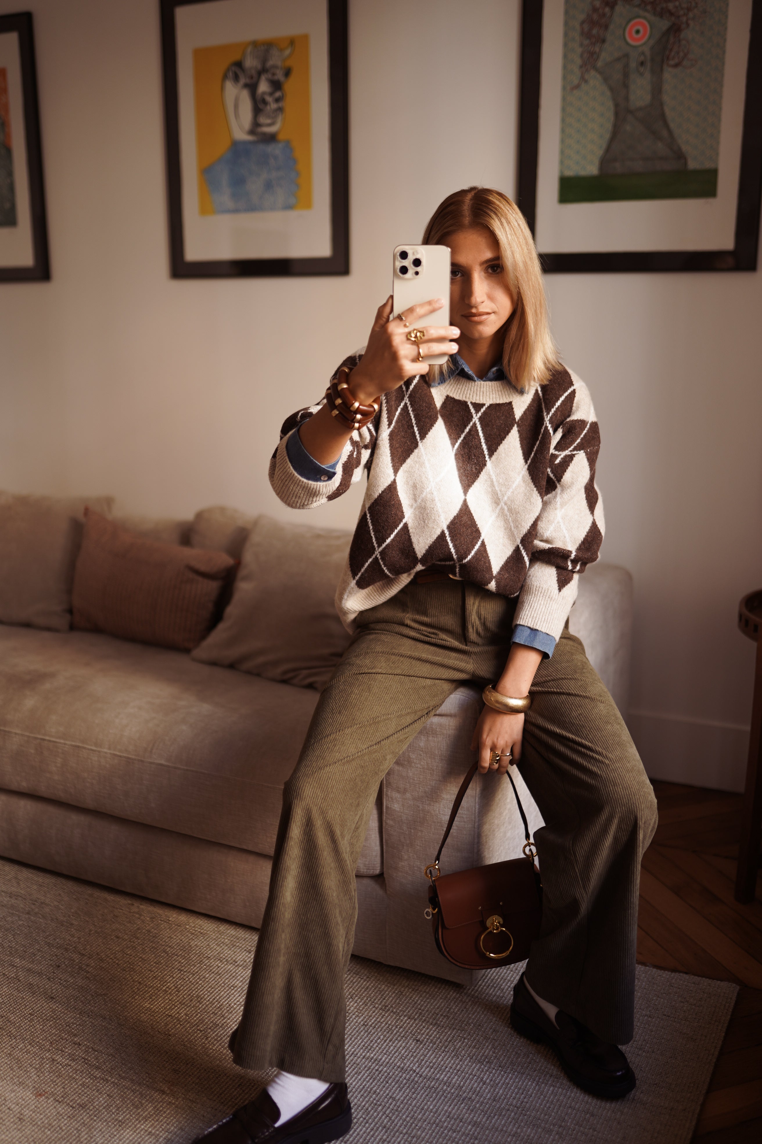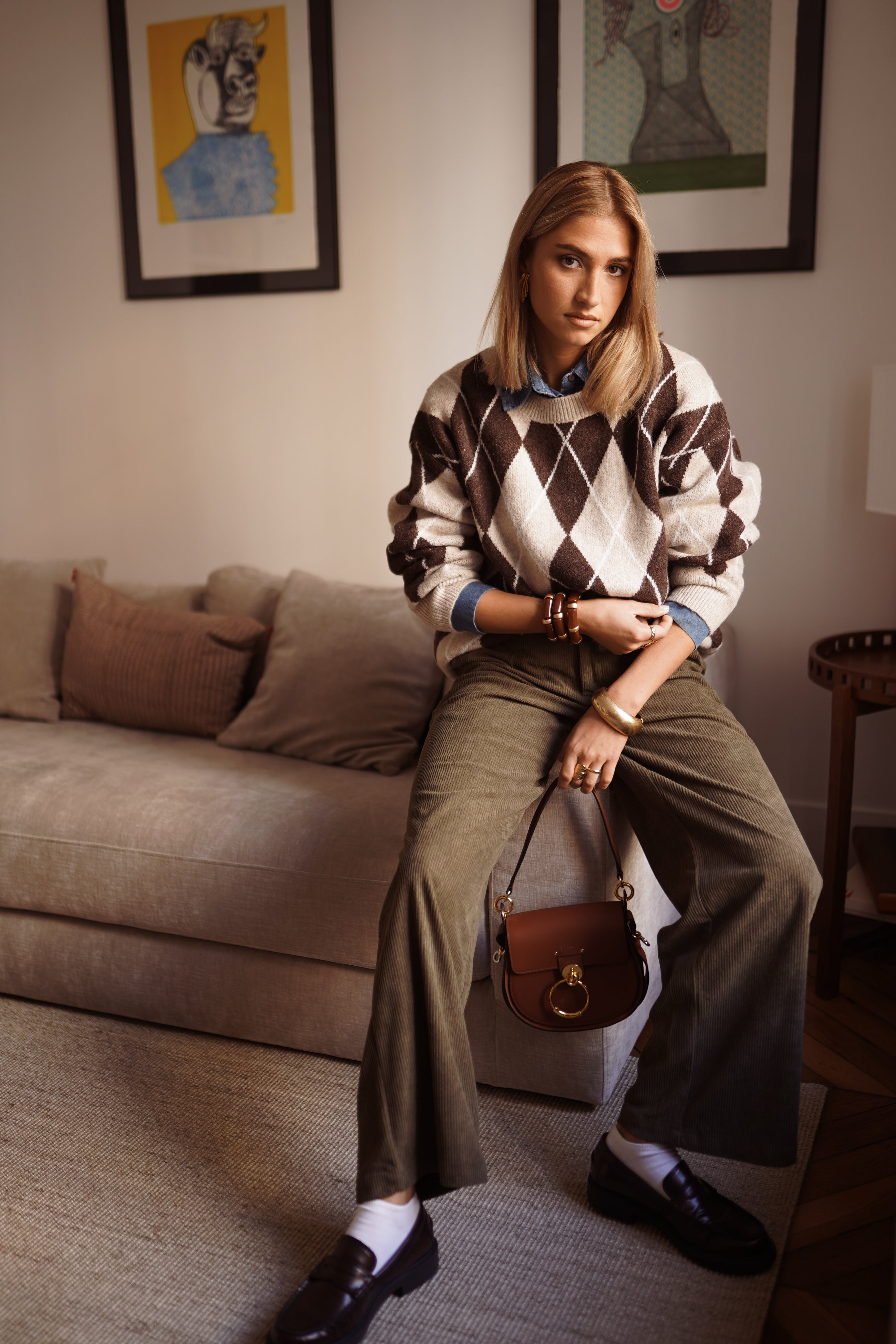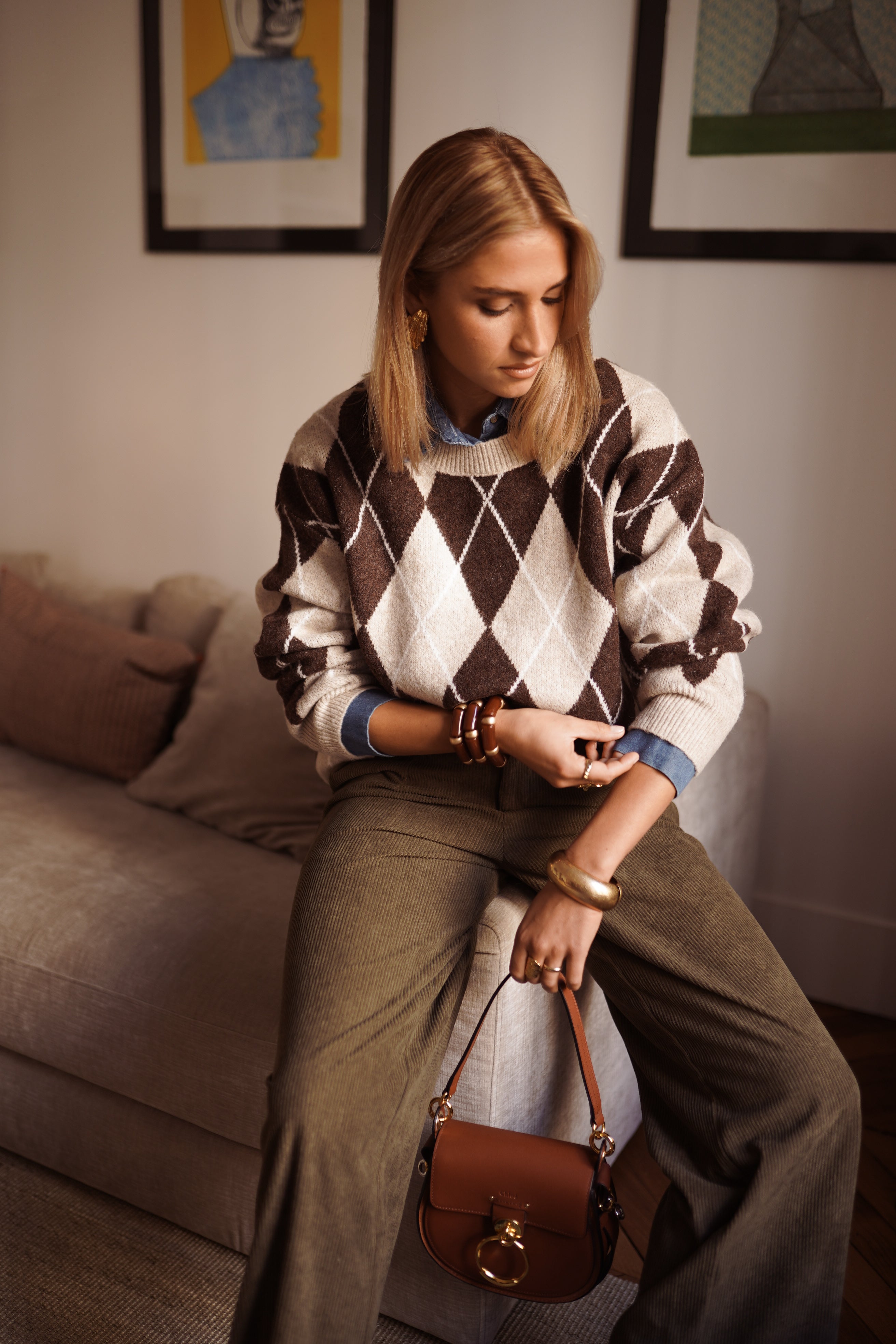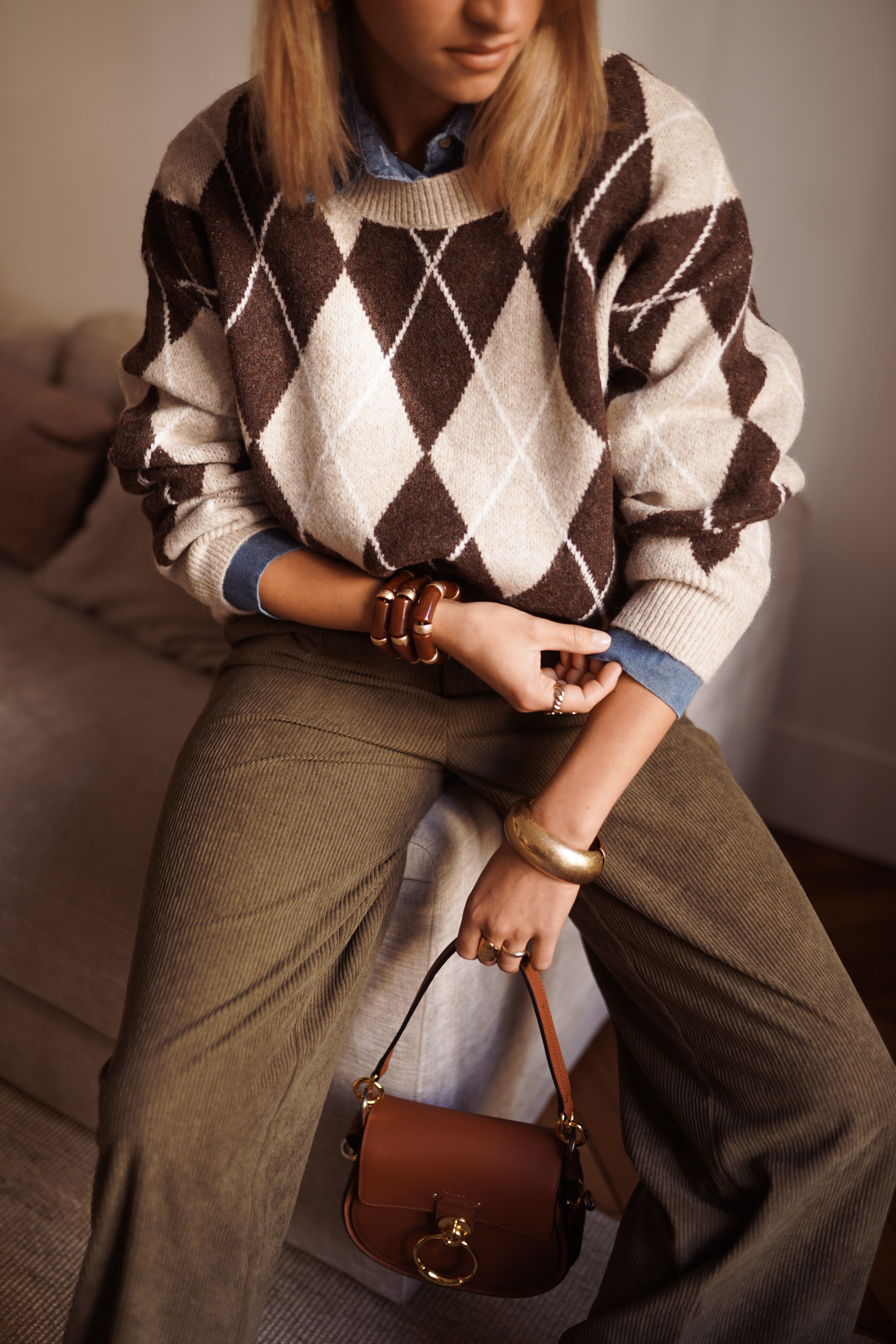 La maille Arthur réinvente le motif losange avec un jeu de tons brun et écru. Une coupe droite, un volume cosy et un esprit rétro assumé : c’est le pull graphique qui structure un look en un clin d’œil.