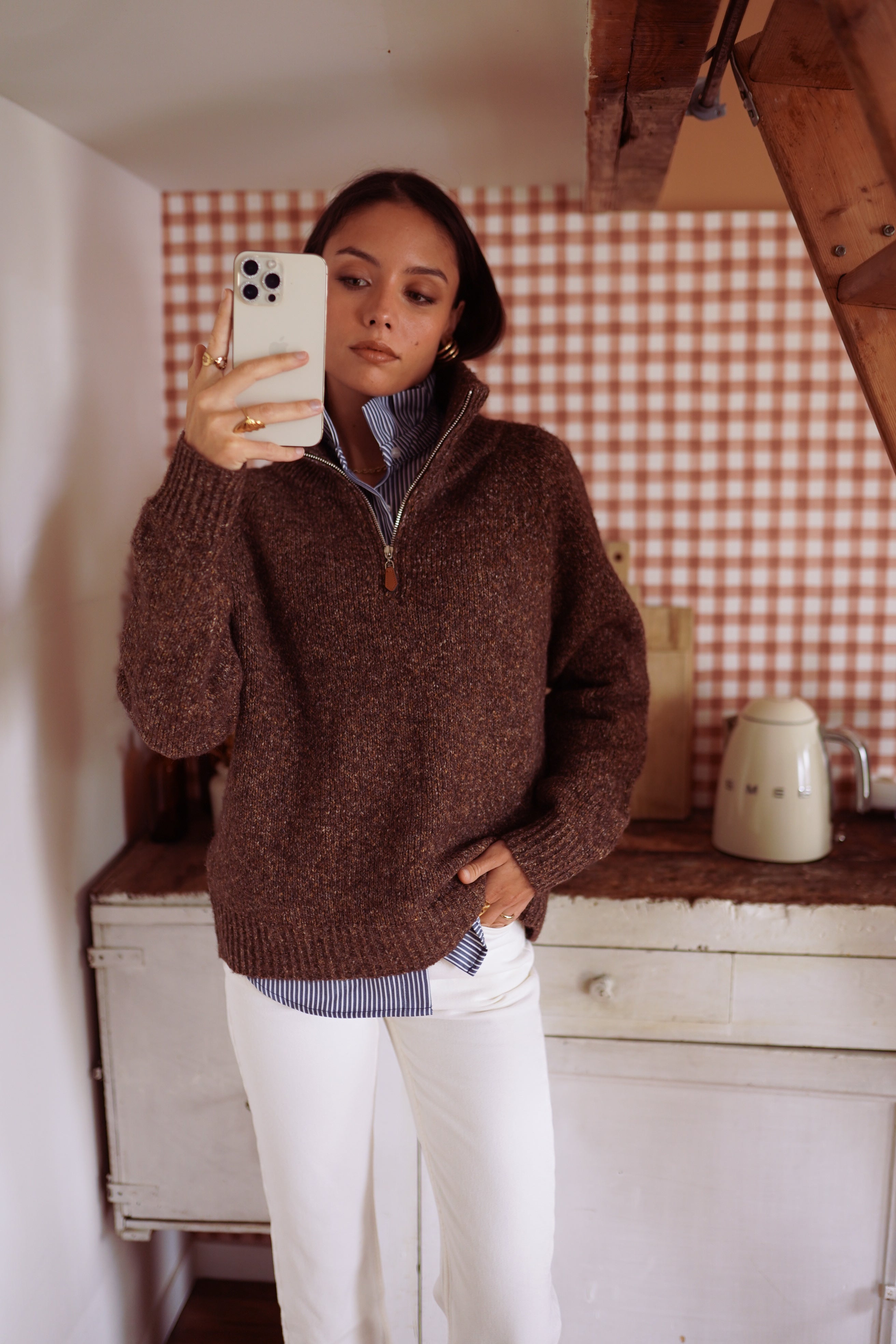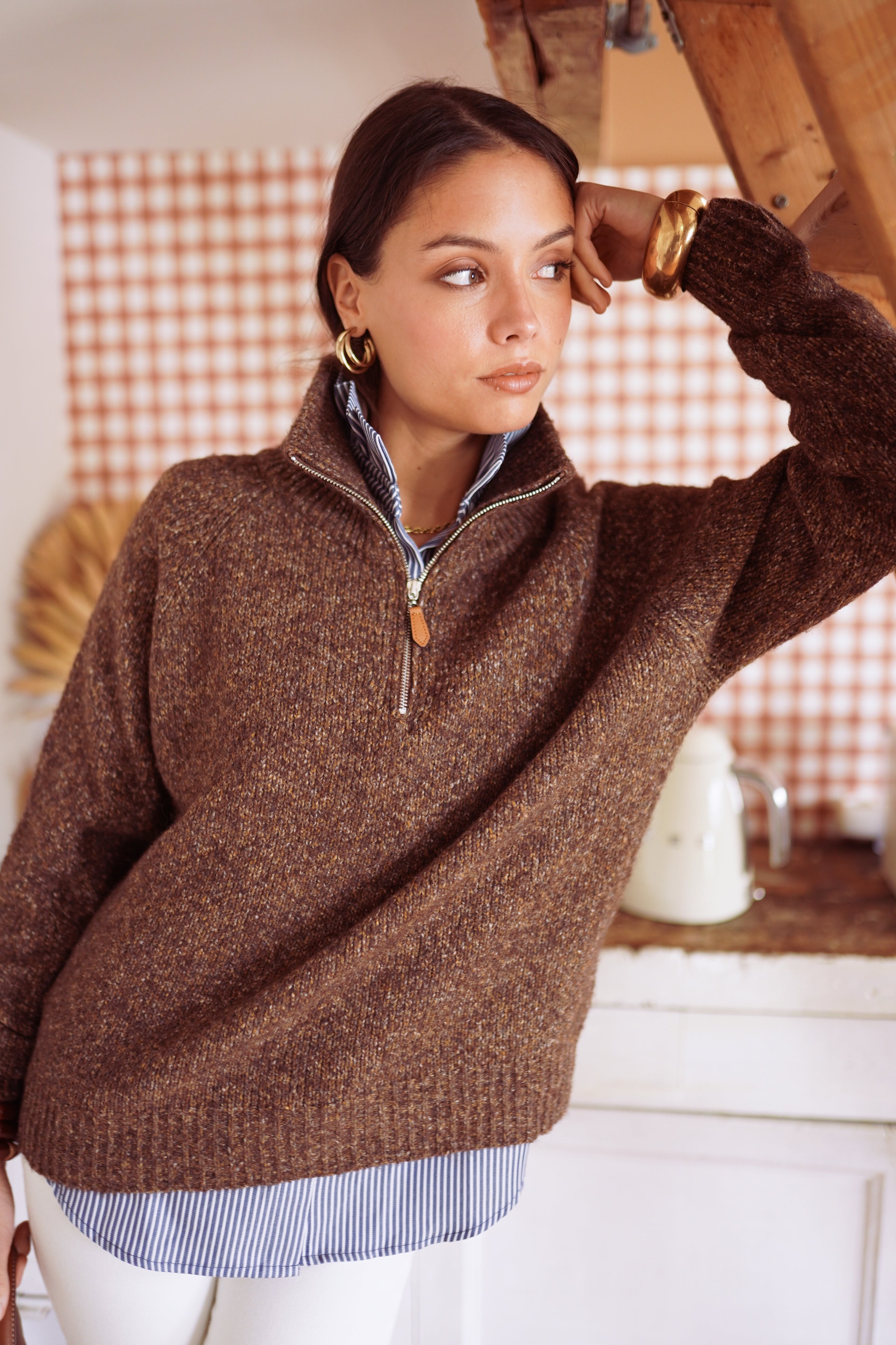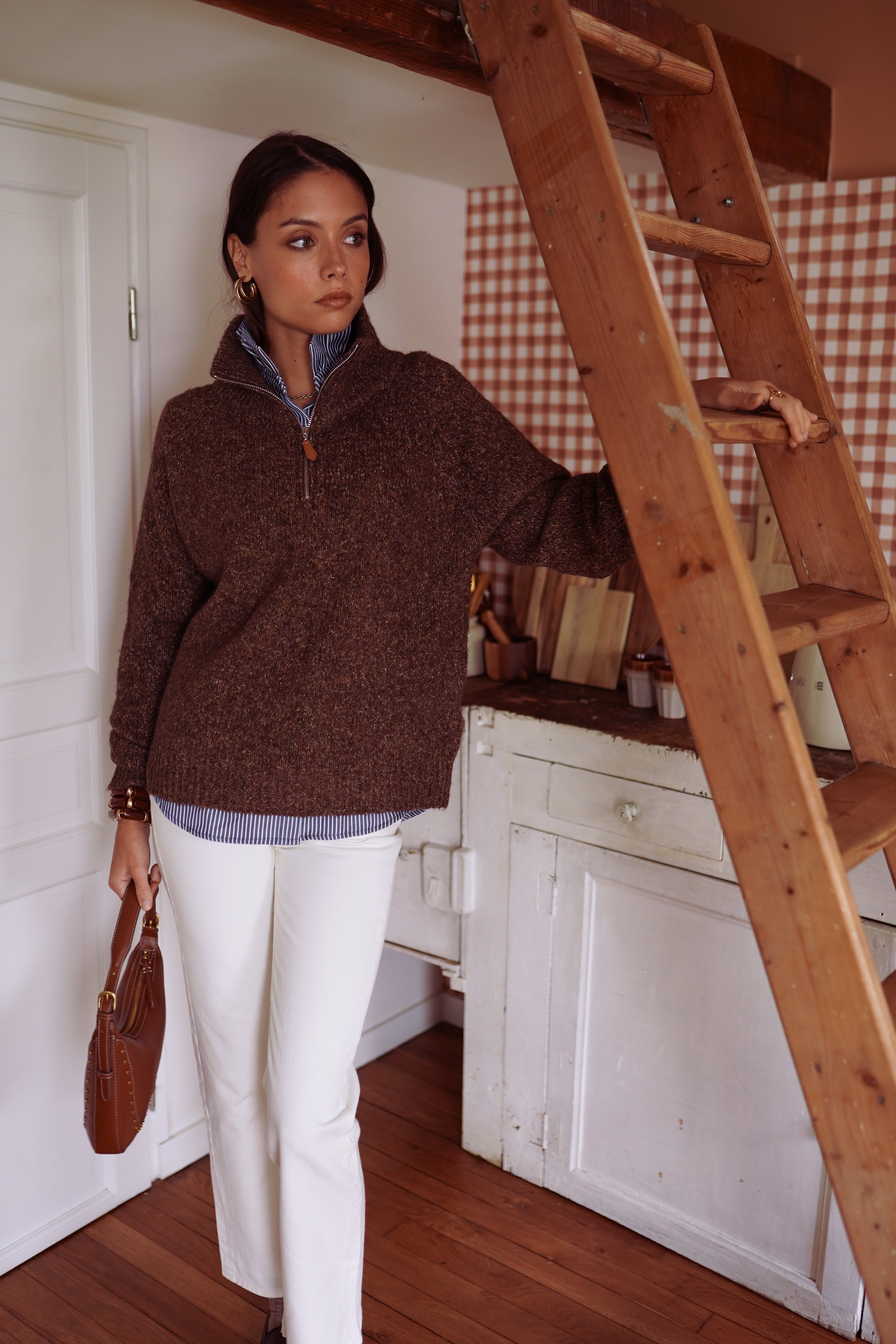 La maille Eponine, c’est l’équilibre parfait entre confort et allure. Avec son col zippé et sa maille chinée, elle réchauffe la silhouette tout en gardant un esprit contemporain.