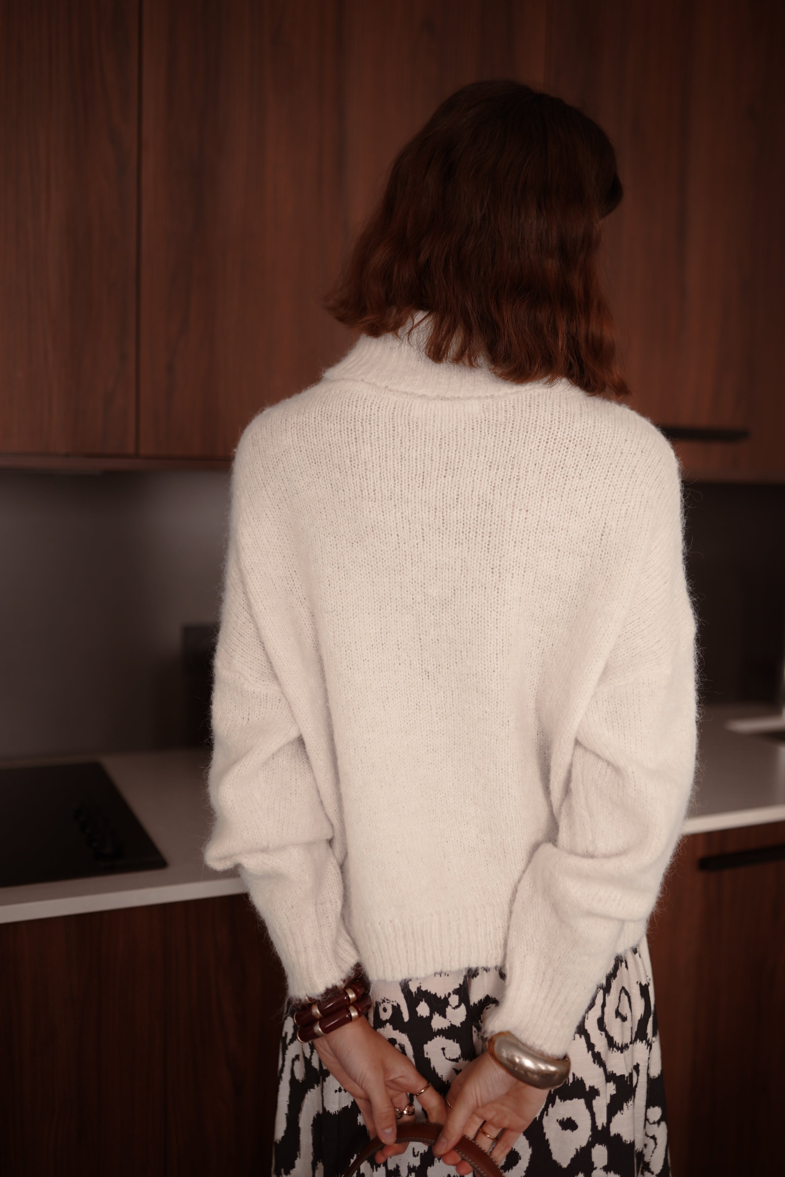Kayla enveloppe dans une douceur chaleureuse et immaculée. Une maille col roulé au volume généreux et moelleuse, pensée pour offrir un confort absolu sans perdre en élégance.