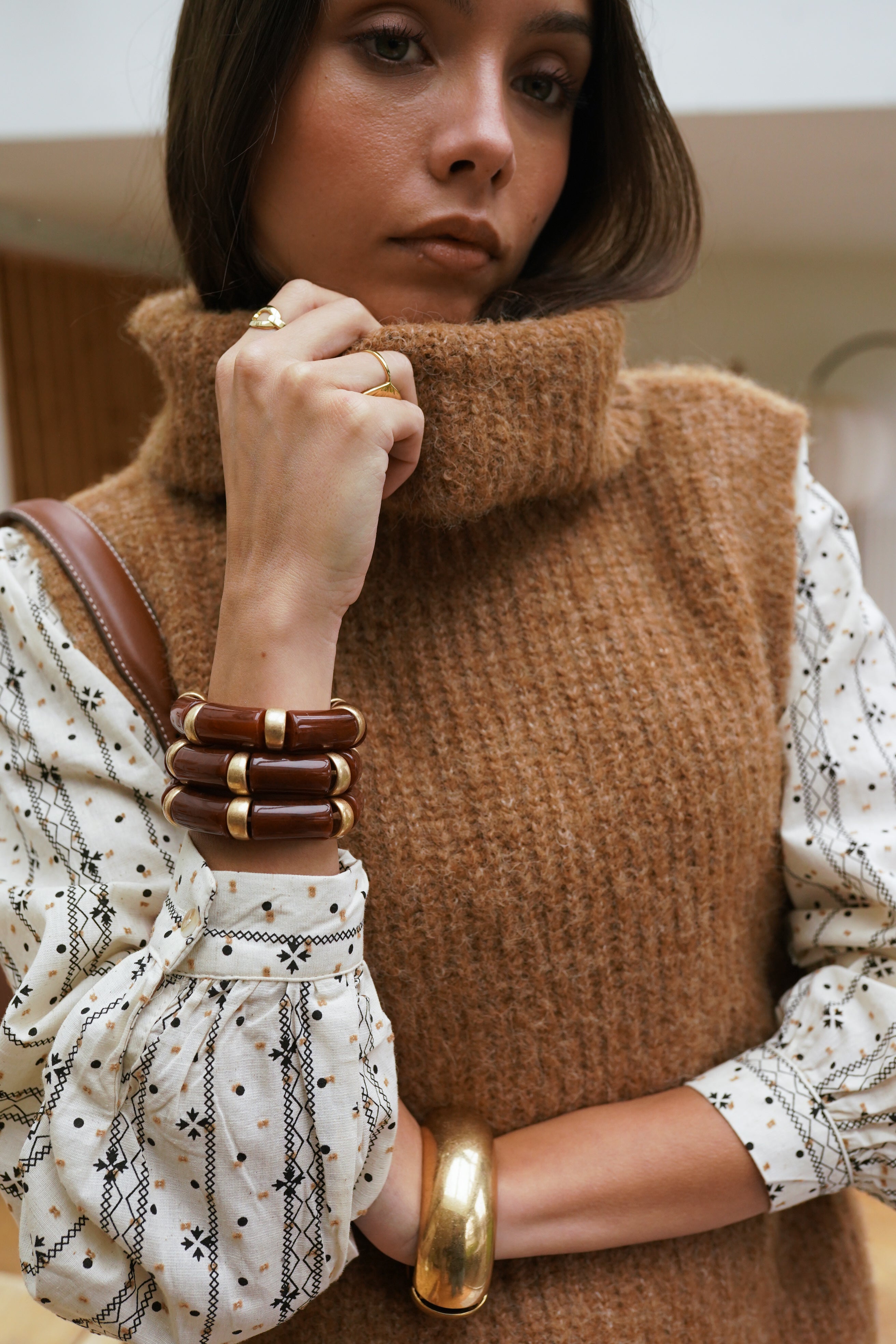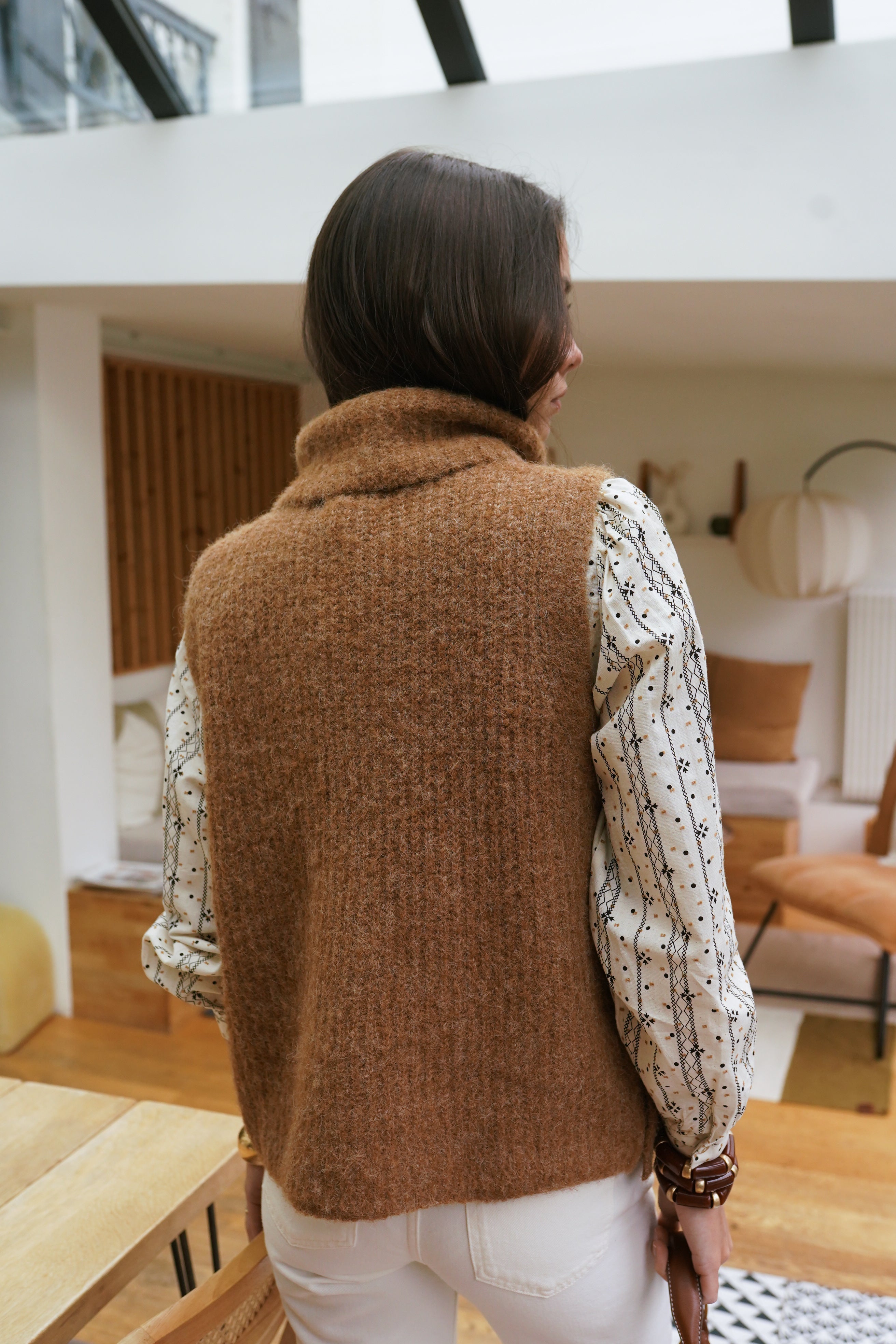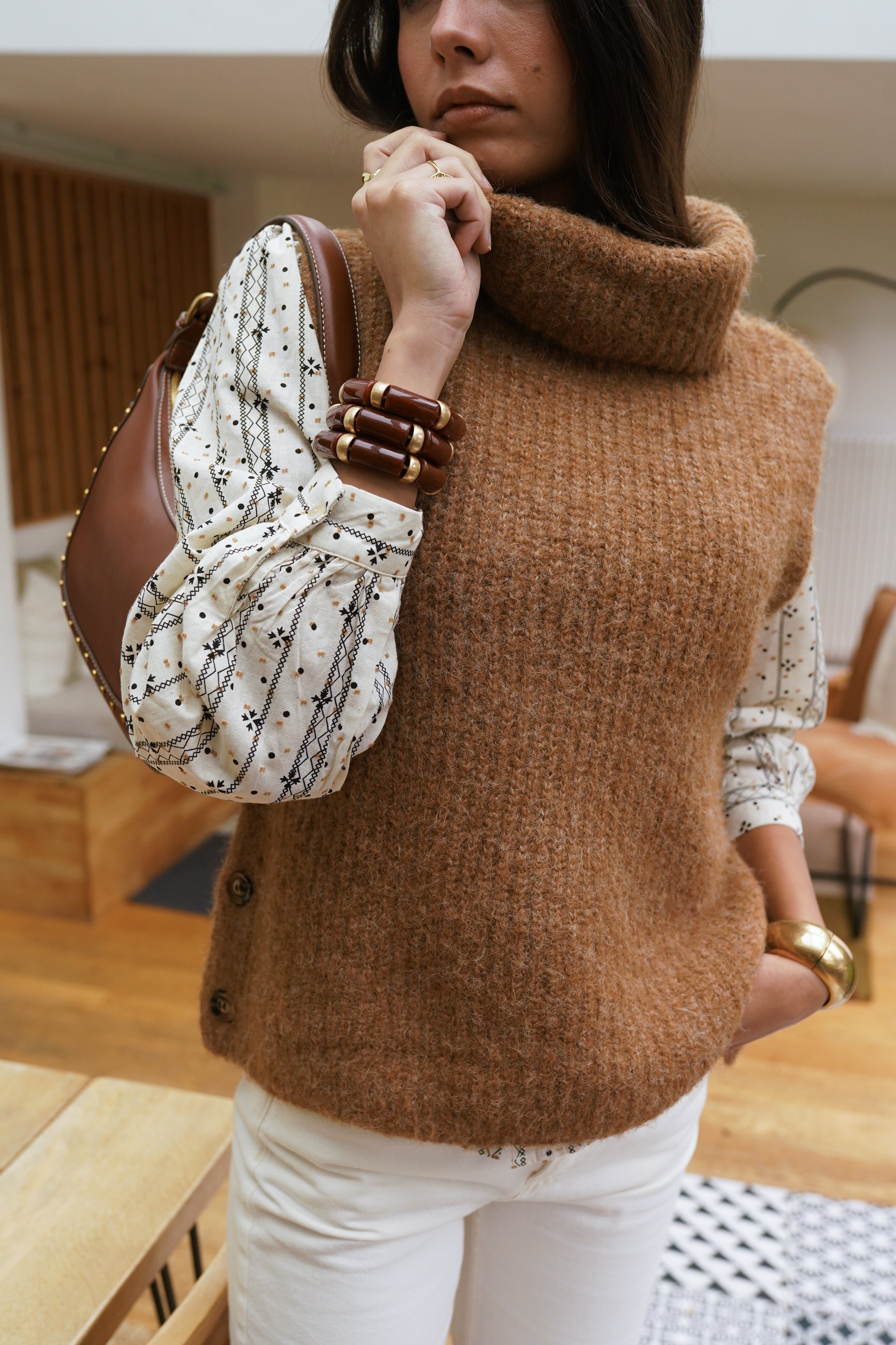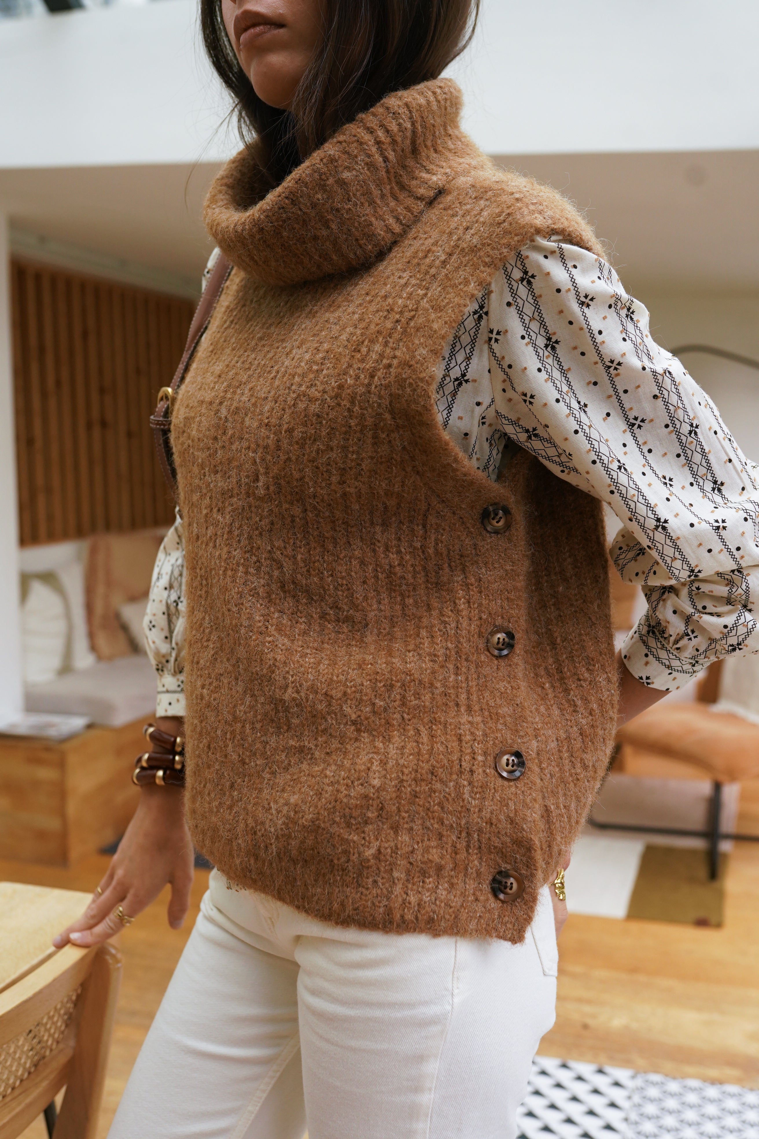 La maille Maïssa s’impose comme une pièce d’automne incontournable. Son col roulé généreux et sa texture moelleuse lui confèrent un charme à la fois chaleureux et moderne. Les boutons sur le côté ajoutent une touche d’originalité, tandis que sa teinte camel s’accorde facilement aux tons neutres de la saison.