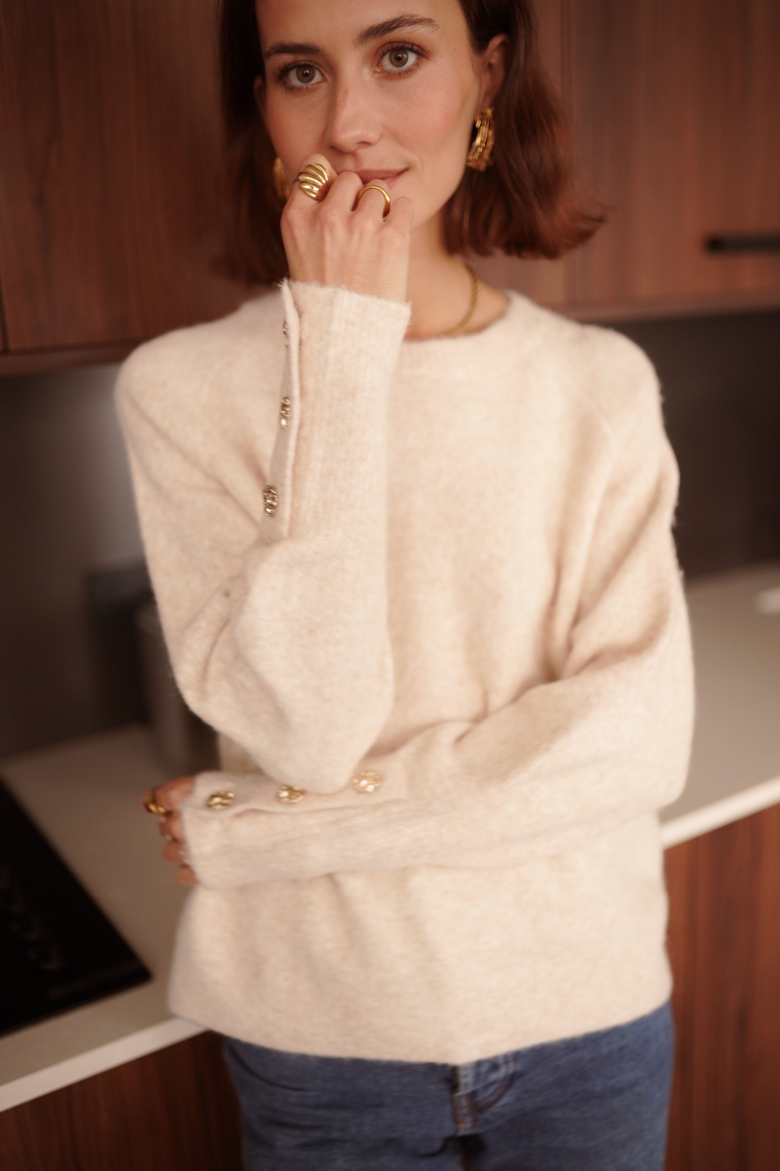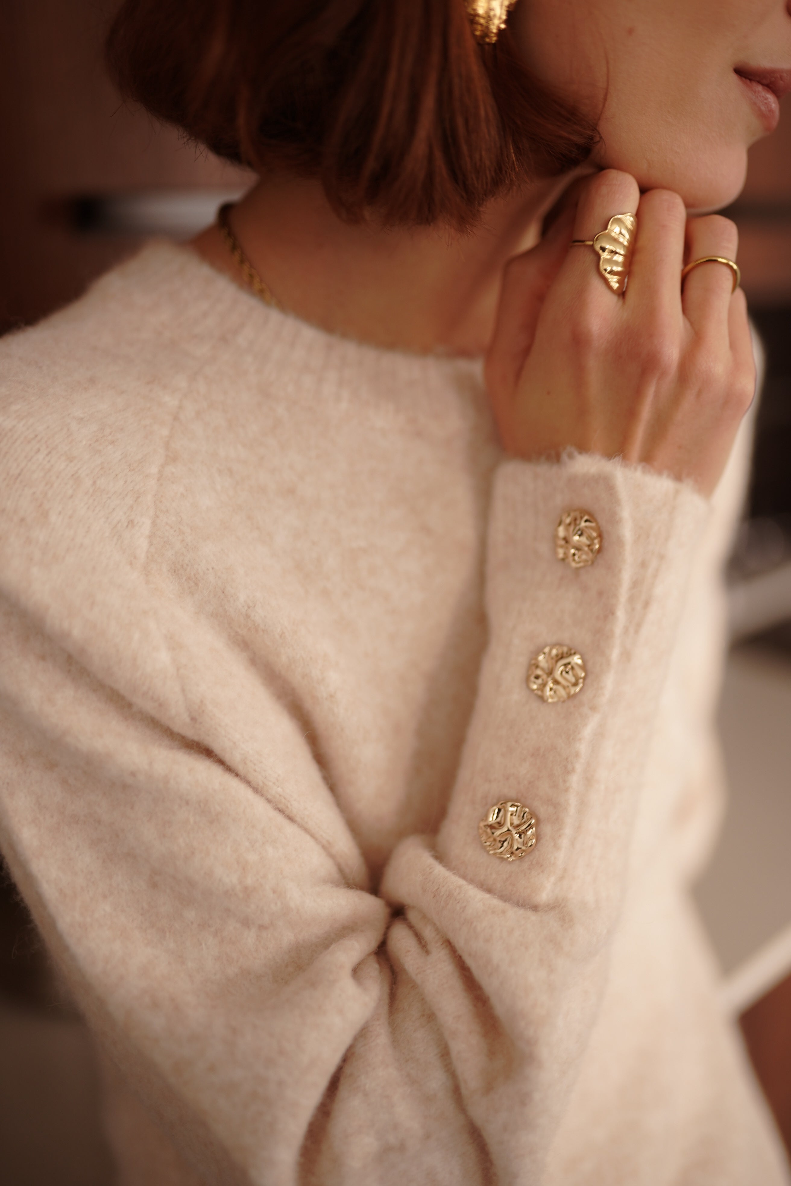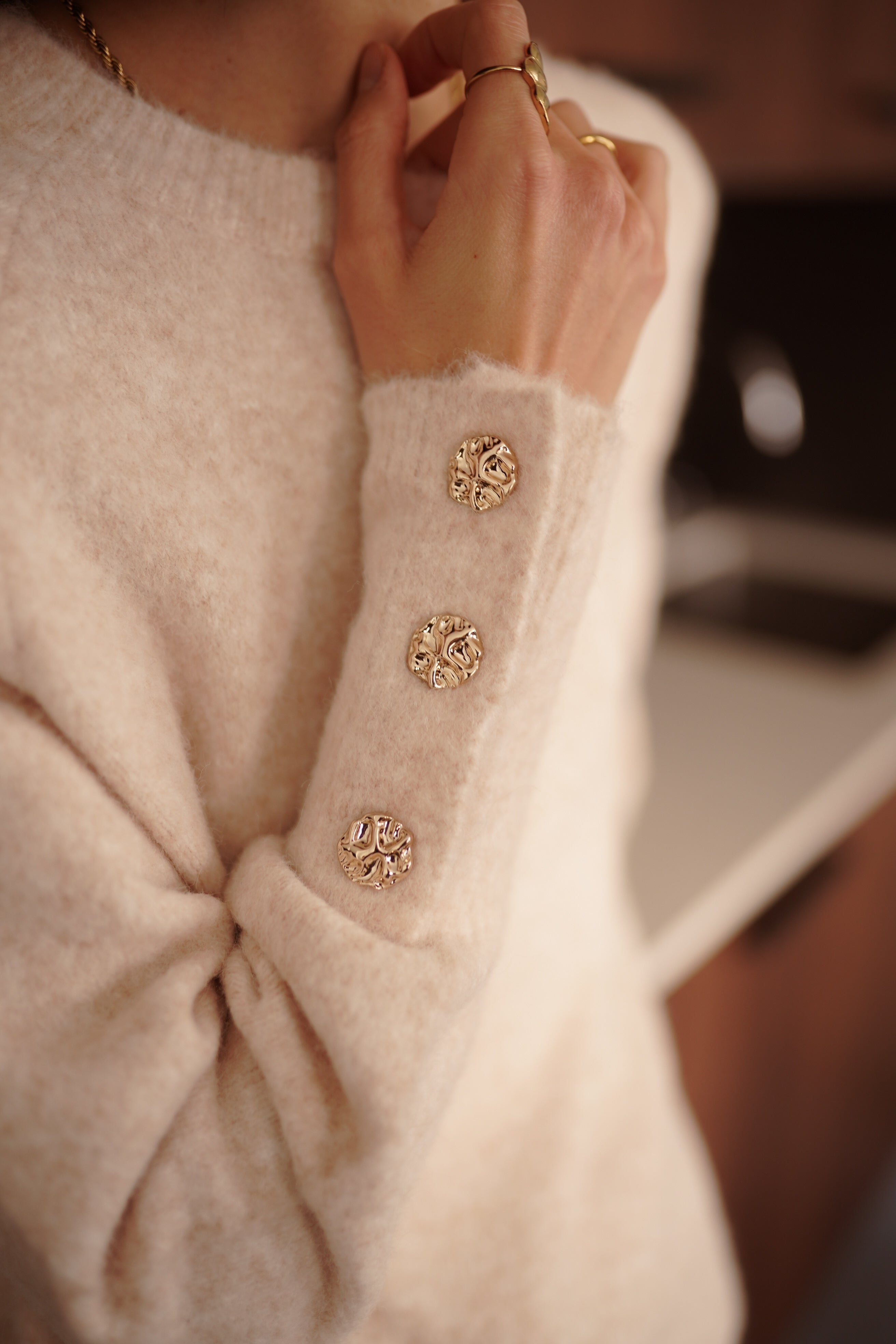 Megane est un pull écru en maille douce, pensé avec une ligne simple et des détails dorés sur les manches.