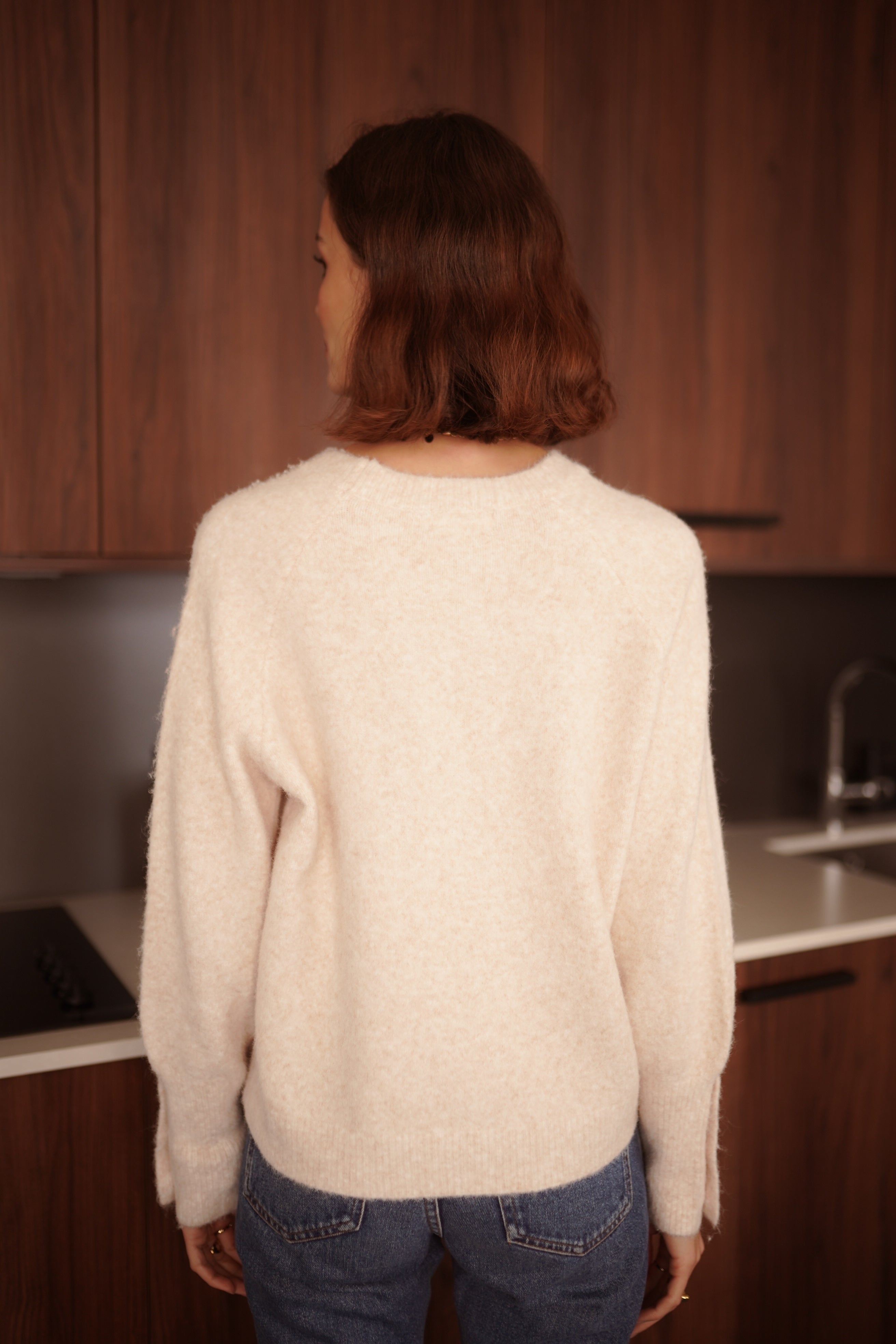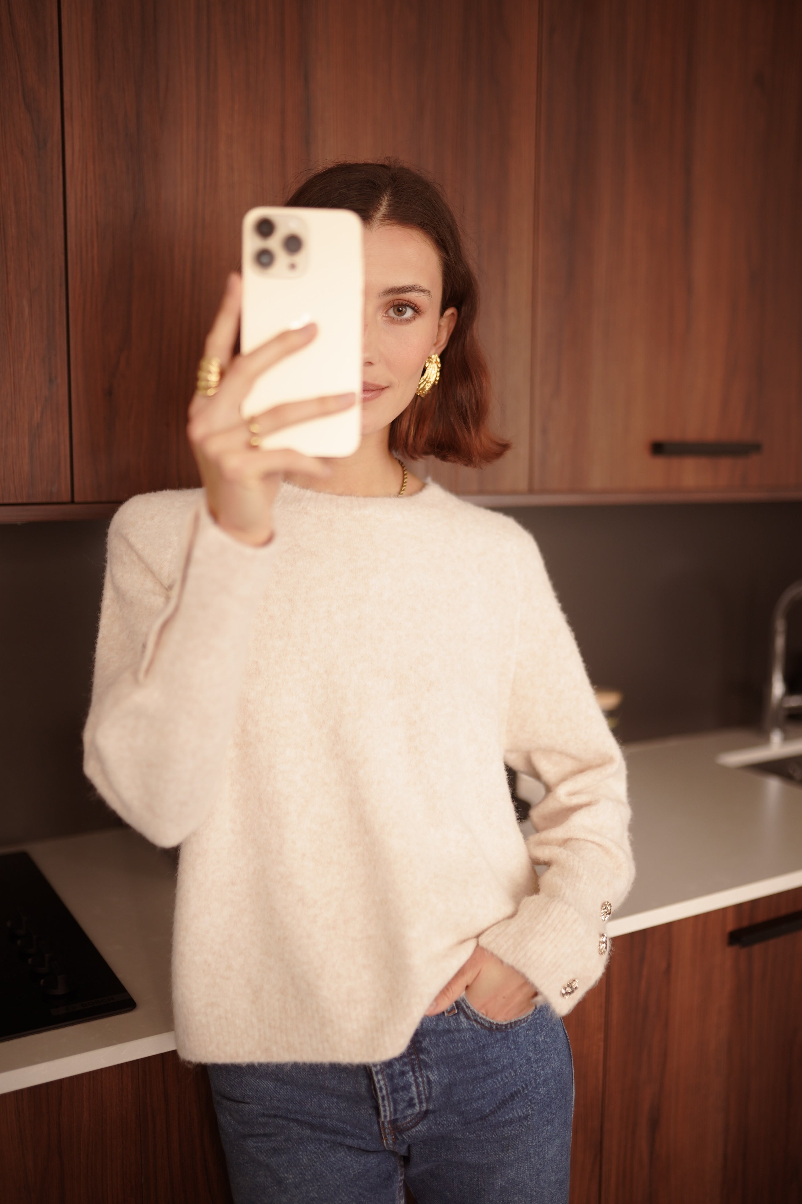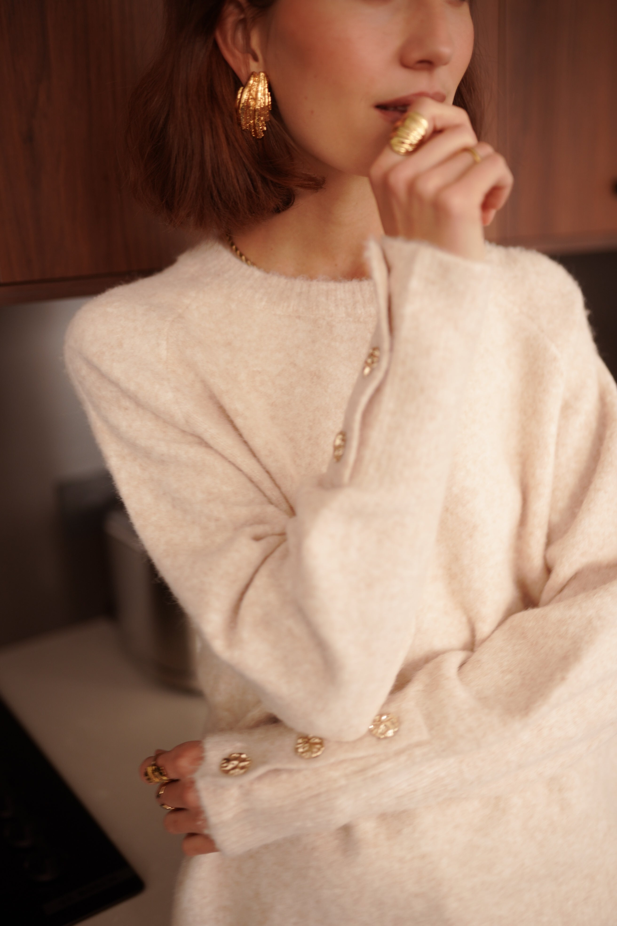 Megane est un pull écru en maille douce, pensé avec une ligne simple et des détails dorés sur les manches.