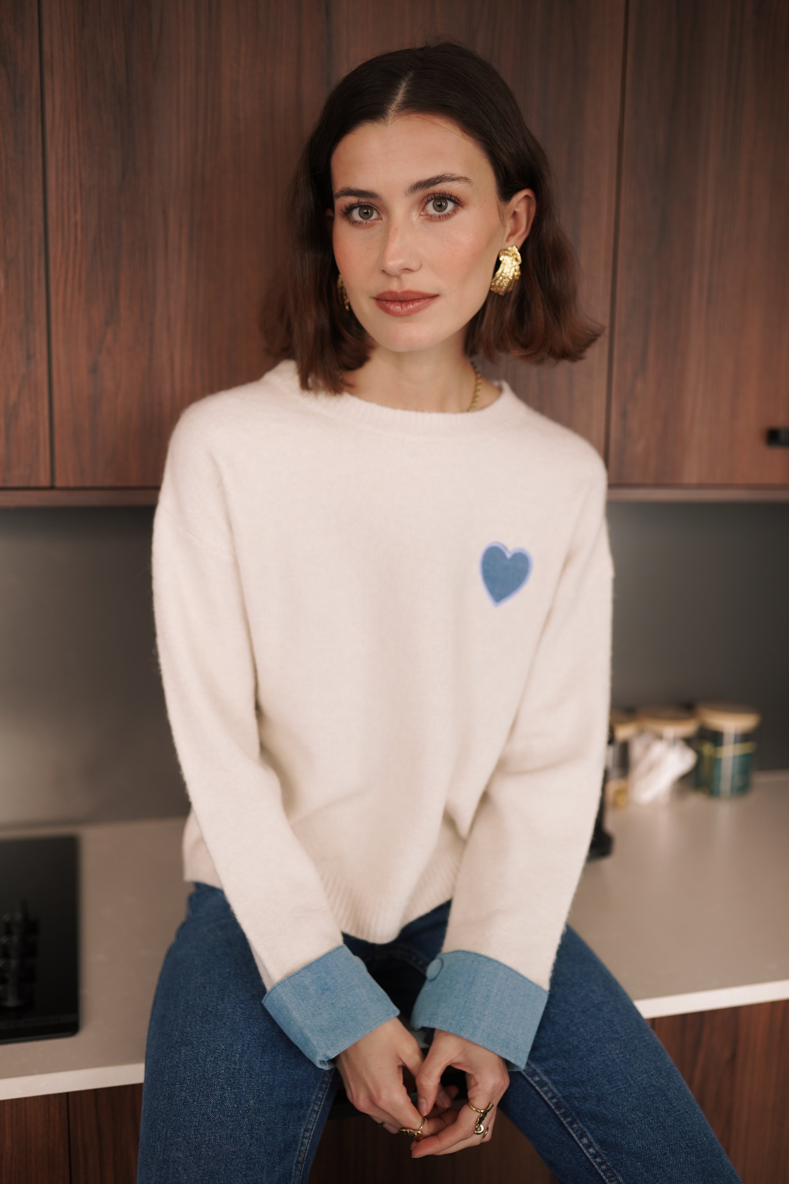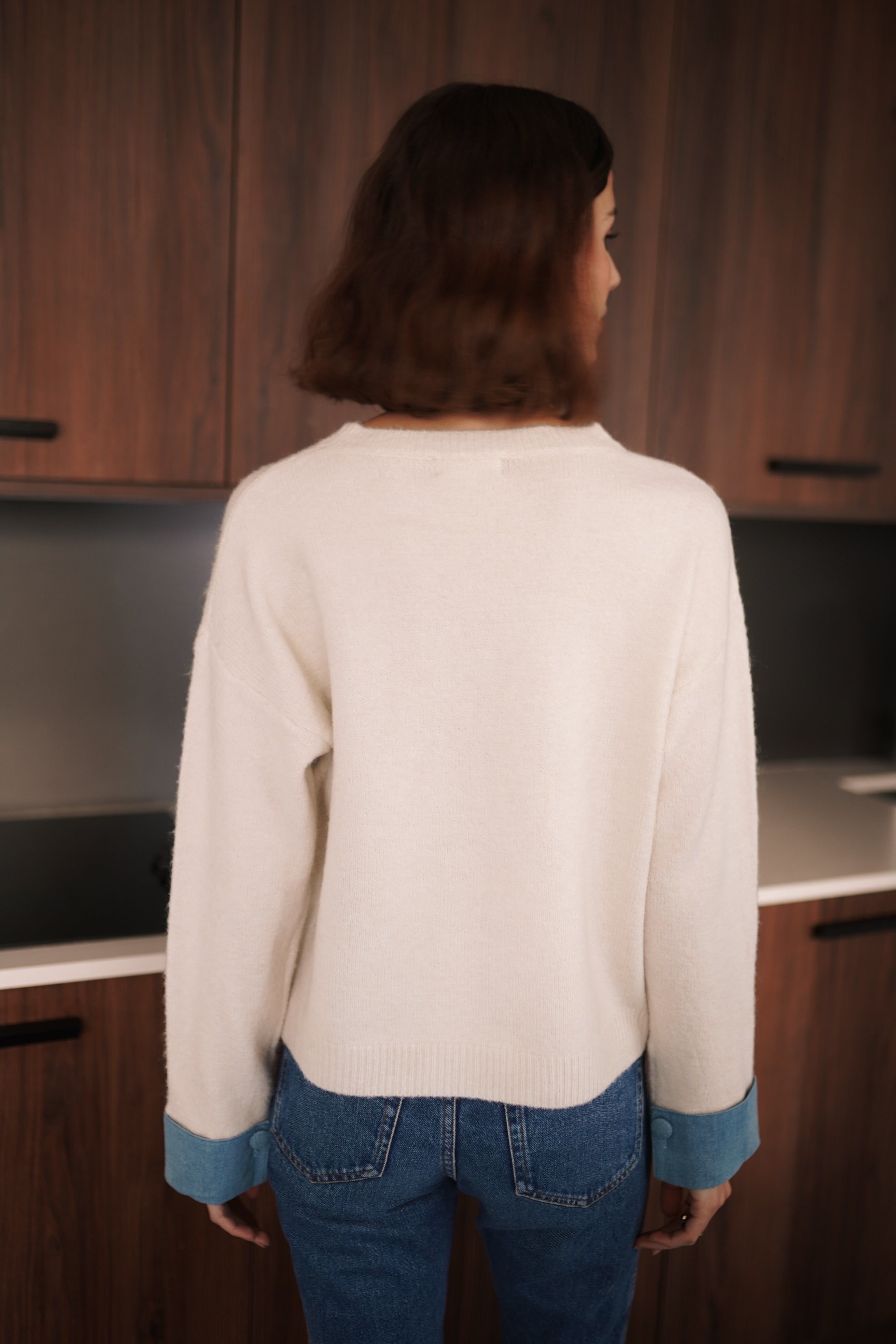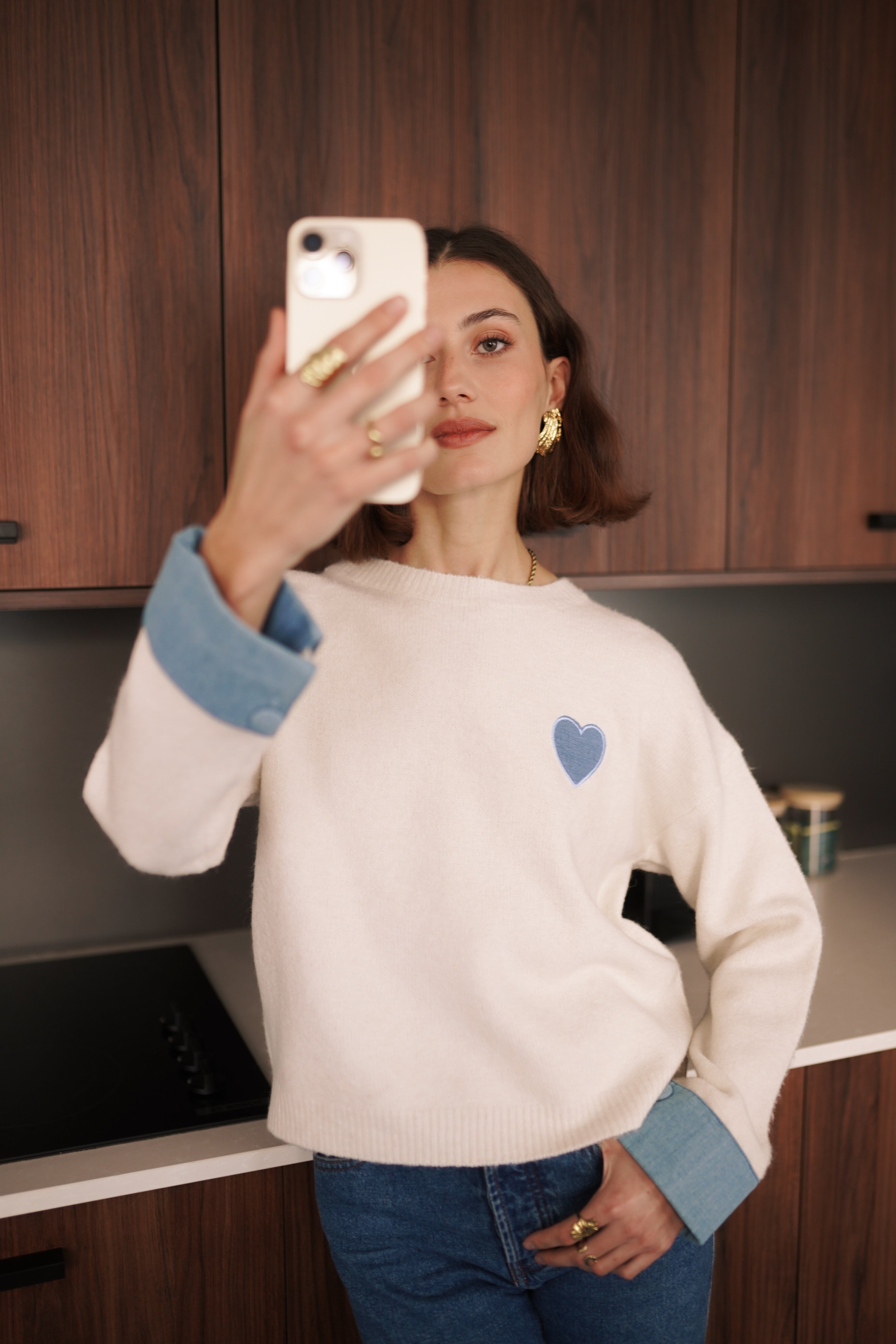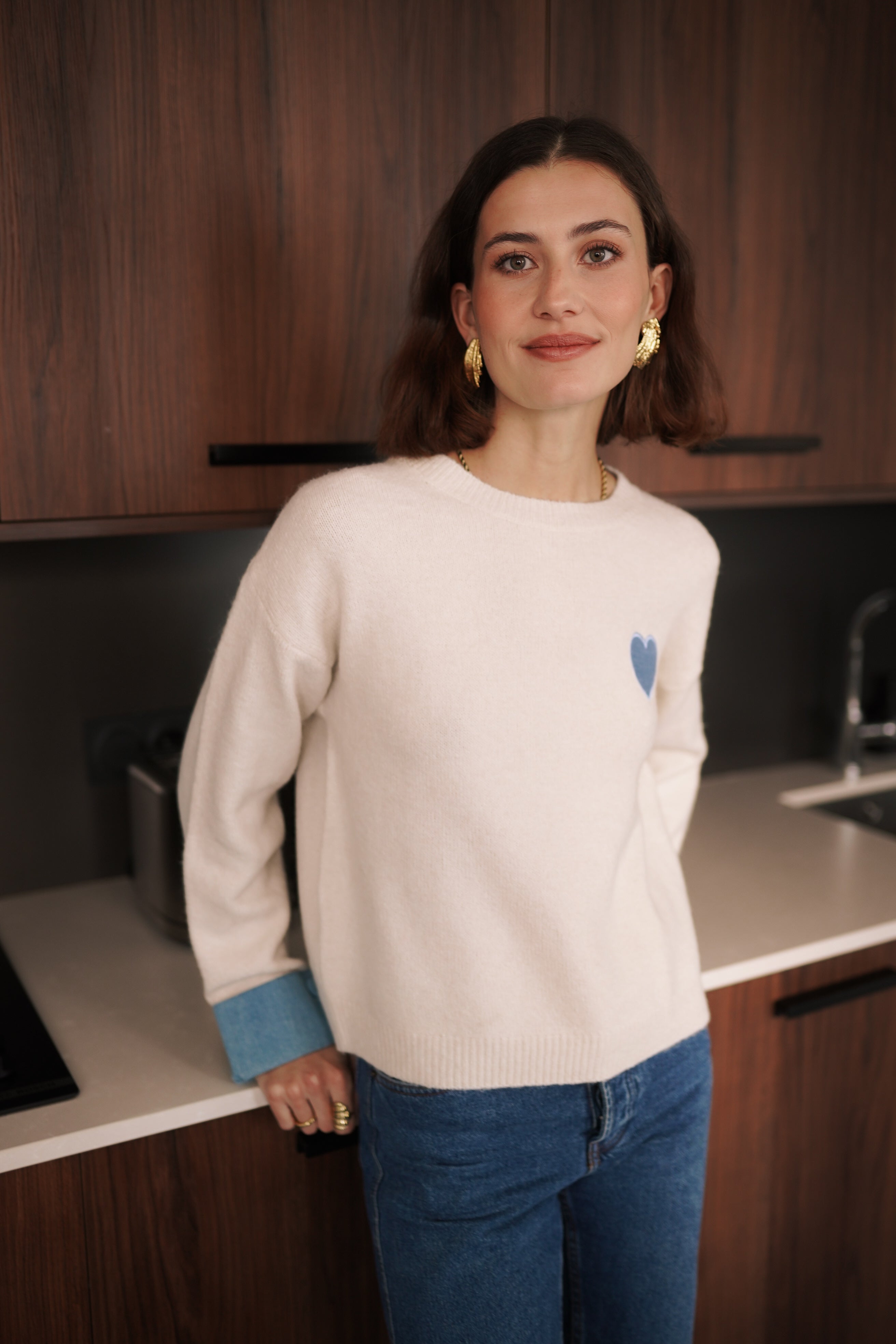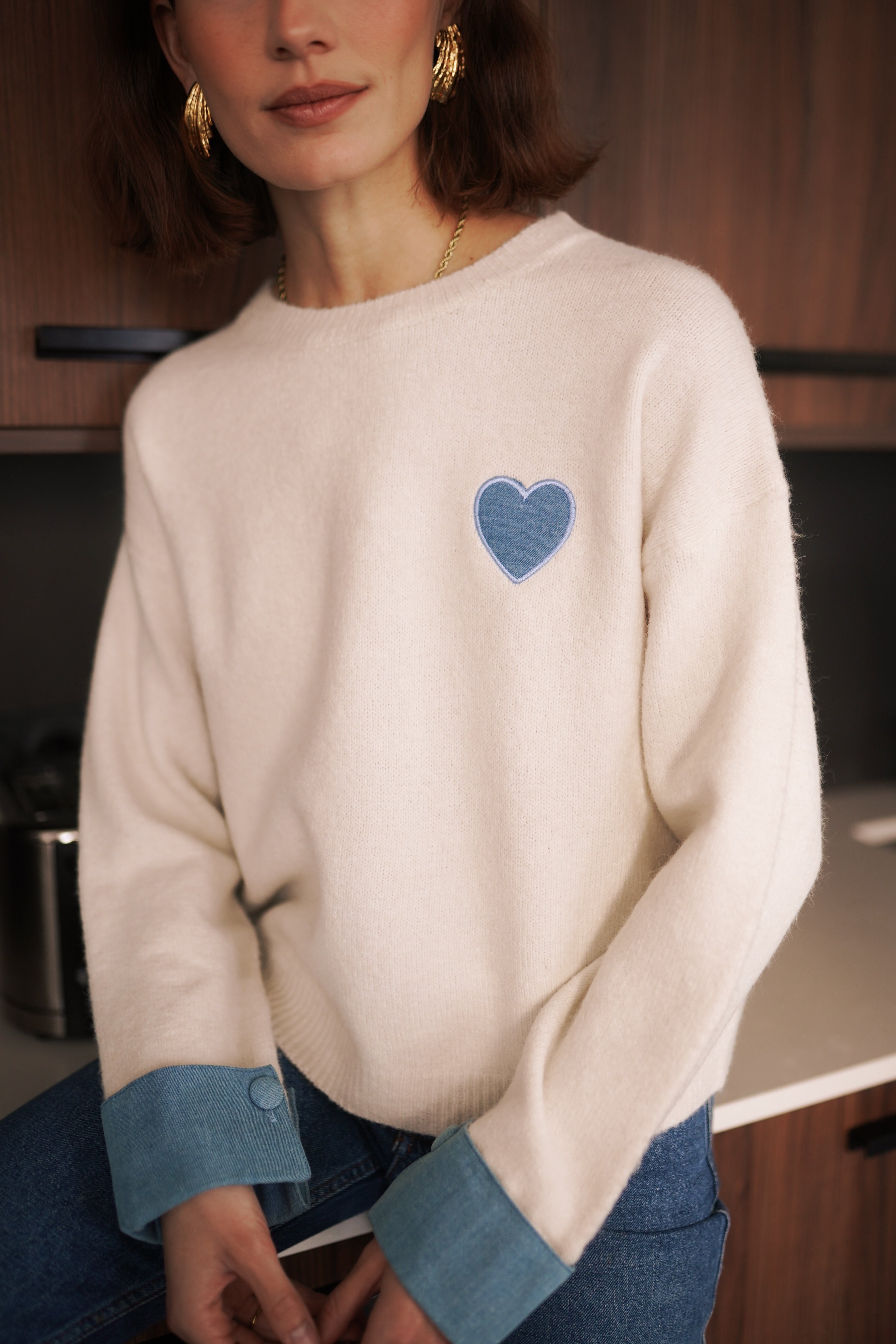 Miko est un pull écru rehaussé de détails en denim pour un contraste net et moderne. Le cœur appliqué et les poignets chemise apportent une touche graphique qui structure la silhouette.