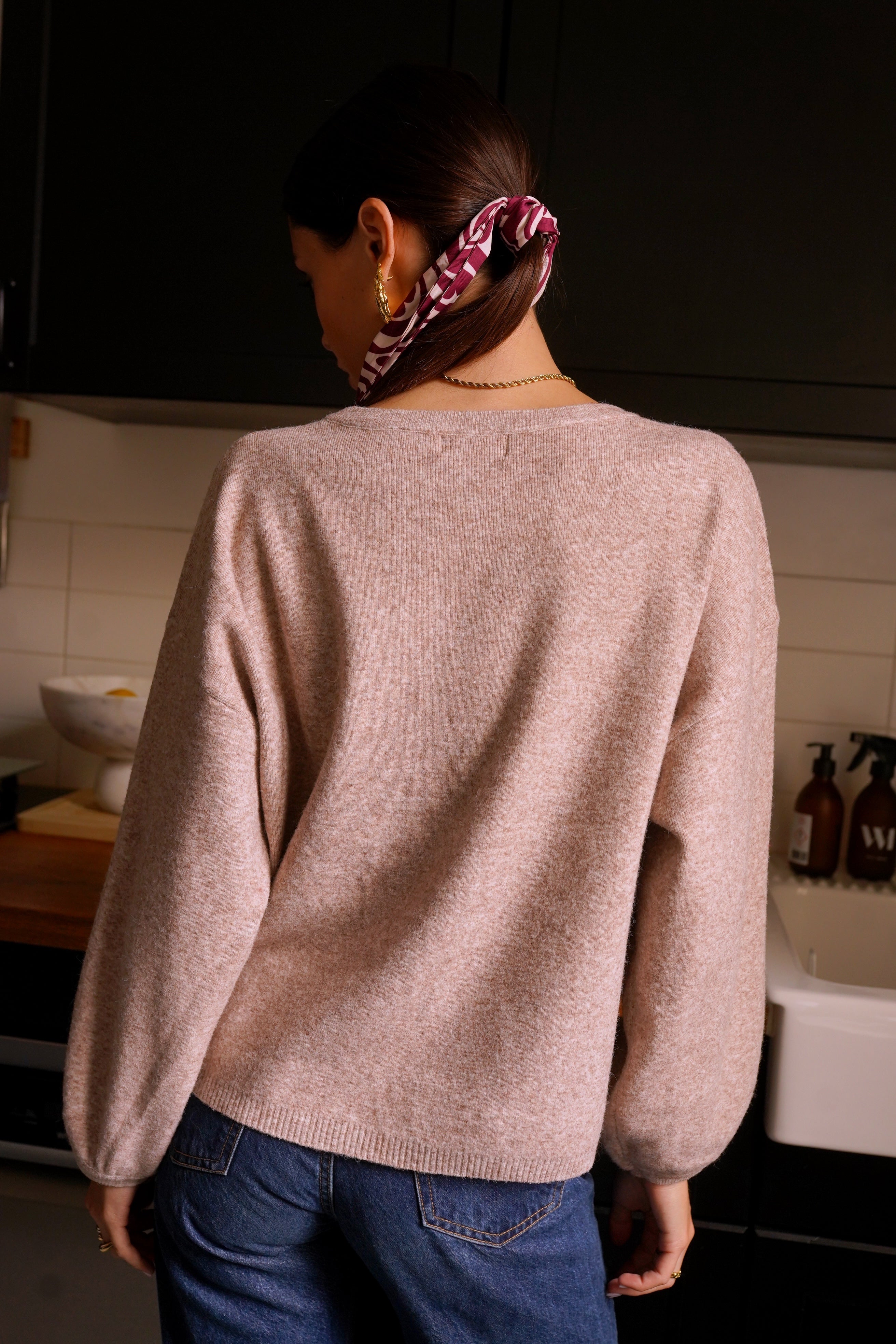 La maille Pypper apporte une touche de modernité à vos looks de saison. Tricotée dans une teinte beige chiné douce et lumineuse, elle se distingue par son encolure ronde prolongée d’une série de liens à nouer sur le devant. Ces détails apportent une note originale et féminine, jouant entre esprit casual et sensualité subtile. Sa coupe droite et ses manches légèrement amples en font une pièce confortable et facile à porter au quotidien.
