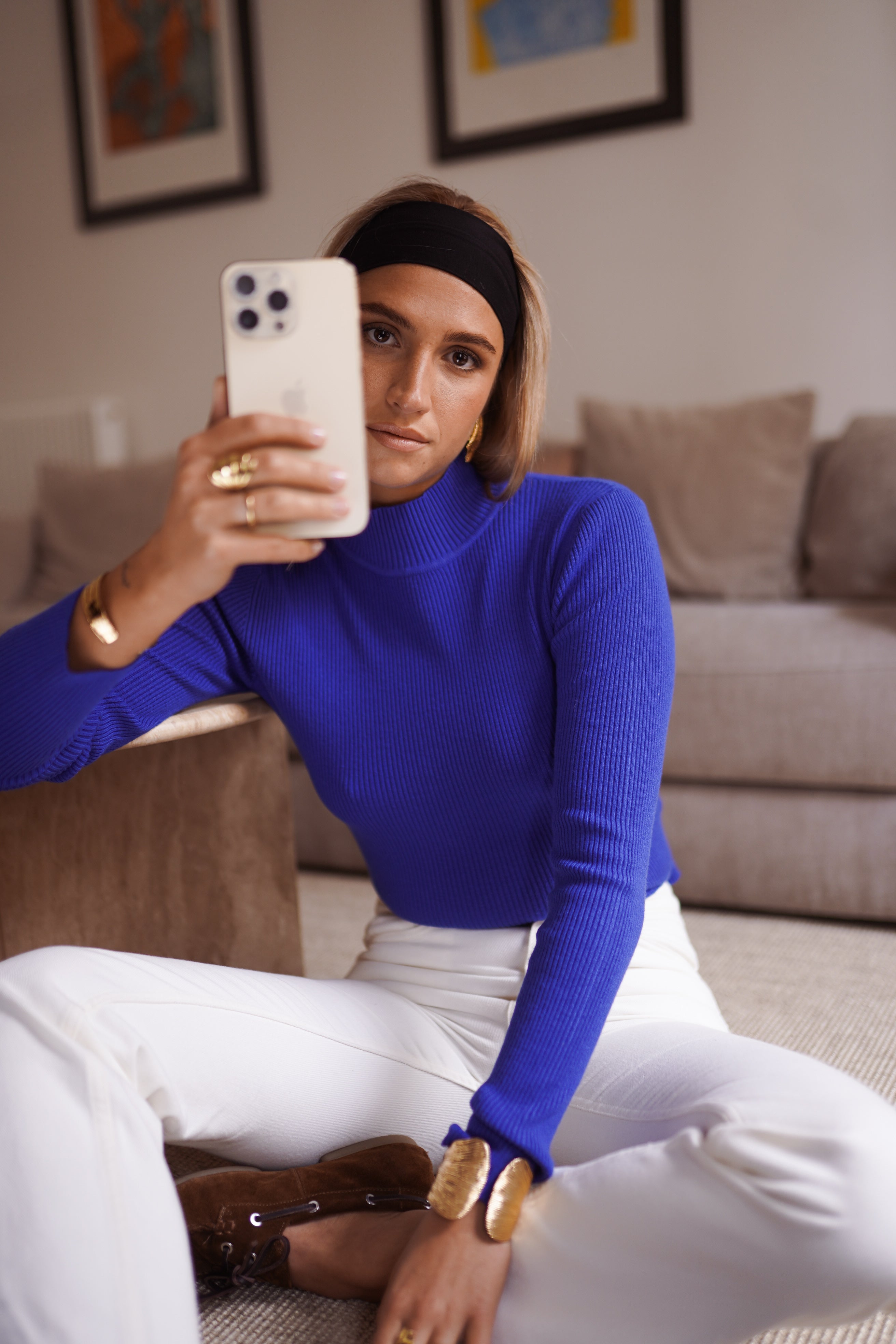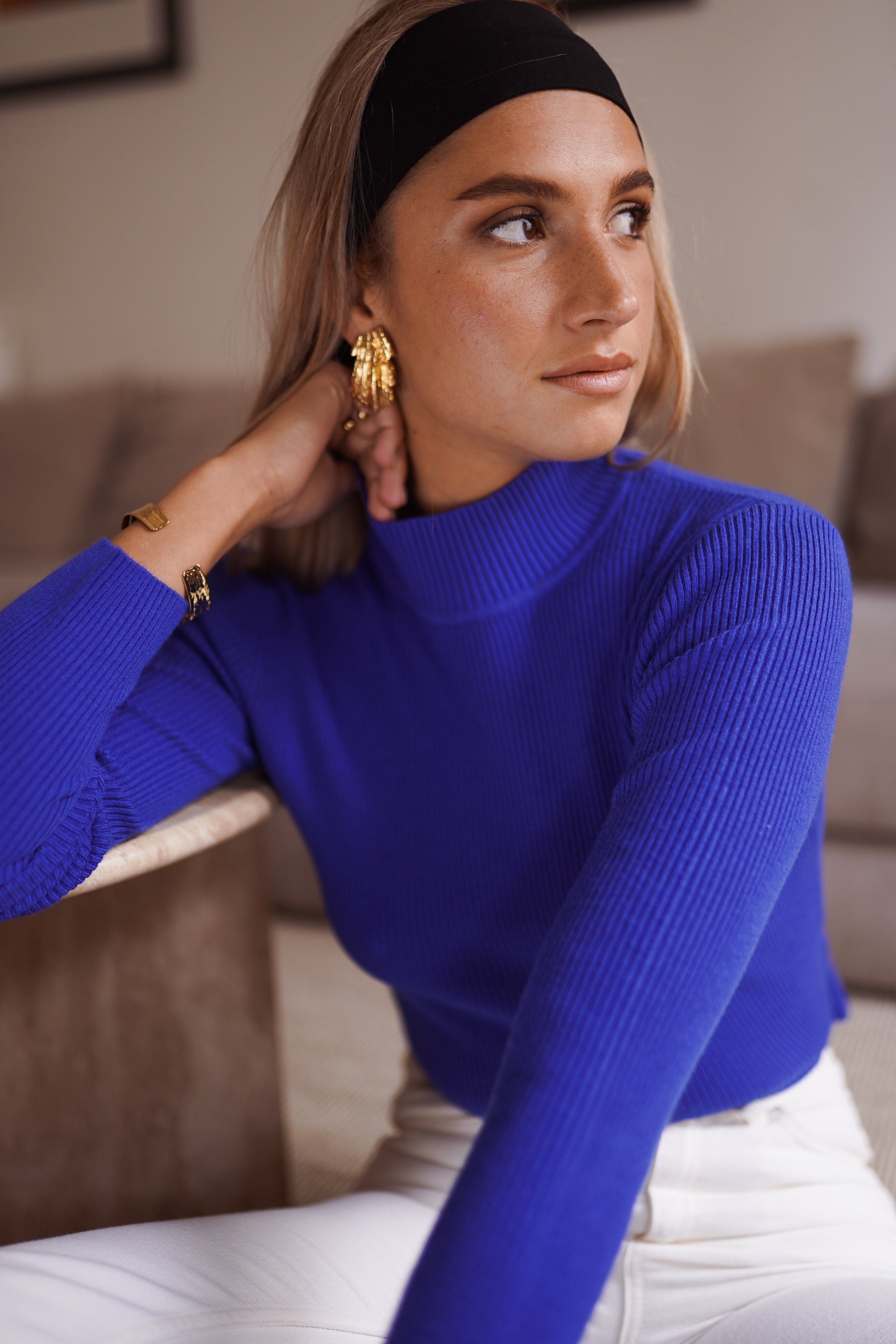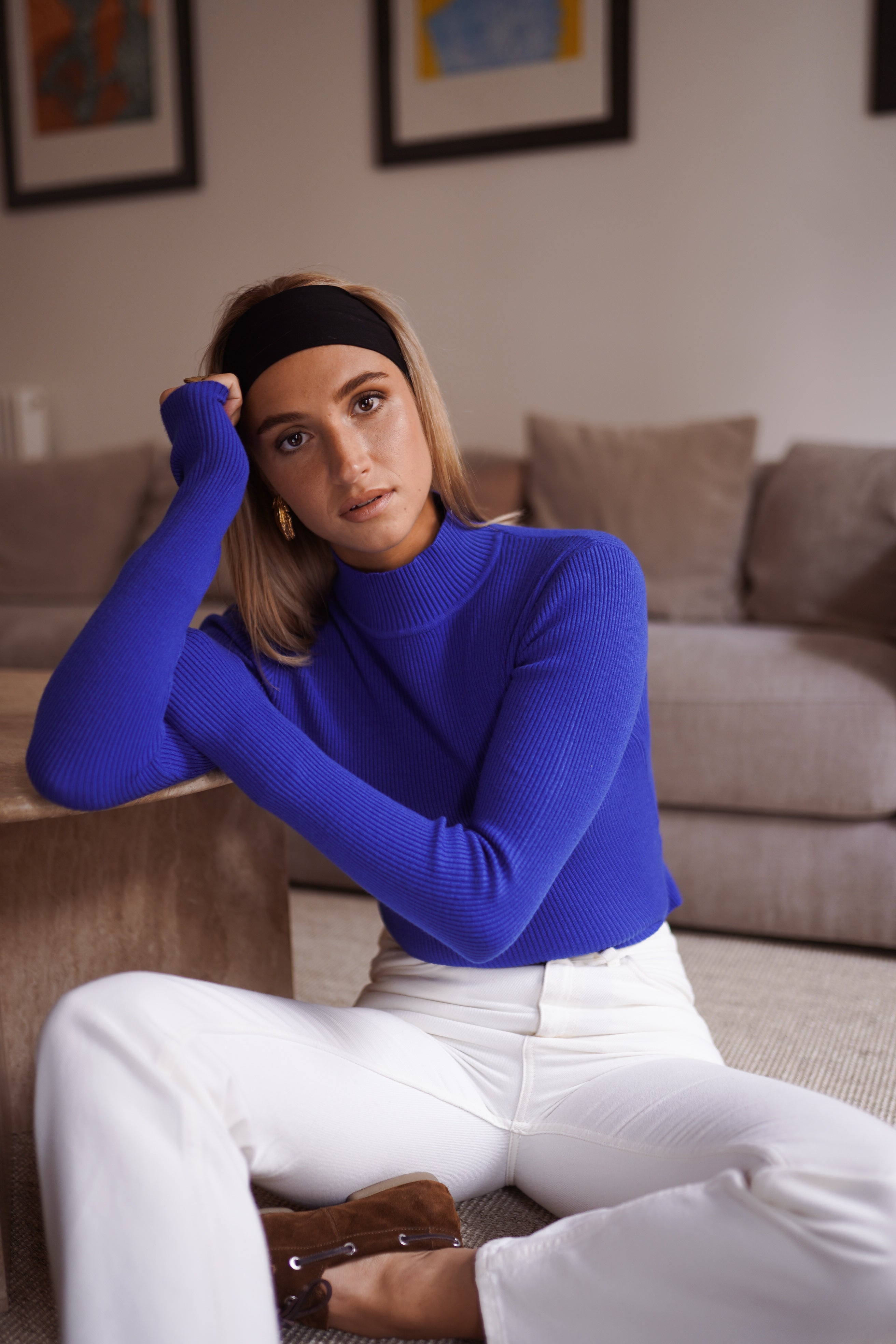 Le top Saphir impose d’emblée son allure : une coupe près du corps, un col montant aux lignes nettes et une maille fine qui épouse la silhouette. Son bleu intense apporte une touche audacieuse, chic et ultra-moderne.