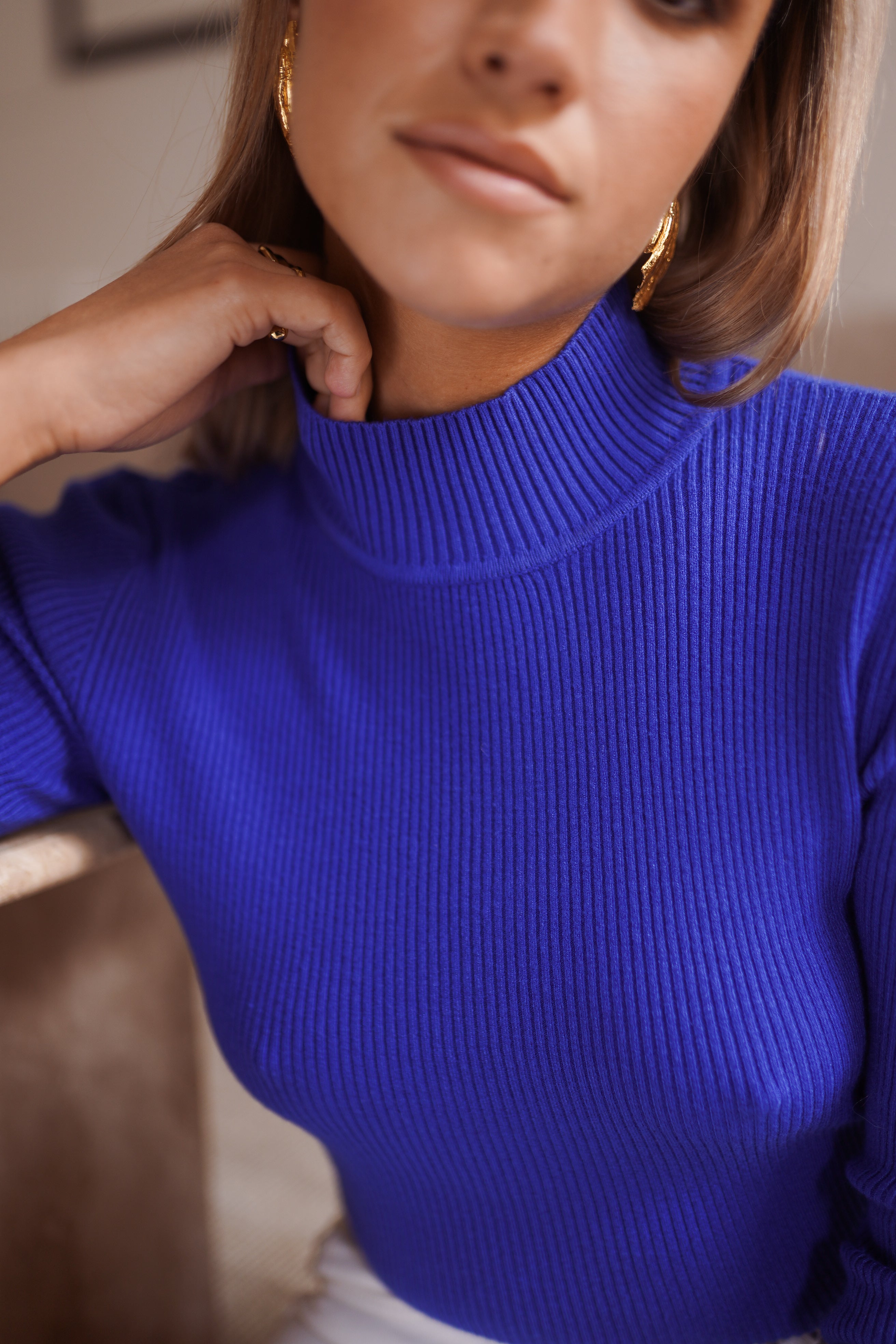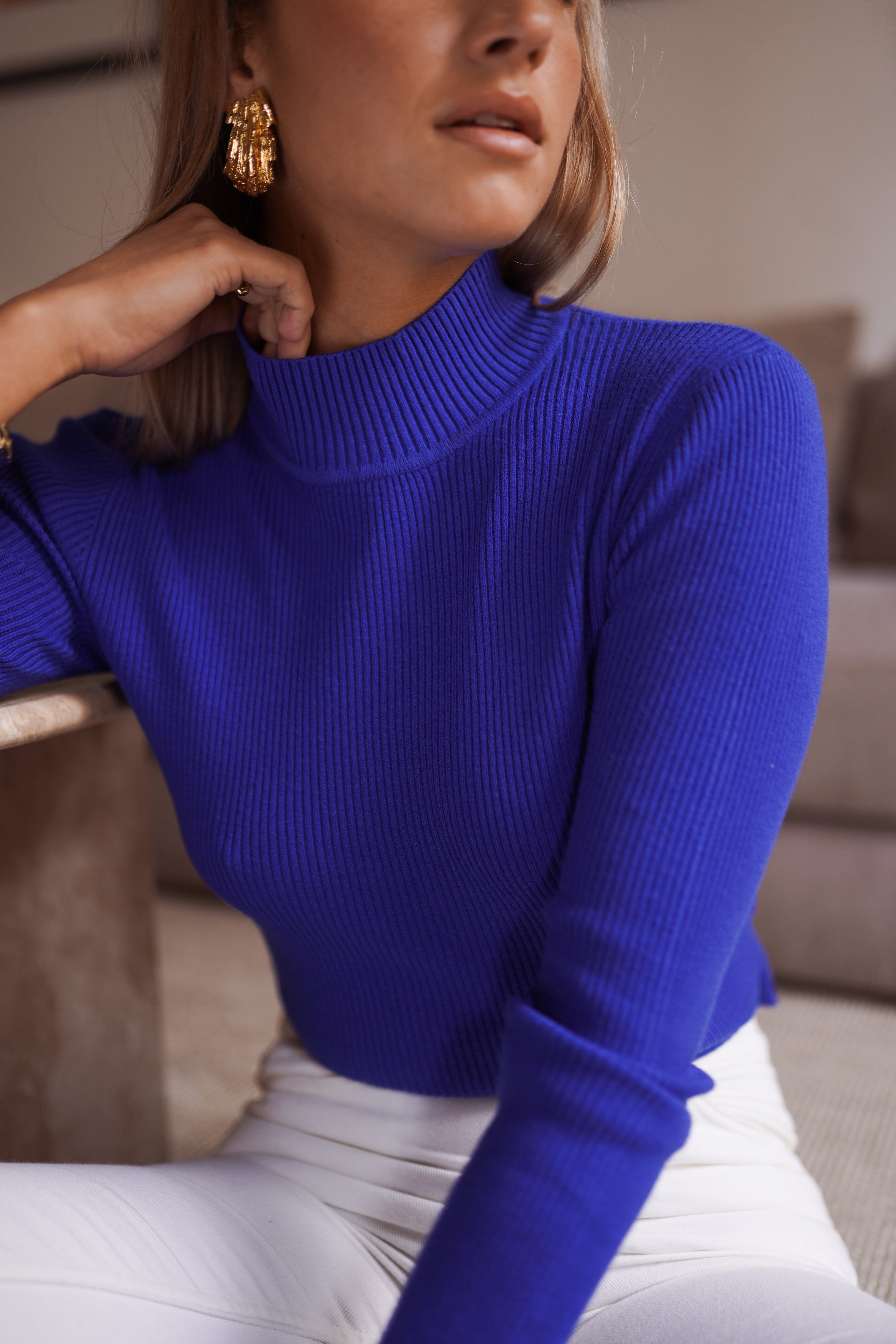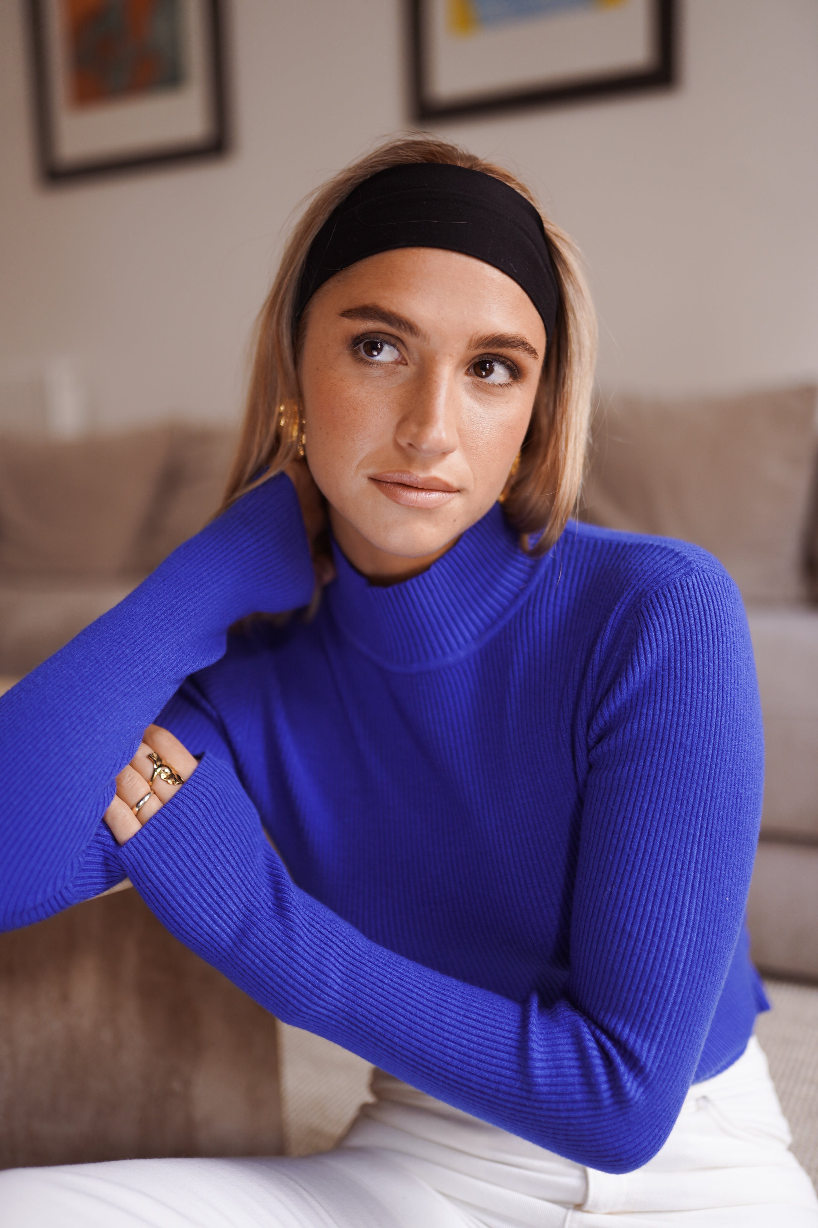 Le top Saphir impose d’emblée son allure : une coupe près du corps, un col montant aux lignes nettes et une maille fine qui épouse la silhouette. Son bleu intense apporte une touche audacieuse, chic et ultra-moderne.