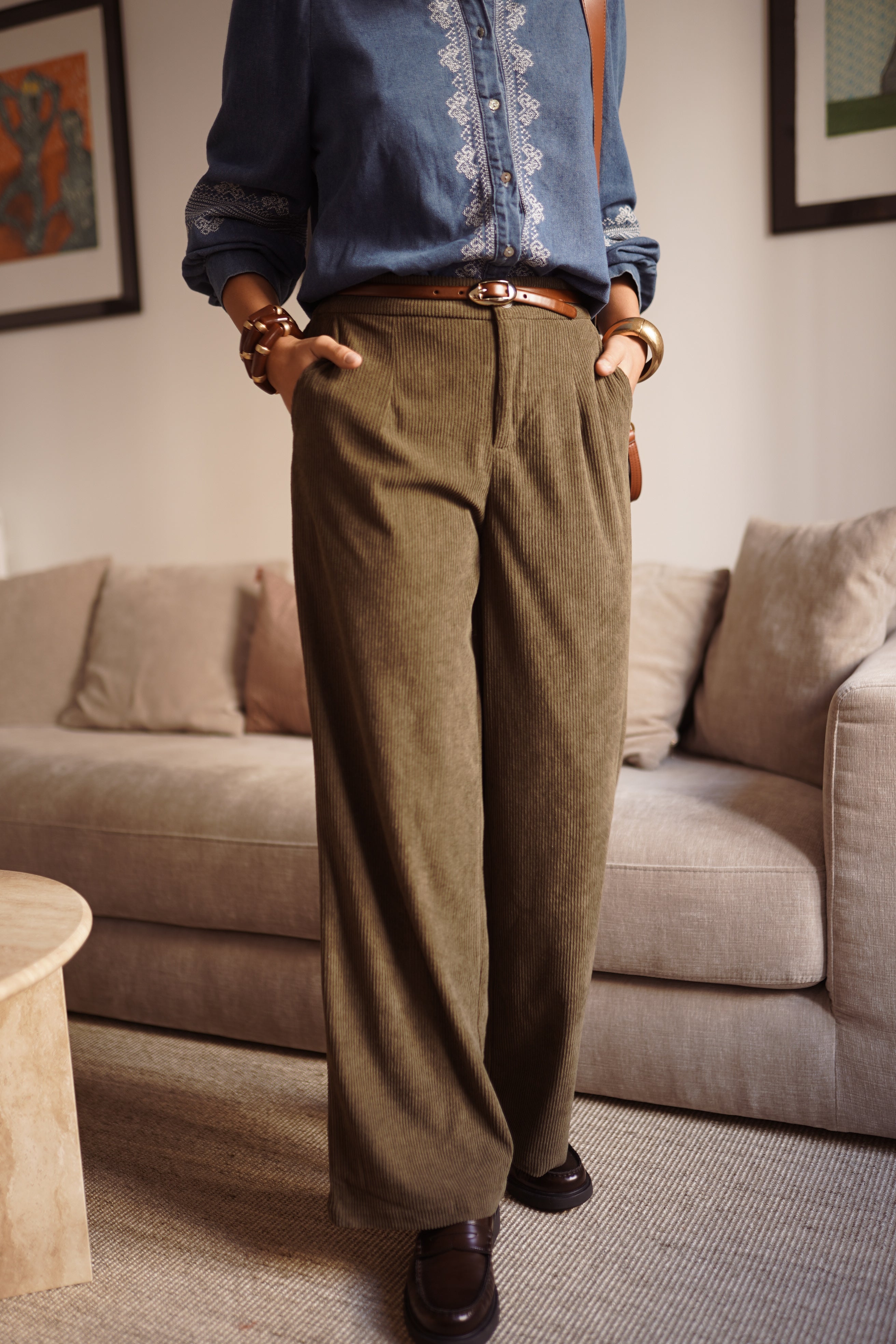 Le pantalon Silvia signe un style affirmé avec son velours côtelé souple et son volume fluide. Taille mi-haute, coupe droite et allure structurée : une pièce forte du vestiaire, facile à porter et vraiment contemporaine.