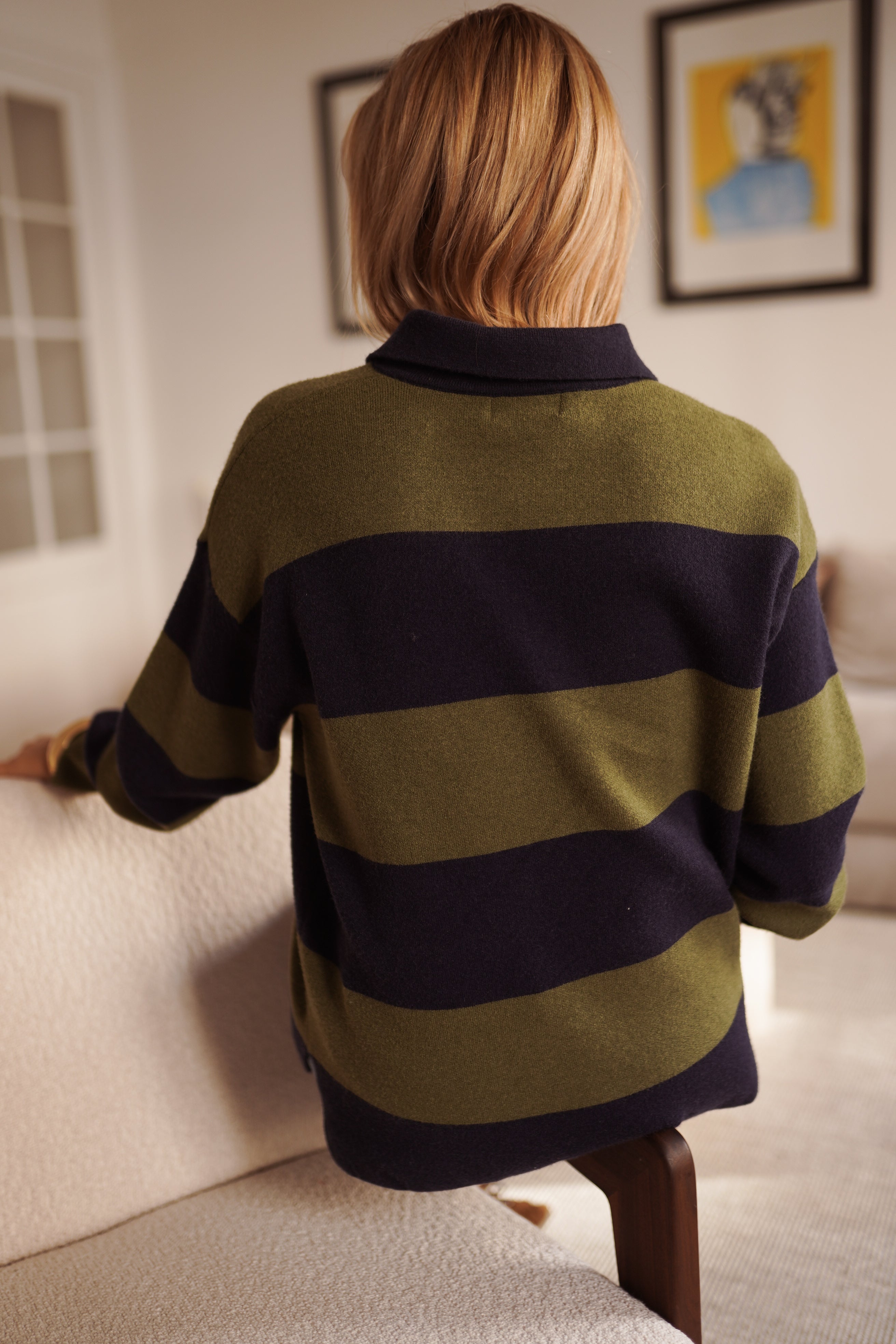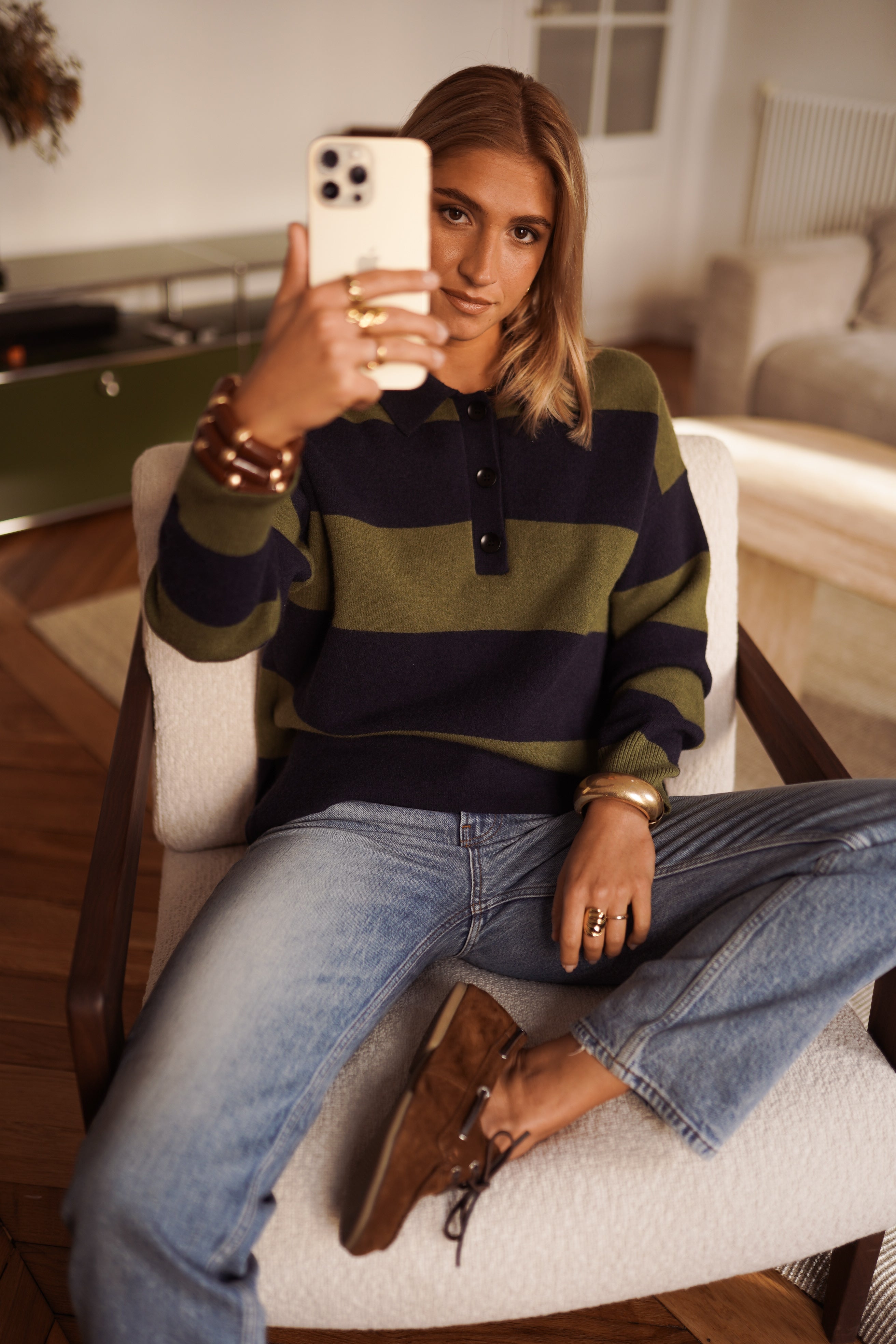 Le polo Félicie apporte une touche sportswear chic à la saison. Ses larges rayures contrastées et son col boutonné lui donnent une allure affirmée, facile à porter au quotidien.