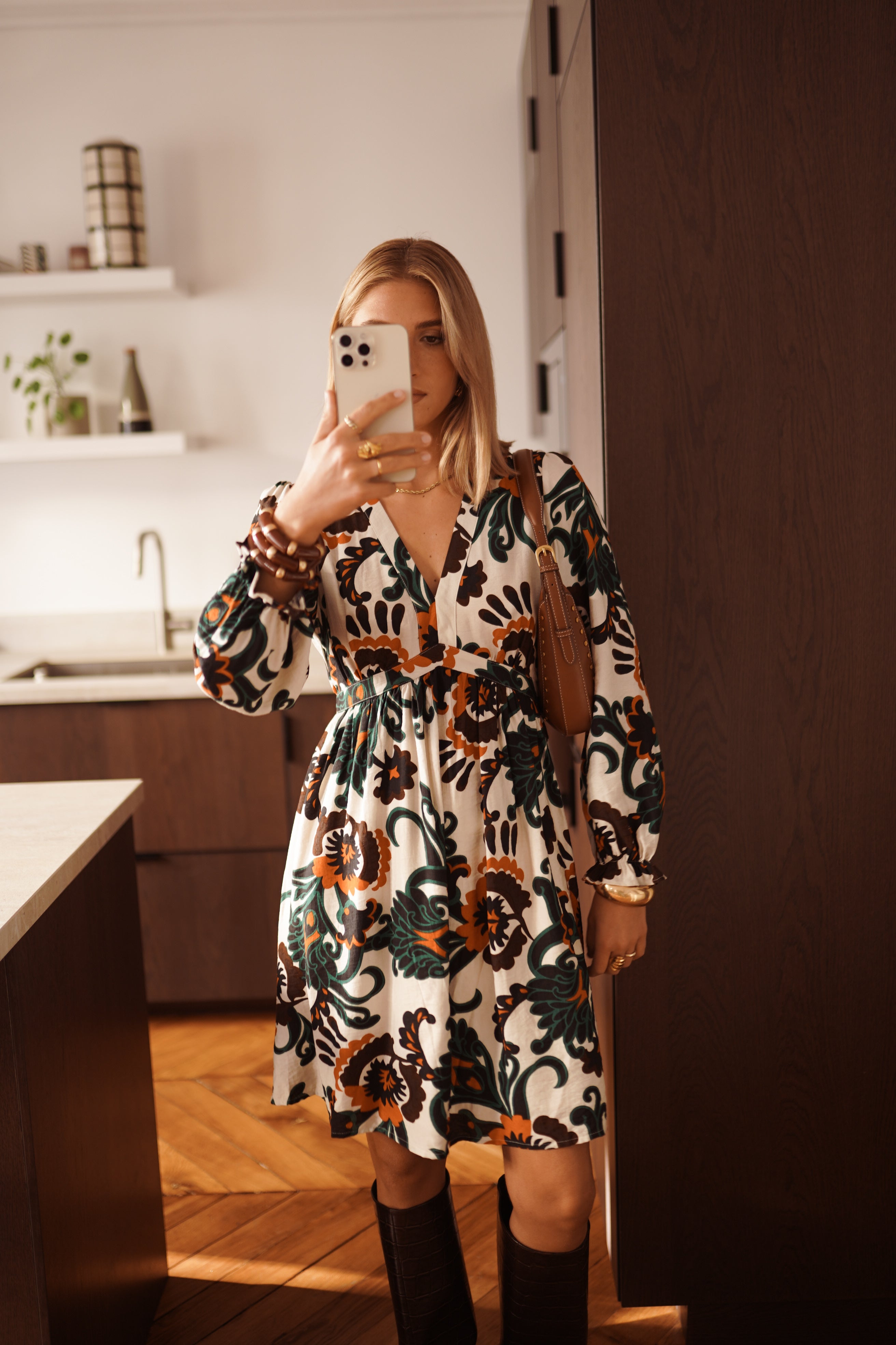 La robe Marley mise sur un imprimé graphique fort, visuel, mais parfaitement équilibré. Sa coupe fluide et son décolleté croisé tempèrent le motif et donnent une allure moderne.