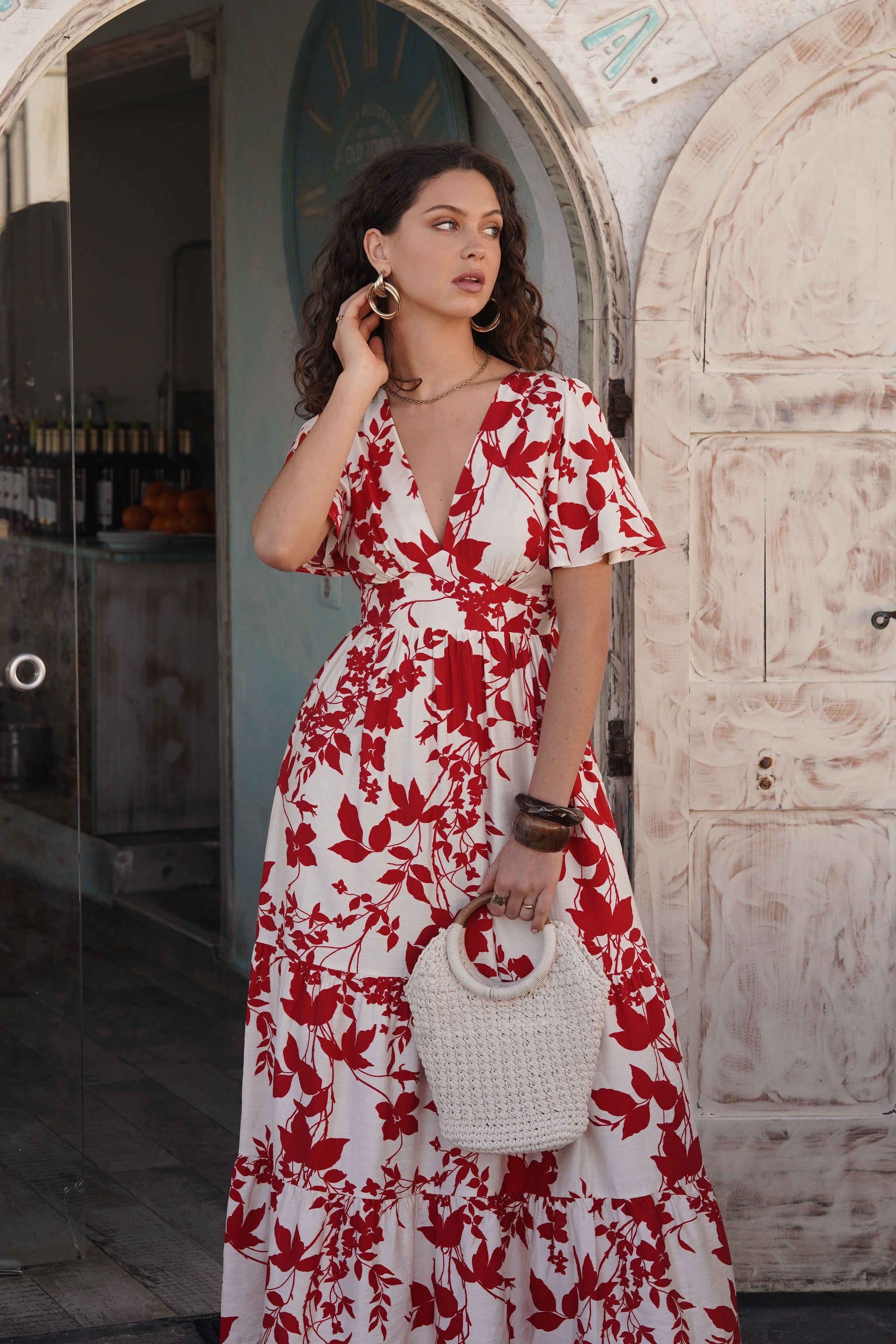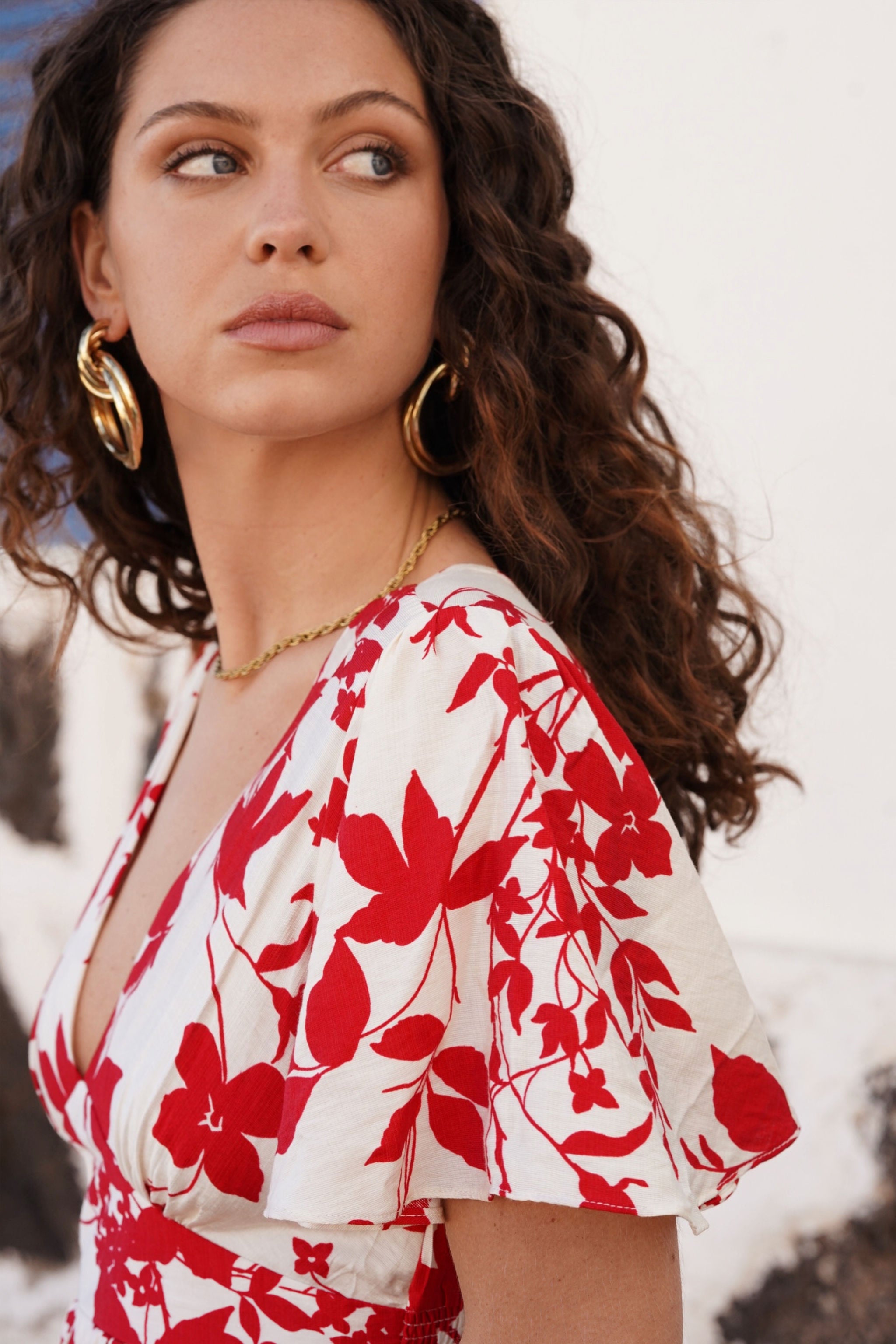 Elasticated waist, V-neckline, short butterfly sleeves, magnificent open back and the perfect ally for your summer weddings!