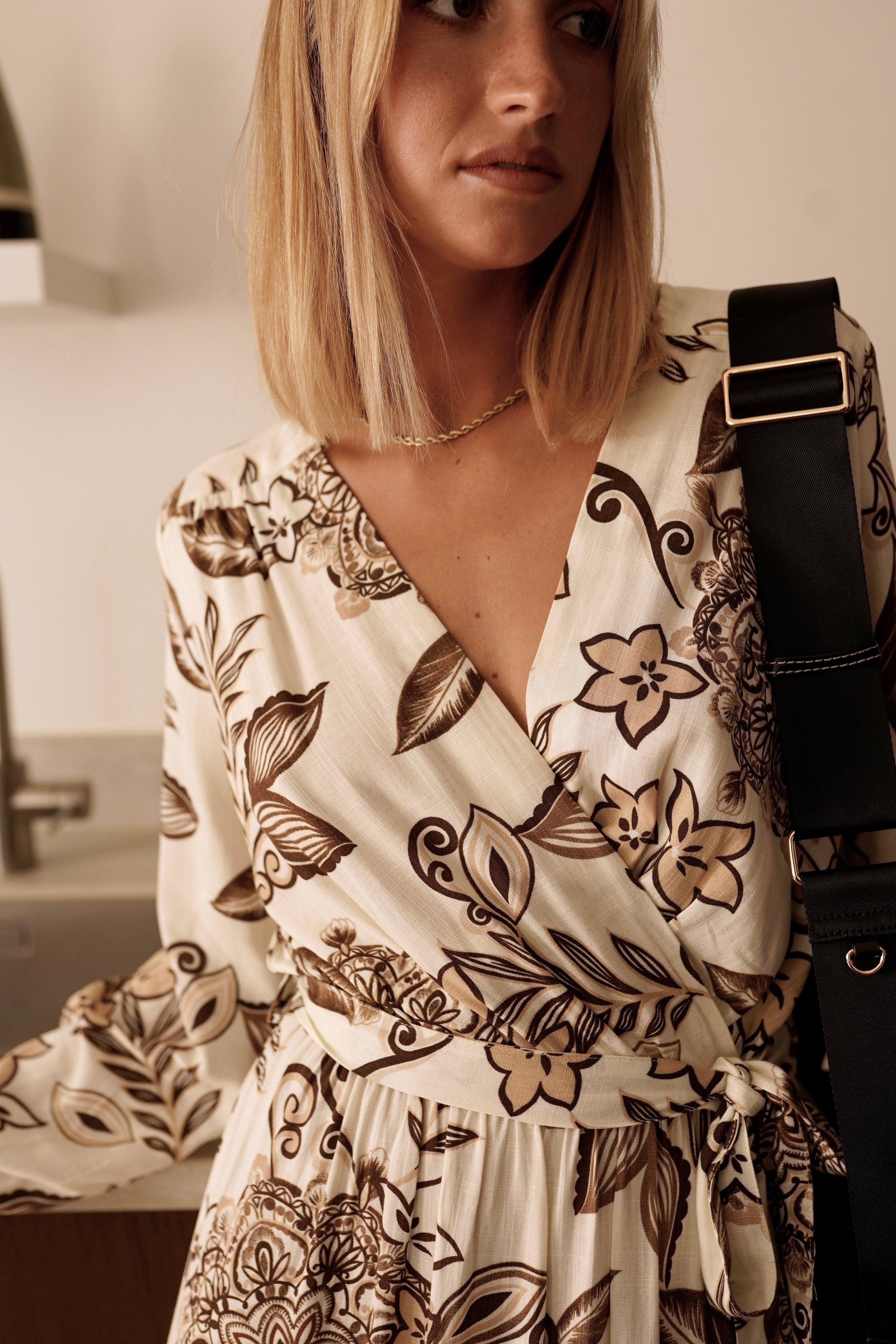 La robe fluide Jolinne sublime l’allure avec son imprimé floral dans des tons doux de beige et brun. Cette robe longue portefeuille souligne la silhouette avec élégance. Son lien à nouer à la taille et son tombé fluide en font une pièce féminine et confortable, idéale en toute saison.