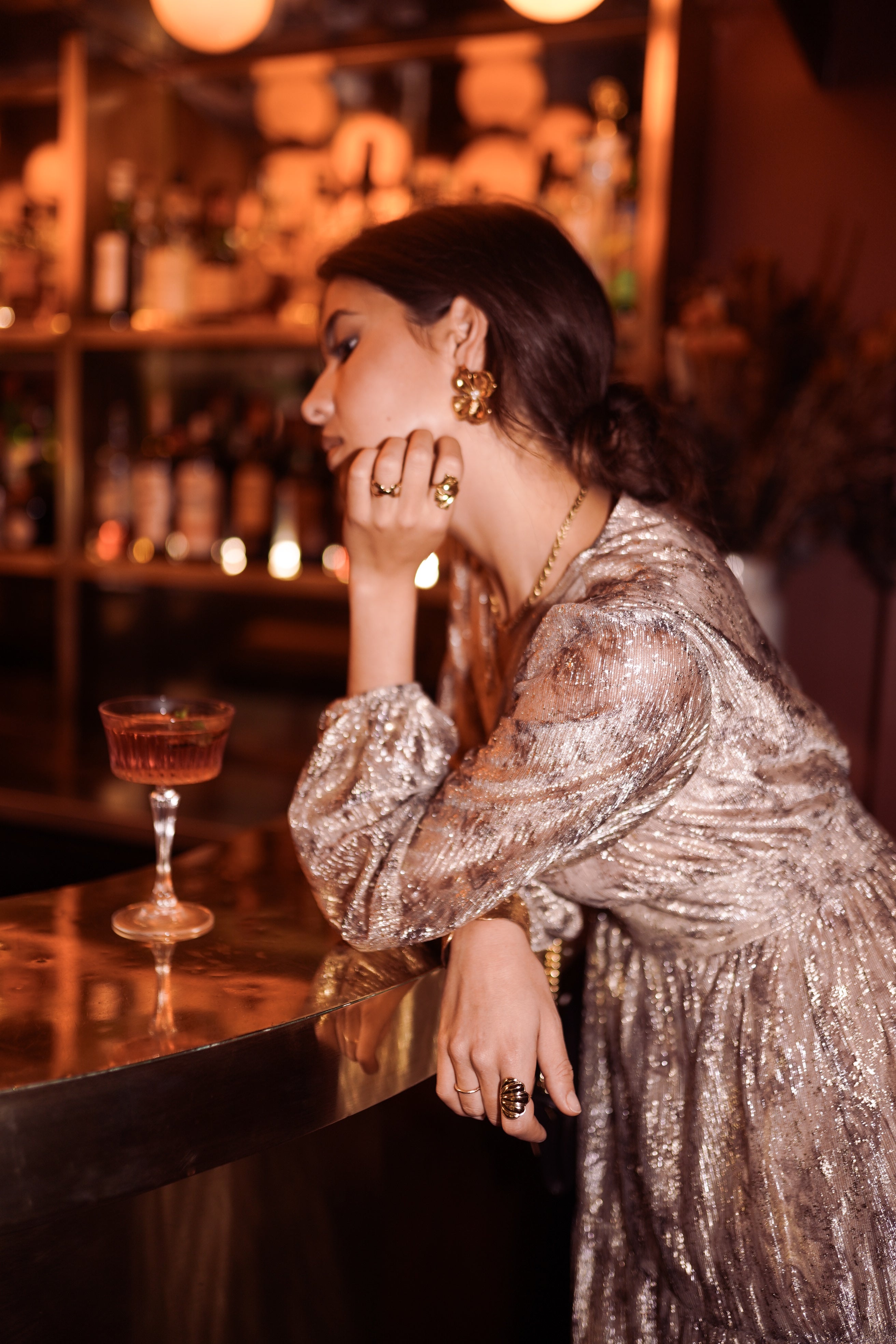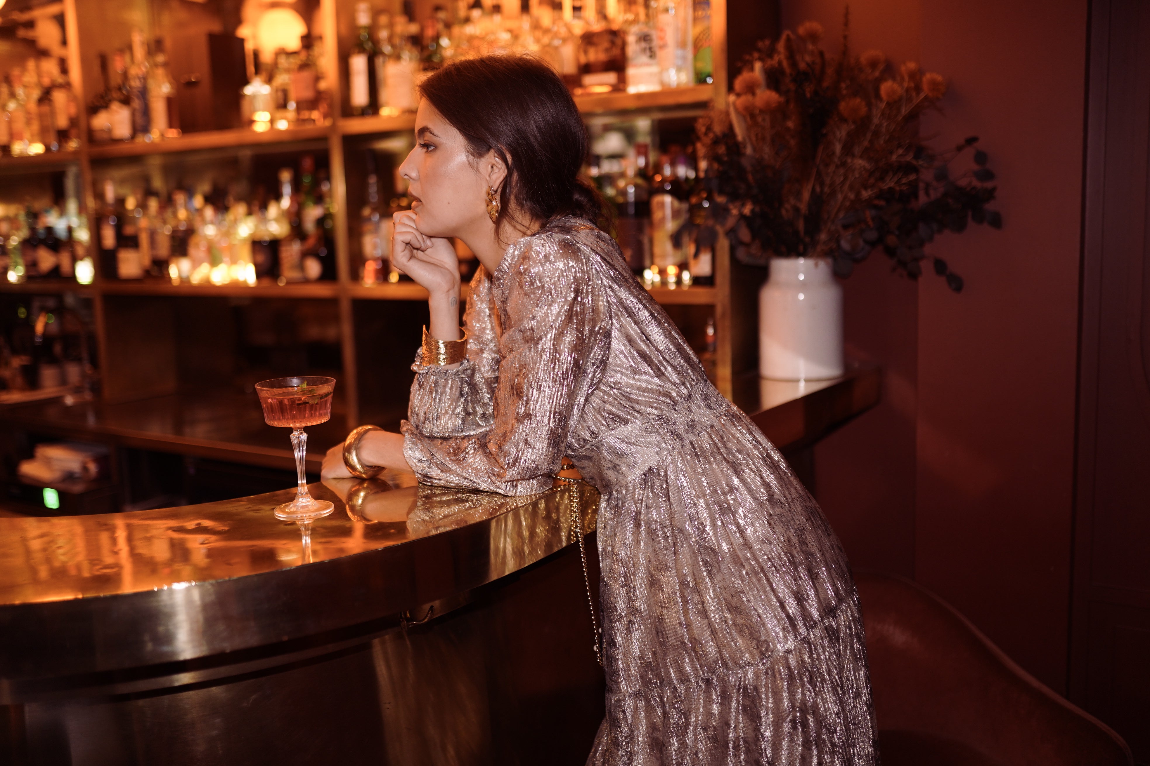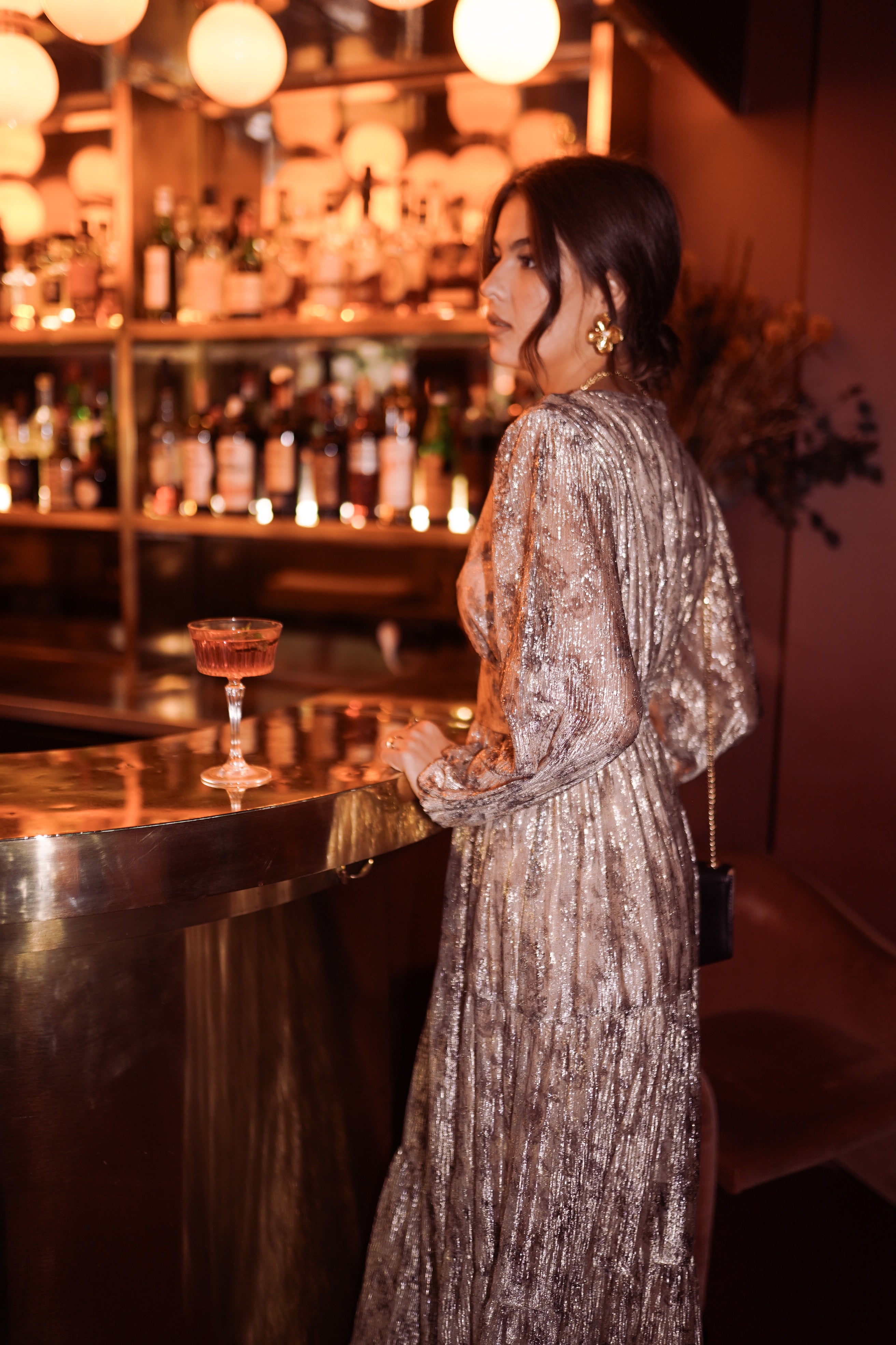 La coupe longue suit le mouvement du corps, le décolleté en V structure la silhouette et les manches légèrement bouffantes apportent cette note vaporeuse qu’on aime tant pour les soirées. Une pièce pensée pour briller… mais toujours avec élégance.