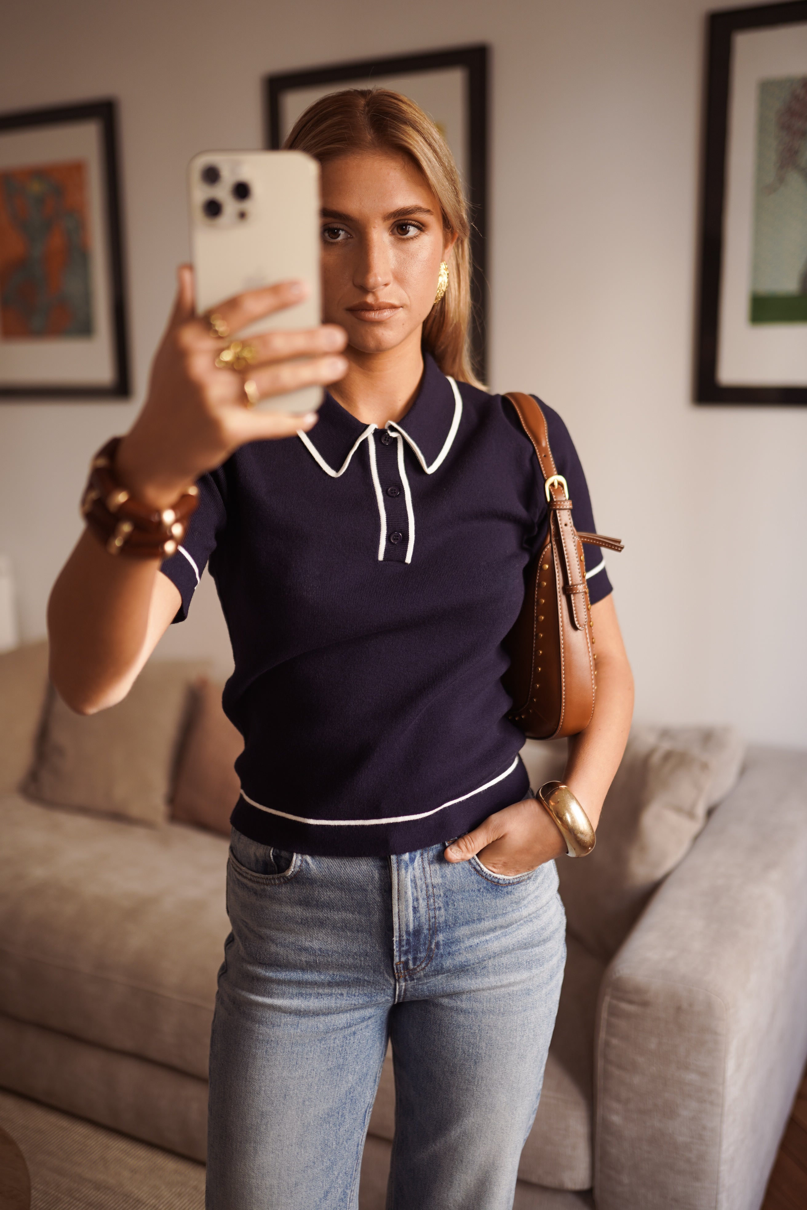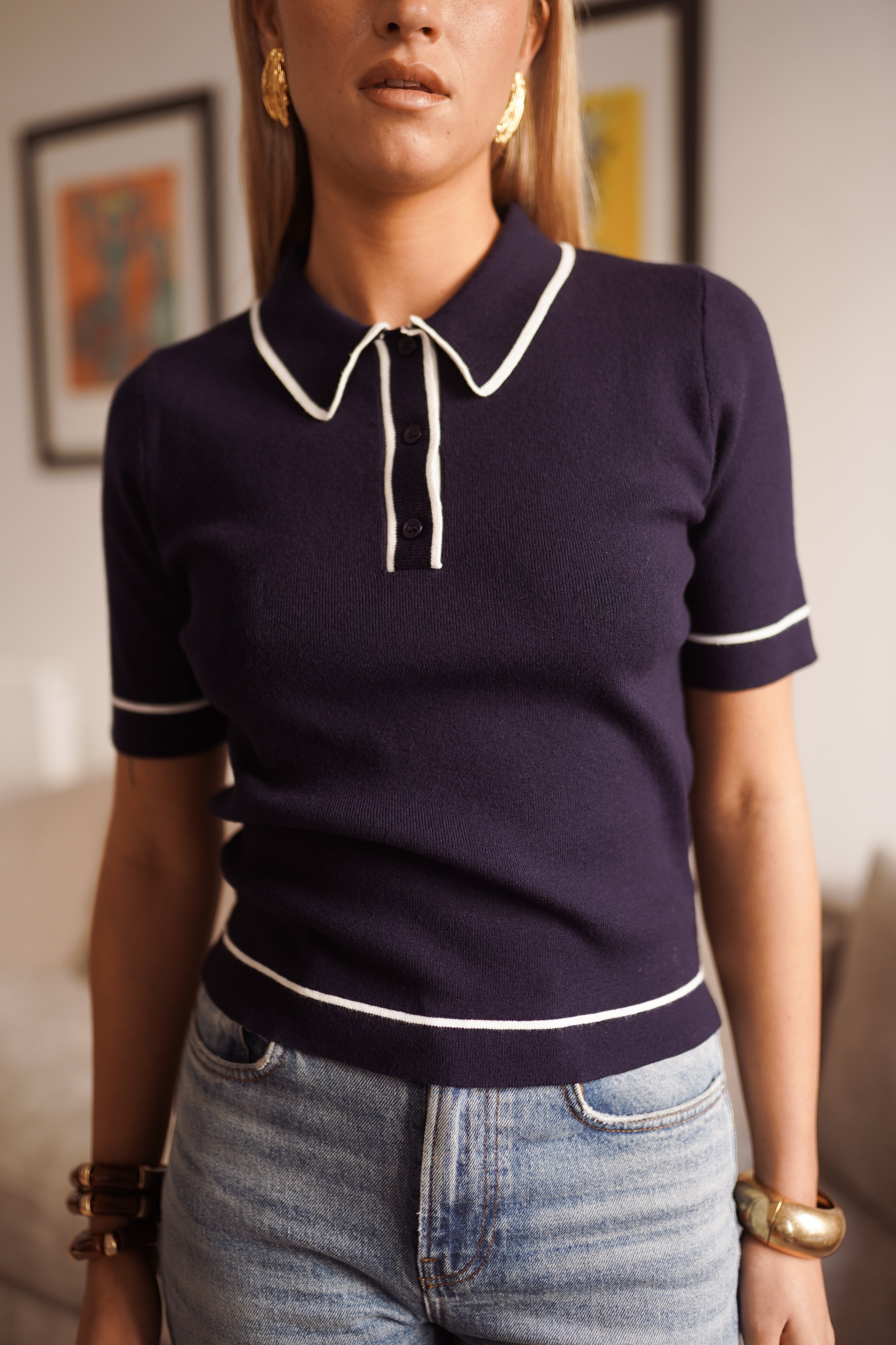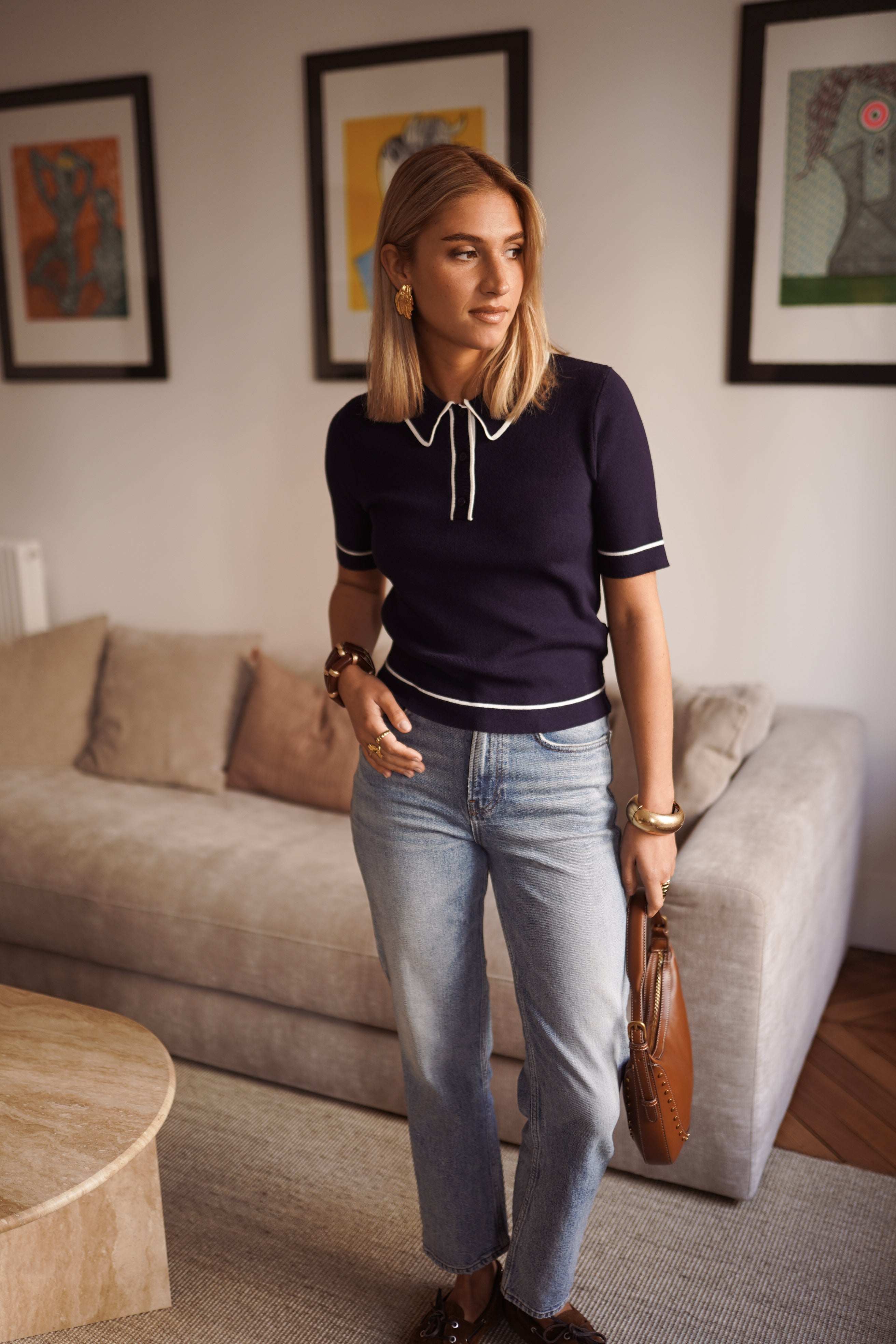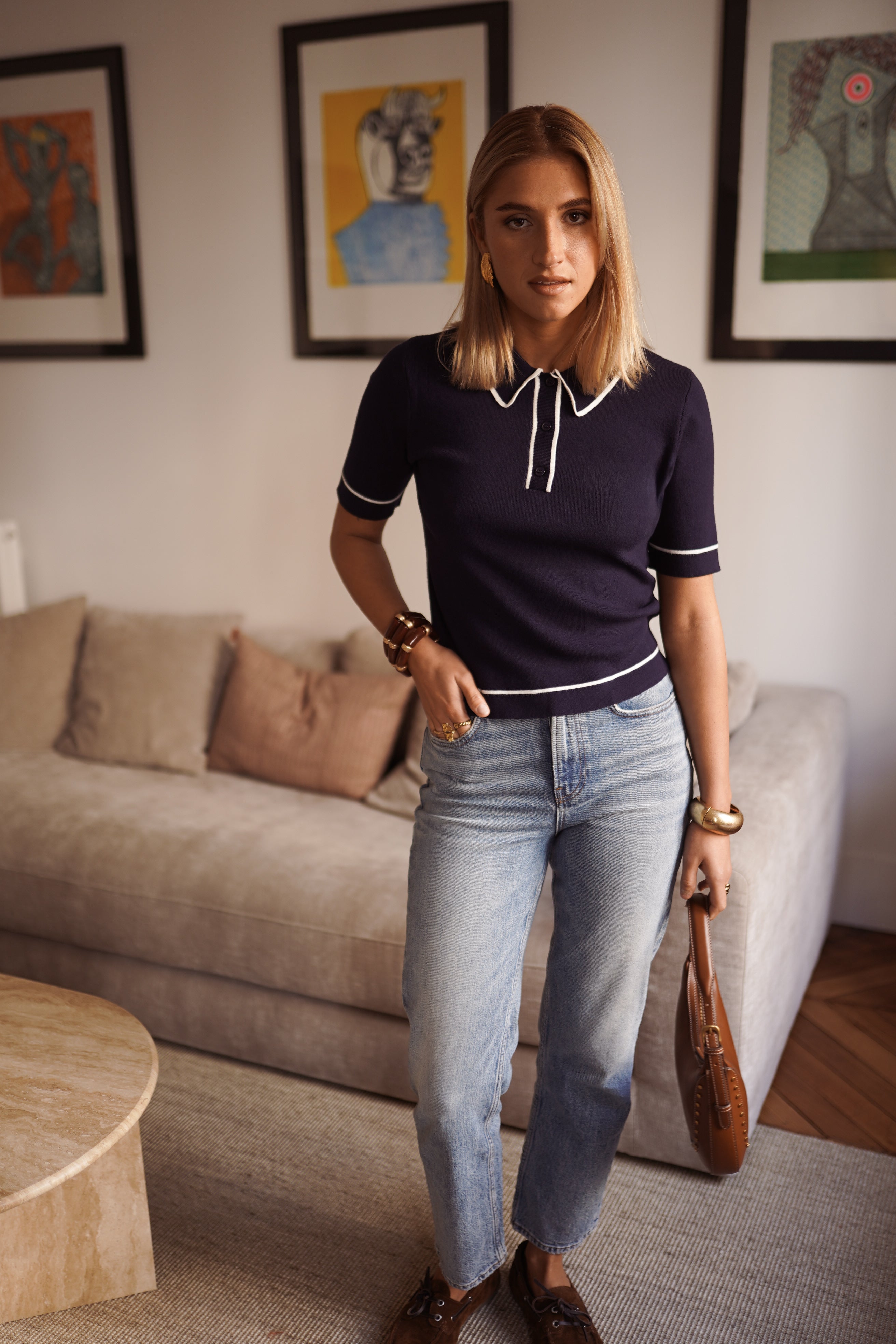 Le top Alexis revisite l’allure preppy avec une ligne nette et actuelle. Son col signature souligné de liserés contrastés lui apporte une touche graphique, tandis que sa maille fine assure un rendu propre et soigné. Un essentiel structuré, facile à porter au quotidien.