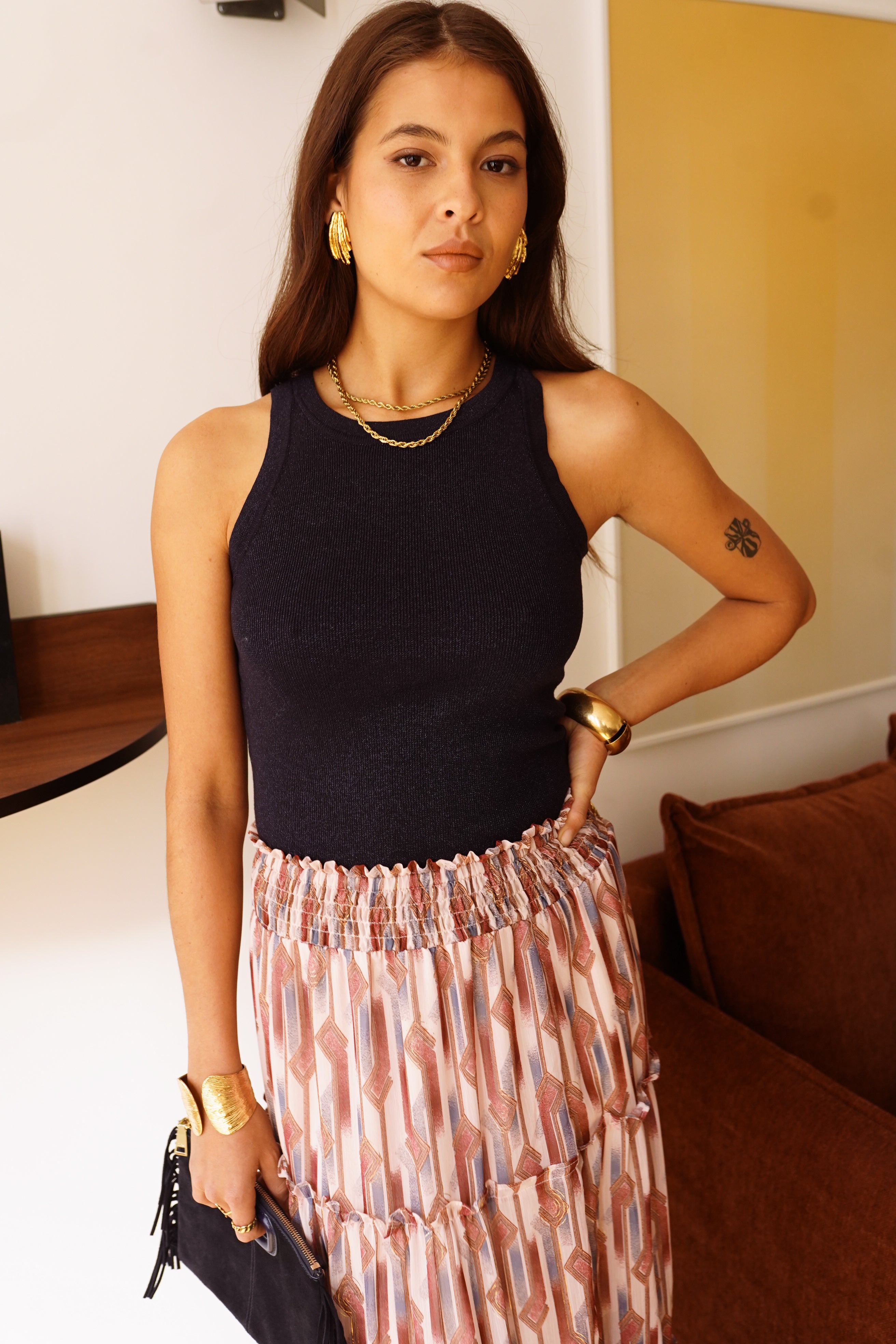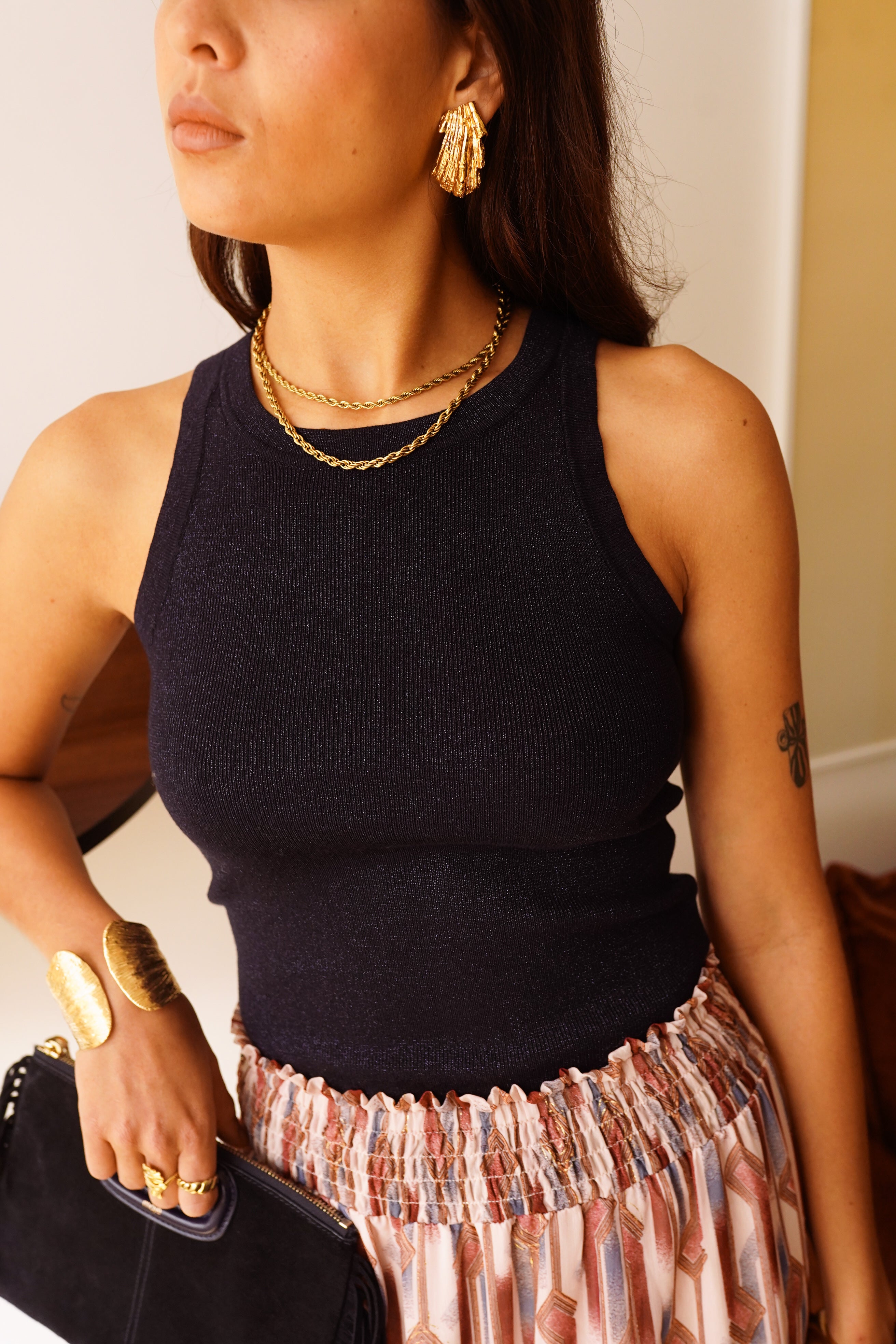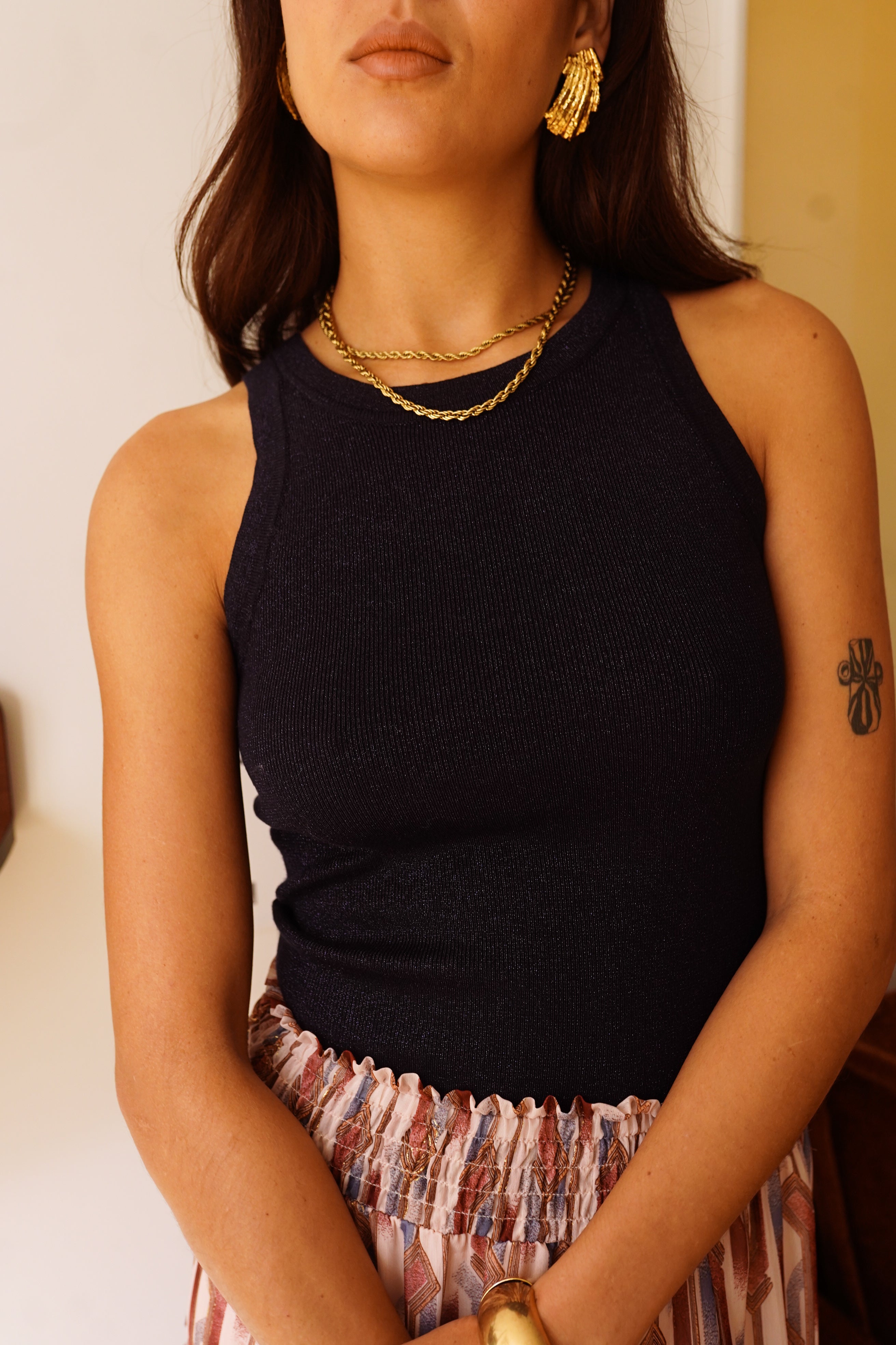 Le top Dara dévoile une coupe épurée à encolure américaine. Confectionné dans une maille côtelée noire au léger effet irisé, il allie simplicité et modernité dans un esprit seconde peau.