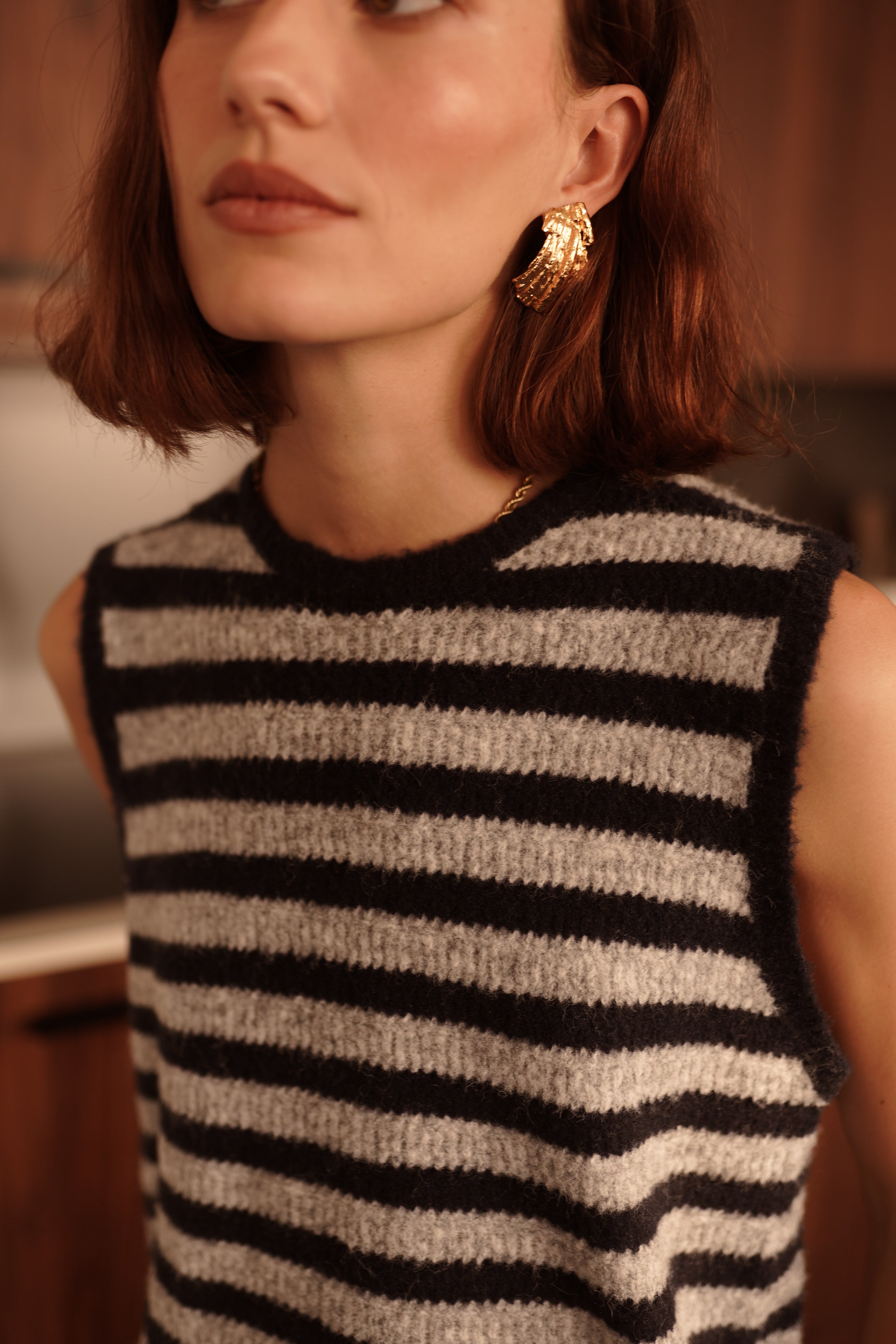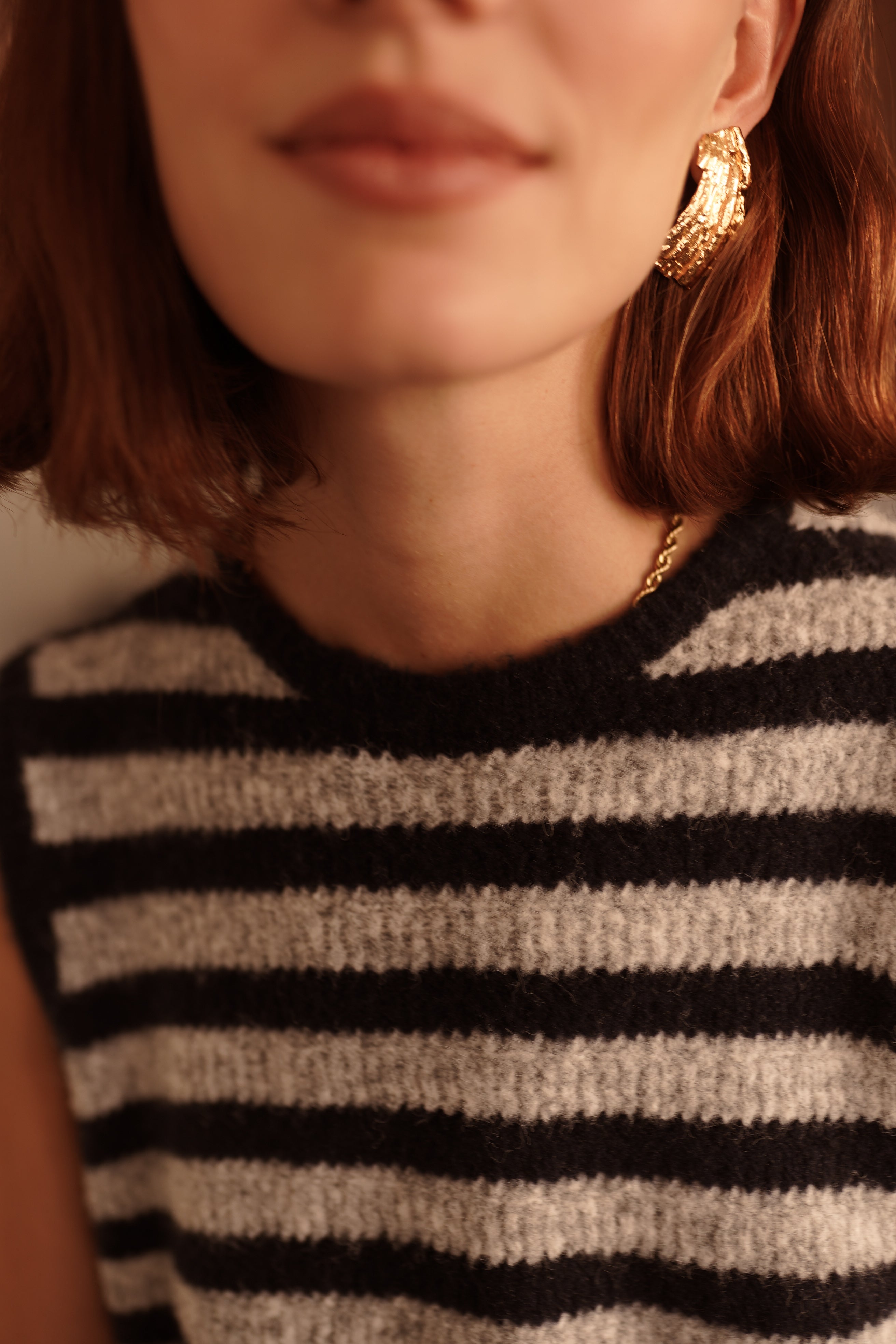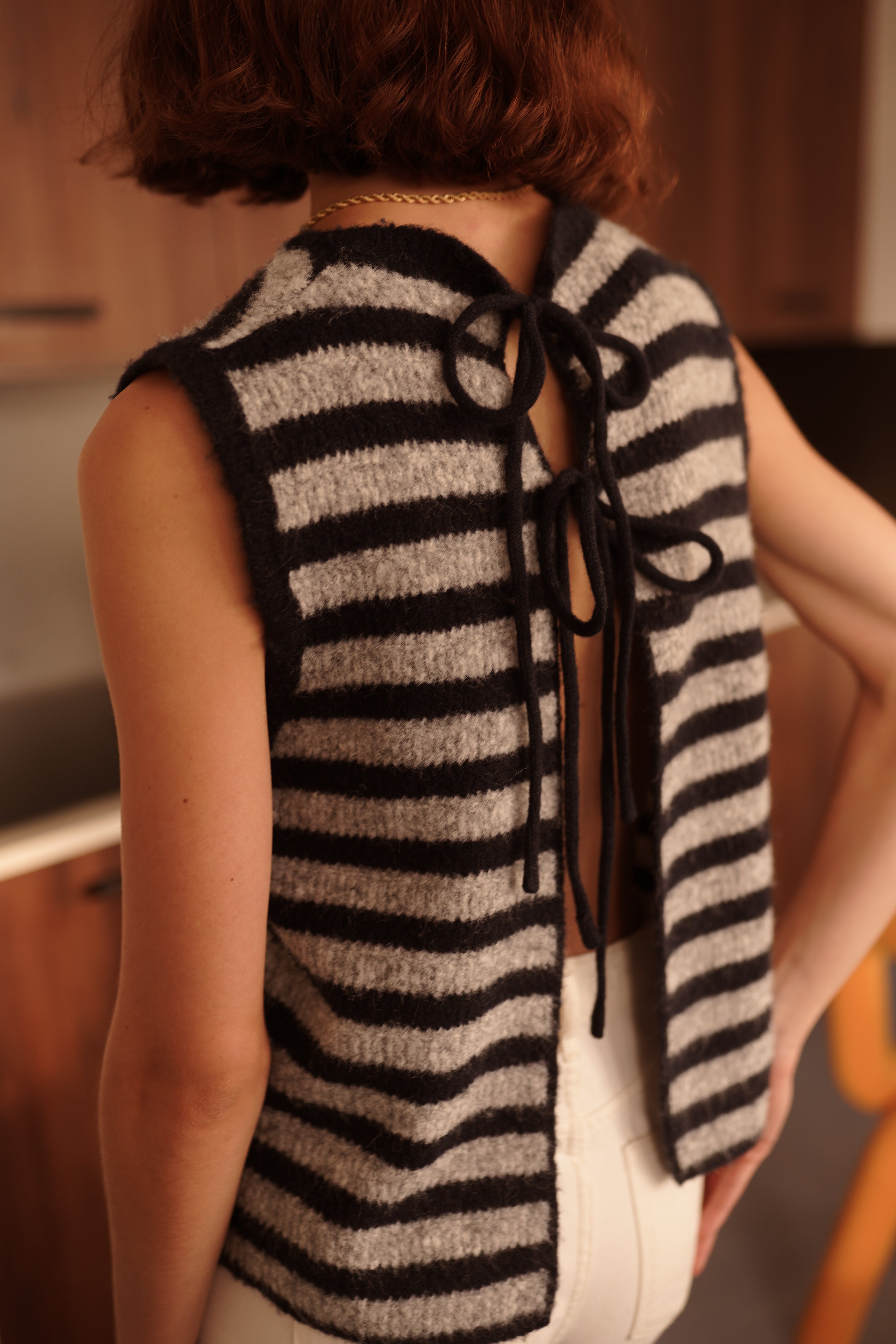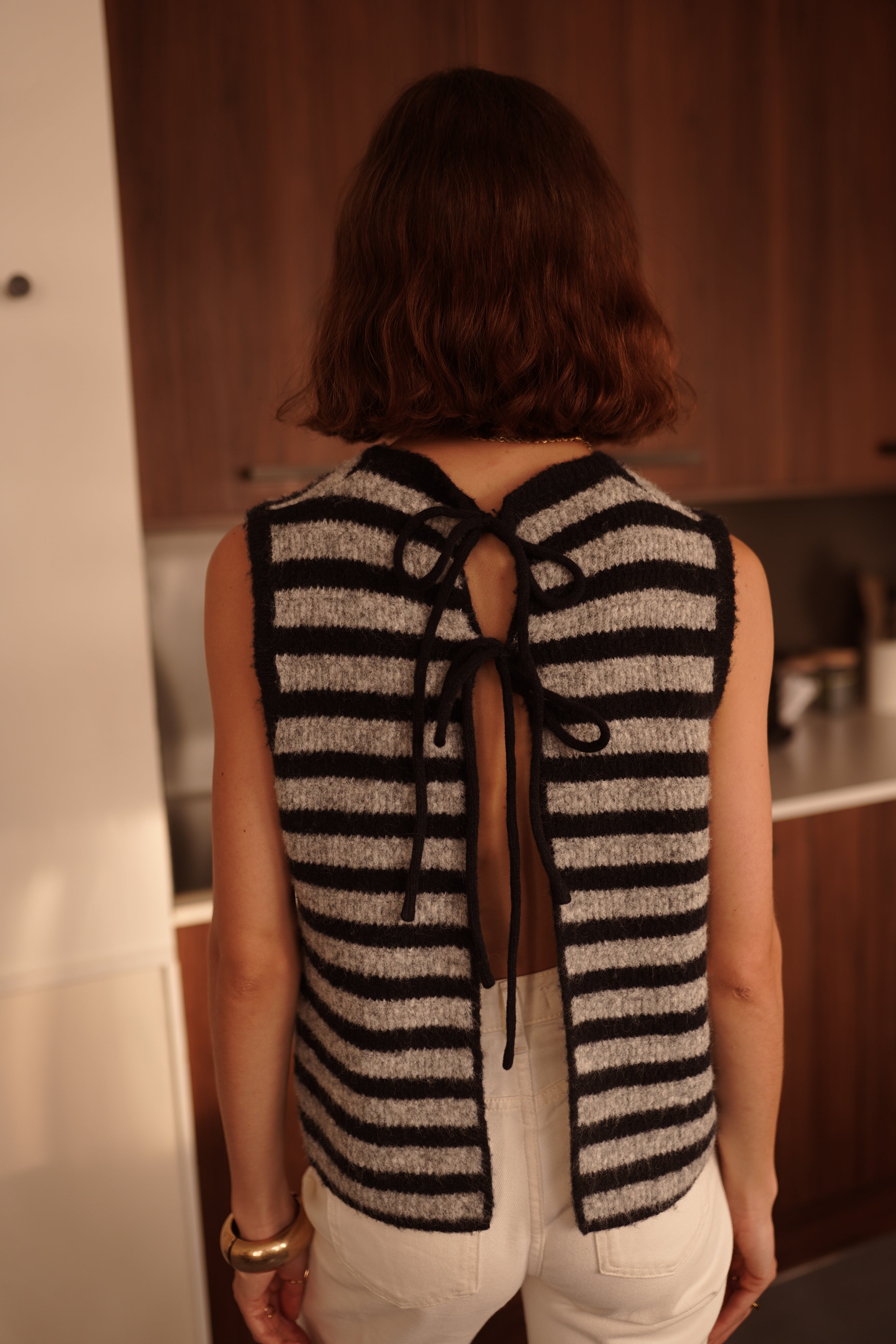 Katarina, le top rayé en maille douce avec un dos ouvert, fermé par deux liens noués. Une pièce graphique et légère, pensée pour apporter un twist contemporain à une silhouette.